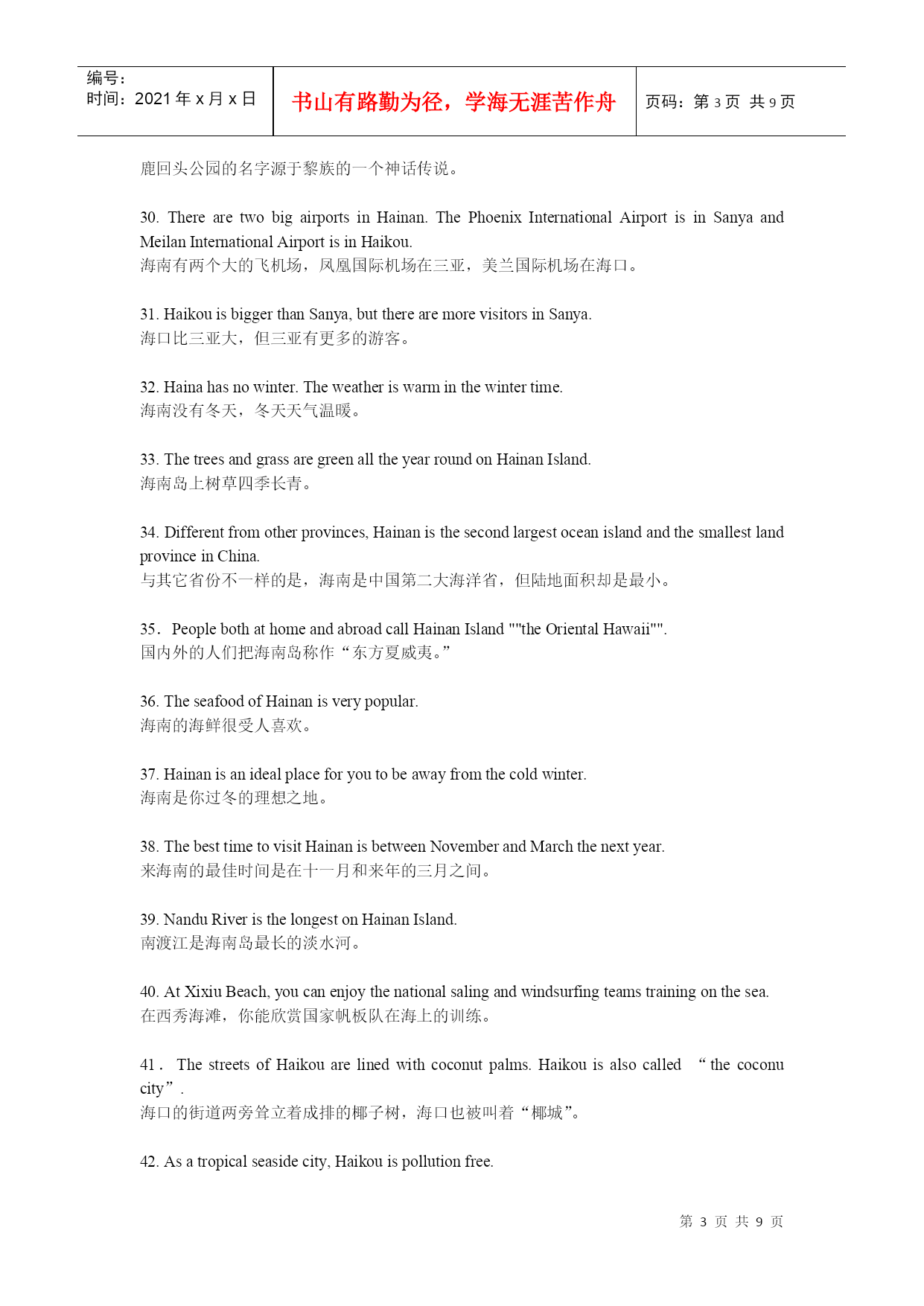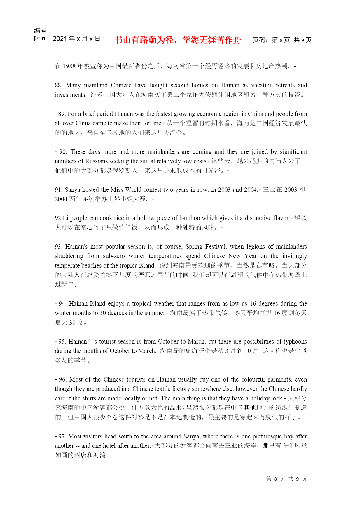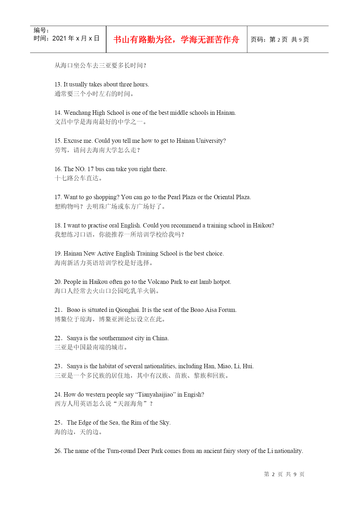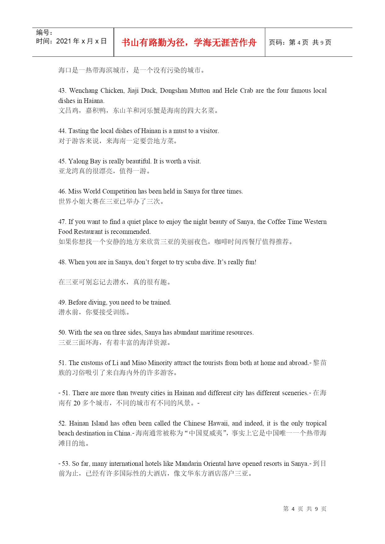 编号:时间:2021年x月x日书山有路勤为径,学海无涯苦作舟页码:第PAGE9页共NUMPAGES9页第PAGE\*MERGEFORMAT9页共NUMPAGES\*MERGEFORMAT9页建设国际旅游岛,需要创造国际化语言环境。6月2日上午,海南旅游英语100句培训与推广工作正式启动,海南省旅游发展委员会副主任陈耀、海口市旅游局副局长蔡俏等领导出席启动仪式,来自全省各酒店、旅行社、旅游院校等单位的培训讲师及员工代表成为首批学员。海口市旅行社协会会长、培训班主讲教师之一房新海教授表示,建设海南国际旅游岛,创造国际化语言环境,把微笑刻在我们脸上、英语挂在我们嘴上,让每位国际游客都有vip的感受,能让外国游客感到宾至如归,是我们的快乐。海南省旅游职业英语师资培训班的举办,让大家明白下功夫掌握旅游英语100句,值、很值、相当地值。1.WelcometoHainan!欢迎您来海南!2.HaikouisthecapitalcityofHainanProvince.海口是海南省的省会城市。3.SanyaliesinthesouthofHainan.三亚位于海南的南面。4.Wenchangiswellknownas“thehomeofcoconuts”.文昌以椰子之乡闻名于世。5.WenchangChickenisdeliccious.文昌鸡很美味。6.IfyouvisitQionghai,pleasedon’tforgettotasteJiajiDuck.如果你来琼海,请别忘记尝一尝嘉积鸭。7.Onweekends,youcanflyakiteintheEverGreenPark.周末你可以去万绿园放风筝。8.HolidayBeachisabouttwentykilometresawayfromthecityproper.假日海滩离市区大约二十公里。9.IsitthefirsttimeyoucametoSanya?你是第一次来三亚吗?10.IhavebeeninHainanforabouttwoweeks.我在海南已有两个星期了。11.GreatchangeshavetakenplaceinSanyasince1987.一九八七年以来,海南发生了巨大的变化。12.HowlongdoesittaketogotoSanyafromHaikoubybus?从海口坐公车去三亚要多长时间?13.Itusuallytakesaboutthreehours.通常要三个小时左右的时间。14.WenchangHighSchoolisoneofthebestmiddleschoolsinHainan.文昌中学是海南最好的中学之一。15.Excuseme.CouldyoutellmehowtogettoHainanUniversity?劳驾,请问去海南大学怎么走?16.TheNO.17buscantakeyourightthere.十七路公车直达。17.Wanttogoshopping?YoucangotothePearlPlazaortheOrientalPlaza.想购物吗?去明珠广场或东方广场好了。18.IwanttopractiseoralEnglish.CouldyourecommendatrainingschoolinHaikou?我想练习口语,你能推荐一所培训学校给我吗?19.HainanNewActiveEnglishTrainingSchoolisthebestchoice.海南新活力英语培训学校是好选择。20.PeopleinHaikouoftengototheVolcanoParktoeatlambhotpot.海口人经常去火山口公园吃乳羊火锅。21.BoaoissituatedinQionghai.ItistheseatoftheBoaoAisaForum.博鳌位于琼海,博鳌亚洲论坛设立在此。22.SanyaisthesouthernmostcityinChina.三亚是中国最南端的城市。23.Sanyaisthehabitatofseveralnationalities,includingHan,Miao,Li,Hui.三亚是一个多民族的居住地,其中有汉族、苗族、黎族和回族。24.Howdowesternpeoplesay“Tianyahaijiao”inEngish?西方人用英语怎么说“天涯海角”?25.TheEdgeoftheSea,theRimoftheSky.海的边,天的边。26.ThenameoftheTurn-roundDeerPark