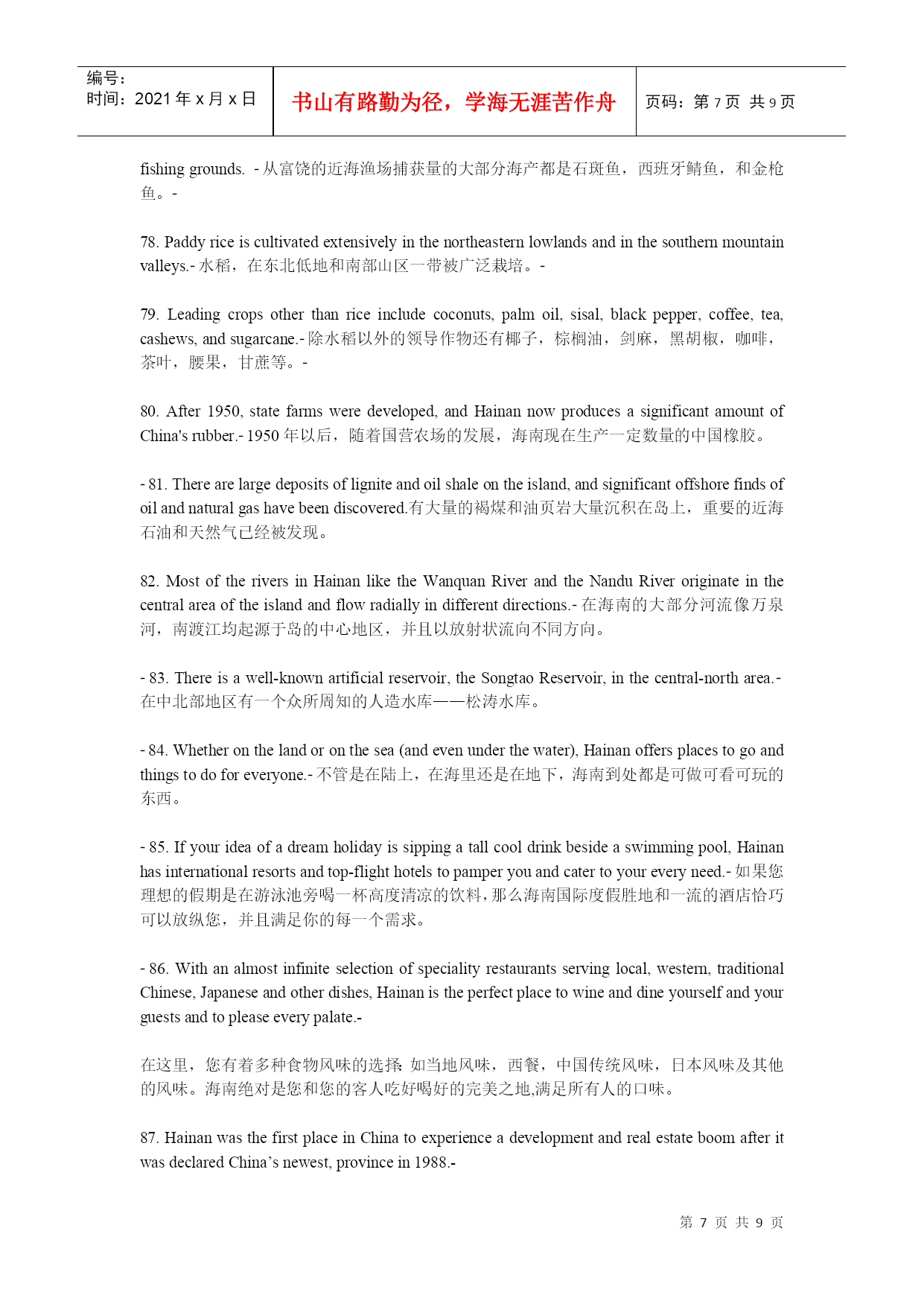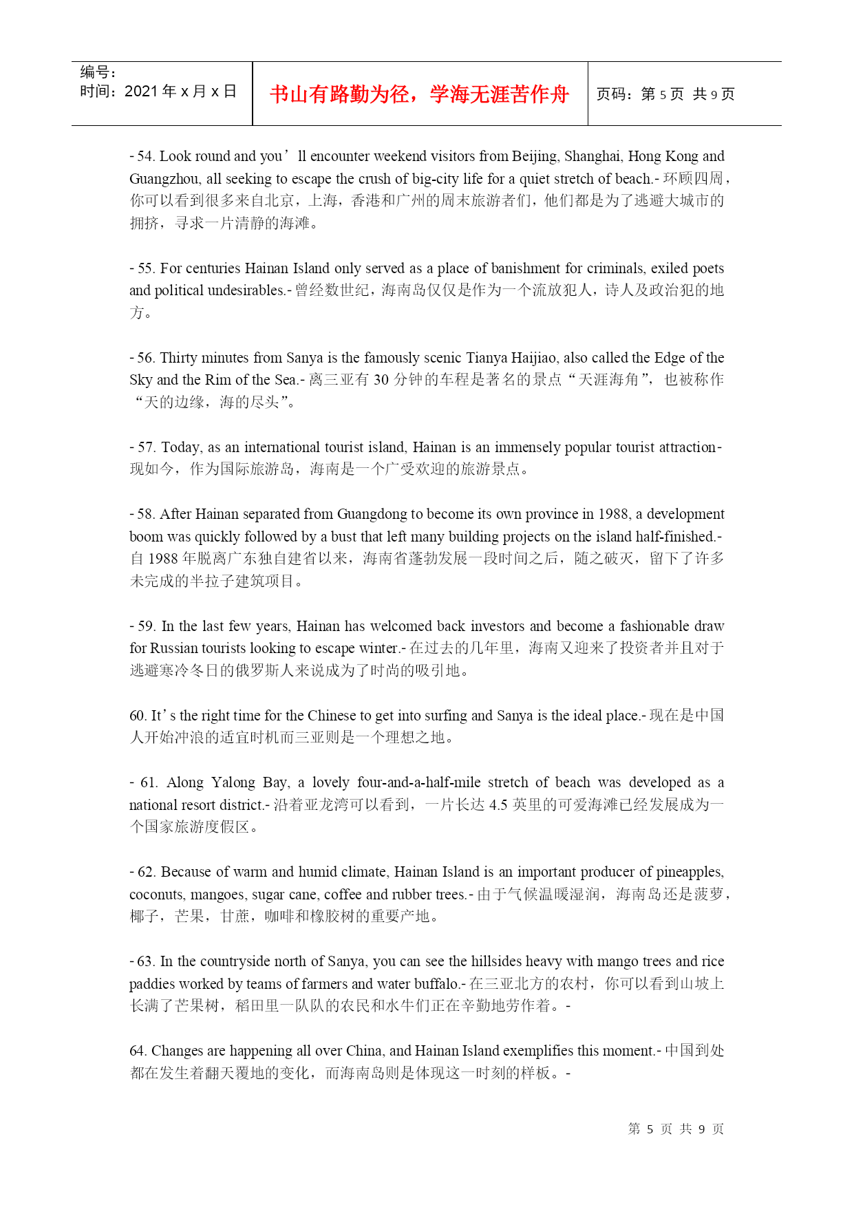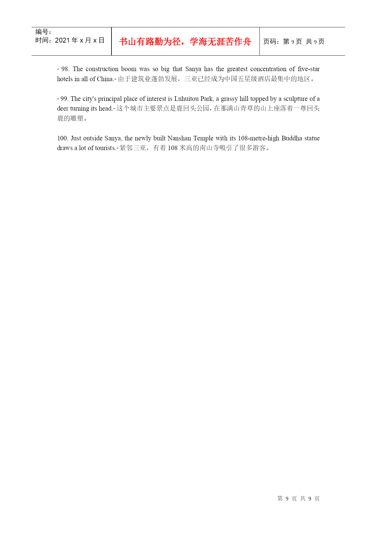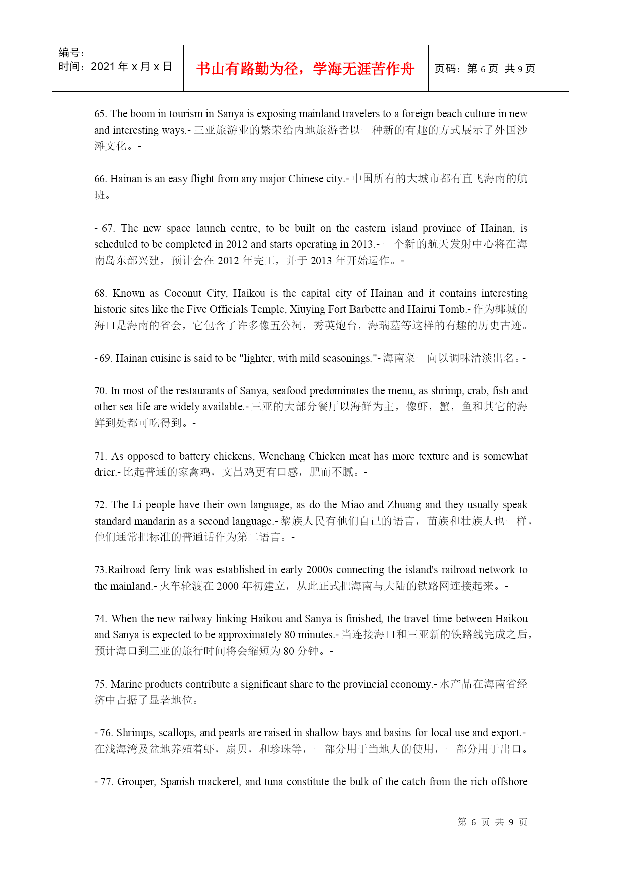 编号:时间:2021年x月x日书山有路勤为径,学海无涯苦作舟页码:第PAGE9页共NUMPAGES9页第PAGE\*MERGEFORMAT9页共NUMPAGES\*MERGEFORMAT9页建设国际旅游岛,需要创造国际化语言环境。6月2日上午,海南旅游英语100句培训与推广工作正式启动,海南省旅游发展委员会副主任陈耀、海口市旅游局副局长蔡俏等领导出席启动仪式,来自全省各酒店、旅行社、旅游院校等单位的培训讲师及员工代表成为首批学员。海口市旅行社协会会长、培训班主讲教师之一房新海教授表示,建设海南国际旅游岛,创造国际化语言环境,把微笑刻在我们脸上、英语挂在我们嘴上,让每位国际游客都有vip的感受,能让外国游客感到宾至如归,是我们的快乐。海南省旅游职业英语师资培训班的举办,让大家明白下功夫掌握旅游英语100句,值、很值、相当地值。1.WelcometoHainan!欢迎您来海南!2.HaikouisthecapitalcityofHainanProvince.海口是海南省的省会城市。3.SanyaliesinthesouthofHainan.三亚位于海南的南面。4.Wenchangiswellknownas“thehomeofcoconuts”.文昌以椰子之乡闻名于世。5.WenchangChickenisdeliccious.文昌鸡很美味。6.IfyouvisitQionghai,pleasedon’tforgettotasteJiajiDuck.如果你来琼海,请别忘记尝一尝嘉积鸭。7.Onweekends,youcanflyakiteintheEverGreenPark.周末你可以去万绿园放风筝。8.HolidayBeachisabouttwentykilometresawayfromthecityproper.假日海滩离市区大约二十公里。9.IsitthefirsttimeyoucametoSanya?你是第一次来三亚吗?10.IhavebeeninHainanforabouttwoweeks.我在海南已有两个星期了。11.GreatchangeshavetakenplaceinSanyasince1987.一九八七年以来,海南发生了巨大的变化。12.HowlongdoesittaketogotoSanyafromHaikoubybus?从海口坐公车去三亚要多长时间?13.Itusuallytakesaboutthreehours.通常要三个小时左右的时间。14.WenchangHighSchoolisoneofthebestmiddleschoolsinHainan.文昌中学是海南最好的中学之一。15.Excuseme.CouldyoutellmehowtogettoHainanUniversity?劳驾,请问去海南大学怎么走?16.TheNO.17buscantakeyourightthere.十七路公车直达。17.Wanttogoshopping?YoucangotothePearlPlazaortheOrientalPlaza.想购物吗?去明珠广场或东方广场好了。18.IwanttopractiseoralEnglish.CouldyourecommendatrainingschoolinHaikou?我想练习口语,你能推荐一所培训学校给我吗?19.HainanNewActiveEnglishTrainingSchoolisthebestchoice.海南新活力英语培训学校是好选择。20.PeopleinHaikouoftengototheVolcanoParktoeatlambhotpot.海口人经常去火山口公园吃乳羊火锅。21.BoaoissituatedinQionghai.ItistheseatoftheBoaoAisaForum.博鳌位于琼海,博鳌亚洲论坛设立在此。22.SanyaisthesouthernmostcityinChina.三亚是中国最南端的城市。23.Sanyaisthehabitatofseveralnationalities,includingHan,Miao,Li,Hui.三亚是一个多民族的居住地,其中有汉族、苗族、黎族和回族。24.Howdowesternpeoplesay“Tianyahaijiao”inEngish?西方人用英语怎么说“天涯海角”?25.TheEdgeoftheSea,theRimoftheSky.海的边,天的边。26.ThenameoftheTurn-roundDeerPark