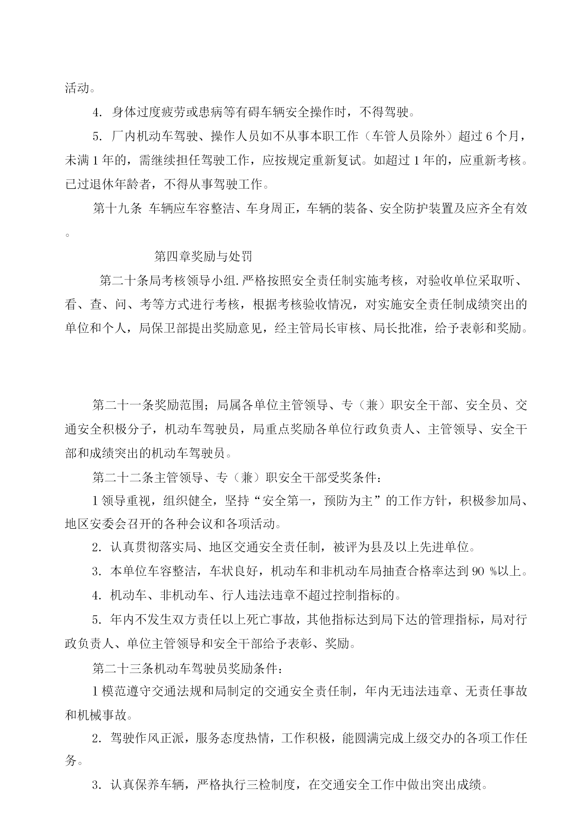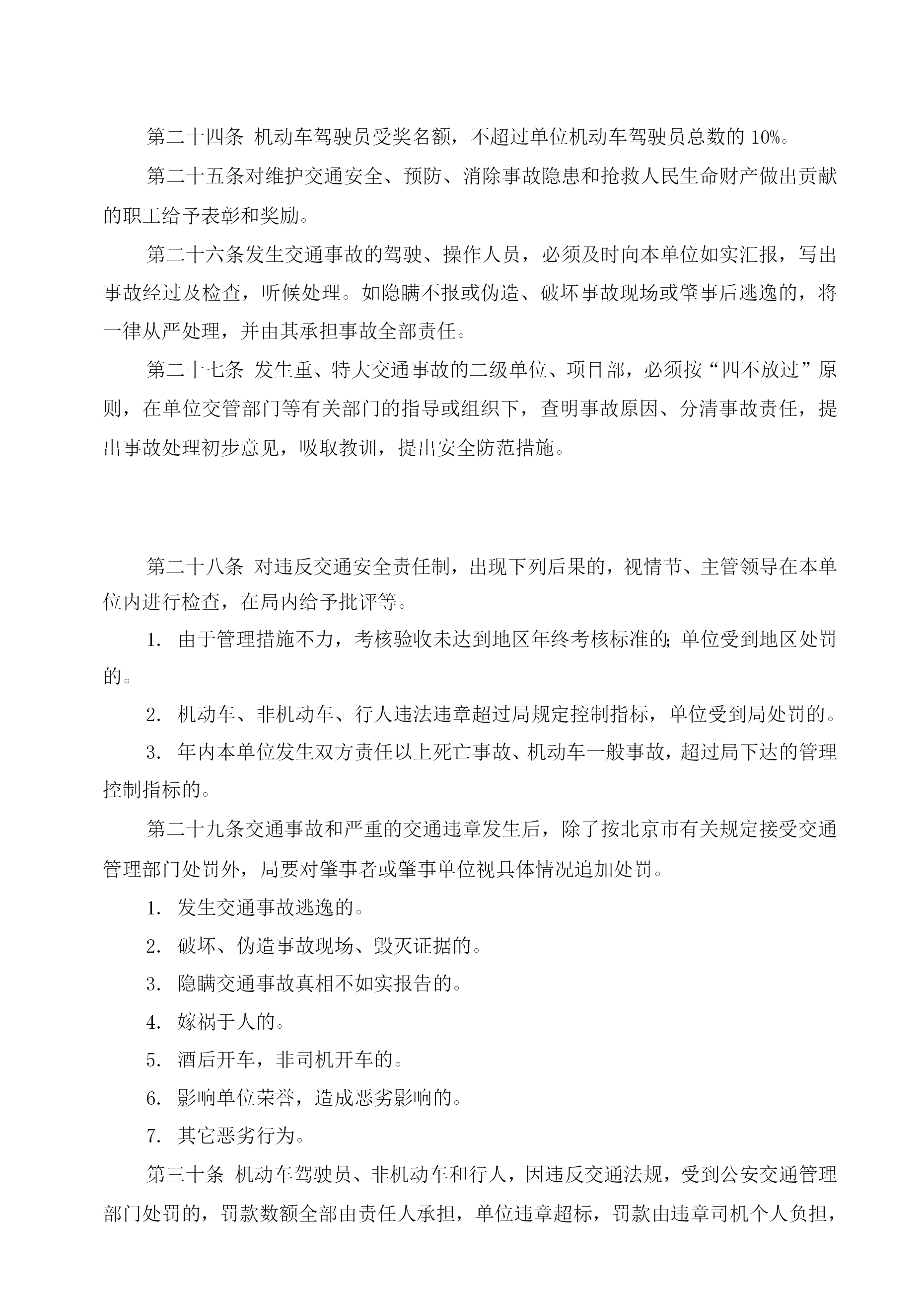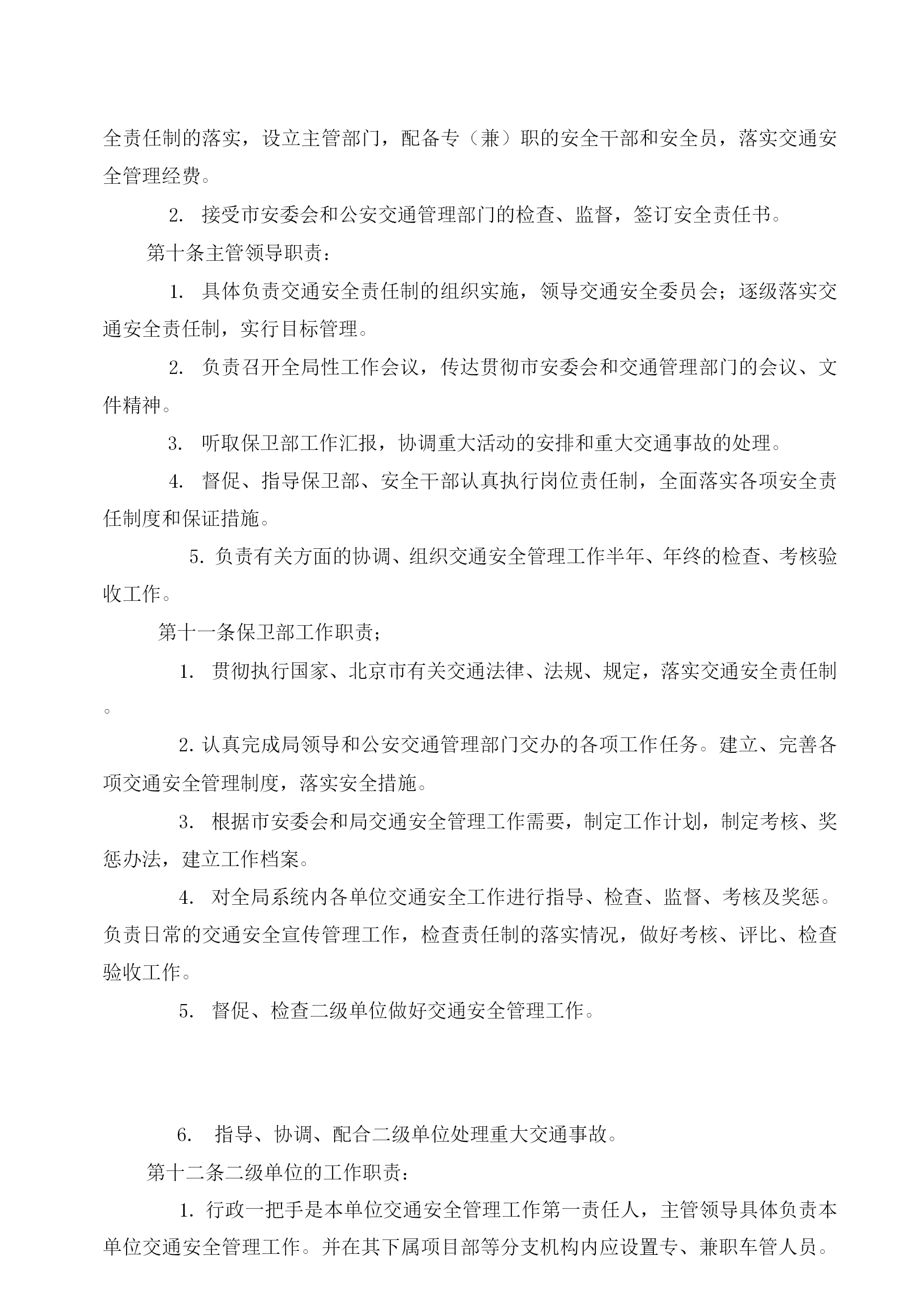 交通安全管理制度第一章总则第一条为了加强局及所属单位的机动车(含厂内机动车)、驾驶员(含厂内驾驶、操作人员)的安全管理(以下简称交通安全),积极预防和减少道路、厂内交通事故(以下简称交通事故)的发生,保护人身和国有资产的安全以及企业其他合法权益,促进和保障全局生产施工的顺利进行,根据《中华人民共和国道路交通安全法》(以下简称交通安全法)、《中华人民共和国道路交通安全法实施条例》(以下简称实施条例)和有关法律法规的规定,制定本制度。第二条局交通安全管理工作坚持“安全第一,预防为主”的方针及“谁主管谁负责、谁用车谁管理,谁的人谁教育”的原则。第三条各单位应认真依照交通安全法律法规及本制度,建立健全本单位交通安全管理的各项制度,逐级签订交通安全责任书(包括与每位驾驶员订立交通安全行车协议书),层层落实安全责任。第四条各单位应依法加强本单位人员交通安全教育,普及交通安全知识,增强“遵纪守法、安全第一”的安全意识,自觉遵守交通安全法律法规和管理规章。对违反交通安全法律法规及本制度的行为,任何人都有劝阻、制止和控告的权利。第五条凡局属各单位(含外包队)、全体职工(包括临时工),均应执行本制度。第二章机构设置与职责第六条局成立交通安全委员会,负责交通安全管理工作。交通安全委员会下设办公室,具体工作由保卫部负责。第七条各单位各级主要行政负责人是同级交通安全工作的第一责任人。第八条各单位应明确负责交通安全管理部门(以下简称交管部门),交通安全专、兼职管理人员,具体负责本单位驾驶人员(含操作员)、机动车(含厂内机动车)及内部汽车维修等交通安全管理工作。第九条局领导职责:局长是全局交通安全管理工作第一责任人,委托主管领导具体负责交通安全责任制的落实,设立主管部门,配备专(兼)职的安全干部和安全员,落实交通安全管理经费。接受市安委会和公安交通管理部门的检查、监督,签订安全责任书。第十条主管领导职责:具体负责交通安全责任制的组织实施,领导交通安全委员会;逐级落实交通安全责任制,实行目标管理。负责召开全局性工作会议,传达贯彻市安委会和交通管理部门的会议、文件精神。听取保卫部工作汇报,协调重大活动的安排和重大交通事故的处理。督促、指导保卫部、安全干部认真执行岗位责任制,全面落实各项安全责任制度和保证措施。负责有关方面的协调、组织交通安全管理工作半年、年终的检查、考核验收工作。第十一条保卫部工作职责;贯彻执行国家、北京市有关交通法律、法规、规定,落实交通安全责任制。认真完成局领导和公安交通管理部门交办的各项工作任务。建立、完善各项交通安全管理制度,落实安全措施。根据市安委会和局交通安全管理工作需要,制定工作计划,制定考核、奖惩办法,建立工作档案。对全局系统内各单位交通安全工作进行指导、检查、监督、考核及奖惩。负责日常的交通安全宣传管理工作,检查责任制的落实情况,做好考核、评比、检查验收工作。督促、检查二级单位做好交通安全管理工作。指导、协调、配合二级单位处理重大交通事故。第十二条二级单位的工作职责:行政一把手是本单位交通安全管理工作第一责任人,主管领导具体负责本单位交通安全管理工作。并在其下属项目部等分支机构内应设置专、兼职车管人员。在单位交管部门及所在单位领导下,负责所在单位的交通安全管理工作。结合本单位实际情况,确定各项安全控制指标。做到交通安全管理工作与本单位的生产、经营工作,同计划、同布置、同落实、同检查、同总结、同评比。定期组织考核、检查、评比、验收,并制定本单位的各项规章制度和考核奖惩办法。成立交通安全委员会,定期召开会议,研究分析本单位交通安全管理工作,落实局和所在地区公安交通管理部门交办的各项工作任务;逐级落实责任制。认真贯彻执行北京市《中华人民共和国道路交通安全法》办法,减少交通违法违章、预防交通事故。承担局下达的交通安全控制指标,履行责任,接受检查、监督、并根据本单位实际情况配备专(兼)职安全干部或安全员,指导、督促安全干部和安全员落实交通安全有关管理规定和措施。加强对本单位职工和机动车驾驶员的交通安全教育,定期对车辆进行检查。对交通事故和违法违章按规定做出处理,并报保卫部。第十三条二级单位专(兼)职安全干部工作职责:负责车辆年检和司机年审工作。负责机动车、非机动车、司机档案、台帐登记备案、办理车务手续及相关业务工作。负责宣传贯彻交通法规和规章,加强对职工的安全教育,重点做好对司机的安全教育,做好记录。负责车辆的定期安全检查,及时督促驾驶员消除隐患,填写检查记录单,不合格车辆及时安排送修。协助分局办公室坚持派车单制度,非专职司机未经领导批准不准动用本局车辆。认真执行局关于机动车、机动车驾驶员和非机动车管理的各项规章制度。按局和属地交通安全管理部门要求