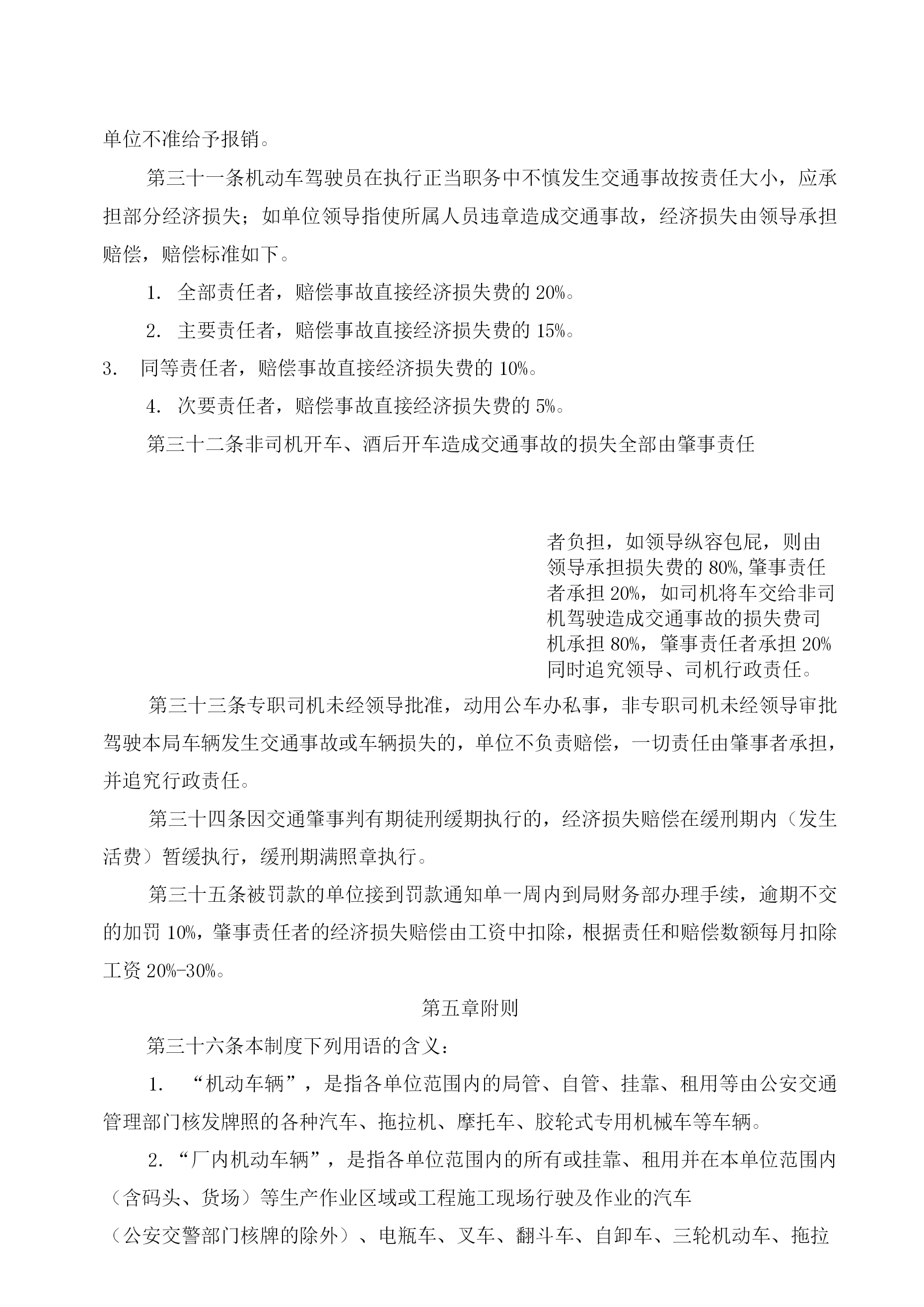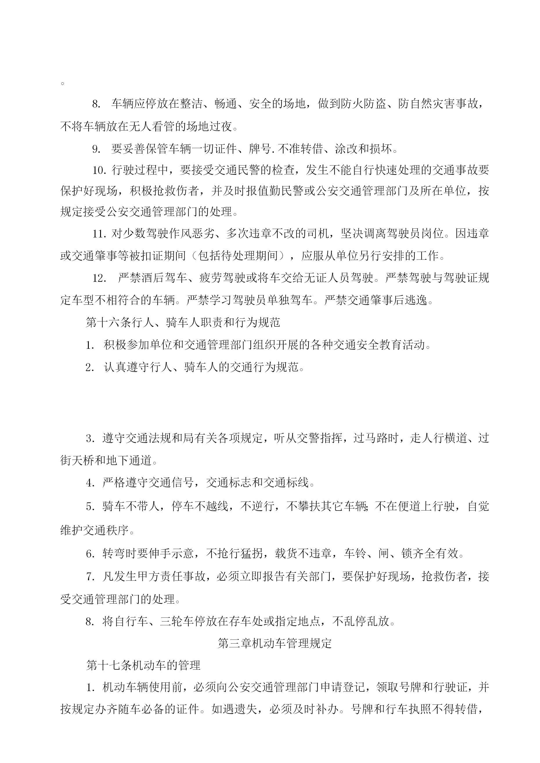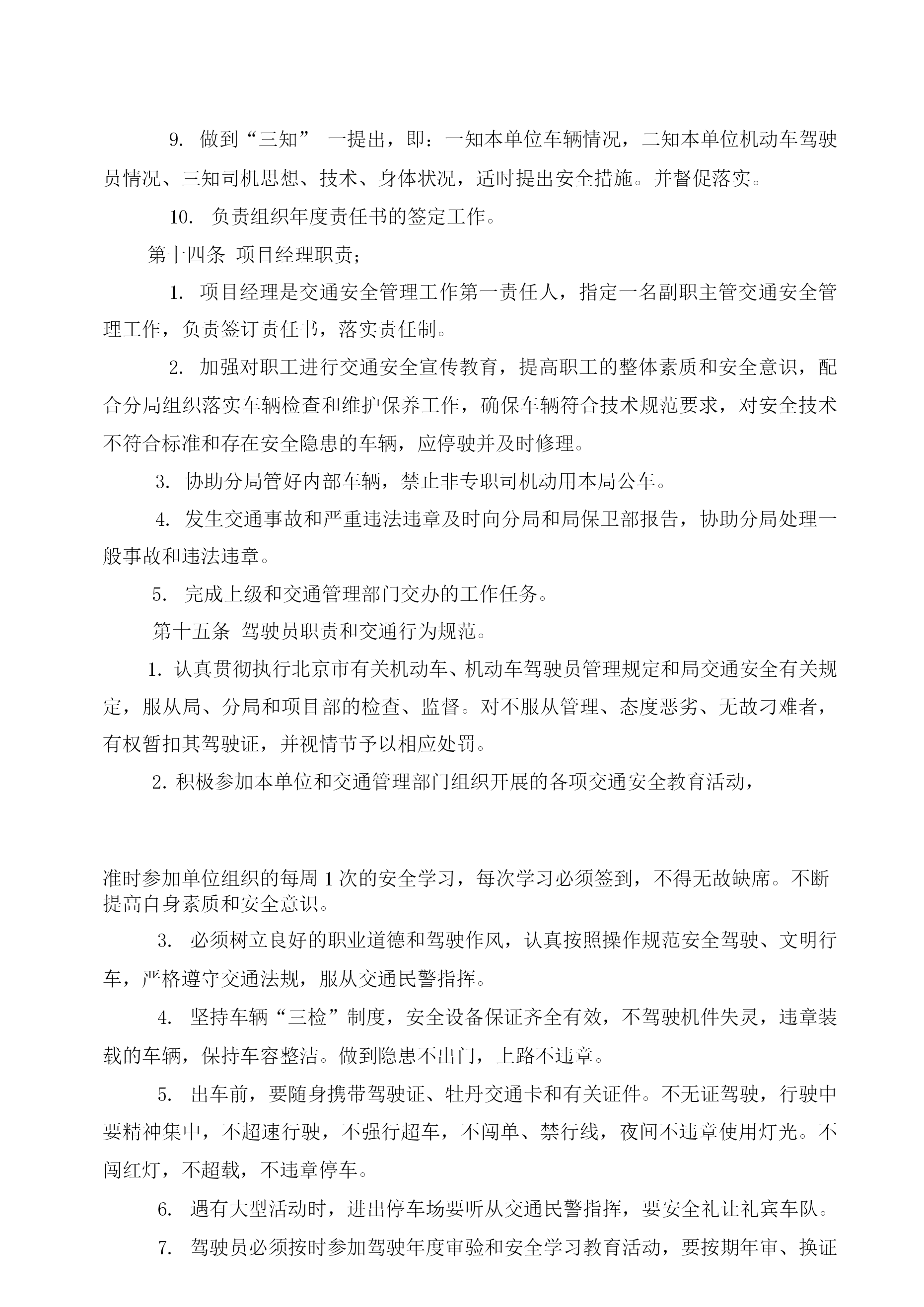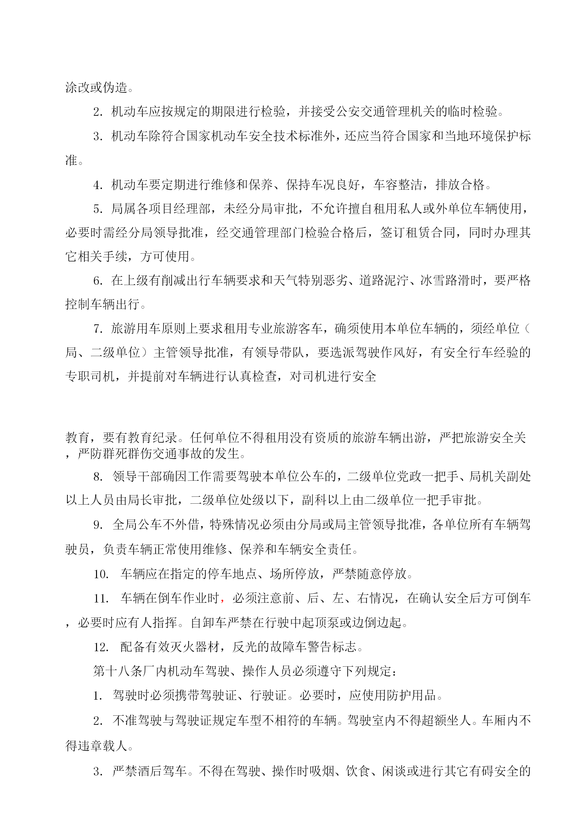交通安全管理制度第一章总则第一条为了加强局及所属单位的机动车(含厂内机动车)、驾驶员(含厂内驾驶、操作人员)的安全管理(以下简称交通安全),积极预防和减少道路、厂内交通事故(以下简称交通事故)的发生,保护人身和国有资产的安全以及企业其他合法权益,促进和保障全局生产施工的顺利进行,根据《中华人民共和国道路交通安全法》(以下简称交通安全法)、《中华人民共和国道路交通安全法实施条例》(以下简称实施条例)和有关法律法规的规定,制定本制度。第二条局交通安全管理工作坚持“安全第一,预防为主”的方针及“谁主管谁负责、谁用车谁管理,谁的人谁教育”的原则。第三条各单位应认真依照交通安全法律法规及本制度,建立健全本单位交通安全管理的各项制度,逐级签订交通安全责任书(包括与每位驾驶员订立交通安全行车协议书),层层落实安全责任。第四条各单位应依法加强本单位人员交通安全教育,普及交通安全知识,增强“遵纪守法、安全第一”的安全意识,自觉遵守交通安全法律法规和管理规章。对违反交通安全法律法规及本制度的行为,任何人都有劝阻、制止和控告的权利。第五条凡局属各单位(含外包队)、全体职工(包括临时工),均应执行本制度。第二章机构设置与职责第六条局成立交通安全委员会,负责交通安全管理工作。交通安全委员会下设办公室,具体工作由保卫部负责。第七条各单位各级主要行政负责人是同级交通安全工作的第一责任人。第八条各单位应明确负责交通安全管理部门(以下简称交管部门),交通安全专、兼职管理人员,具体负责本单位驾驶人员(含操作员)、机动车(含厂内机动车)及内部汽车维修等交通安全管理工作。第九条局领导职责:局长是全局交通安全管理工作第一责任人,委托主管领导具体负责交通安全责任制的落实,设立主管部门,配备专(兼)职的安全干部和安全员,落实交通安全管理经费。接受市安委会和公安交通管理部门的检查、监督,签订安全责任书。第十条主管领导职责:具体负责交通安全责任制的组织实施,领导交通安全委员会;逐级落实交通安全责任制,实行目标管理。负责召开全局性工作会议,传达贯彻市安委会和交通管理部门的会议、文件精神。听取保卫部工作汇报,协调重大活动的安排和重大交通事故的处理。督促、指导保卫部、安全干部认真执行岗位责任制,全面落实各项安全责任制度和保证措施。负责有关方面的协调、组织交通安全管理工作半年、年终的检查、考核验收工作。第十一条保卫部工作职责;贯彻执行国家、北京市有关交通法律、法规、规定,落实交通安全责任制。认真完成局领导和公安交通管理部门交办的各项工作任务。建立、完善各项交通安全管理制度,落实安全措施。根据市安委会和局交通安全管理工作需要,制定工作计划,制定考核、奖惩办法,建立工作档案。对全局系统内各单位交通安全工作进行指导、检查、监督、考核及奖惩。负责日常的交通安全宣传管理工作,检查责任制的落实情况,做好考核、评比、检查验收工作。督促、检查二级单位做好交通安全管理工作。指导、协调、配合二级单位处理重大交通事故。第十二条二级单位的工作职责:行政一把手是本单位交通安全管理工作第一责任人,主管领导具体负责本单位交通安全管理工作。并在其下属项目部等分支机构内应设置专、兼职车管人员。在单位交管部门及所在单位领导下,负责所在单位的交通安全管理工作。结合本单位实际情况,确定各项安全控制指标。做到交通安全管理工作与本单位的生产、经营工作,同计划、同布置、同落实、同检查、同总结、同评比。定期组织考核、检查、评比、验收,并制定本单位的各项规章制度和考核奖惩办法。成立交通安全委员会,定期召开会议,研究分析本单位交通安全管理工作,落实局和所在地区公安交通管理部门交办的各项工作任务;逐级落实责任制。认真贯彻执行北京市《中华人民共和国道路交通安全法》办法,减少交通违法违章、预防交通事故。承担局下达的交通安全控制指标,履行责任,接受检查、监督、并根据本单位实际情况配备专(兼)职安全干部或安全员,指导、督促安全干部和安全员落实交通安全有关管理规定和措施。加强对本单位职工和机动车驾驶员的交通安全教育,定期对车辆进行检查。对交通事故和违法违章按规定做出处理,并报保卫部。第十三条二级单位专(兼)职安全干部工作职责:负责车辆年检和司机年审工作。负责机动车、非机动车、司机档案、台帐登记备案、办理车务手续及相关业务工作。负责宣传贯彻交通法规和规章,加强对职工的安全教育,重点做好对司机的安全教育,做好记录。负责车辆的定期安全检查,及时督促驾驶员消除隐患,填写检查记录单,不合格车辆及时安排送修。协助分局办公室坚持派车单制度,非专职司机未经领导批准不准动用本局车辆。认真执行局关于机动车、机动车驾驶员和非机动车管理的各项规章制度。按局和属地交通安全管理部门要求