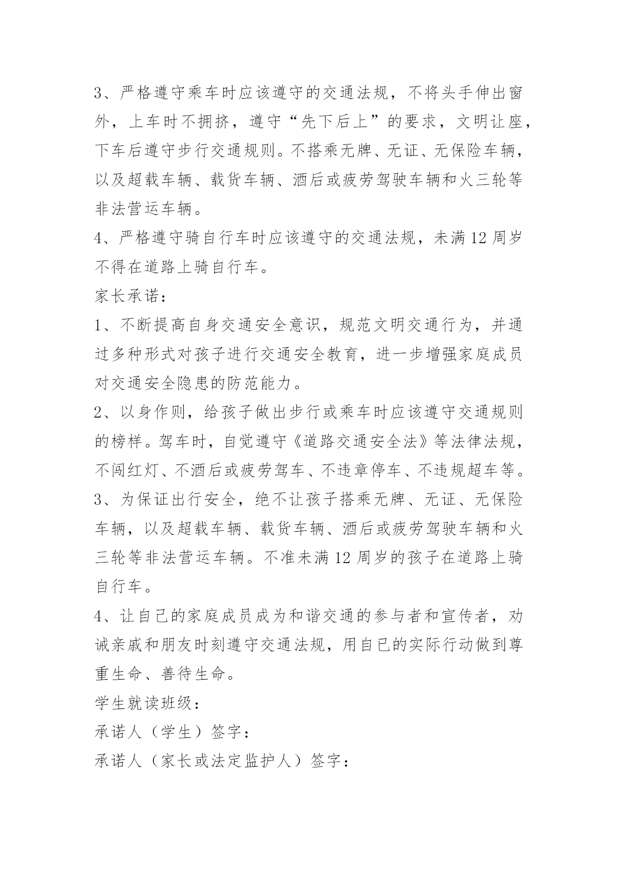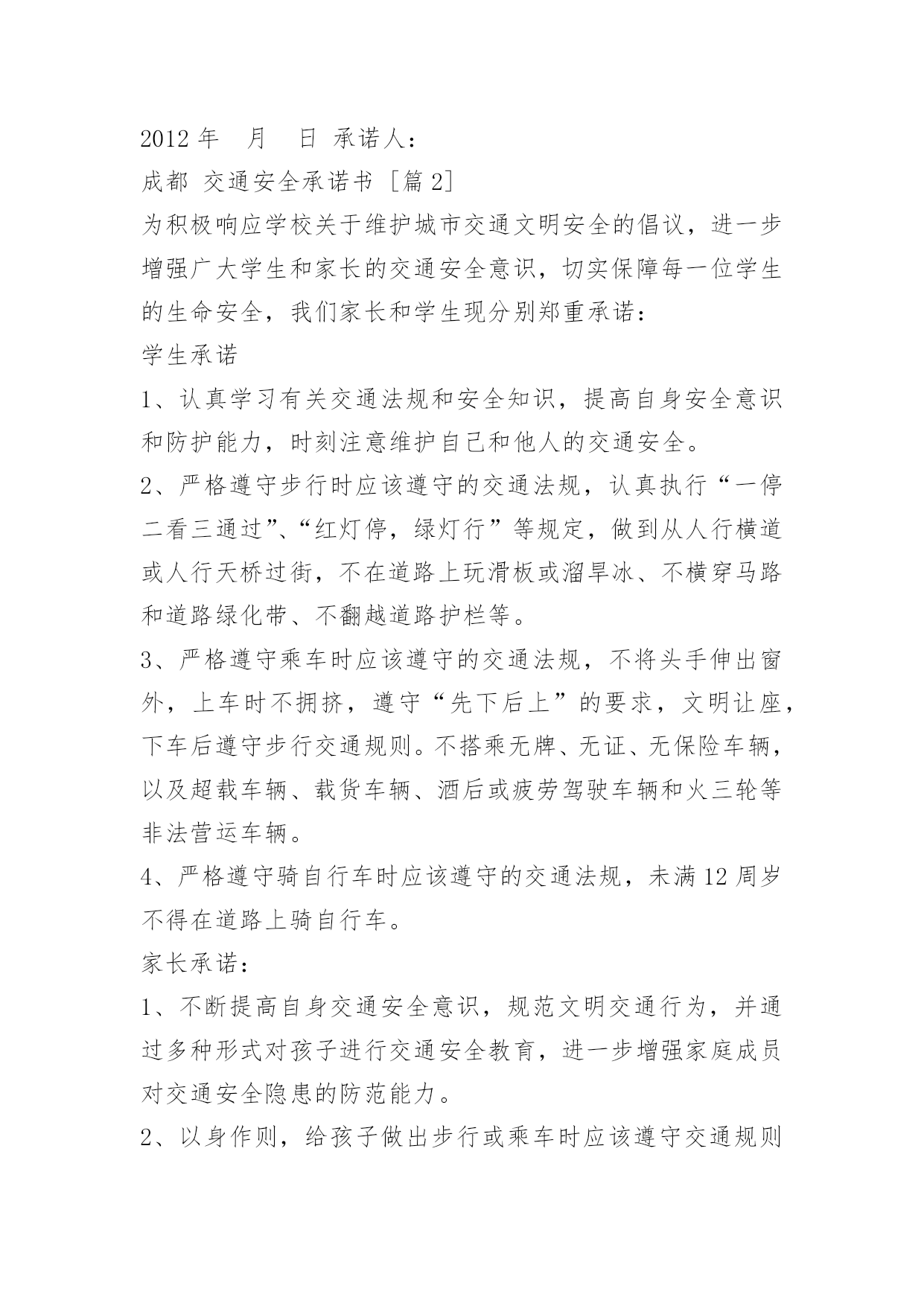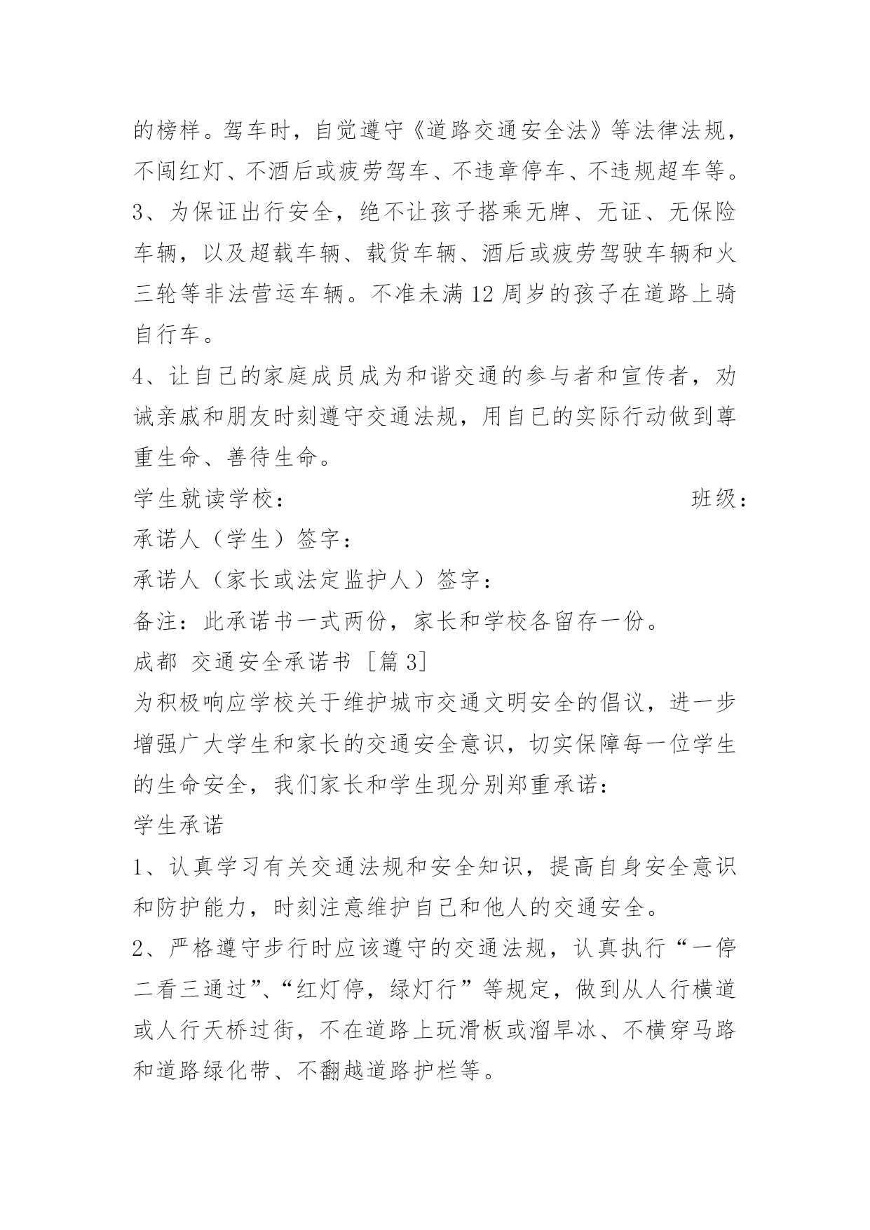 成都交通安全承诺书成都交通安全承诺书为加强我乡道路交通安全生产管理,进一步预防和减少道路交通事故,切实维护四都人民群众生命财产安全,我愿意为四都的道路交通安全贡献出一份自己的力量。带头遵守各项法律法规和规章制度,切实增强责任意识,认真履行公民职责,确保圆满完成各项工作任务。现公开承诺如下:1、本人保证持证驾驶,所拥有的车辆上户后上路行驶。2、绝不违章载人、非法载客营运。3、绝不带病作业,不驾驶报废的车辆上路行驶。4、不无证驾驶、不酒后驾驶、不驾驶无牌无证、未保险、未年检的车辆。不疲劳驾驶机动车和超载超员。5、按时年检、年审,不低照高驾,不驾驶未年检车辆上路行驶。6、遵守交通规则,绝不酒后驾车,超速行驶。7、坚决服从有关部门人员的监督检查,遵纪守法文明驾驶,严格遵守《农用拖拉机及驾驶人员安全监理规定》、《湖南省农机管理条例》、《中华人民共和国道路交通安全法》。8.加强安全学习,努力提高驾驶水平,积极参加乡办交通安全学习活动。本人自愿遵守以上守则,对本人行为负责,做文明守法公民。本人愿与全社会一起,共建安全、畅通、文明和谐的交通环境。2012年月日承诺人:成都交通安全承诺书[篇2]为积极响应学校关于维护城市交通文明安全的倡议,进一步增强广大学生和家长的交通安全意识,切实保障每一位学生的生命安全,我们家长和学生现分别郑重承诺:学生承诺1、认真学习有关交通法规和安全知识,提高自身安全意识和防护能力,时刻注意维护自己和他人的交通安全。2、严格遵守步行时应该遵守的交通法规,认真执行“一停二看三通过”、“红灯停,绿灯行”等规定,做到从人行横道或人行天桥过街,不在道路上玩滑板或溜旱冰、不横穿马路和道路绿化带、不翻越道路护栏等。3、严格遵守乘车时应该遵守的交通法规,不将头手伸出窗外,上车时不拥挤,遵守“先下后上”的要求,文明让座,下车后遵守步行交通规则。不搭乘无牌、无证、无保险车辆,以及超载车辆、载货车辆、酒后或疲劳驾驶车辆和火三轮等非法营运车辆。4、严格遵守骑自行车时应该遵守的交通法规,未满12周岁不得在道路上骑自行车。家长承诺:1、不断提高自身交通安全意识,规范文明交通行为,并通过多种形式对孩子进行交通安全教育,进一步增强家庭成员对交通安全隐患的防范能力。2、以身作则,给孩子做出步行或乘车时应该遵守交通规则的榜样。驾车时,自觉遵守《道路交通安全法》等法律法规,不闯红灯、不酒后或疲劳驾车、不违章停车、不违规超车等。3、为保证出行安全,绝不让孩子搭乘无牌、无证、无保险车辆,以及超载车辆、载货车辆、酒后或疲劳驾驶车辆和火三轮等非法营运车辆。不准未满12周岁的孩子在道路上骑自行车。4、让自己的家庭成员成为和谐交通的参与者和宣传者,劝诫亲戚和朋友时刻遵守交通法规,用自已的实际行动做到尊重生命、善待生命。学生就读学校:班级:承诺人(学生)签字:承诺人(家长或法定监护人)签字:备注:此承诺书一式两份,家长和学校各留存一份。成都交通安全承诺书[篇3]为积极响应学校关于维护城市交通文明安全的倡议,进一步增强广大学生和家长的交通安全意识,切实保障每一位学生的生命安全,我们家长和学生现分别郑重承诺:学生承诺1、认真学习有关交通法规和安全知识,提高自身安全意识和防护能力,时刻注意维护自己和他人的交通安全。2、严格遵守步行时应该遵守的交通法规,认真执行“一停二看三通过”、“红灯停,绿灯行”等规定,做到从人行横道或人行天桥过街,不在道路上玩滑板或溜旱冰、不横穿马路和道路绿化带、不翻越道路护栏等。3、严格遵守乘车时应该遵守的交通法规,不将头手伸出窗外,上车时不拥挤,遵守“先下后上”的要求,文明让座,下车后遵守步行交通规则。不搭乘无牌、无证、无保险车辆,以及超载车辆、载货车辆、酒后或疲劳驾驶车辆和火三轮等非法营运车辆。4、严格遵守骑自行车时应该遵守的交通法规,未满12周岁不得在道路上骑自行车。家长承诺:1、不断提高自身交通安全意识,规范文明交通行为,并通过多种形式对孩子进行交通安全教育,进一步增强家庭成员对交通安全隐患的防范能力。2、以身作则,给孩子做出步行或乘车时应该遵守交通规则的榜样。驾车时,自觉遵守《道路交通安全法》等法律法规,不闯红灯、不酒后或疲劳驾车、不违章停车、不违规超车等。3、为保证出行安全,绝不让孩子搭乘无牌、无证、无保险车辆,以及超载车辆、载货车辆、酒后或疲劳驾驶车辆和火三轮等非法营运车辆。不准未满12周岁的孩子在道路上骑自行车。4、让自己的家庭成员成为和谐交通的参与者和宣传者,劝诫亲戚和朋友时刻遵守交通法规,用自已的实际行动做到尊重生命、善待生命。学生就读班级:承诺人(学生)签字:承诺人(家长或法定监护人)签字:成都市九里堤小学2015年3月2日