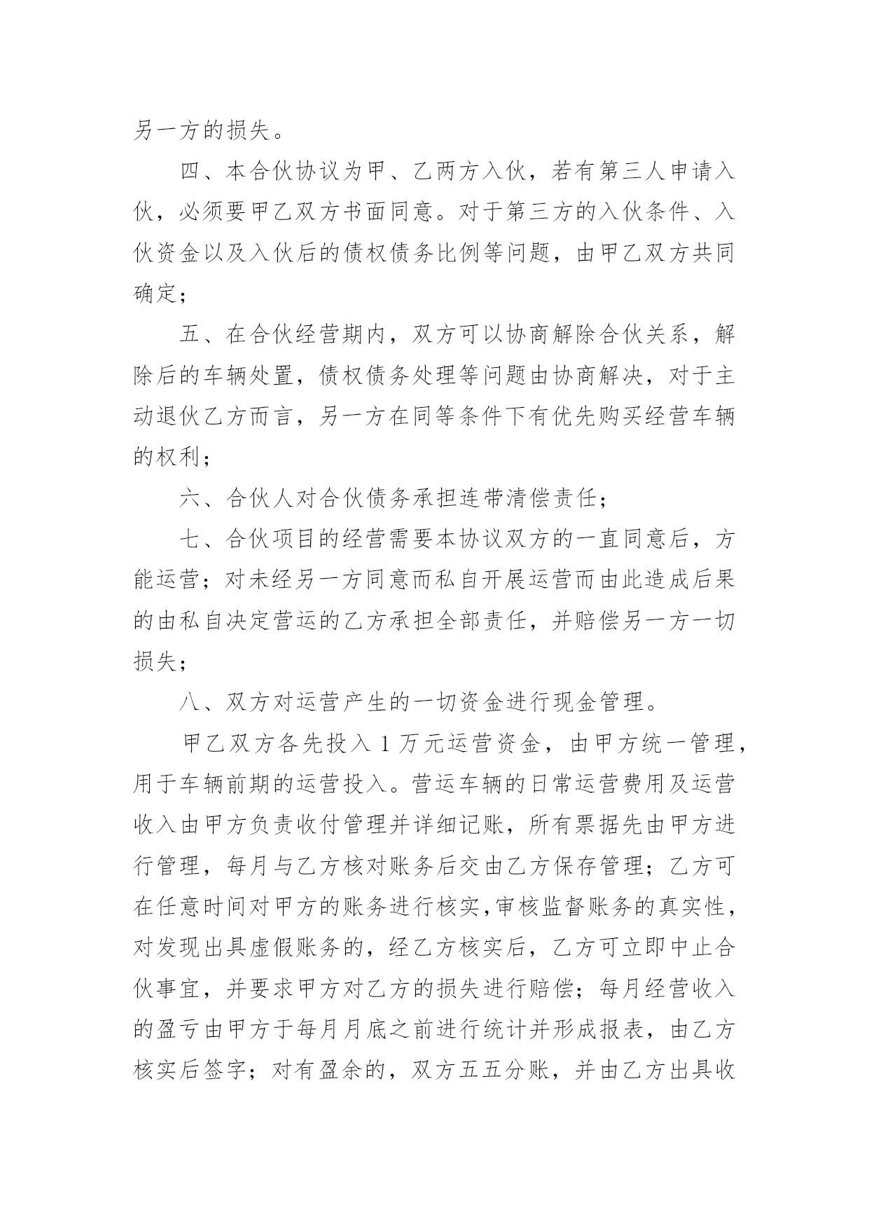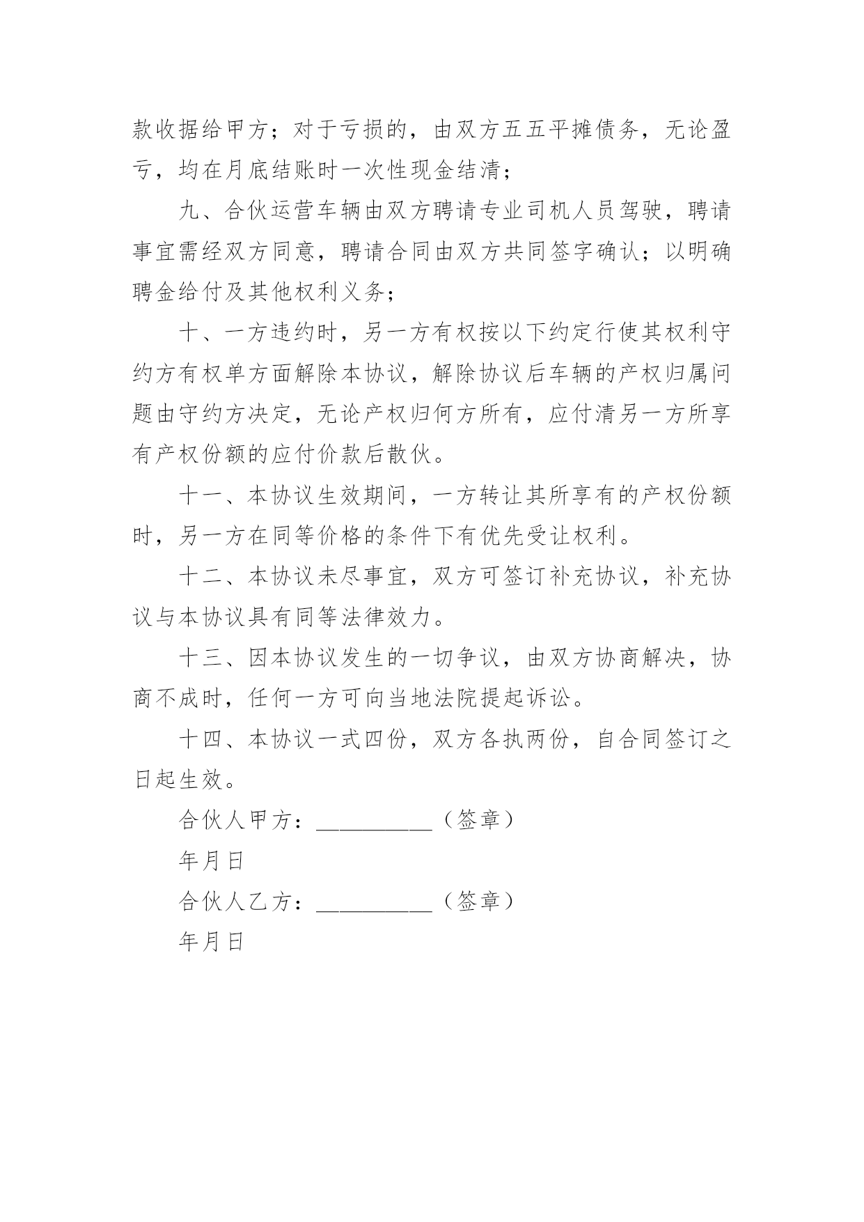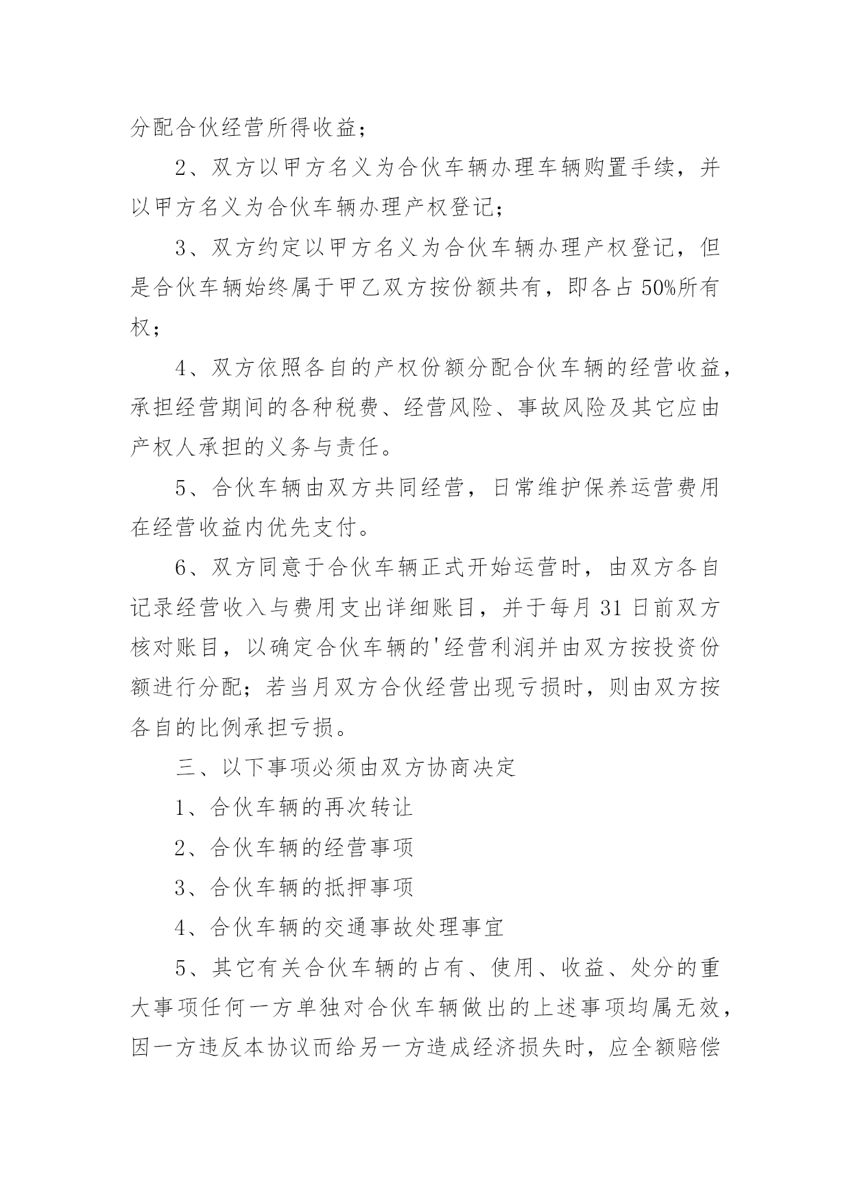合伙购车协议书协议书是指社会集团或个人处理各种社会关系、事务时常用的“契约”类文书,下面是关于合伙购车协议书的内容,欢迎阅读!合伙购车经营协议书甲方:___,身份证号:_____________乙方:___,身份证号:_____________为更好的发展上列合伙人甲乙双方本着公平、平等、互利、共担风险、共负盈亏的原则,订立合伙购车协议如下:一、合伙购买的车辆概况1、甲乙双方于201x年__月__日共同出资购买品牌为:__车辆一台,牌照号为_______(以下简称合伙车辆),该车发动机号:_______,底盘号:_________,合伙车辆价款为__万元加上挂牌、购置税、首次购买车辆保险费总价款为__万元,现在系全款购车。2、甲乙双方以“联营”方式合伙经营合伙车辆。3、本协议在合伙车辆存在期间且双方未解除本协议时始终有效。二、双方首付款出资共50万元,车辆产权份额如下:1、甲方首付款出资25万元,占购买合伙车辆总金额二分之一的产权份额(即50%);乙方出资25万元,占购买合伙车辆总额的二分之一产权份额(即50%),双方按上述产权分割比例,承担合伙经营中产生的合伙债务,也按上述比例分配合伙经营所得收益;2、双方以甲方名义为合伙车辆办理车辆购置手续,并以甲方名义为合伙车辆办理产权登记;3、双方约定以甲方名义为合伙车辆办理产权登记,但是合伙车辆始终属于甲乙双方按份额共有,即各占50%所有权;4、双方依照各自的产权份额分配合伙车辆的经营收益,承担经营期间的各种税费、经营风险、事故风险及其它应由产权人承担的义务与责任。5、合伙车辆由双方共同经营,日常维护保养运营费用在经营收益内优先支付。6、双方同意于合伙车辆正式开始运营时,由双方各自记录经营收入与费用支出详细账目,并于每月31日前双方核对账目,以确定合伙车辆的'经营利润并由双方按投资份额进行分配;若当月双方合伙经营出现亏损时,则由双方按各自的比例承担亏损。三、以下事项必须由双方协商决定1、合伙车辆的再次转让2、合伙车辆的经营事项3、合伙车辆的抵押事项4、合伙车辆的交通事故处理事宜5、其它有关合伙车辆的占有、使用、收益、处分的重大事项任何一方单独对合伙车辆做出的上述事项均属无效,因一方违反本协议而给另一方造成经济损失时,应全额赔偿另一方的损失。四、本合伙协议为甲、乙两方入伙,若有第三人申请入伙,必须要甲乙双方书面同意。对于第三方的入伙条件、入伙资金以及入伙后的债权债务比例等问题,由甲乙双方共同确定;五、在合伙经营期内,双方可以协商解除合伙关系,解除后的车辆处置,债权债务处理等问题由协商解决,对于主动退伙乙方而言,另一方在同等条件下有优先购买经营车辆的权利;六、合伙人对合伙债务承担连带清偿责任;七、合伙项目的经营需要本协议双方的一直同意后,方能运营;对未经另一方同意而私自开展运营而由此造成后果的由私自决定营运的乙方承担全部责任,并赔偿另一方一切损失;八、双方对运营产生的一切资金进行现金管理。甲乙双方各先投入1万元运营资金,由甲方统一管理,用于车辆前期的运营投入。营运车辆的日常运营费用及运营收入由甲方负责收付管理并详细记账,所有票据先由甲方进行管理,每月与乙方核对账务后交由乙方保存管理;乙方可在任意时间对甲方的账务进行核实,审核监督账务的真实性,对发现出具虚假账务的,经乙方核实后,乙方可立即中止合伙事宜,并要求甲方对乙方的损失进行赔偿;每月经营收入的盈亏由甲方于每月月底之前进行统计并形成报表,由乙方核实后签字;对有盈余的,双方五五分账,并由乙方出具收款收据给甲方;对于亏损的,由双方五五平摊债务,无论盈亏,均在月底结账时一次性现金结清;九、合伙运营车辆由双方聘请专业司机人员驾驶,聘请事宜需经双方同意,聘请合同由双方共同签字确认;以明确聘金给付及其他权利义务;十、一方违约时,另一方有权按以下约定行使其权利守约方有权单方面解除本协议,解除协议后车辆的产权归属问题由守约方决定,无论产权归何方所有,应付清另一方所享有产权份额的应付价款后散伙。十一、本协议生效期间,一方转让其所享有的产权份额时,另一方在同等价格的条件下有优先受让权利。十二、本协议未尽事宜,双方可签订补充协议,补充协议与本协议具有同等法律效力。十三、因本协议发生的一切争议,由双方协商解决,协商不成时,任何一方可向当地法院提起诉讼。十四、本协议一式四份,双方各执两份,自合同签订之日起生效。合伙人甲方:_____(签章)年月日合伙人乙方:_____(签章)年月日