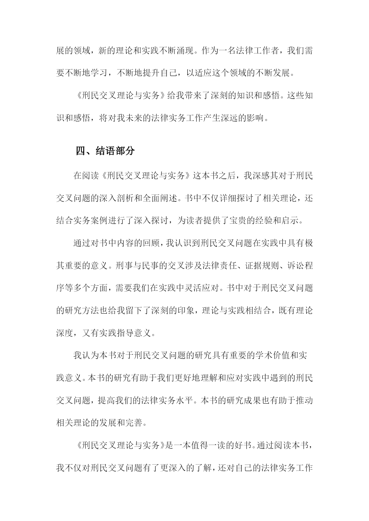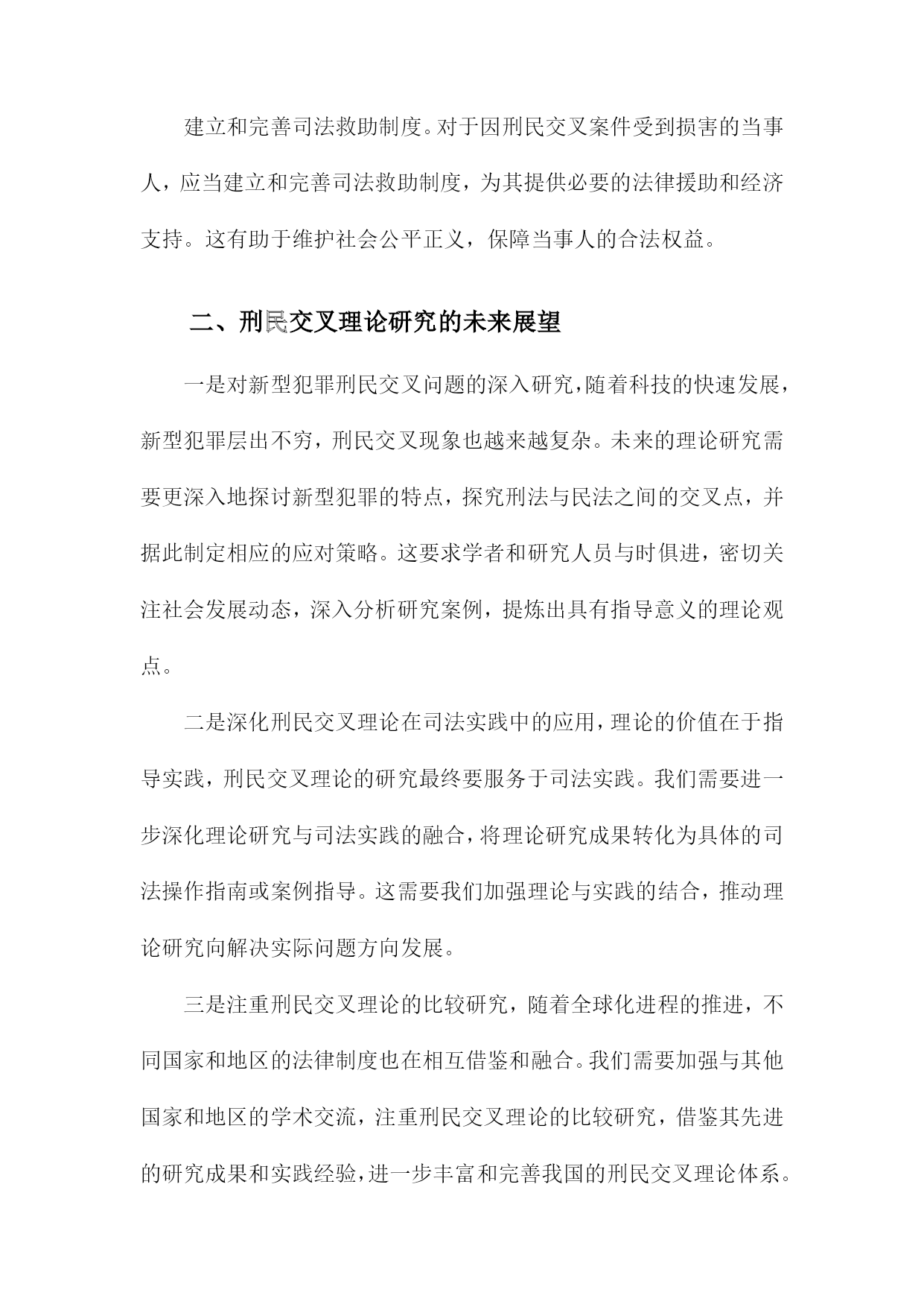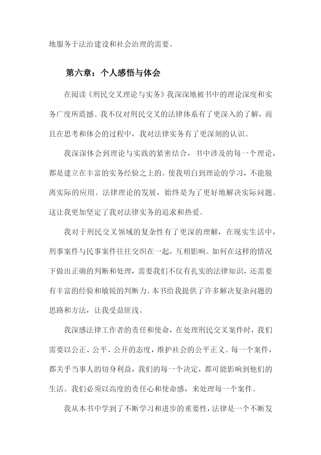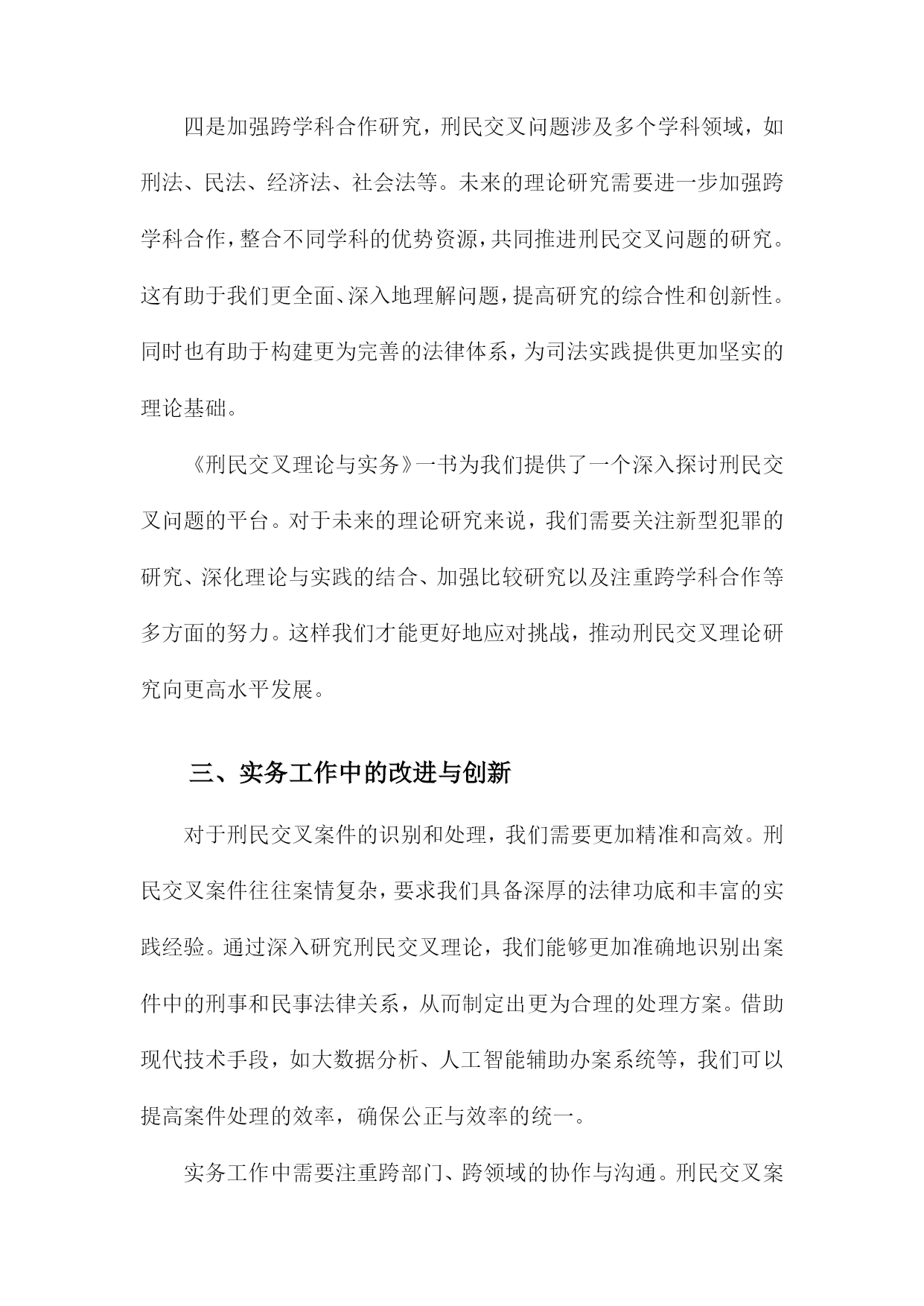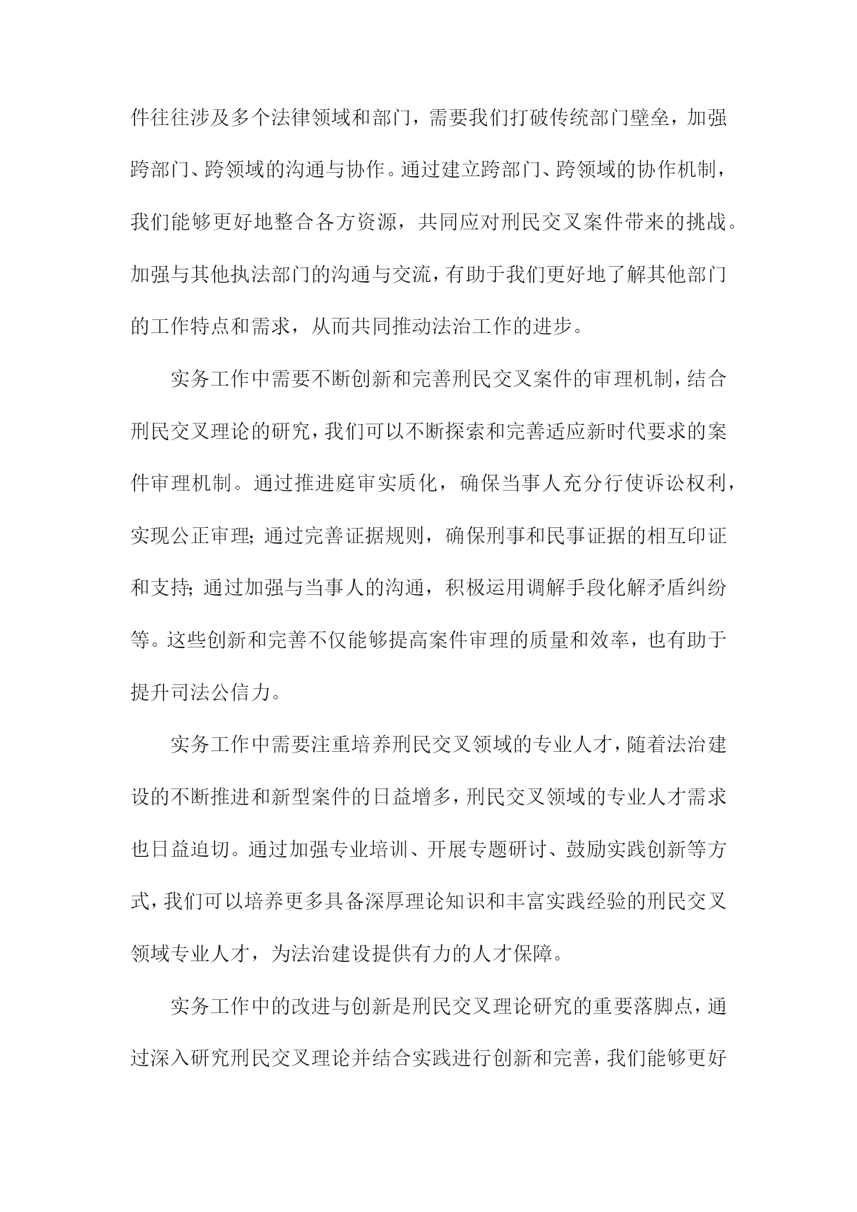 《刑民交叉理论与实务》读书笔记一、完善刑民交叉立法的建议明确刑民交叉案件的处理原则。在立法层面上,应当确立明确的处理刑民交叉案件的基本原则,以指导司法实践。这包括明确刑事与民事责任的界定标准,以及刑事与民事诉讼的衔接方式。建立健全刑民交叉案件的立法体系。针对不同类型的刑民交叉案件,应当制定具体的法律规定,明确其构成要件、处理程序和法律责任。这有助于解决当前司法实践中存在的法律适用不统一的问题。强化刑民交叉案件的协调配合机制。在立法中应当明确刑事与民事审判机关之间的协调配合机制,确保刑事案件与民事案件能够相互衔接、相互支持。这包括加强信息共享、证据交换和案件移送等方面的规定。完善刑民交叉案件的管辖制度。针对刑民交叉案件的特殊性,应当完善管辖制度,明确各级法院之间的管辖范围和职责。应当允许当事人在符合一定条件下选择诉讼途径,保障当事人的诉讼权利。加强法律职业共同体建设。刑民交叉案件的处理需要刑事和民事法律专业人士的共同参与和协作。应当加强法律职业共同体的建设,提高法律专业人士的素质和能力,确保刑民交叉案件得到妥善处理。建立和完善司法救助制度。对于因刑民交叉案件受到损害的当事人,应当建立和完善司法救助制度,为其提供必要的法律援助和经济支持。这有助于维护社会公平正义,保障当事人的合法权益。二、刑民交叉理论研究的未来展望一是对新型犯罪刑民交叉问题的深入研究,随着科技的快速发展,新型犯罪层出不穷,刑民交叉现象也越来越复杂。未来的理论研究需要更深入地探讨新型犯罪的特点,探究刑法与民法之间的交叉点,并据此制定相应的应对策略。这要求学者和研究人员与时俱进,密切关注社会发展动态,深入分析研究案例,提炼出具有指导意义的理论观点。二是深化刑民交叉理论在司法实践中的应用,理论的价值在于指导实践,刑民交叉理论的研究最终要服务于司法实践。我们需要进一步深化理论研究与司法实践的融合,将理论研究成果转化为具体的司法操作指南或案例指导。这需要我们加强理论与实践的结合,推动理论研究向解决实际问题方向发展。三是注重刑民交叉理论的比较研究,随着全球化进程的推进,不同国家和地区的法律制度也在相互借鉴和融合。我们需要加强与其他国家和地区的学术交流,注重刑民交叉理论的比较研究,借鉴其先进的研究成果和实践经验,进一步丰富和完善我国的刑民交叉理论体系。四是加强跨学科合作研究,刑民交叉问题涉及多个学科领域,如刑法、民法、经济法、社会法等。未来的理论研究需要进一步加强跨学科合作,整合不同学科的优势资源,共同推进刑民交叉问题的研究。这有助于我们更全面、深入地理解问题,提高研究的综合性和创新性。同时也有助于构建更为完善的法律体系,为司法实践提供更加坚实的理论基础。《刑民交叉理论与实务》一书为我们提供了一个深入探讨刑民交叉问题的平台。对于未来的理论研究来说,我们需要关注新型犯罪的研究、深化理论与实践的结合、加强比较研究以及注重跨学科合作等多方面的努力。这样我们才能更好地应对挑战,推动刑民交叉理论研究向更高水平发展。三、实务工作中的改进与创新对于刑民交叉案件的识别和处理,我们需要更加精准和高效。刑民交叉案件往往案情复杂,要求我们具备深厚的法律功底和丰富的实践经验。通过深入研究刑民交叉理论,我们能够更加准确地识别出案件中的刑事和民事法律关系,从而制定出更为合理的处理方案。借助现代技术手段,如大数据分析、人工智能辅助办案系统等,我们可以提高案件处理的效率,确保公正与效率的统一。实务工作中需要注重跨部门、跨领域的协作与沟通。刑民交叉案件往往涉及多个法律领域和部门,需要我们打破传统部门壁垒,加强跨部门、跨领域的沟通与协作。通过建立跨部门、跨领域的协作机制,我们能够更好地整合各方资源,共同应对刑民交叉案件带来的挑战。加强与其他执法部门的沟通与交流,有助于我们更好地了解其他部门的工作特点和需求,从而共同推动法治工作的进步。实务工作中需要不断创新和完善刑民交叉案件的审理机制,结合刑民交叉理论的研究,我们可以不断探索和完善适应新时代要求的案件审理机制。通过推进庭审实质化,确保当事人充分行使诉讼权利,实现公正审理;通过完善证据规则,确保刑事和民事证据的相互印证和支持;通过加强与当事人的沟通,积极运用调解手段化解矛盾纠纷等。这些创新和完善不仅能够提高案件审理的质量和效率,也有助于提升司法公信力。实务工作中需要注重培养刑民交叉领域的专业人才,随着法治建设的不断推进和新型案件的日益增多,刑民交叉领域的专业人才需求也日益迫切。通过加强专业培训、开展专题研讨、鼓励实践创新等方式,我们可以培养更多具备深厚理论知识和丰富实践经验的刑民交叉领域专业人才,为法治建设提供有力的人才保障。实务工作中的改进与创新是刑民交叉理论研究的重要落脚点,通过深入研究刑民交叉理论并结合实践进行创新和完善,