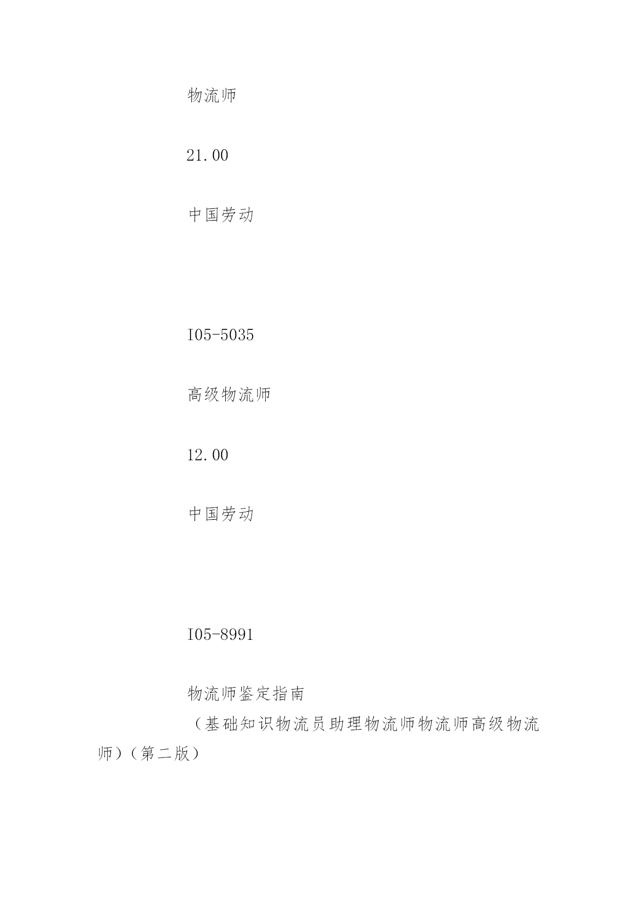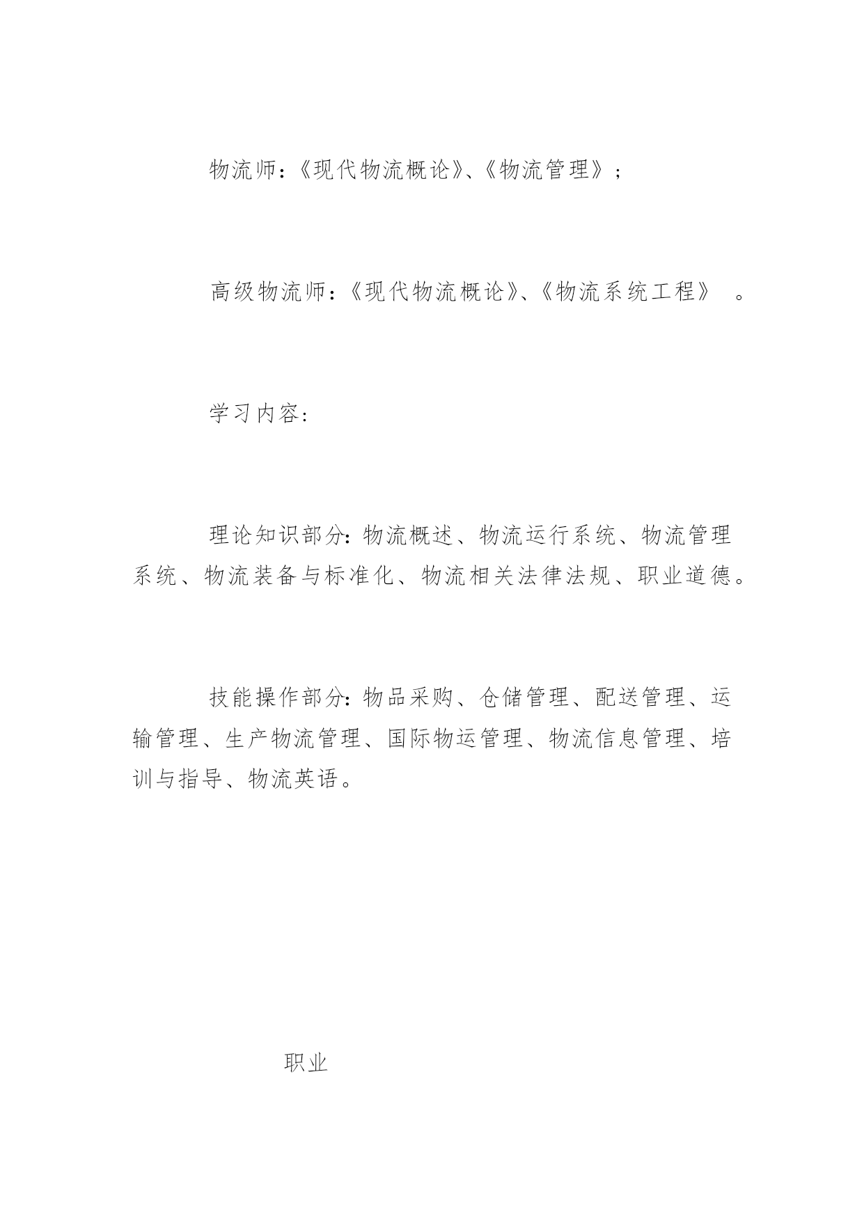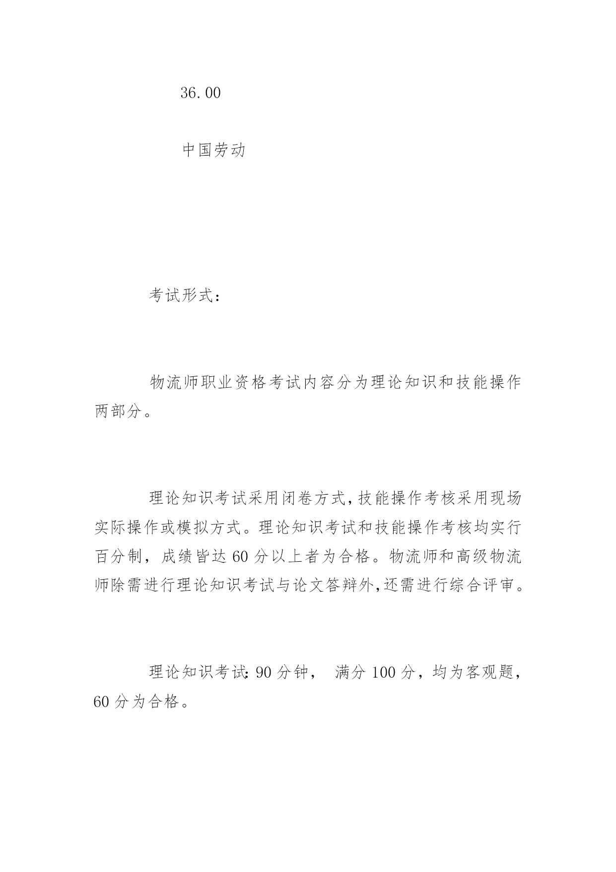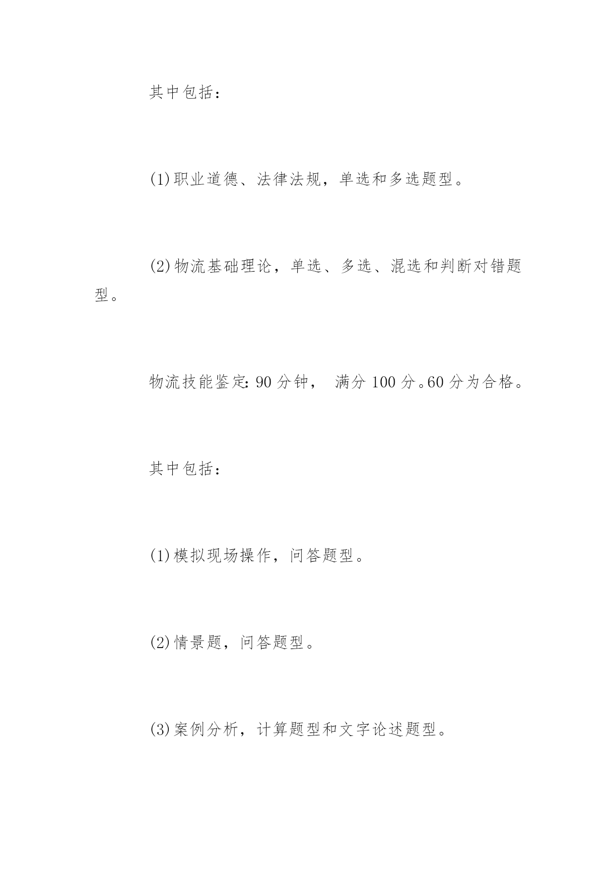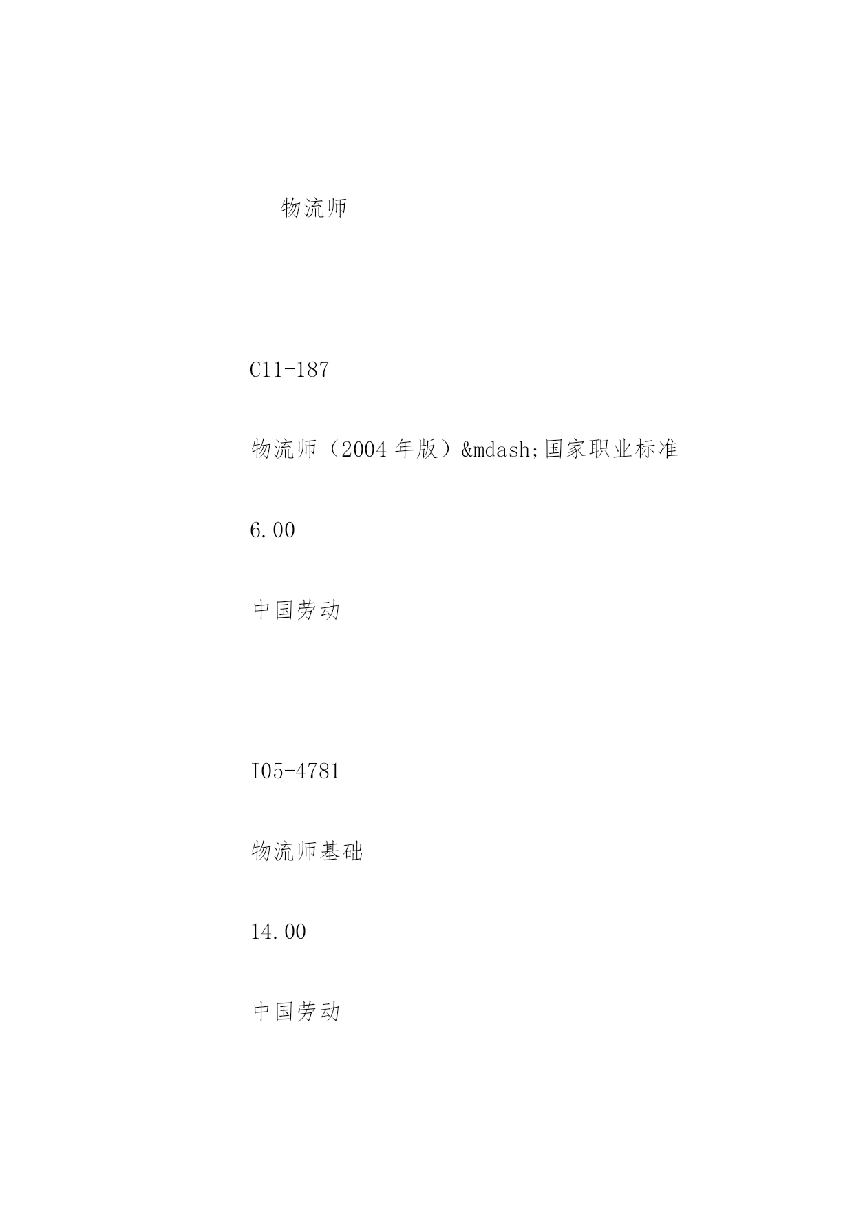 物流师考试的内容物流师考试的内容物流师考试分为:物流员(国家职业资格四级)、助理物流师(国家职业资格三级)、物流师(国家职业资格二级)、高级物流师(国家职业资格一级)。下面是考试的具体内容:考试教材:助理物流师:《物流基础》、《助理物流师培训教程》。物流师:《物流基础》、《物流师培训教程》考试科目:助理物流师:《现代物流概论》、《物流实务》;物流师:《现代物流概论》、《物流管理》;高级物流师:《现代物流概论》、《物流系统工程》。学习内容:理论知识部分:物流概述、物流运行系统、物流管理系统、物流装备与标准化、物流相关法律法规、职业道德。技能操作部分:物品采购、仓储管理、配送管理、运输管理、生产物流管理、国际物运管理、物流信息管理、培训与指导、物流英语。职业书代号书名定价出版社物流师C11-187物流师(2004年版)—国家职业标准6.00中国劳动I05-4781物流师基础14.00中国劳动I05-4784物流员18.00中国劳动I05-4783助理物流师18.00中国劳动I05-4796物流师21.00中国劳动I05-5035高级物流师12.00中国劳动I05-8991物流师鉴定指南(基础知识物流员助理物流师物流师高级物流师)(第二版)36.00中国劳动考试形式:物流师职业资格考试内容分为理论知识和技能操作两部分。理论知识考试采用闭卷方式,技能操作考核采用现场实际操作或模拟方式。理论知识考试和技能操作考核均实行百分制,成绩皆达60分以上者为合格。物流师和高级物流师除需进行理论知识考试与论文答辩外,还需进行综合评审。理论知识考试:90分钟,满分100分,均为客观题,60分为合格。其中包括:(1)职业道德、法律法规,单选和多选题型。(2)物流基础理论,单选、多选、混选和判断对错题型。物流技能鉴定:90分钟,满分100分。60分为合格。其中包括:(1)模拟现场操作,问答题型。(2)情景题,问答题型。(3)案例分析,计算题型和文字论述题型。论文撰写评审:3000至5000字,要求有图、表、数据、参考文献,由专家组评审。论文答辩评审:现场答辩,每人用15分钟时间汇报论文和回答提问,由专家组评审。考核方案:职业等级鉴定内容题型题量答题方式分值权重物流师4-3级职业道德选择题125题卡作答2510%理论知识10090%技能操作选择题100100100%2级职业道德选择题125题卡作答2510%理论知识10090%技能操作计算题案例分析题 纸笔作答