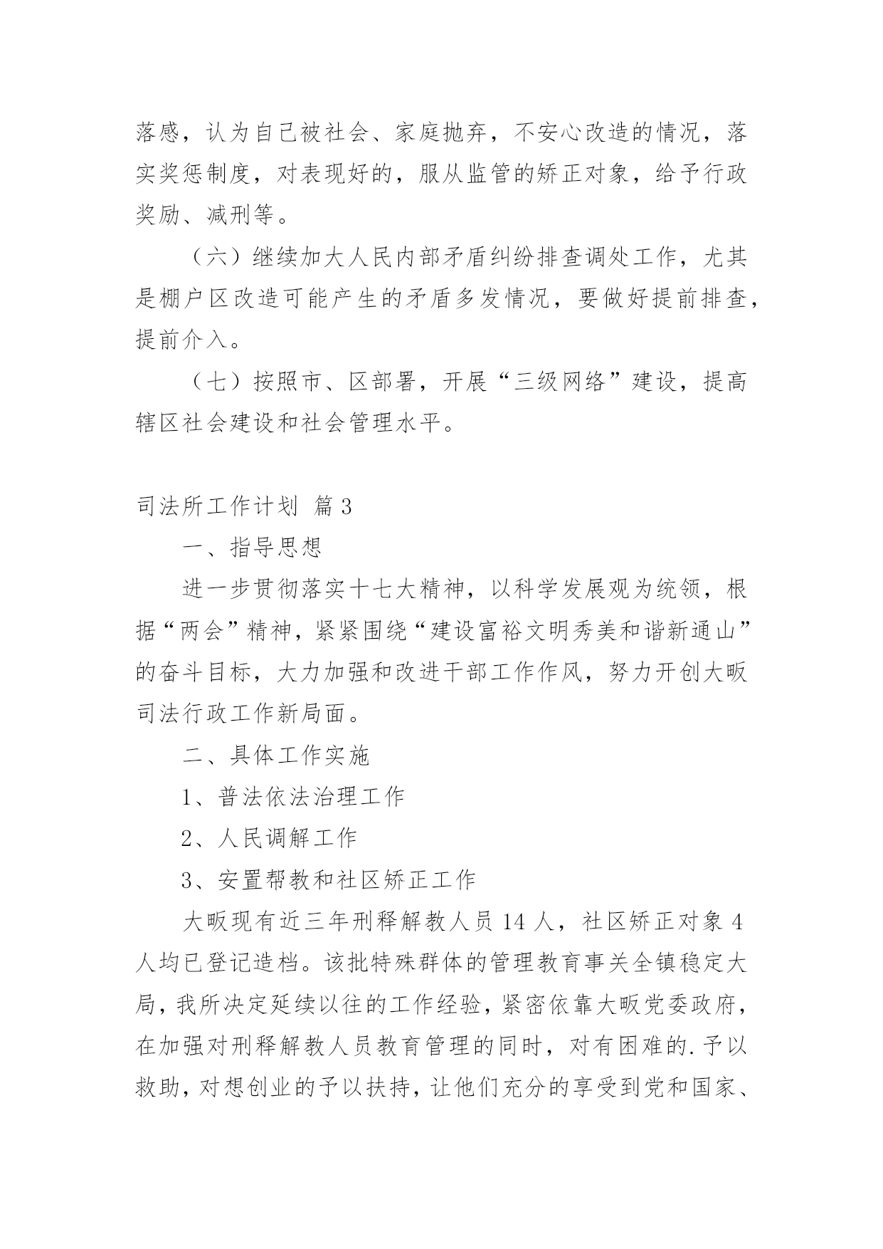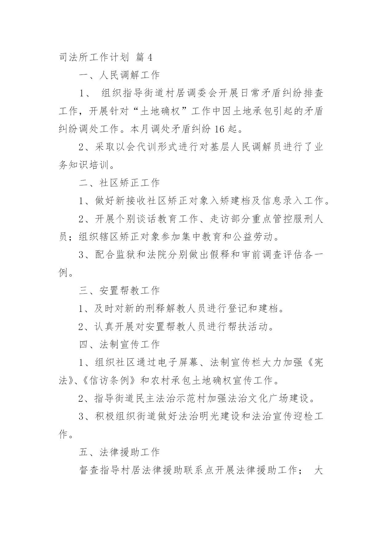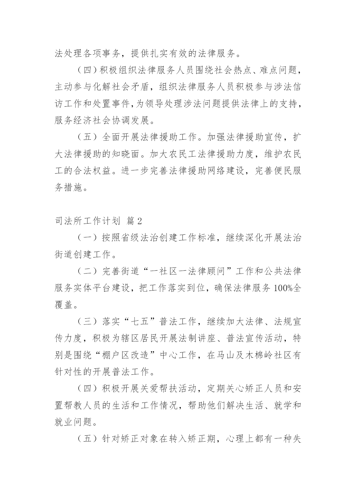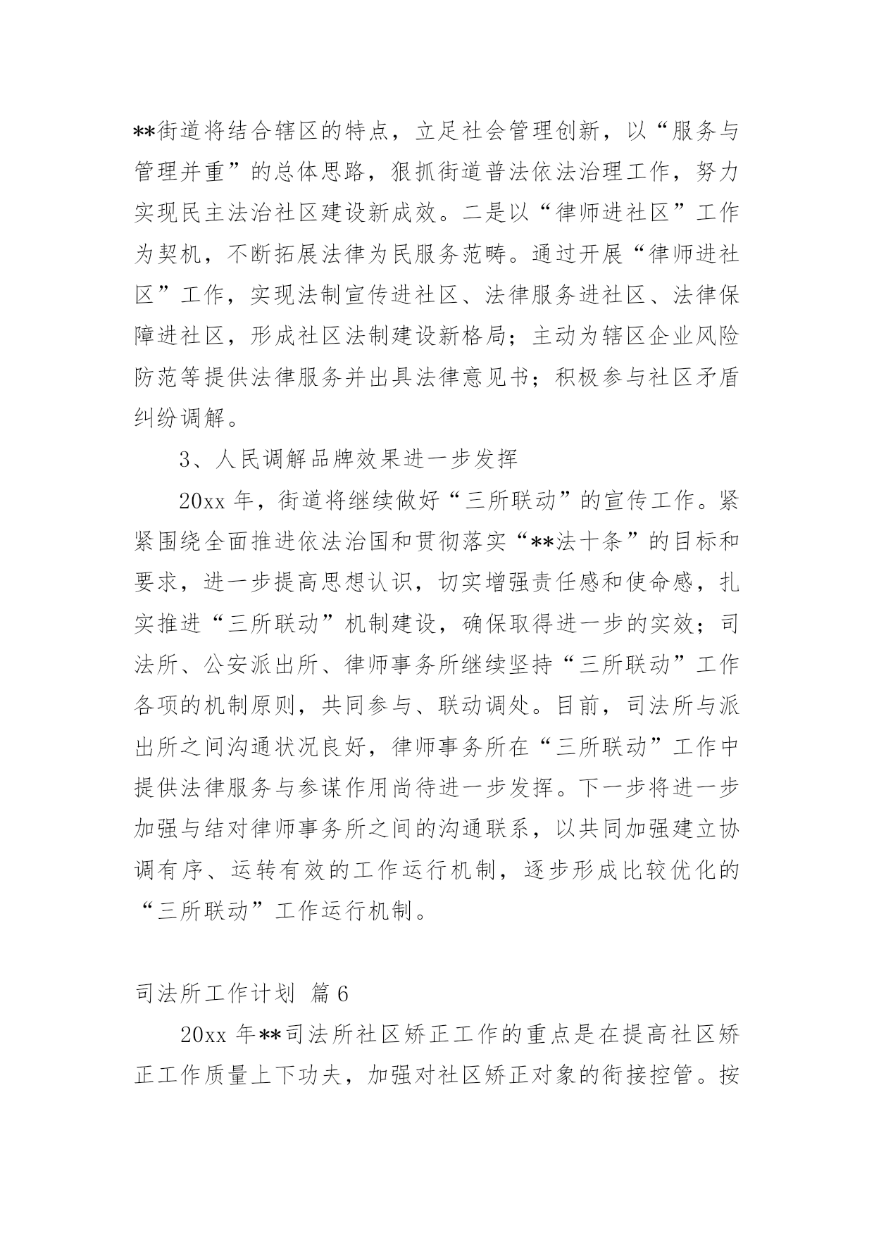 司法所工作计划司法所工作计划汇编六篇时间过得真快,总在不经意间流逝,我们又将续写新的诗篇,展开新的旅程,写一份计划,为接下来的工作做准备吧!相信大家又在为写计划犯愁了吧?下面是小编收集整理的司法所工作计划6篇,希望对大家有所帮助。司法所工作计划篇120xx年我区司法行政工作的指导思想是:牢固树立社会主义法治理念,紧紧围绕区委、区政府的中心工作,以化解矛盾纠纷、维护社会和谐稳定为主线,认真履职,不断实现法律服务深化发展、法律保障更加有力、法制宣传成效突出、基层建设整体加强、队伍建设全面提高,努力开创司法行政工作的新局面。一、普法和依法治区工作(一)扎实推进“五五”普法规划,深入开展多层次、多形式、多渠道、全方位的全民法制宣传教育活动。(二)加强对重点对象的法制宣传教育,力求在普法形式、措施上不断取得突破。一是切实加强宪法和重点法律法规宣传。二是认真落实区领导干部学法用法工作实施办,加强队伍特别是领导干部的法制宣传教育。三是认真落实《中小学法制教育指导纲要》,加强对学校法制教育力量的培训。四是认真落实企业经营管理人员学法用法工作实施办,加强企业经营管理人员的法制宣传教育,促进企业规范化管理。五是加大社区法制宣传教育力度,重点抓好农民工的法制宣传教育工作。六是大力推进“法律六进”活动,结合创建全国文明城市,开展有针对性的群众法制宣传教育活动,力争参与法制宣传教育活动的知晓率达80%。(三)进一步深化依法治区工作围绕区中心工作,加强对普法依法治理工作的组织指导和沟通协调,加大目标运行监控力度。深化基层依法治理,积极开展“民主法治社区、乡村”的创建活动,为我区社会各项事业的健康发展营造良好的法治环境。二、法律服务工作(一)强化法律服务管理,不断强化法律服务人员的职业道德执业纪律教育,清理整顿法律服务市场,规范执业行为;积极组织法律服务人员提供全方位的法律服务。(二)加强政府法律顾问工作,不断完善政府法律顾问工作机制,组织法律顾问地参与政府管理和决策过程,当好法律参谋,协助政府机关提高依法管理、依法决策、依法办事的水平,促进依法治区的开展,推进法治政府建设。(三)认真开展法律进社区。为基层政府依法行政、依法处理各项事务,提供扎实有效的法律服务。(四)积极组织法律服务人员围绕社会热点、难点问题,主动参与化解社会矛盾,组织法律服务人员积极参与涉法信访工作和处置事件,为领导处理涉法问题提供法律上的支持,服务经济社会协调发展。(五)全面开展法律援助工作。加强法律援助宣传,扩大法律援助的知晓面。加大农民工法律援助力度,维护农民工的合法权益。进一步完善法律援助网络建设,完善便民服务措施。司法所工作计划篇2(一)按照省级法治创建工作标准,继续深化开展法治街道创建工作。(二)完善街道“一社区一法律顾问”工作和公共法律服务实体平台建设,把工作落实到位,确保法律服务100%全覆盖。(三)落实“七五”普法工作,继续加大法律、法规宣传力度,积极为辖区居民开展法制讲座、普法宣传活动,特别是围绕“棚户区改造”中心工作,在马山及木棉岭社区有针对性的开展普法工作。(四)积极开展关爱帮扶活动,定期关心矫正人员和安置帮教人员的生活和工作情况,帮助他们解决生活、就学和就业问题。(五)针对矫正对象在转入矫正期,心理上都有一种失落感,认为自己被社会、家庭抛弃,不安心改造的情况,落实奖惩制度,对表现好的,服从监管的矫正对象,给予行政奖励、减刑等。(六)继续加大人民内部矛盾纠纷排查调处工作,尤其是棚户区改造可能产生的矛盾多发情况,要做好提前排查,提前介入。(七)按照市、区部署,开展“三级网络”建设,提高辖区社会建设和社会管理水平。司法所工作计划篇3一、指导思想进一步贯彻落实十七大精神,以科学发展观为统领,根据“两会”精神,紧紧围绕“建设富裕文明秀美和谐新通山”的奋斗目标,大力加强和改进干部工作作风,努力开创大畈司法行政工作新局面。二、具体工作实施1、普法依法治理工作2、人民调解工作3、安置帮教和社区矫正工作大畈现有近三年刑释解教人员14人,社区矫正对象4人均已登记造档。该批特殊群体的管理教育事关全镇稳定大局,我所决定延续以往的工作经验,紧密依靠大畈党委政府,在加强对刑释解教人员教育管理的同时,对有困难的.予以救助,对想创业的予以扶持,让他们充分的享受到党和国家、社会给予的温暖,从而实现远离重新犯罪的工作目标。4、法律援助工作基层法律援助工作是一项为民办实事的工作,在很大程度上可以起到缓解矛盾纠纷,避免民转刑案件发生的重要作用。20xx年,我所将严格按照《工作目标责任书》所确定的内容,认真做好大畈镇法律援助工作,牢固树立大局意识,增强服务观念,强化服务功能,履行社会责任,以维护社会公平正义为己任。在服务过程中严格遵守法律援助不收费,法律咨询不收费,法律宣传不收费的“三不”原则,为大