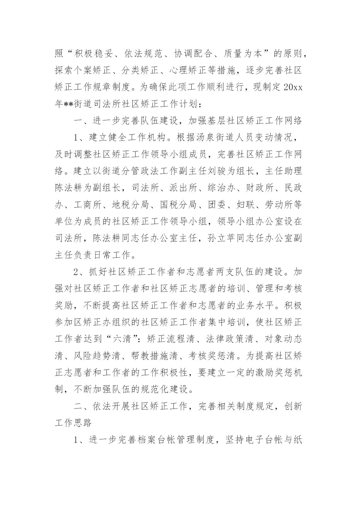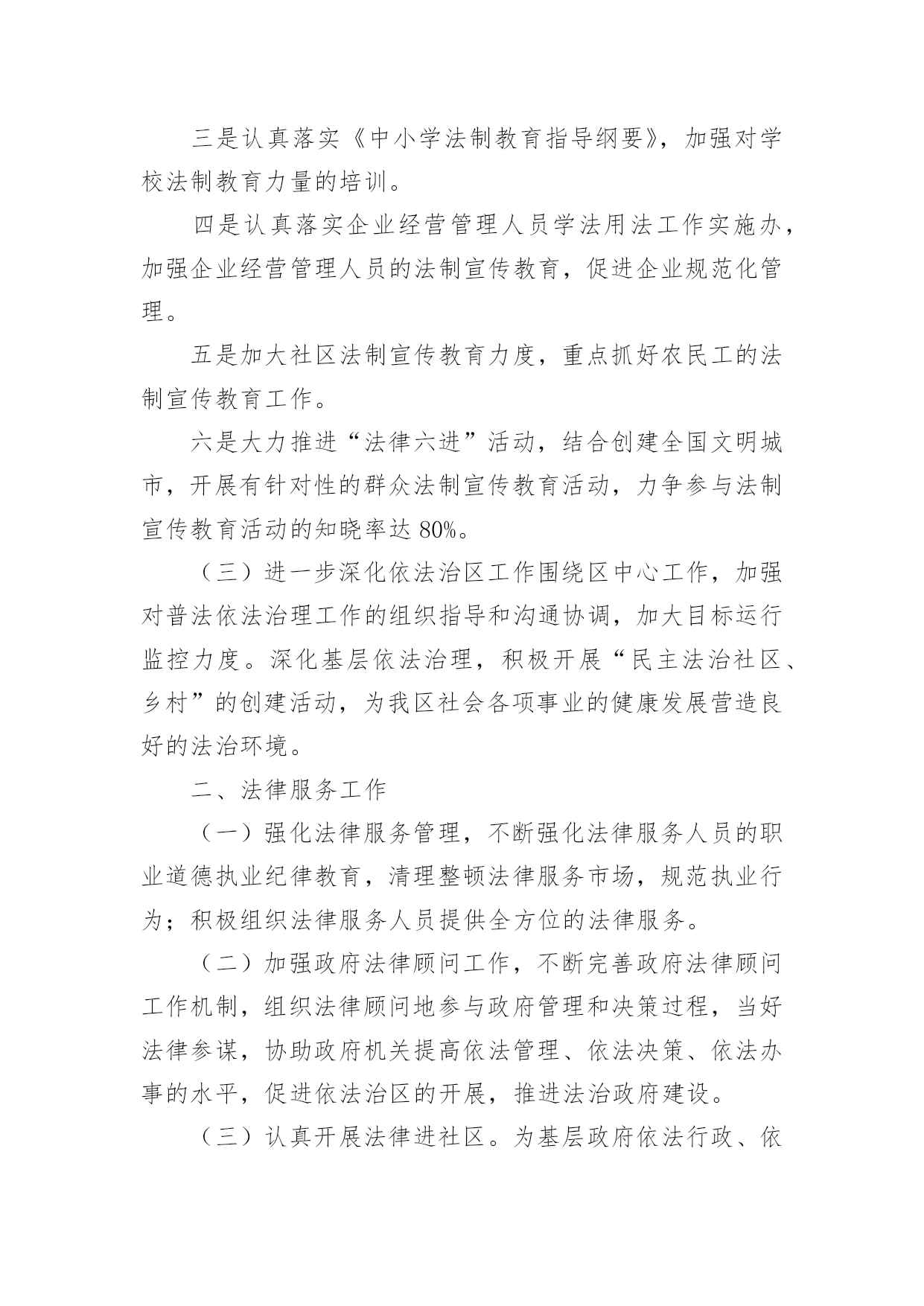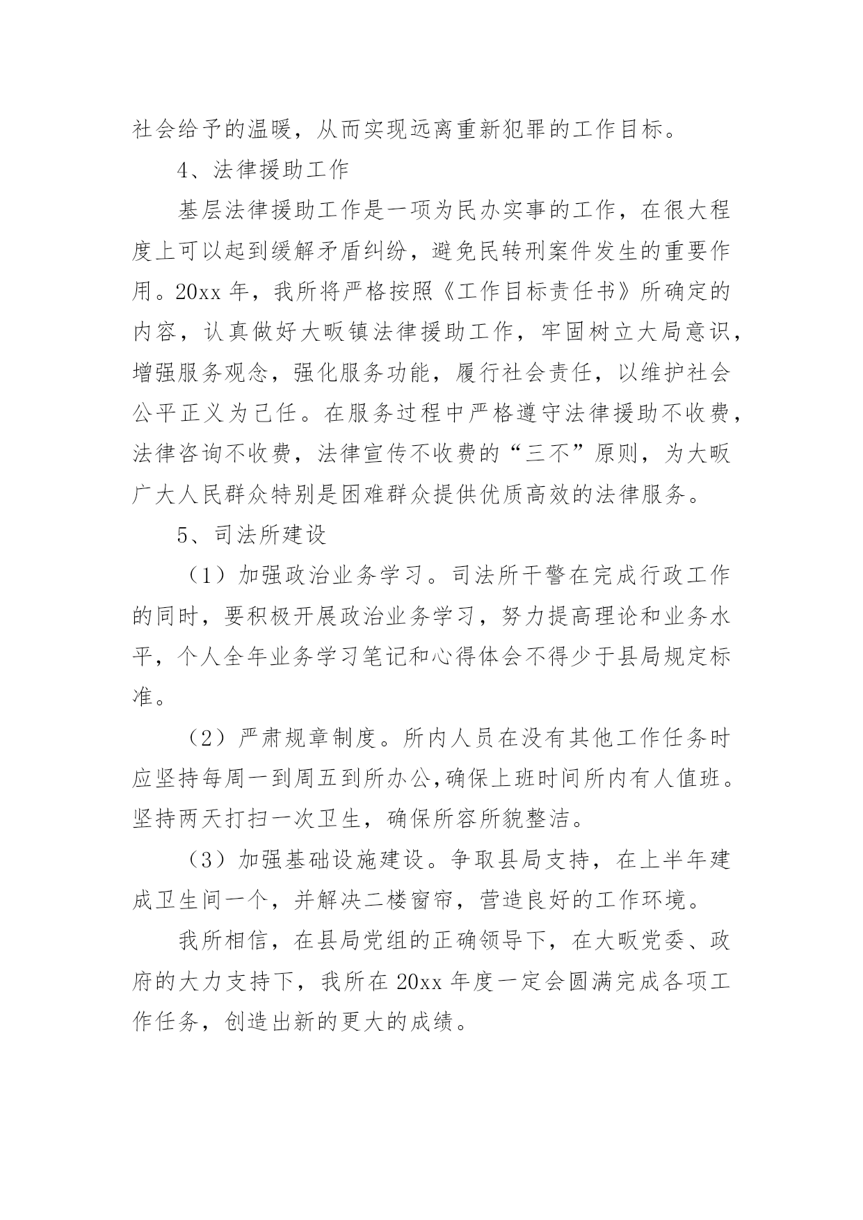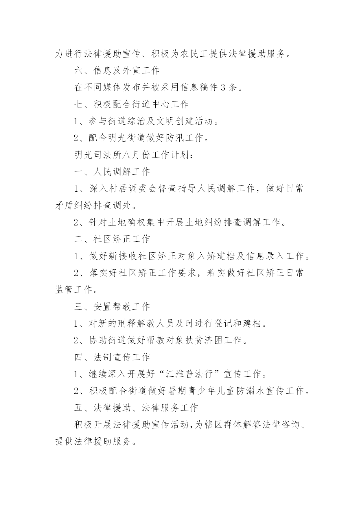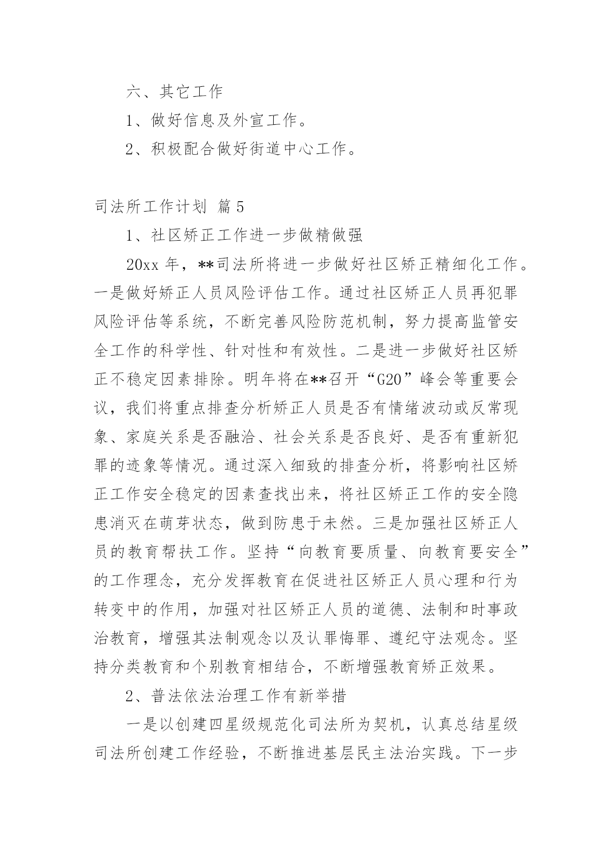 司法所工作计划司法所工作计划汇编六篇时间过得真快,总在不经意间流逝,我们又将续写新的诗篇,展开新的旅程,写一份计划,为接下来的工作做准备吧!相信大家又在为写计划犯愁了吧?下面是小编收集整理的司法所工作计划6篇,希望对大家有所帮助。司法所工作计划篇120xx年我区司法行政工作的指导思想是:牢固树立社会主义法治理念,紧紧围绕区委、区政府的中心工作,以化解矛盾纠纷、维护社会和谐稳定为主线,认真履职,不断实现法律服务深化发展、法律保障更加有力、法制宣传成效突出、基层建设整体加强、队伍建设全面提高,努力开创司法行政工作的新局面。一、普法和依法治区工作(一)扎实推进“五五”普法规划,深入开展多层次、多形式、多渠道、全方位的全民法制宣传教育活动。(二)加强对重点对象的法制宣传教育,力求在普法形式、措施上不断取得突破。一是切实加强宪法和重点法律法规宣传。二是认真落实区领导干部学法用法工作实施办,加强队伍特别是领导干部的法制宣传教育。三是认真落实《中小学法制教育指导纲要》,加强对学校法制教育力量的培训。四是认真落实企业经营管理人员学法用法工作实施办,加强企业经营管理人员的法制宣传教育,促进企业规范化管理。五是加大社区法制宣传教育力度,重点抓好农民工的法制宣传教育工作。六是大力推进“法律六进”活动,结合创建全国文明城市,开展有针对性的群众法制宣传教育活动,力争参与法制宣传教育活动的知晓率达80%。(三)进一步深化依法治区工作围绕区中心工作,加强对普法依法治理工作的组织指导和沟通协调,加大目标运行监控力度。深化基层依法治理,积极开展“民主法治社区、乡村”的创建活动,为我区社会各项事业的健康发展营造良好的法治环境。二、法律服务工作(一)强化法律服务管理,不断强化法律服务人员的职业道德执业纪律教育,清理整顿法律服务市场,规范执业行为;积极组织法律服务人员提供全方位的法律服务。(二)加强政府法律顾问工作,不断完善政府法律顾问工作机制,组织法律顾问地参与政府管理和决策过程,当好法律参谋,协助政府机关提高依法管理、依法决策、依法办事的水平,促进依法治区的开展,推进法治政府建设。(三)认真开展法律进社区。为基层政府依法行政、依法处理各项事务,提供扎实有效的法律服务。(四)积极组织法律服务人员围绕社会热点、难点问题,主动参与化解社会矛盾,组织法律服务人员积极参与涉法信访工作和处置事件,为领导处理涉法问题提供法律上的支持,服务经济社会协调发展。(五)全面开展法律援助工作。加强法律援助宣传,扩大法律援助的知晓面。加大农民工法律援助力度,维护农民工的合法权益。进一步完善法律援助网络建设,完善便民服务措施。司法所工作计划篇2(一)按照省级法治创建工作标准,继续深化开展法治街道创建工作。(二)完善街道“一社区一法律顾问”工作和公共法律服务实体平台建设,把工作落实到位,确保法律服务100%全覆盖。(三)落实“七五”普法工作,继续加大法律、法规宣传力度,积极为辖区居民开展法制讲座、普法宣传活动,特别是围绕“棚户区改造”中心工作,在马山及木棉岭社区有针对性的开展普法工作。(四)积极开展关爱帮扶活动,定期关心矫正人员和安置帮教人员的生活和工作情况,帮助他们解决生活、就学和就业问题。(五)针对矫正对象在转入矫正期,心理上都有一种失落感,认为自己被社会、家庭抛弃,不安心改造的情况,落实奖惩制度,对表现好的,服从监管的矫正对象,给予行政奖励、减刑等。(六)继续加大人民内部矛盾纠纷排查调处工作,尤其是棚户区改造可能产生的矛盾多发情况,要做好提前排查,提前介入。(七)按照市、区部署,开展“三级网络”建设,提高辖区社会建设和社会管理水平。司法所工作计划篇3一、指导思想进一步贯彻落实十七大精神,以科学发展观为统领,根据“两会”精神,紧紧围绕“建设富裕文明秀美和谐新通山”的奋斗目标,大力加强和改进干部工作作风,努力开创大畈司法行政工作新局面。二、具体工作实施1、普法依法治理工作2、人民调解工作3、安置帮教和社区矫正工作大畈现有近三年刑释解教人员14人,社区矫正对象4人均已登记造档。该批特殊群体的管理教育事关全镇稳定大局,我所决定延续以往的工作经验,紧密依靠大畈党委政府,在加强对刑释解教人员教育管理的同时,对有困难的.予以救助,对想创业的予以扶持,让他们充分的享受到党和国家、社会给予的温暖,从而实现远离重新犯罪的工作目标。4、法律援助工作基层法律援助工作是一项为民办实事的工作,在很大程度上可以起到缓解矛盾纠纷,避免民转刑案件发生的重要作用。20xx年,我所将严格按照《工作目标责任书》所确定的内容,认真做好大畈镇法律援助工作,牢固树立大局意识,增强服务观念,强化服务功能,履行社会责任,以维护社会公平正义为己任。在服务过程中严格遵守法律援助不收费,法律咨询不收费,法律宣传不收费的“三不”原则,为大