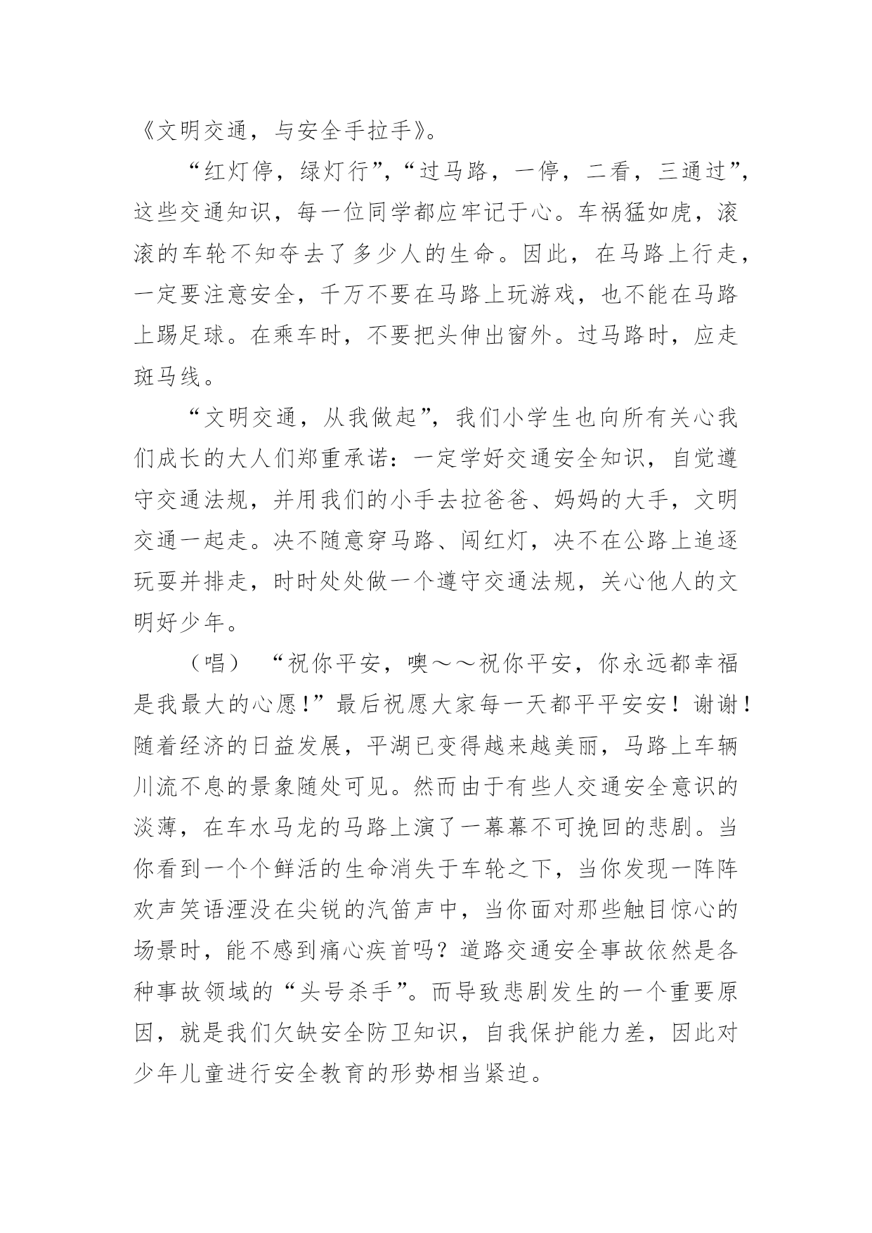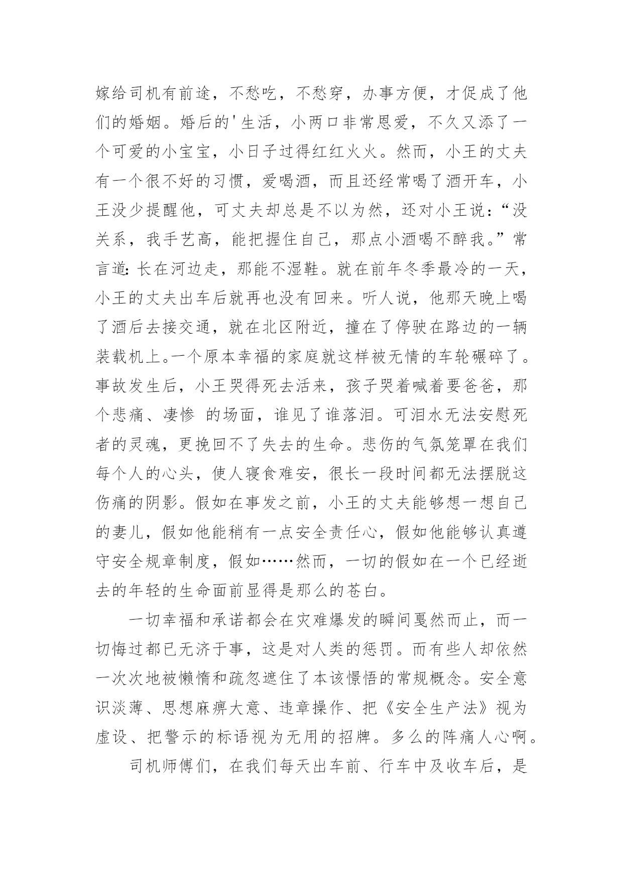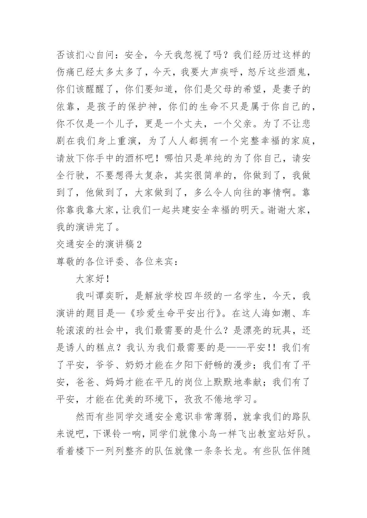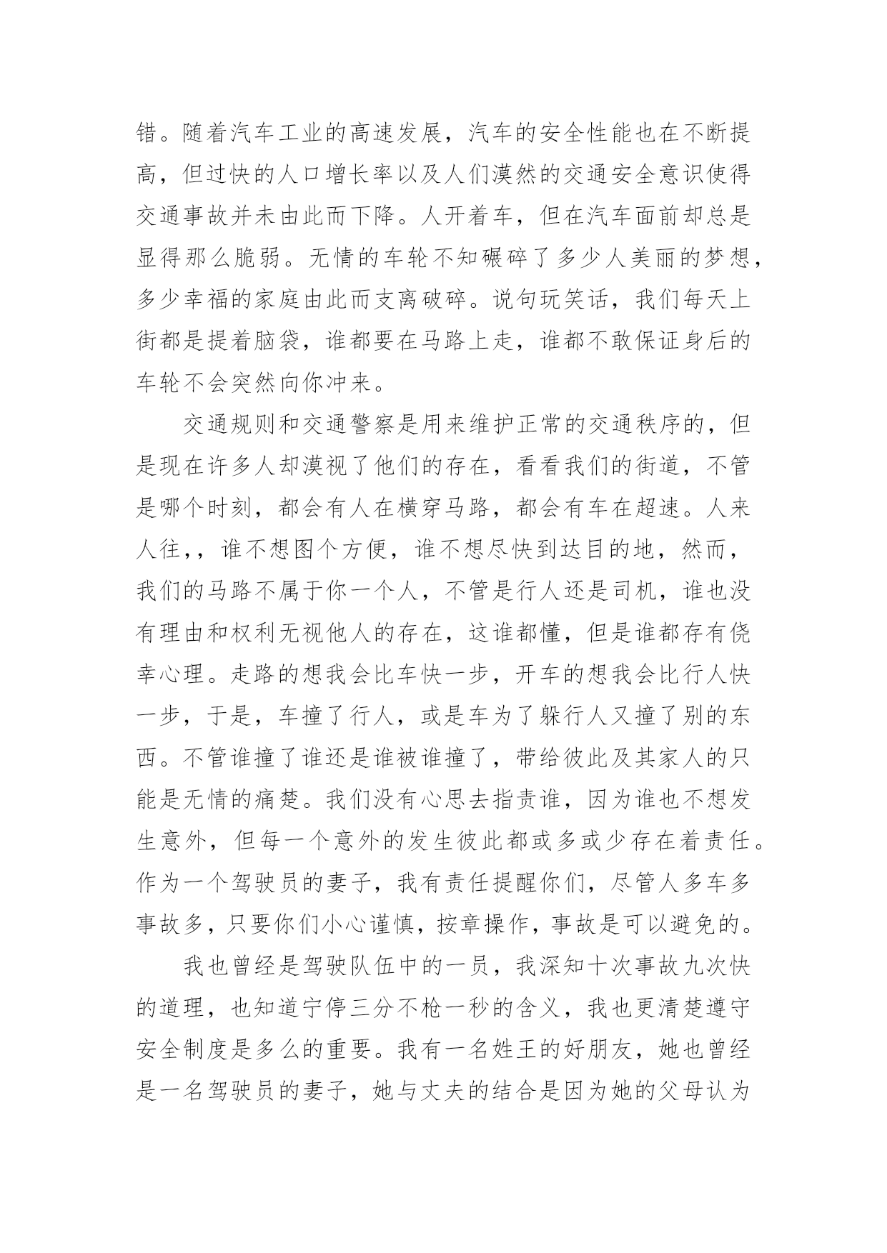 交通安全的演讲稿交通安全的演讲稿精选15篇演讲稿可以起到整理演讲者的思路、提示演讲的内容、限定演讲的速度的作用。在不断进步的时代,演讲稿应用范围愈来愈广泛,相信许多人会觉得演讲稿很难写吧,下面是小编整理的交通安全的演讲稿,仅供参考,希望能够帮助到大家。交通安全的演讲稿1各位领导、司机师傅们:你们好!今天,我很荣幸代表驾驶员的家属在这里演讲,心理是既紧张又高兴。紧张的是,在众目睽睽之下演讲还是第一次呢,高兴的是,能通过这次机会,对交通安全发表演讲而感到欣慰,能表达我们驾驶员妻子愿丈夫安全行车的心愿,愿每一个人安全行车的心愿,希望大家帮我完成这个心愿。我没有华丽的辞藻,但我希望通过我的真诚,唤醒大家对安全行车的重视,对生命的珍爱。我演讲的题目是:警钟长鸣,让幸福万年长,滚滚的车轮是无情的,不管你是穷人还是富人,不管你是坐公共汽车的还是坐宝马奔驰的,都同样有着命丧车轮的危险,随便的一张报纸都不时会出现交通事故的报道,随便的一条马路上都曾溅染着受害者的鲜血。我们在座的每一个驾驶员可能都不敢保证从来没有出过差错。随着汽车工业的高速发展,汽车的安全性能也在不断提高,但过快的人口增长率以及人们漠然的交通安全意识使得交通事故并未由此而下降。人开着车,但在汽车面前却总是显得那么脆弱。无情的车轮不知碾碎了多少人美丽的梦想,多少幸福的家庭由此而支离破碎。说句玩笑话,我们每天上街都是提着脑袋,谁都要在马路上走,谁都不敢保证身后的车轮不会突然向你冲来。交通规则和交通警察是用来维护正常的交通秩序的,但是现在许多人却漠视了他们的存在,看看我们的街道,不管是哪个时刻,都会有人在横穿马路,都会有车在超速。人来人往,,谁不想图个方便,谁不想尽快到达目的地,然而,我们的马路不属于你一个人,不管是行人还是司机,谁也没有理由和权利无视他人的存在,这谁都懂,但是谁都存有侥幸心理。走路的想我会比车快一步,开车的想我会比行人快一步,于是,车撞了行人,或是车为了躲行人又撞了别的东西。不管谁撞了谁还是谁被谁撞了,带给彼此及其家人的只能是无情的痛楚。我们没有心思去指责谁,因为谁也不想发生意外,但每一个意外的发生彼此都或多或少存在着责任。作为一个驾驶员的妻子,我有责任提醒你们,尽管人多车多事故多,只要你们小心谨慎,按章操作,事故是可以避免的。我也曾经是驾驶队伍中的一员,我深知十次事故九次快的道理,也知道宁停三分不枪一秒的含义,我也更清楚遵守安全制度是多么的重要。我有一名姓王的好朋友,她也曾经是一名驾驶员的妻子,她与丈夫的结合是因为她的父母认为嫁给司机有前途,不愁吃,不愁穿,办事方便,才促成了他们的婚姻。婚后的'生活,小两口非常恩爱,不久又添了一个可爱的小宝宝,小日子过得红红火火。然而,小王的丈夫有一个很不好的习惯,爱喝酒,而且还经常喝了酒开车,小王没少提醒他,可丈夫却总是不以为然,还对小王说:“没关系,我手艺高,能把握住自己,那点小酒喝不醉我。”常言道:长在河边走,那能不湿鞋。就在前年冬季最冷的一天,小王的丈夫出车后就再也没有回来。听人说,他那天晚上喝了酒后去接交通,就在北区附近,撞在了停驶在路边的一辆装载机上。一个原本幸福的家庭就这样被无情的车轮碾碎了。事故发生后,小王哭得死去活来,孩子哭着喊着要爸爸,那个悲痛、凄惨的场面,谁见了谁落泪。可泪水无法安慰死者的灵魂,更挽回不了失去的生命。悲伤的气氛笼罩在我们每个人的心头,使人寝食难安,很长一段时间都无法摆脱这伤痛的阴影。假如在事发之前,小王的丈夫能够想一想自己的妻儿,假如他能稍有一点安全责任心,假如他能够认真遵守安全规章制度,假如……然而,一切的假如在一个已经逝去的年轻的生命面前显得是那么的苍白。一切幸福和承诺都会在灾难爆发的瞬间戛然而止,而一切悔过都已无济于事,这是对人类的惩罚。而有些人却依然一次次地被懒惰和疏忽遮住了本该憬悟的常规概念。安全意识淡薄、思想麻痹大意、违章操作、把《安全生产法》视为虚设、把警示的标语视为无用的招牌。多么的阵痛人心啊。司机师傅们,在我们每天出车前、行车中及收车后,是否该扪心自问:安全,今天我忽视了吗?我们经历过这样的伤痛已经太多太多了,今天,我要大声疾呼,怒斥这些酒鬼,你们该醒醒了,你们要知道,你们是父母的希望,是妻子的依靠,是孩子的保护神,你们的生命不只是属于你自己的,你不仅是一个儿子,更是一个丈夫,一个父亲。为了不让悲剧在我们身上重演,为了人人都拥有一个完整幸福的家庭,请放下你手中的酒杯吧!哪怕只是单纯的为了你自己,请安全行驶,不要想得太复杂,其实很简单的,你做到了,我做到了,他做到了,大家做到了,多么令人向往的事情啊。靠你靠我靠大家,让我们一起共建安全幸福的明天。谢谢大家,我的演讲完了。交通安全的演讲稿2尊敬的各位评委、各位来宾:大家好!我叫谭奕昕,是解放学校四年级的一名学生,今天,我演讲的题