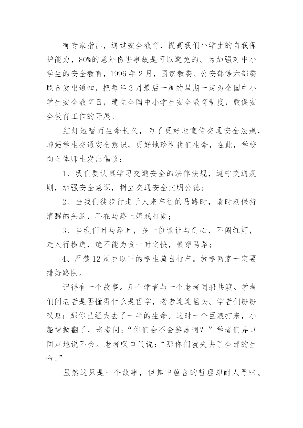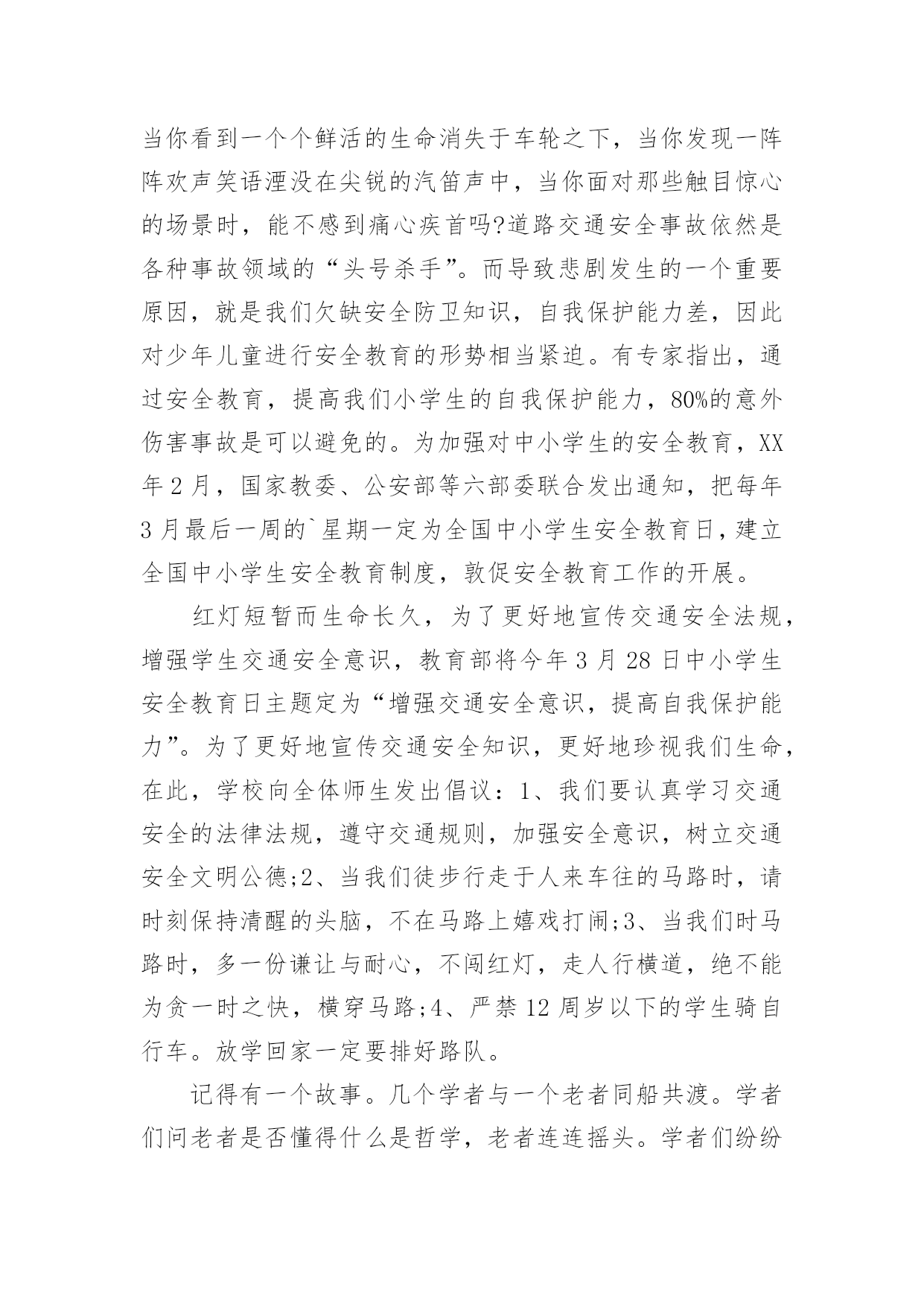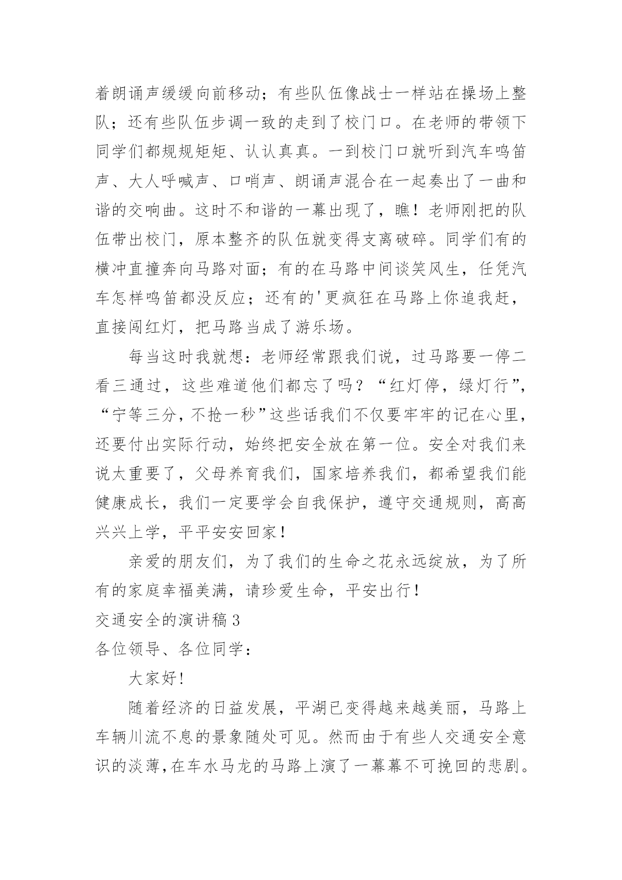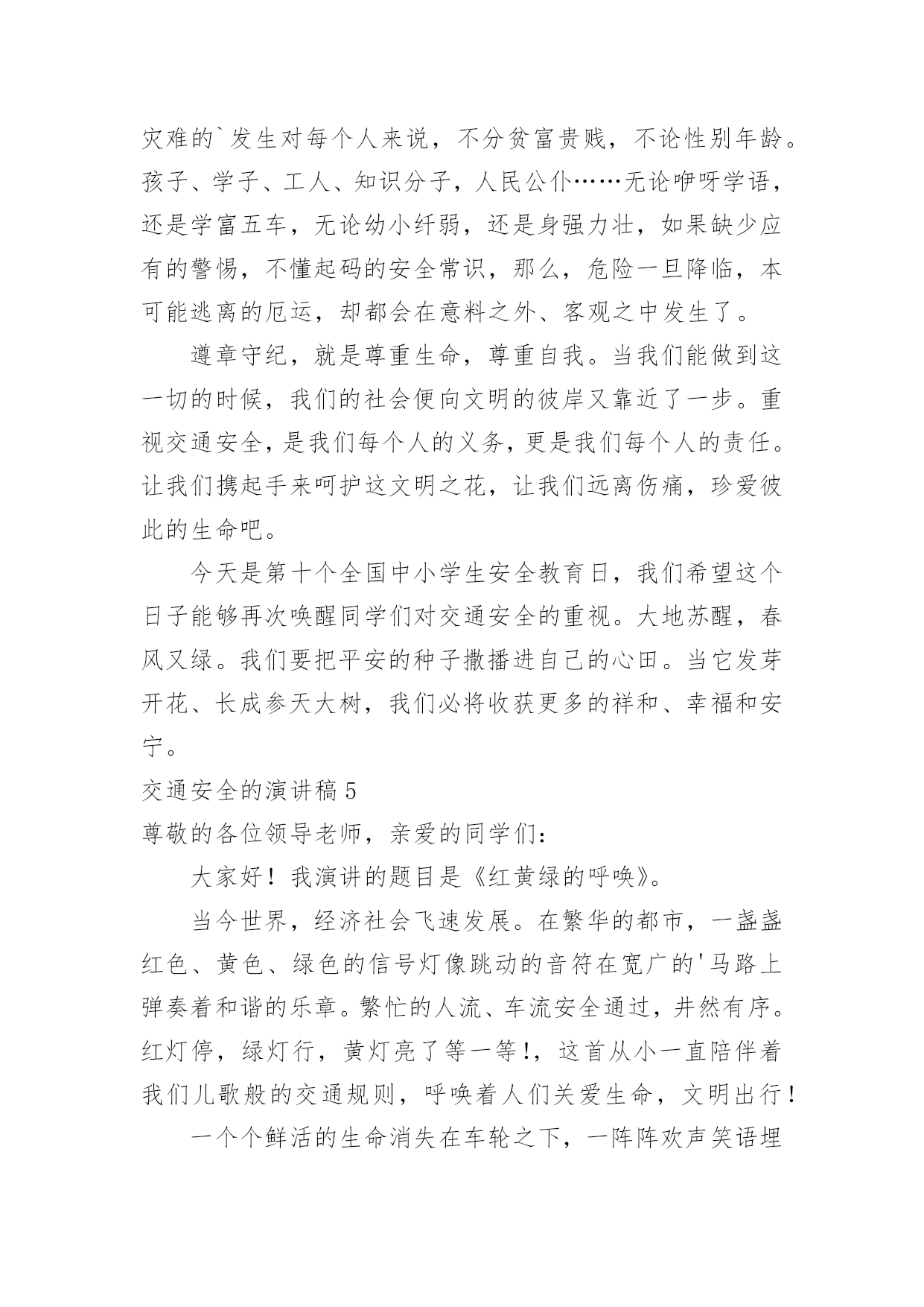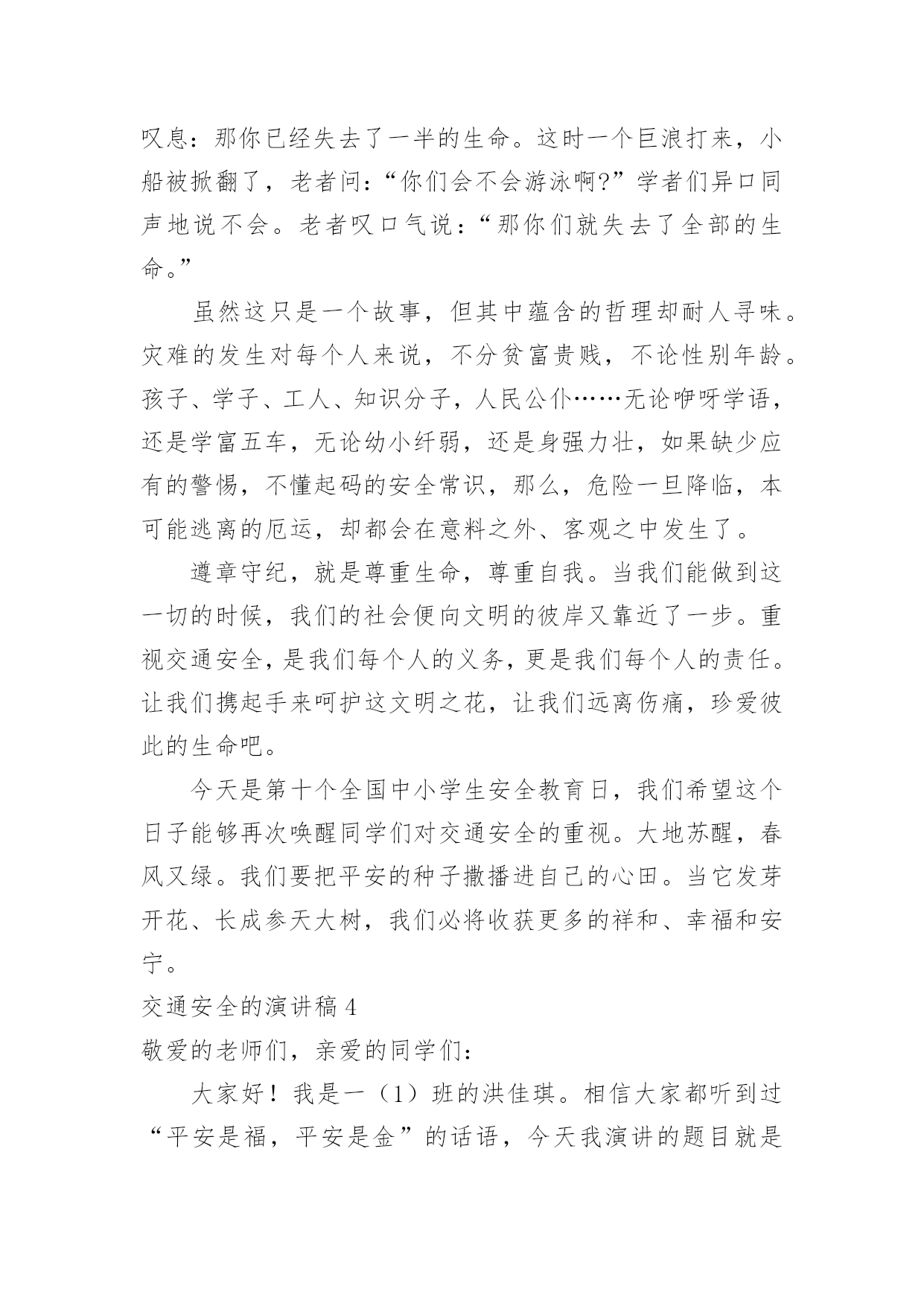 交通安全的演讲稿交通安全的演讲稿精选15篇演讲稿可以起到整理演讲者的思路、提示演讲的内容、限定演讲的速度的作用。在不断进步的时代,演讲稿应用范围愈来愈广泛,相信许多人会觉得演讲稿很难写吧,下面是小编整理的交通安全的演讲稿,仅供参考,希望能够帮助到大家。交通安全的演讲稿1各位领导、司机师傅们:你们好!今天,我很荣幸代表驾驶员的家属在这里演讲,心理是既紧张又高兴。紧张的是,在众目睽睽之下演讲还是第一次呢,高兴的是,能通过这次机会,对交通安全发表演讲而感到欣慰,能表达我们驾驶员妻子愿丈夫安全行车的心愿,愿每一个人安全行车的心愿,希望大家帮我完成这个心愿。我没有华丽的辞藻,但我希望通过我的真诚,唤醒大家对安全行车的重视,对生命的珍爱。我演讲的题目是:警钟长鸣,让幸福万年长,滚滚的车轮是无情的,不管你是穷人还是富人,不管你是坐公共汽车的还是坐宝马奔驰的,都同样有着命丧车轮的危险,随便的一张报纸都不时会出现交通事故的报道,随便的一条马路上都曾溅染着受害者的鲜血。我们在座的每一个驾驶员可能都不敢保证从来没有出过差错。随着汽车工业的高速发展,汽车的安全性能也在不断提高,但过快的人口增长率以及人们漠然的交通安全意识使得交通事故并未由此而下降。人开着车,但在汽车面前却总是显得那么脆弱。无情的车轮不知碾碎了多少人美丽的梦想,多少幸福的家庭由此而支离破碎。说句玩笑话,我们每天上街都是提着脑袋,谁都要在马路上走,谁都不敢保证身后的车轮不会突然向你冲来。交通规则和交通警察是用来维护正常的交通秩序的,但是现在许多人却漠视了他们的存在,看看我们的街道,不管是哪个时刻,都会有人在横穿马路,都会有车在超速。人来人往,,谁不想图个方便,谁不想尽快到达目的地,然而,我们的马路不属于你一个人,不管是行人还是司机,谁也没有理由和权利无视他人的存在,这谁都懂,但是谁都存有侥幸心理。走路的想我会比车快一步,开车的想我会比行人快一步,于是,车撞了行人,或是车为了躲行人又撞了别的东西。不管谁撞了谁还是谁被谁撞了,带给彼此及其家人的只能是无情的痛楚。我们没有心思去指责谁,因为谁也不想发生意外,但每一个意外的发生彼此都或多或少存在着责任。作为一个驾驶员的妻子,我有责任提醒你们,尽管人多车多事故多,只要你们小心谨慎,按章操作,事故是可以避免的。我也曾经是驾驶队伍中的一员,我深知十次事故九次快的道理,也知道宁停三分不枪一秒的含义,我也更清楚遵守安全制度是多么的重要。我有一名姓王的好朋友,她也曾经是一名驾驶员的妻子,她与丈夫的结合是因为她的父母认为嫁给司机有前途,不愁吃,不愁穿,办事方便,才促成了他们的婚姻。婚后的'生活,小两口非常恩爱,不久又添了一个可爱的小宝宝,小日子过得红红火火。然而,小王的丈夫有一个很不好的习惯,爱喝酒,而且还经常喝了酒开车,小王没少提醒他,可丈夫却总是不以为然,还对小王说:“没关系,我手艺高,能把握住自己,那点小酒喝不醉我。”常言道:长在河边走,那能不湿鞋。就在前年冬季最冷的一天,小王的丈夫出车后就再也没有回来。听人说,他那天晚上喝了酒后去接交通,就在北区附近,撞在了停驶在路边的一辆装载机上。一个原本幸福的家庭就这样被无情的车轮碾碎了。事故发生后,小王哭得死去活来,孩子哭着喊着要爸爸,那个悲痛、凄惨的场面,谁见了谁落泪。可泪水无法安慰死者的灵魂,更挽回不了失去的生命。悲伤的气氛笼罩在我们每个人的心头,使人寝食难安,很长一段时间都无法摆脱这伤痛的阴影。假如在事发之前,小王的丈夫能够想一想自己的妻儿,假如他能稍有一点安全责任心,假如他能够认真遵守安全规章制度,假如……然而,一切的假如在一个已经逝去的年轻的生命面前显得是那么的苍白。一切幸福和承诺都会在灾难爆发的瞬间戛然而止,而一切悔过都已无济于事,这是对人类的惩罚。而有些人却依然一次次地被懒惰和疏忽遮住了本该憬悟的常规概念。安全意识淡薄、思想麻痹大意、违章操作、把《安全生产法》视为虚设、把警示的标语视为无用的招牌。多么的阵痛人心啊。司机师傅们,在我们每天出车前、行车中及收车后,是否该扪心自问:安全,今天我忽视了吗?我们经历过这样的伤痛已经太多太多了,今天,我要大声疾呼,怒斥这些酒鬼,你们该醒醒了,你们要知道,你们是父母的希望,是妻子的依靠,是孩子的保护神,你们的生命不只是属于你自己的,你不仅是一个儿子,更是一个丈夫,一个父亲。为了不让悲剧在我们身上重演,为了人人都拥有一个完整幸福的家庭,请放下你手中的酒杯吧!哪怕只是单纯的为了你自己,请安全行驶,不要想得太复杂,其实很简单的,你做到了,我做到了,他做到了,大家做到了,多么令人向往的事情啊。靠你靠我靠大家,让我们一起共建安全幸福的明天。谢谢大家,我的演讲完了。交通安全的演讲稿2尊敬的各位评委、各位来宾:大家好!我叫谭奕昕,是解放学校四年级的一名学生,今天,我演讲的题