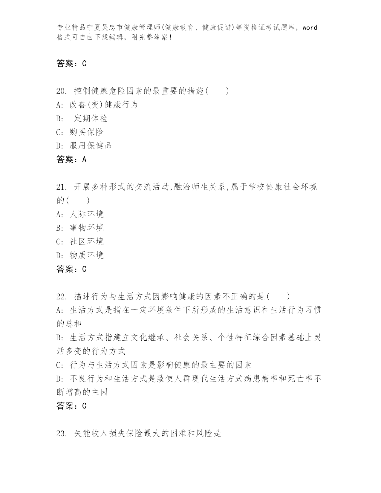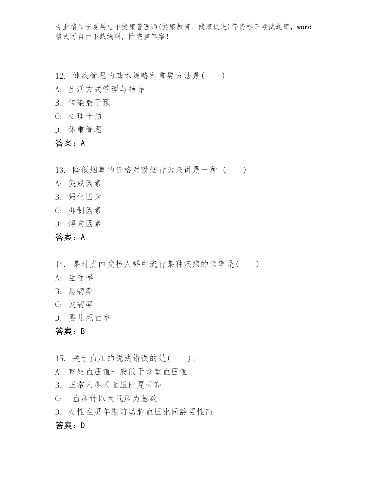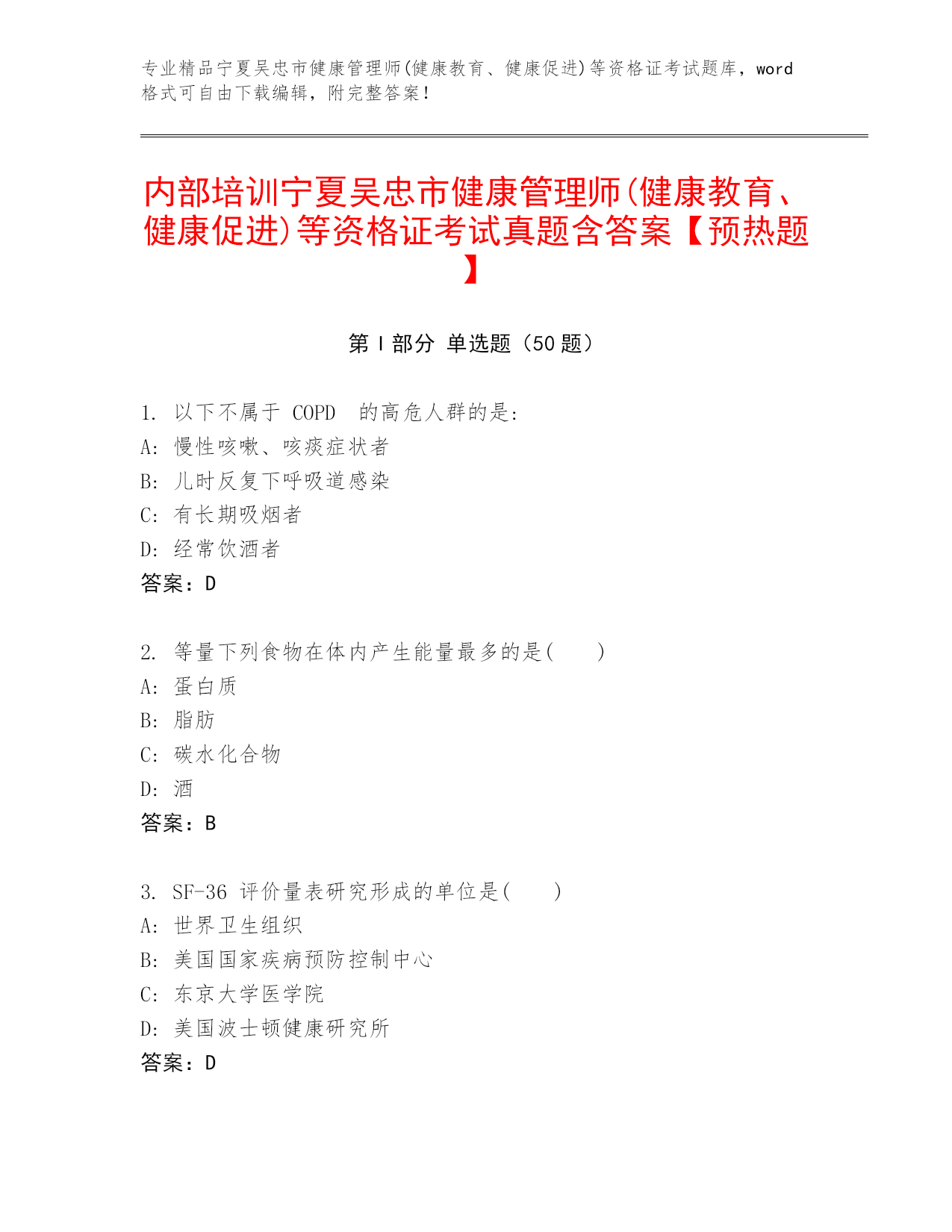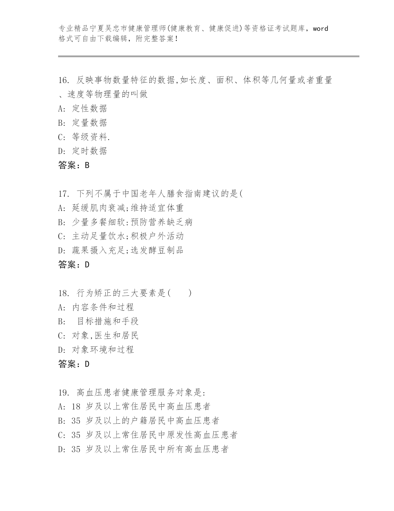 内部培训宁夏吴忠市健康管理师(健康教育、健康促进)等资格证考试真题含答案【预热题】.docx
