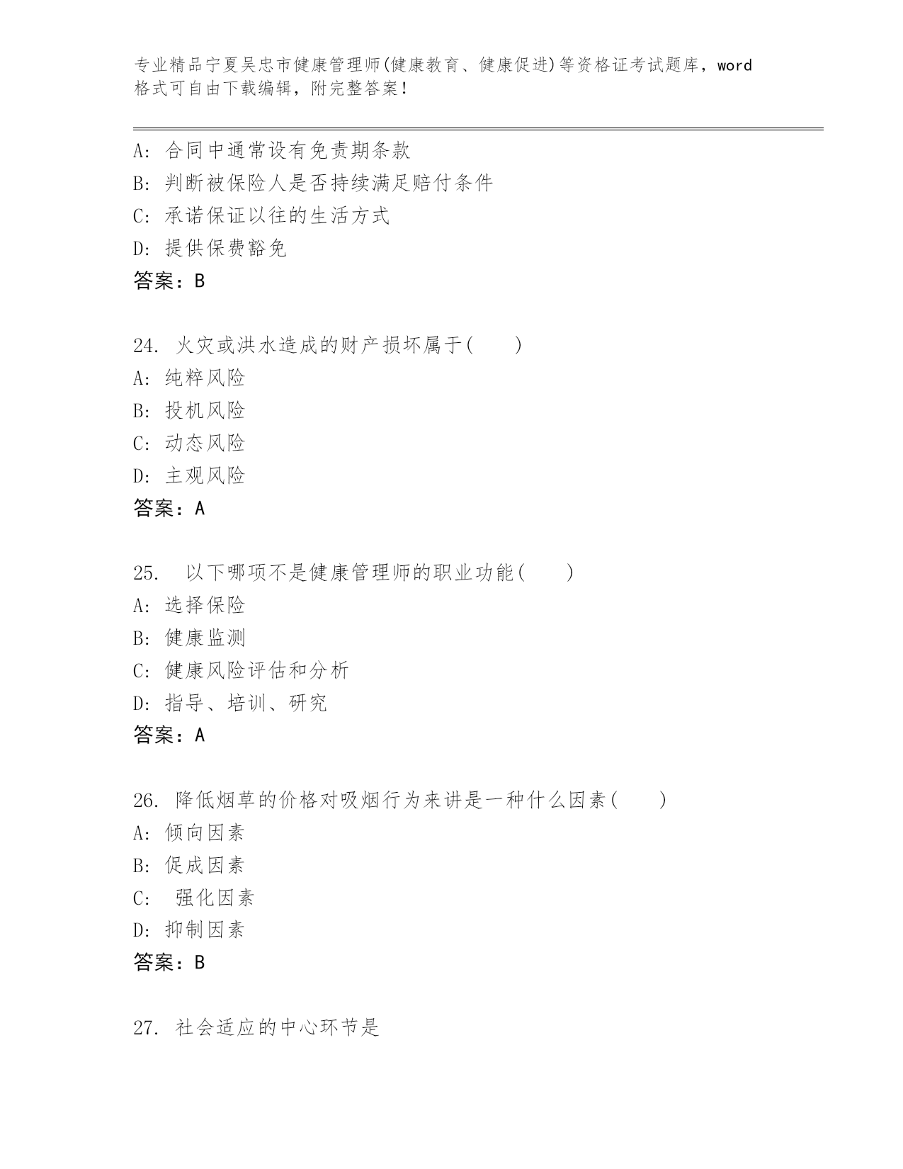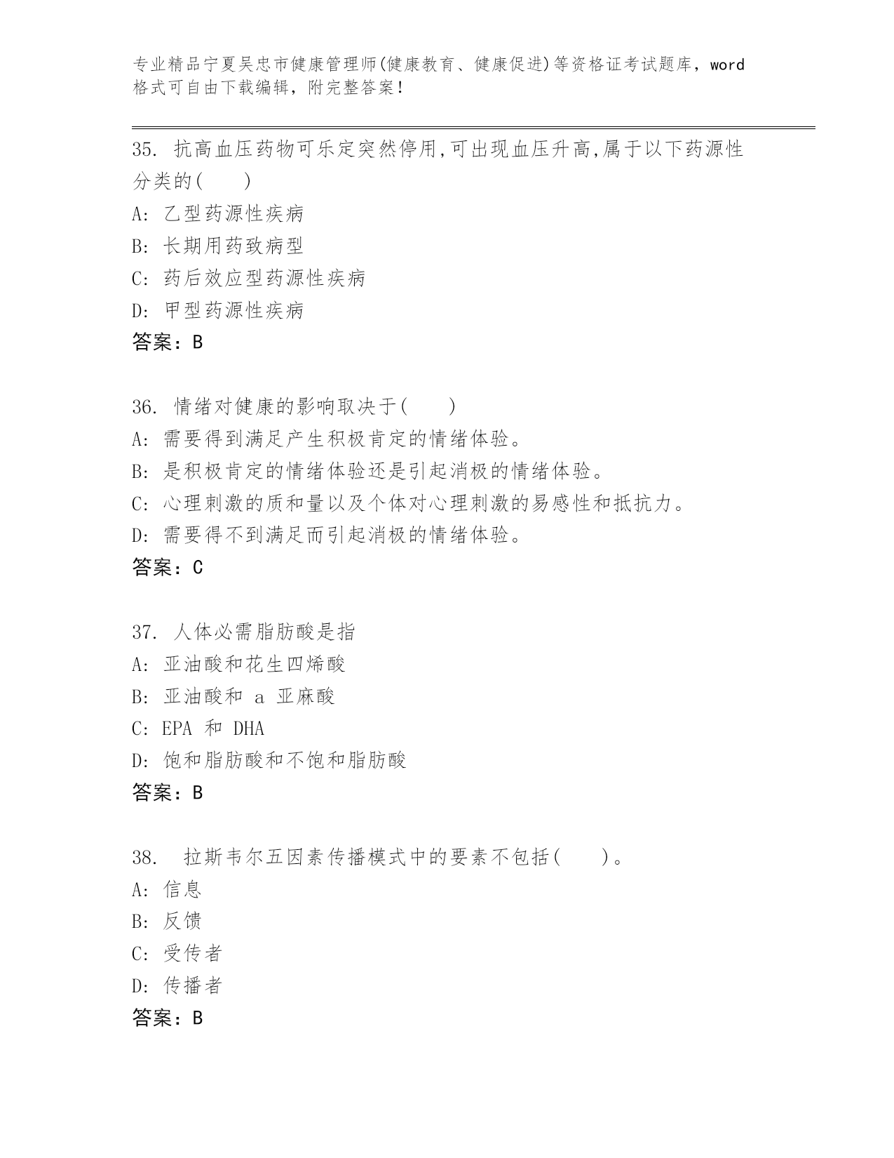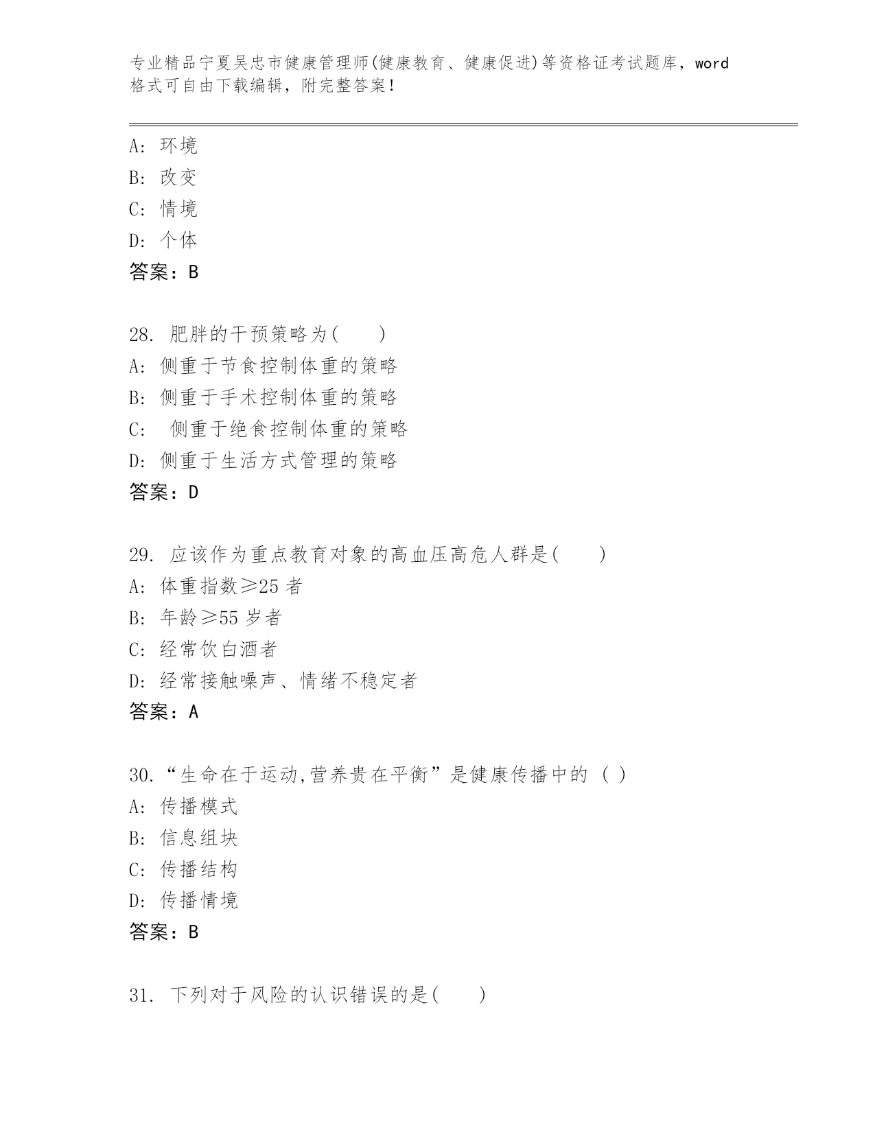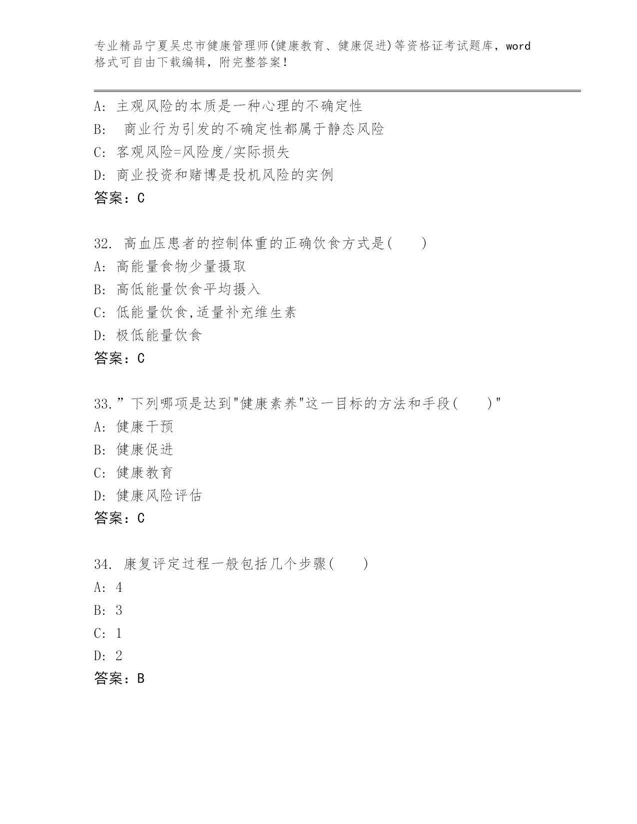 内部培训宁夏吴忠市健康管理师(健康教育、健康促进)等资格证考试真题含答案【预热题】.docx