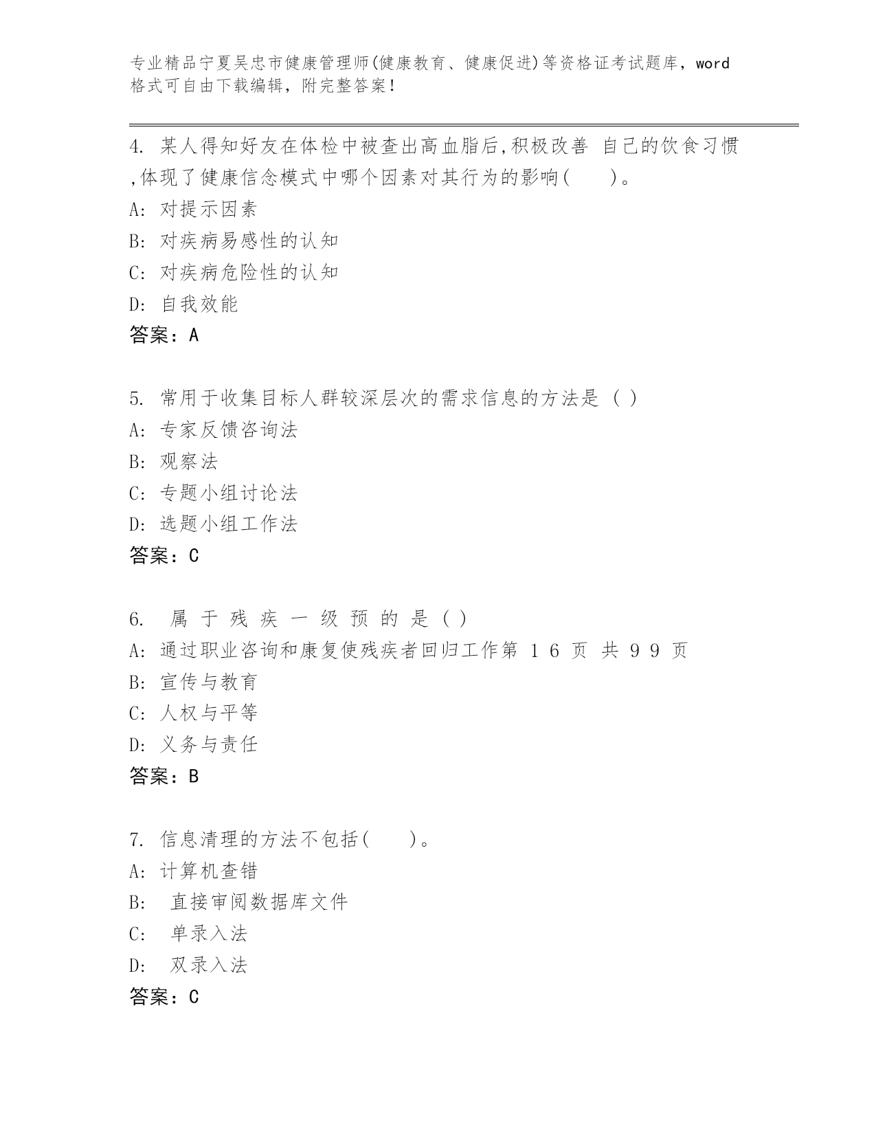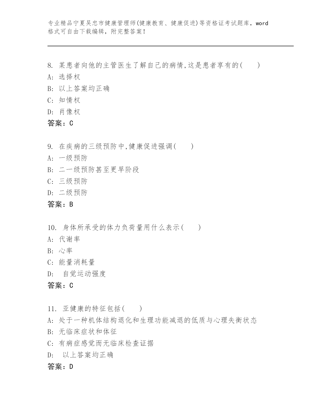 内部培训宁夏吴忠市健康管理师(健康教育、健康促进)等资格证考试真题含答案【预热题】