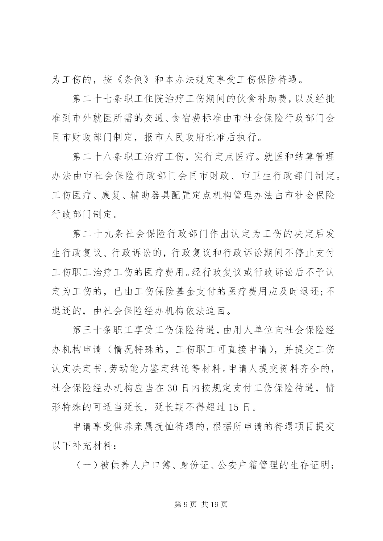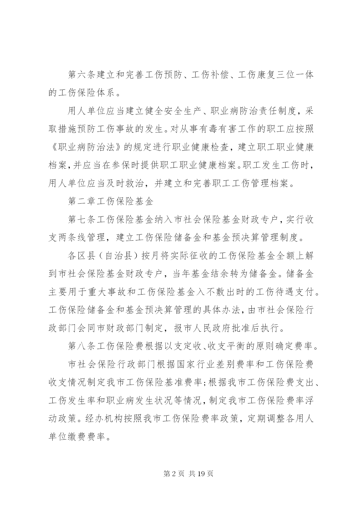 第PAGE\*Arabic\*MERGEFORMAT19页共NUMPAGES\*MERGEFORMAT19页重庆工伤保险条例重庆工伤保险条例最新版全文第一章总则第一条为贯彻落实《中华人民共和国社会保险法》、《工伤保险条例》(以下简称《条例》)和工伤保险有关法律法规,结合我市实际,制定本办法。第二条本市行政区域内的事业单位、企业、社会团体、民办非企业单位、基金会、律师事务所、会计师事务所等组织和有雇工的个体工商户(以下简称用人单位)应当依照本办法规定参加工伤保险,为本单位全部职工或者雇工(以下简称职工)缴纳工伤保险费。第三条参加工伤保险实行实名制。本市事业单位到住所地区县(自治县)、其他用人单位到注册地区县(自治县)办理工伤保险参保登记。市外用人单位在本市从事生产经营活动的,应当在生产经营地区县(自治县)参加工伤保险。第四条工伤保险基金实行全市统筹、分级管理,建立市和区县(自治县)政府两级责任分担机制。第五条市社会保险行政部门负责全市工伤保险工作。区县(自治县)社会保险行政部门负责本行政区域内工伤保险工作。市、区县(自治县)社会保险经办机构(以下简称经办机构),具体承办工伤保险事务。第六条建立和完善工伤预防、工伤补偿、工伤康复三位一体的工伤保险体系。用人单位应当建立健全安全生产、职业病防治责任制度,采取措施预防工伤事故的发生。对从事有毒有害工作的职工应按照《职业病防治法》的规定进行职业健康检查,建立职工职业健康档案,并应当在参保时提供职工职业健康档案。职工发生工伤时,用人单位应当及时救治,并建立和完善职工工伤管理档案。第二章工伤保险基金第七条工伤保险基金纳入市社会保险基金财政专户,实行收支两条线管理,建立工伤保险储备金和基金预决算管理制度。各区县(自治县)按月将实际征收的工伤保险基金全额上解到市社会保险基金财政专户,当年基金结余转为储备金。储备金主要用于重大事故和工伤保险基金入不敷出时的工伤待遇支付。工伤保险储备金和基金预决算管理的具体办法,由市社会保险行政部门会同市财政部门制定,报市人民政府批准后执行。第八条工伤保险费根据以支定收、收支平衡的原则确定费率。市社会保险行政部门根据国家行业差别费率和工伤保险费收支情况制定我市工伤保险基准费率;根据我市工伤保险费支出、工伤发生率和职业病发生状况等情况,制定我市工伤保险费率浮动政策。经办机构按照我市工伤保险费率政策,定期调整各用人单位缴费费率。第九条用人单位应当以货币形式按月向征收机关足额缴纳工伤保险费,职工个人不缴纳工伤保险费。第十条工伤保险基金用于下列支出:(一)治疗工伤的医疗费用和康复费用;(二)住院伙食补助费;(三)市外就医的交通食宿费;(四)安装配置伤残辅助器具费用;(五)生活不能自理的,经劳动能力鉴定委员会确认的生活护理费;(六)一次性伤残补助金和一至四级伤残职工的伤残津贴;(七)终止或解除劳动合同时,应当享受的一次性医疗补助金;(八)因工死亡的,其遗属领取的一次性丧葬补助金、供养亲属抚恤金和一次性工亡补助金;(九)劳动能力鉴定(确认)费;(十)工伤预防的宣传、培训等费用;(十一)法律法规规定的其他费用支出。第三章工伤认定第十一条社会保险行政部门按《条例》规定进行工伤认定。职工发生事故伤害,用人单位应当自事故发生之日起3日内向负责工伤认定的社会保险行政部门报告,并填报《事故伤害报告表》;发生死亡事故或一次负伤3人以上(包括3人)的伤害事故,应在24小时内通过电话、传真等方式及时报告。第十二条职工因工发生事故伤害或者依法被诊断、鉴定为职业病,所在单位应当自事故伤害发生之日或者被诊断、鉴定为职业病之日起30日内,向参保地区县(自治县)社会保险行政部门提出工伤认定书面申请。遇有特殊情况需要延期提出工伤认定书面申请的,用人单位应当在事故发生之日或者被诊断、鉴定为职业病之日起30日内向参保地区县(自治县)社会保险行政部门提出书面延期申请,社会保险行政部门应当自收到申请之日起3个工作日内书面答复;对有正当理由的,申请时限最多可以延长30日。用人单位未按前款规定提出工伤认定申请的,工伤职工或者其近亲属、工会组织在事故伤害发生之日或者被诊断、鉴定为职业病之日起1年内,可直接向参保地区县(自治县)社会保险行政部门提出工伤认定书面申请。用人单位未在本条第一款规定的时限内提交工伤认定书面申请或延期认定申请的,从事故伤害发生之日或被诊断、鉴定为职业病之日起至社会保险行政部门受理工伤认定申请之日止,期间发生的医疗费、伙食补助费、市外就医的交通食宿费和工亡职工供养亲属抚恤金由用人单位承担。第十三条工伤认定由用人单位参保地区县(自治县)社会保险行政部门负责。职工在参保地之外发生事故,参保地社会保险行政部门可委托事故发生地社会保险行政部门进行调查核实。受伤职工未参加工伤保险的,本