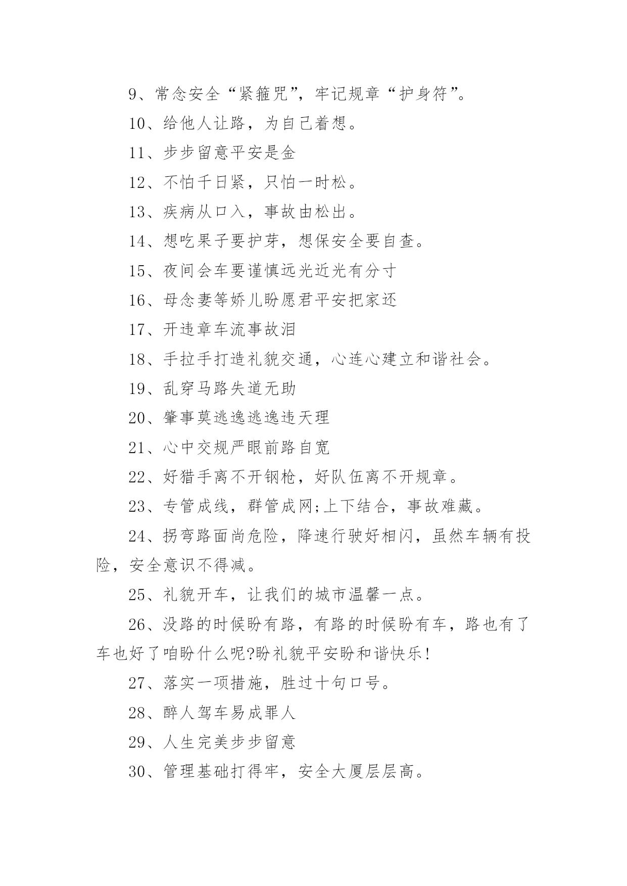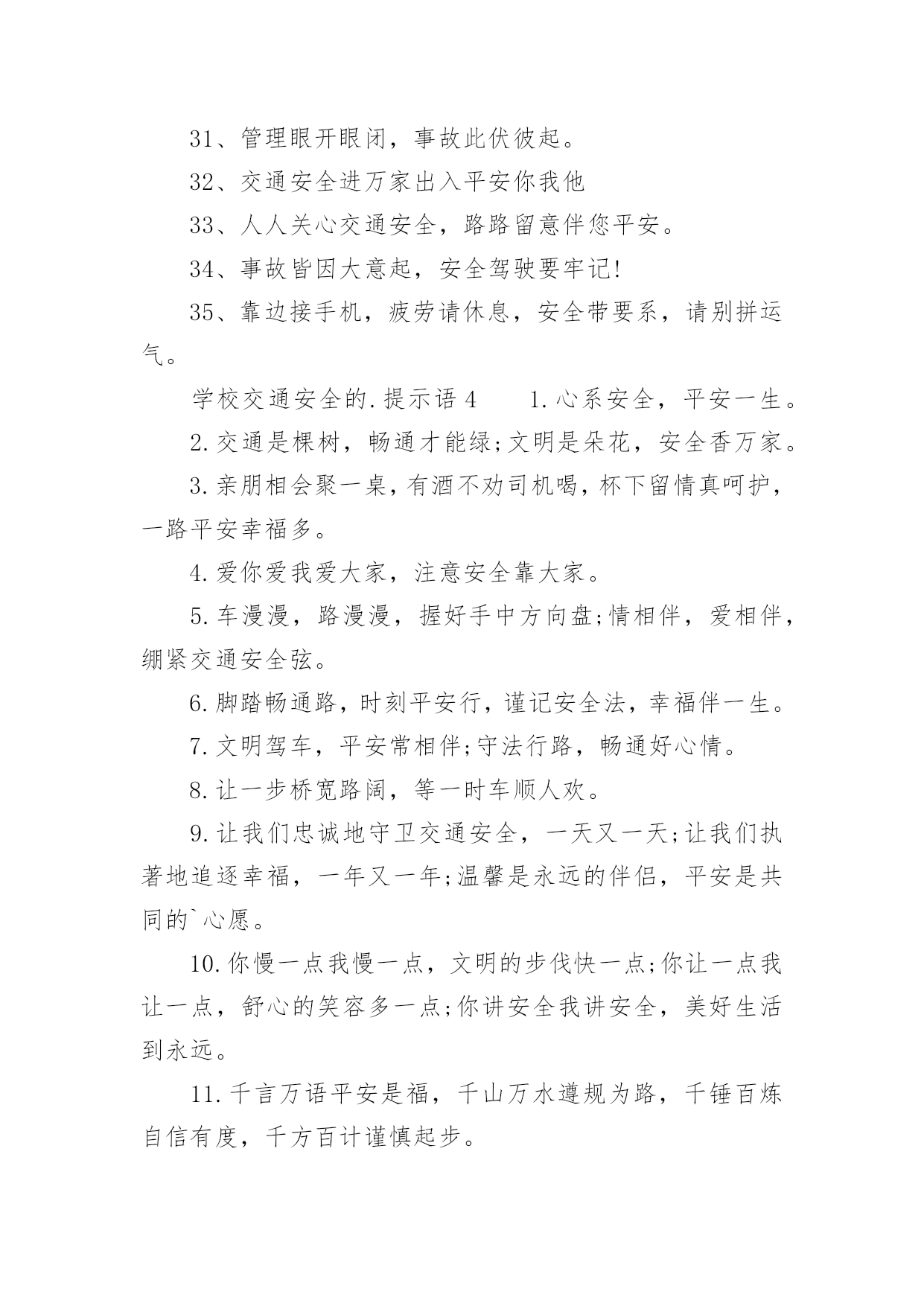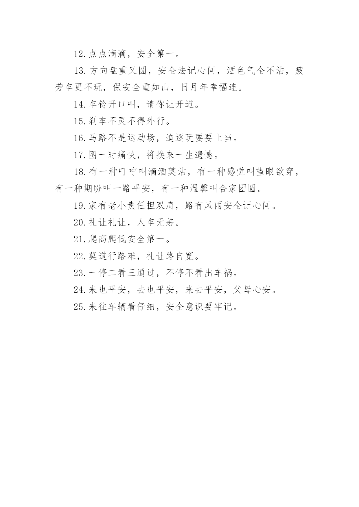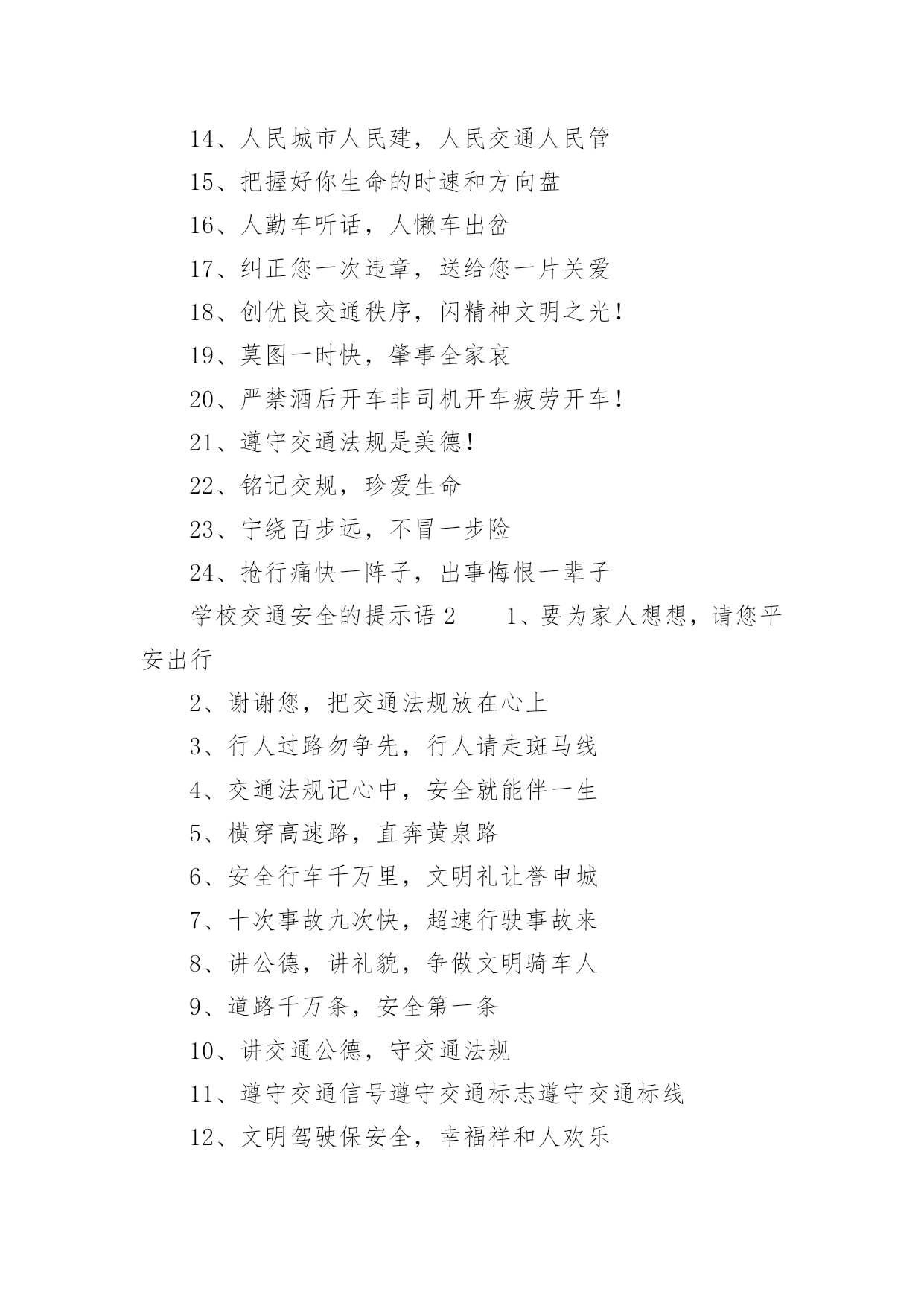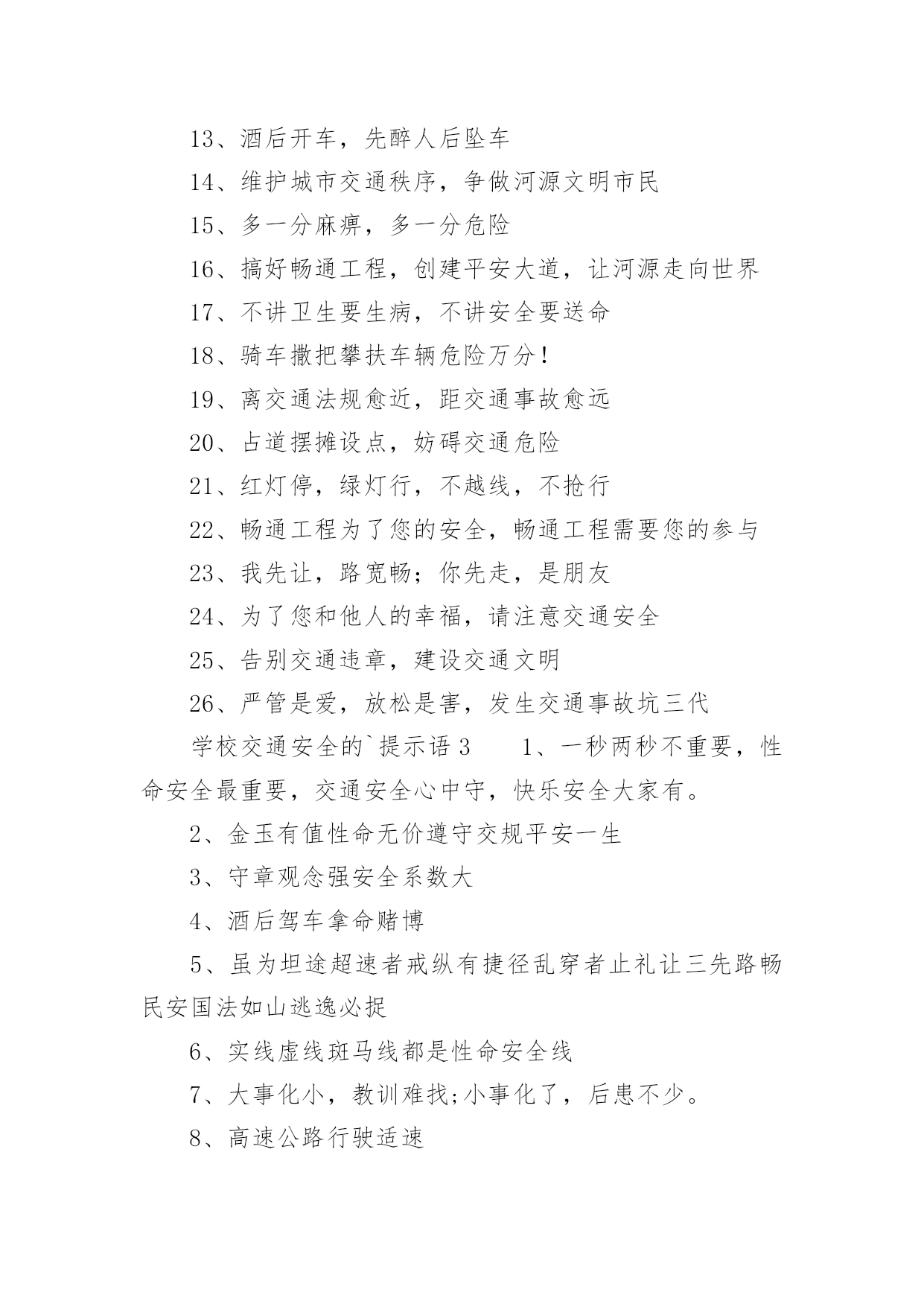 学校交通安全的提示语学校交通安全的提示语在平日的学习、工作和生活里,大家一定都接触过一些使用较为普遍的提示语吧,提示语有节奏有韵律,读来朗朗上口,听来和谐悦耳,给人以美感,也便于记忆。那些被广泛运用的提示语都是什么样子的呢?以下是小编为大家整理的学校交通安全的提示语,供大家参考借鉴,希望可以帮助到有需要的朋友。学校交通安全的提示语11、人行横道是生命的绿色通道2、警惕保安全,麻痹起祸端3、人人守法规,方便你我他4、交通法规要遵守,安全警钟需常鸣5、为了您和他人的幸福,请自觉遵守交通法规6、一身安危系全家,全家幸福系一人7、安全与遵章同在,事故与违规相随8、开车打手机,事故盯上你9、无照开车是玩命,十次玩命九丧生10、礼让――让出海阔天空,争抢――抢出飞来横祸11、增强交通法制观念,遵守交通行为规范12、违章行(骑)车,危及他人,祸及自身13、您是河源的主人,您是文明礼让的.楷模14、人民城市人民建,人民交通人民管15、把握好你生命的时速和方向盘16、人勤车听话,人懒车出岔17、纠正您一次违章,送给您一片关爱18、创优良交通秩序,闪精神文明之光!19、莫图一时快,肇事全家哀20、严禁酒后开车非司机开车疲劳开车!21、遵守交通法规是美德!22、铭记交规,珍爱生命23、宁绕百步远,不冒一步险24、抢行痛快一阵子,出事悔恨一辈子学校交通安全的提示语21、要为家人想想,请您平安出行2、谢谢您,把交通法规放在心上3、行人过路勿争先,行人请走斑马线4、交通法规记心中,安全就能伴一生5、横穿高速路,直奔黄泉路6、安全行车千万里,文明礼让誉申城7、十次事故九次快,超速行驶事故来8、讲公德,讲礼貌,争做文明骑车人9、道路千万条,安全第一条10、讲交通公德,守交通法规11、遵守交通信号遵守交通标志遵守交通标线12、文明驾驶保安全,幸福祥和人欢乐13、酒后开车,先醉人后坠车14、维护城市交通秩序,争做河源文明市民15、多一分麻痹,多一分危险16、搞好畅通工程,创建平安大道,让河源走向世界17、不讲卫生要生病,不讲安全要送命18、骑车撒把攀扶车辆危险万分!19、离交通法规愈近,距交通事故愈远20、占道摆摊设点,妨碍交通危险21、红灯停,绿灯行,不越线,不抢行22、畅通工程为了您的安全,畅通工程需要您的参与23、我先让,路宽畅;你先走,是朋友24、为了您和他人的幸福,请注意交通安全25、告别交通违章,建设交通文明26、严管是爱,放松是害,发生交通事故坑三代学校交通安全的`提示语31、一秒两秒不重要,性命安全最重要,交通安全心中守,快乐安全大家有。2、金玉有值性命无价遵守交规平安一生3、守章观念强安全系数大4、酒后驾车拿命赌博5、虽为坦途超速者戒纵有捷径乱穿者止礼让三先路畅民安国法如山逃逸必捉6、实线虚线斑马线都是性命安全线7、大事化小,教训难找;小事化了,后患不少。8、高速公路行驶适速9、常念安全“紧箍咒”,牢记规章“护身符”。10、给他人让路,为自己着想。11、步步留意平安是金12、不怕千日紧,只怕一时松。13、疾病从口入,事故由松出。14、想吃果子要护芽,想保安全要自查。15、夜间会车要谨慎远光近光有分寸16、母念妻等娇儿盼愿君平安把家还17、开违章车流事故泪18、手拉手打造礼貌交通,心连心建立和谐社会。19、乱穿马路失道无助20、肇事莫逃逸逃逸违天理21、心中交规严眼前路自宽22、好猎手离不开钢枪,好队伍离不开规章。23、专管成线,群管成网;上下结合,事故难藏。24、拐弯路面尚危险,降速行驶好相闪,虽然车辆有投险,安全意识不得减。25、礼貌开车,让我们的城市温馨一点。26、没路的时候盼有路,有路的时候盼有车,路也有了车也好了咱盼什么呢?盼礼貌平安盼和谐快乐!27、落实一项措施,胜过十句口号。28、醉人驾车易成罪人29、人生完美步步留意30、管理基础打得牢,安全大厦层层高。31、管理眼开眼闭,事故此伏彼起。32、交通安全进万家出入平安你我他33、人人关心交通安全,路路留意伴您平安。34、事故皆因大意起,安全驾驶要牢记!35、靠边接手机,疲劳请休息,安全带要系,请别拼运气。学校交通安全的.提示语41.心系安全,平安一生。2.交通是棵树,畅通才能绿;文明是朵花,安全香万家。3.亲朋相会聚一桌,有酒不劝司机喝,杯下留情真呵护,一路平安幸福多。4.爱你爱我爱大家,注意安全靠大家。5.车漫漫,路漫漫,握好手中方向盘;情相伴,爱相伴,绷紧交通安全弦。6.脚踏畅通路,时刻平安行,谨记安全法,幸福伴一生。7.文明驾车,平安常相伴;守法行路,畅通好心情。8.让一步桥宽路阔,等一时车顺人欢。9.让我们忠诚地守卫交通安全,一天又一天;让我们执著地追逐幸福,一年又一年;温馨是永远的伴侣,平安是共同的`心愿。10.你慢一点我慢一点,文明的步伐快一点;你让一点我让一点,舒心