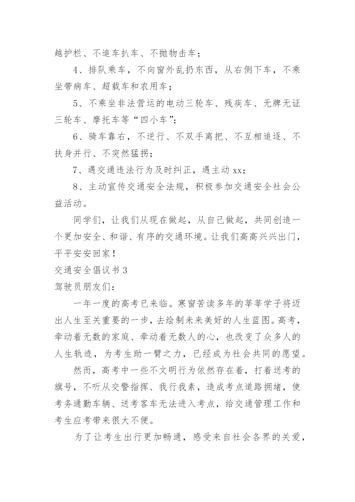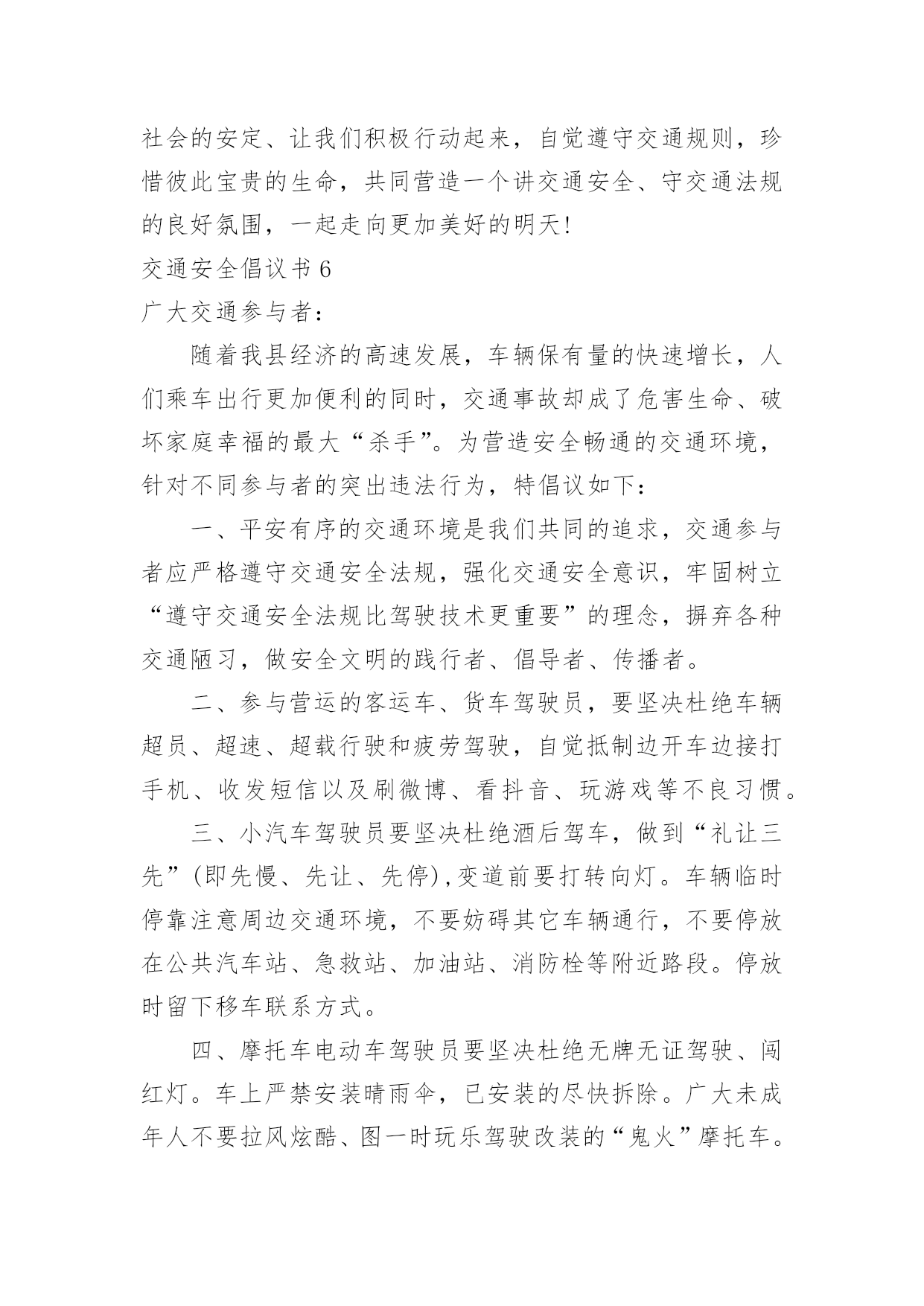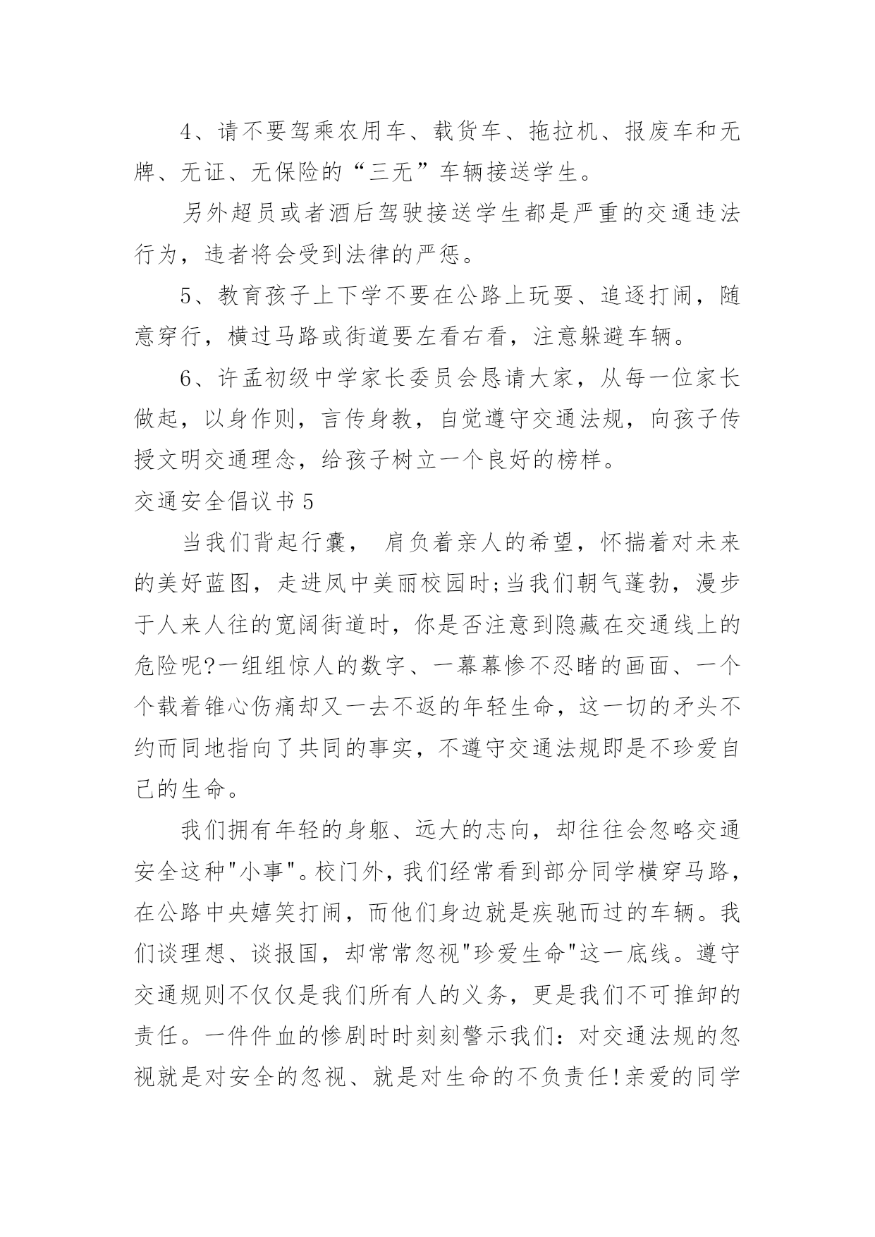 交通安全倡议书交通安全倡议书集合15篇在日新月异的现代社会中,倡议书应用范围愈来愈广泛,倡议书具有公开性的特征,是一种广而告之的书信。那么问题来了,到底应如何写一份恰当的倡议书呢?下面是小编整理的交通安全倡议书,欢迎阅读与收藏。交通安全倡议书1亲爱的同学们:人的生命只有一次,所以我们必须珍惜,珍惜每个人都仅有一次的生命??我曾听说过这样一则交通事故:一辆没有营运证的面包车满载15人,上坡时因为发动机动力不够,车子滑下了深水塘,酿成8死4伤的重大惨祸。后来,虽然这辆黑车的车主以超载及非法营运被逮捕了,并叛了无期徒刑,但给死伤者家庭带来的却是永远的伤痛??当我们背起行囊,肩负着家人的希望,怀揣着对未来的美好蓝图,走进凤中美丽校园时;当我们朝气蓬勃,漫步于人来人往的宽阔街道时,你是否注意到隐藏在交通线上的危险呢?一组组惊人的数字、一幕幕惨不忍睹的画面、一个个载着锥心伤痛却又一去不返的年轻生命,这一切的矛头不约而同地指向了共同的事实,不遵守交通法规即是不珍爱自己的生命。一件件血的惨剧时时刻刻警示我们:对交通法规的忽视就是对安全的忽视、就是对生命的不负责任!亲爱的同学们,我们多么希望生活的每一天都五彩缤纷,每一天都能成为美好的记忆,为了你们和家人的幸福,我们少先大队特向全校同学发出如下倡议:1、认真学习、宣传并严格遵守《中华人民共和国道路交通安全法》,从自身做起,增强交通安全意识和交通法制观念;2、自觉遵守交通信号、交通标志、交通标线,服从交通警察的指挥;通过路口要遵守"红灯停、绿灯行";3、骑自行车时不双手离把、攀扶其他车辆或者手中持物;不追逐打闹,不并肩行驶;骑车不带人;在校园内骑车;不违章骑车。4、严禁骑电动、摩托车或其他机动车辆上学。5、在道路上行走做到:走路靠右行,不违章过马路,“一停二看三通过”;“红灯停、绿灯行”等。6、严格遵守“五不”原则:不搭乘证件不全的车辆;不搭乘超载的车辆;不搭乘非客运车辆;不搭乘马自达、三轮车等车辆;不搭乘危险驾驶的车辆。7、认真接受学校、家长的交通安全教育。8、从影响自己的家人开始,劝告自己的家人、亲戚要珍爱生命,严格遵守交通规则,安全乘车、安全乘船、安全骑车、安全走路。俗话说:"没有规矩不成方圆"。遵守交通规则是我们应尽的责任和义务。只要我们每个人都严守交通规则,我们的社会就会向着文明的彼岸又迈进一步。遵守交通规则要从我做起,从小事做起,从今天做起。同学们,为了家庭的幸福、社会的安定、让我们积极行动起来,自觉遵守交通规则,珍惜彼此宝贵的生命,共同营造一个讲交通安全、守交通法规的良好氛围,一起走向更加美好的明天!倡议人:XX年X月X日交通安全倡议书2亲爱的同学们:当前,我县正处于交通大建设、大发展时期,道路交通出行环境复杂,交通安全形势严峻。在校师生的安全牵动着社会各界的心,可是,在我们学生当中,不遵守交通法规的现象仍然随处可见,时有发生,交通安全已成为全社会共同关注的问题。俗话说:“没有规矩不成方圆”。我们的交通行为关系着城市的文明形象,遵守道路交通安全法是我们每个人的义务,更是我们珍惜生命的体现。在此,我校向同学们发出倡议:1、认真学习交通安全常识,自觉遵守交通秩序;2、靠路边行走,横过道路走斑马线,做到“一停、二看、三通过”;3、不闯红灯、不乱穿道路、不在道路上嬉闹玩耍,不越护栏、不追车扒车、不抛物击车;4、排队乘车,不向窗外乱扔东西,从右侧下车,不乘坐带病车、超载车和农用车;5、不乘坐非法营运的电动三轮车、残疾车、无牌无证三轮车、摩托车等“四小车”;6、骑车靠右,不逆行、不双手离把、不互相追逐、不扶身并行、不突然猛拐;7、遇交通违法行为及时纠正,遇主动xx;8、主动宣传交通安全法规,积极参加交通安全社会公益活动。同学们,让我们从现在做起,从自己做起,共同创造一个更加安全、和谐、有序的交通环境。让我们高高兴兴出门,平平安安回家!交通安全倡议书3驾驶员朋友们:一年一度的高考已来临。寒窗苦读多年的莘莘学子将迈出人生至关重要的一步,去绘制未来美好的人生蓝图。高考,牵动着无数的家庭、牵动着无数人的心,也改变了众多人的人生轨迹,为考生助一臂之力,已经成为社会共同的愿望。然而,高考中一些不文明行为依然存在着,打着送考的旗号,不听从交警指挥、我行我素,造成考点道路拥堵,使考务通勤车辆、送考客车无法进入考点,给交通管理工作和考生应考带来很大不便。为了让考生出行更加畅通,感受来自社会各界的关爱,沙湾县公安局交警大队特此发出倡议——如果您是考生家长:考试当天根据路况安排好出行计划,留出富裕时间,防止路上遇到特殊情况耽误考试;为保证全体考生利益,驾车接送学生的家长请做到“即停即下即走”,听从交警指挥,在指定地点停车;考生家长尽量不要直接把孩子送到考点门口,可以提前让孩子下车步行至考场,以免发生拥堵;一旦遇到