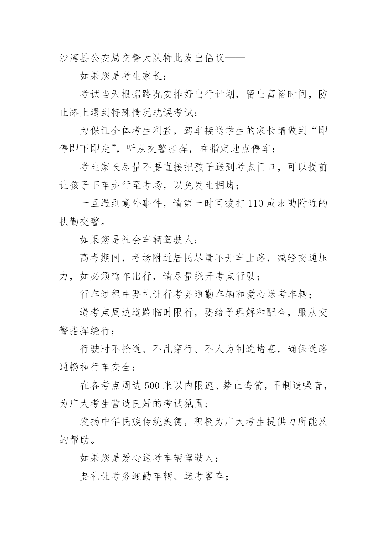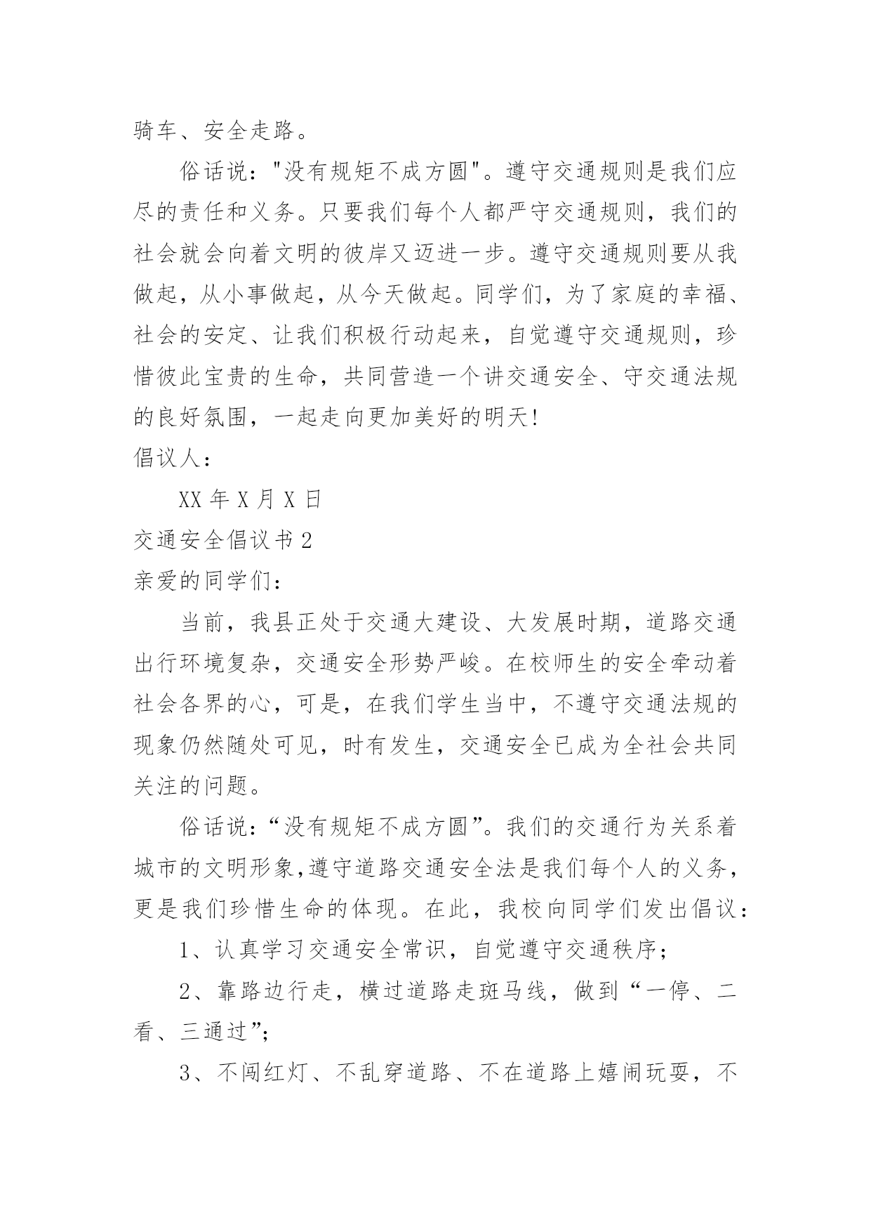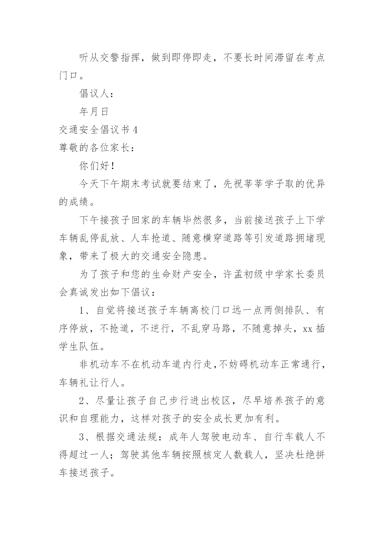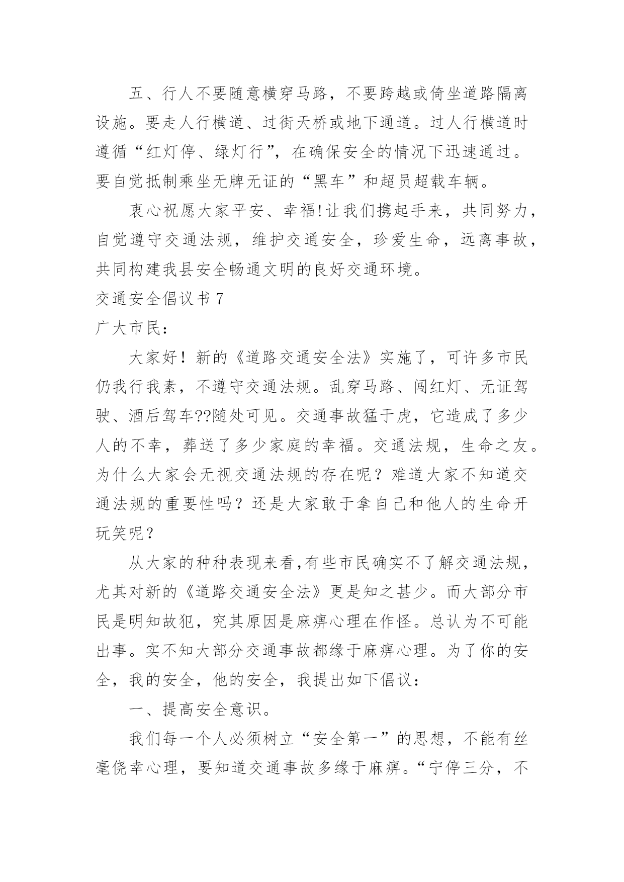 交通安全倡议书交通安全倡议书集合15篇在日新月异的现代社会中,倡议书应用范围愈来愈广泛,倡议书具有公开性的特征,是一种广而告之的书信。那么问题来了,到底应如何写一份恰当的倡议书呢?下面是小编整理的交通安全倡议书,欢迎阅读与收藏。交通安全倡议书1亲爱的同学们:人的生命只有一次,所以我们必须珍惜,珍惜每个人都仅有一次的生命??我曾听说过这样一则交通事故:一辆没有营运证的面包车满载15人,上坡时因为发动机动力不够,车子滑下了深水塘,酿成8死4伤的重大惨祸。后来,虽然这辆黑车的车主以超载及非法营运被逮捕了,并叛了无期徒刑,但给死伤者家庭带来的却是永远的伤痛??当我们背起行囊,肩负着家人的希望,怀揣着对未来的美好蓝图,走进凤中美丽校园时;当我们朝气蓬勃,漫步于人来人往的宽阔街道时,你是否注意到隐藏在交通线上的危险呢?一组组惊人的数字、一幕幕惨不忍睹的画面、一个个载着锥心伤痛却又一去不返的年轻生命,这一切的矛头不约而同地指向了共同的事实,不遵守交通法规即是不珍爱自己的生命。一件件血的惨剧时时刻刻警示我们:对交通法规的忽视就是对安全的忽视、就是对生命的不负责任!亲爱的同学们,我们多么希望生活的每一天都五彩缤纷,每一天都能成为美好的记忆,为了你们和家人的幸福,我们少先大队特向全校同学发出如下倡议:1、认真学习、宣传并严格遵守《中华人民共和国道路交通安全法》,从自身做起,增强交通安全意识和交通法制观念;2、自觉遵守交通信号、交通标志、交通标线,服从交通警察的指挥;通过路口要遵守"红灯停、绿灯行";3、骑自行车时不双手离把、攀扶其他车辆或者手中持物;不追逐打闹,不并肩行驶;骑车不带人;在校园内骑车;不违章骑车。4、严禁骑电动、摩托车或其他机动车辆上学。5、在道路上行走做到:走路靠右行,不违章过马路,“一停二看三通过”;“红灯停、绿灯行”等。6、严格遵守“五不”原则:不搭乘证件不全的车辆;不搭乘超载的车辆;不搭乘非客运车辆;不搭乘马自达、三轮车等车辆;不搭乘危险驾驶的车辆。7、认真接受学校、家长的交通安全教育。8、从影响自己的家人开始,劝告自己的家人、亲戚要珍爱生命,严格遵守交通规则,安全乘车、安全乘船、安全骑车、安全走路。俗话说:"没有规矩不成方圆"。遵守交通规则是我们应尽的责任和义务。只要我们每个人都严守交通规则,我们的社会就会向着文明的彼岸又迈进一步。遵守交通规则要从我做起,从小事做起,从今天做起。同学们,为了家庭的幸福、社会的安定、让我们积极行动起来,自觉遵守交通规则,珍惜彼此宝贵的生命,共同营造一个讲交通安全、守交通法规的良好氛围,一起走向更加美好的明天!倡议人:XX年X月X日交通安全倡议书2亲爱的同学们:当前,我县正处于交通大建设、大发展时期,道路交通出行环境复杂,交通安全形势严峻。在校师生的安全牵动着社会各界的心,可是,在我们学生当中,不遵守交通法规的现象仍然随处可见,时有发生,交通安全已成为全社会共同关注的问题。俗话说:“没有规矩不成方圆”。我们的交通行为关系着城市的文明形象,遵守道路交通安全法是我们每个人的义务,更是我们珍惜生命的体现。在此,我校向同学们发出倡议:1、认真学习交通安全常识,自觉遵守交通秩序;2、靠路边行走,横过道路走斑马线,做到“一停、二看、三通过”;3、不闯红灯、不乱穿道路、不在道路上嬉闹玩耍,不越护栏、不追车扒车、不抛物击车;4、排队乘车,不向窗外乱扔东西,从右侧下车,不乘坐带病车、超载车和农用车;5、不乘坐非法营运的电动三轮车、残疾车、无牌无证三轮车、摩托车等“四小车”;6、骑车靠右,不逆行、不双手离把、不互相追逐、不扶身并行、不突然猛拐;7、遇交通违法行为及时纠正,遇主动xx;8、主动宣传交通安全法规,积极参加交通安全社会公益活动。同学们,让我们从现在做起,从自己做起,共同创造一个更加安全、和谐、有序的交通环境。让我们高高兴兴出门,平平安安回家!交通安全倡议书3驾驶员朋友们:一年一度的高考已来临。寒窗苦读多年的莘莘学子将迈出人生至关重要的一步,去绘制未来美好的人生蓝图。高考,牵动着无数的家庭、牵动着无数人的心,也改变了众多人的人生轨迹,为考生助一臂之力,已经成为社会共同的愿望。然而,高考中一些不文明行为依然存在着,打着送考的旗号,不听从交警指挥、我行我素,造成考点道路拥堵,使考务通勤车辆、送考客车无法进入考点,给交通管理工作和考生应考带来很大不便。为了让考生出行更加畅通,感受来自社会各界的关爱,沙湾县公安局交警大队特此发出倡议——如果您是考生家长:考试当天根据路况安排好出行计划,留出富裕时间,防止路上遇到特殊情况耽误考试;为保证全体考生利益,驾车接送学生的家长请做到“即停即下即走”,听从交警指挥,在指定地点停车;考生家长尽量不要直接把孩子送到考点门口,可以提前让孩子下车步行至考场,以免发生拥堵;一旦遇到