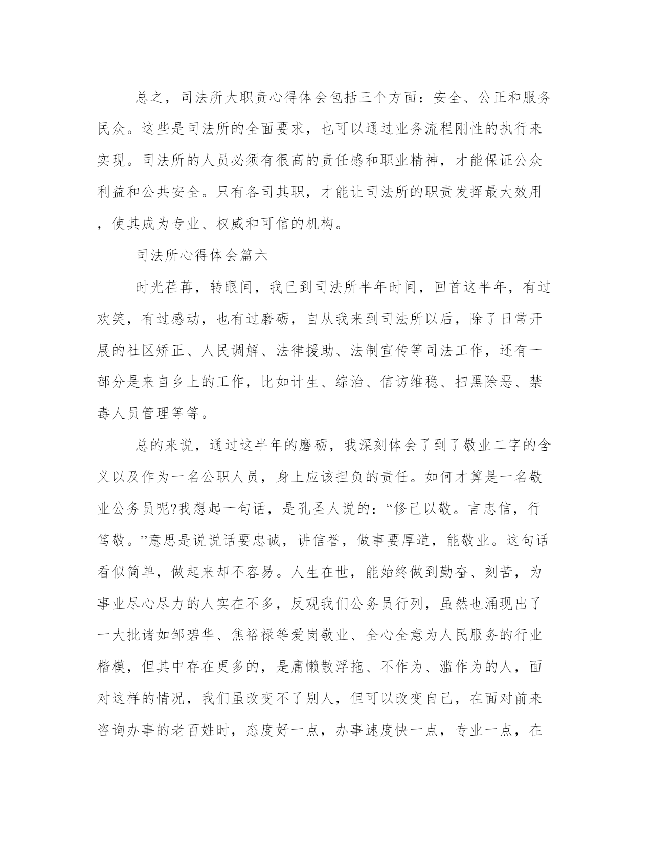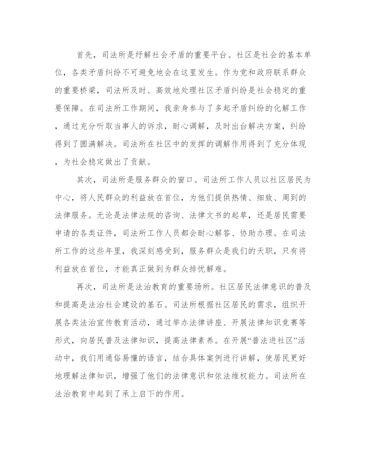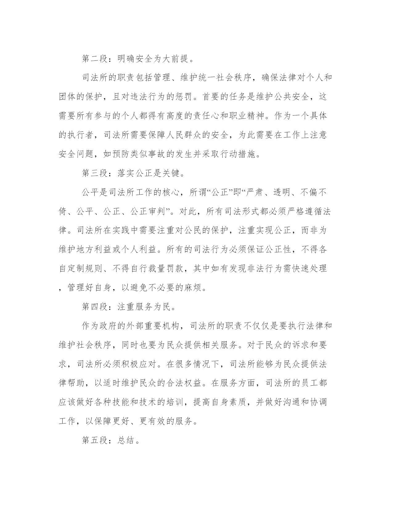 司法所心得体会(精选13篇)心得体会是对一段经历、学习或思考的总结和感悟。那么心得体会该怎么写?想必这让大家都很苦恼吧。下面小编给大家带来关于学习心得体会范文,希望会对大家的工作与学习有所帮助。司法所心得体会篇一司法所,是中国乃至全球法律体系中不可或缺的重要组成部分。不仅仅是一个执法机构,司法所承担着为人民群众提供法律援助、解决纠纷、维护社会稳定的重要职责。近期,我有幸在一所司法所进行实习,通过亲身经历,我深切感受到司法所的重要性,并从中获得了诸多心得体会。首先,司法所是人民群众的坚强后盾。作为基层法律服务机构,司法所承担着为人民群众提供法律援助的重要职责。在实习期间,我亲眼目睹了许多群众在司法所寻求帮助。有的是因为物权纠纷、婚姻矛盾等个人问题,有的是因涉及刑事案件等严重事件。无论大小事,司法所的工作人员总是耐心细致地解答他们的问题,帮助他们寻找解决之道。每当我看到群众因得到司法所的帮助而脸上露出满意的笑容,我深感司法所是人民群众坚实的法治后盾。其次,司法所是法律文化传承的重要场所。作为法律机构,司法所向人民群众普及法律知识,提高国民法制观念,具有重要的法律文化传承功能。在司法所实习期间,我们组织了一次以法律讲座为主题的法制宣传活动。通过宣讲人员的生动讲解,群众了解了法律的作用和责任,对法治社会的认识也有了更加全面的了解。同时,司法所还建立了法律咨询热线和法律知识宣传栏,方便人民群众随时了解法律知识。通过这些活动和措施,司法所在传承法律文化方面发挥了重要作用。第三,司法所是维护社会稳定和促进社会和谐的重要力量。司法所作为执法机构,秉持公正、公平、公开原则,依法维护社会治安,促进社会和谐。在我实习期间,我亲眼目睹过各种各样的案件。无论是刑事案件还是民事案件,司法所都能公正地处理,不偏不倚,彰显了法律的威严和公正。同时,司法所还积极开展社区调解工作,通过调解解决社区内部的纠纷,促进社区居民间的和谐关系。司法所在维护社会稳定和促进社会和谐方面发挥了重要作用。第四,司法所是法律人才培养的重要平台。作为基层法律机构,司法所是培养和锻炼法律人才的摇篮。在实习期间,我有幸与一些优秀的法律工最后,司法所是法治建设的重要推动者。法治是国家治理体系和治理能力现代化的重要标志,也是现代社会文明进步的基石。而司法所作为执法机构,承担着推动法治建设的重要责任。在司法所实习期间,我亲眼目睹了司法所秉持法治原则,坚决执法、公正司法的工作场景。同时,司法所还积极推进改革创新,不断强化自身能力和管理水平。通过这些努力,司法所为法治建设做出了重要贡献。司法所是法律体系中不可或缺的重要组成部分,它承担着保护人民权益、维护社会稳定、促进社会和谐的重要职责。通过实习经历,我深切感受到司法所的重要性,并从中获得了诸多心得体会。执法机构应当以法律为准绳,以公正为宗旨,为人民群众提供优质的法律服务。同时,法律工司法所心得体会篇二xx执法人员综合法律知识培训系列一行政执法,是指在实现国家公共行政管理职能的过程中,法定的国家行政机关和得到法律、法规授权的组织依照法定程序实施行政法律规范,以达到维护公共利益和服务社会的目的的行政行为。一般认为,行政执法行为既包括抽象的行政行为,也包括具体的行政行为。而这里所讲的行政执法,则主要指的是具体的行政行为。由此可见,对于行政执法的概念,我们必须把握它的四点基本内容:4.行政执法的目的,是为了实现国家的公共行政管理职能,从而维护公共利益和社会秩序,为社会和公众提供服务。司法所心得体会篇三司法所是社区中承担基层司法职能的重要机构,是为居民提供法律咨询、调解纠纷、管理矛盾纠纷破坏等服务的综合性法律服务机构。我在司法所工作近两年的时间里感受颇深,下面就我对司法所工作的心得体会进行阐述。首先,司法所是纾解社会矛盾的重要平台。社区是社会的基本单位,各类矛盾纠纷不可避免地会在这里发生。作为党和政府联系群众的重要桥梁,司法所及时、高效地处理社区矛盾纠纷是社会稳定的重要保障。在司法所工作期间,我亲身参与了多起矛盾纠纷的化解工作,通过充分听取当事人的诉求,耐心调解,及时出台解决方案,纠纷得到了圆满解决。司法所在社区中的发挥的调解作用得到了充分体现,为社会稳定做出了贡献。其次,司法所是服务群众的窗口。司法所工作人员以社区居民为中心,将人民群众的利益放在首位,为他们提供热情、细致、周到的法律服务。无论是法律法规的咨询、法律文书的起草,还是居民需要申请的各类证件,司法所工作人员都会耐心解答、协助办理。在司法所工作的这些年里,我深刻感受到,服务群众是我们的天职,只有将利益放在首位,才能真正做到为群众排忧解难。再次,司法所是法治教育的重要场所。社区居民法律意识的普及和提高是法治社会建设的基石。司法所根据社区居民的需求,组织开展各类