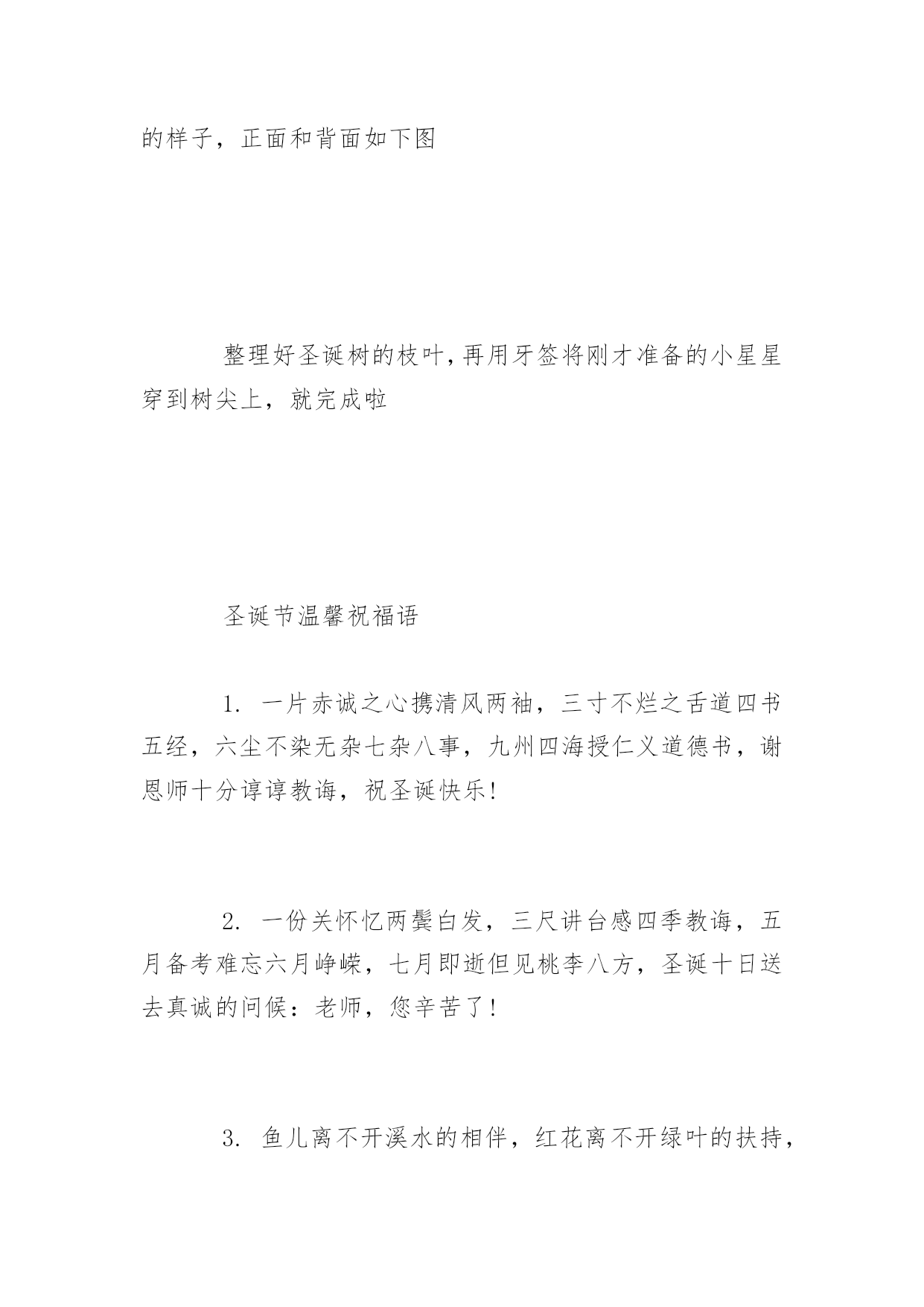 折纸圣诞树的手工制作教程图解折纸圣诞树的手工制作教程图解为了可以更好的提升圣诞节的气氛,很多小朋友都手工制作折纸了圣诞树。小编为大家力荐了折纸圣诞树的制作教程,给大家作为参考,希望能帮到大家!折纸圣诞树的制作教程将A4大小的彩色折纸,裁成正方形,然后,将这个正方形的四条边分别九等分,沿分好的九等分点对折。就成了如图的样子按下图折成这个形状再按图中折法操作再按下图顺序操作按以上步骤折好之后,将两边粘起来,就成了圣诞树的样子,正面和背面如下图整理好圣诞树的枝叶,再用牙签将刚才准备的小星星穿到树尖上,就完成啦圣诞节温馨祝福语1.一片赤诚之心携清风两袖,三寸不烂之舌道四书五经,六尘不染无杂七杂八事,九州四海授仁义道德书,谢恩师十分谆谆教诲,祝圣诞快乐!2.一份关怀忆两鬓白发,三尺讲台感四季教诲,五月备考难忘六月峥嵘,七月即逝但见桃李八方,圣诞十日送去真诚的问候:老师,您辛苦了!3.鱼儿离不开溪水的相伴,红花离不开绿叶的扶持,花儿离不开泥土的滋润,学生离不开老师的教导。今天圣诞节,老师,谢谢您,您辛苦了!4.您是到死丝才尽的春蚕,为我们把您的青春奉献;您是成灰的蜡烛泪方干,为我们指引美好的'明天。亲爱的老师,圣诞节了,祝您节日快乐!5.平安夜祈祷:考试作弊不被抓,马路扶人不被拉,物价稳定有钱花,工作体面不浮夸,爱情有主不剩下,生活安康成了家。朋友,平安夜快乐!6.如果没有您,我无法知道自己的不足;如果没有您,我无法领略知识的快乐;如果没有您,我无法憧憬美好的明天。老师,谢谢您!节日快乐!7.带上厚厚的帽子,围上暖暖的围巾,盯着雪白的窗外,想着远方的朋友。发一条短信,送一个祝福,做一个好梦,顺便能在圣诞节收到你的礼物8.我们本是一株株幼苗,是您用书本播种,用汗水浇灌,用粉笔耕耘,用辛勤培育,才使我们茁壮成长。感谢您,敬爱的老师,祝您圣诞节快乐。9.认识你的这段时间我非常开心非常快乐,但是我一定要在圣诞之前告诉你,开心的日子会在圣诞之后结束。因为将会更开心的!哈哈~圣诞快乐!有人说,如果你能在圣诞前三个月接到祝福,那么在来年的前三个礼拜,对你的祝福就能实现,现在我几祝福你:钱途无量,事业爱情一帆风顺。