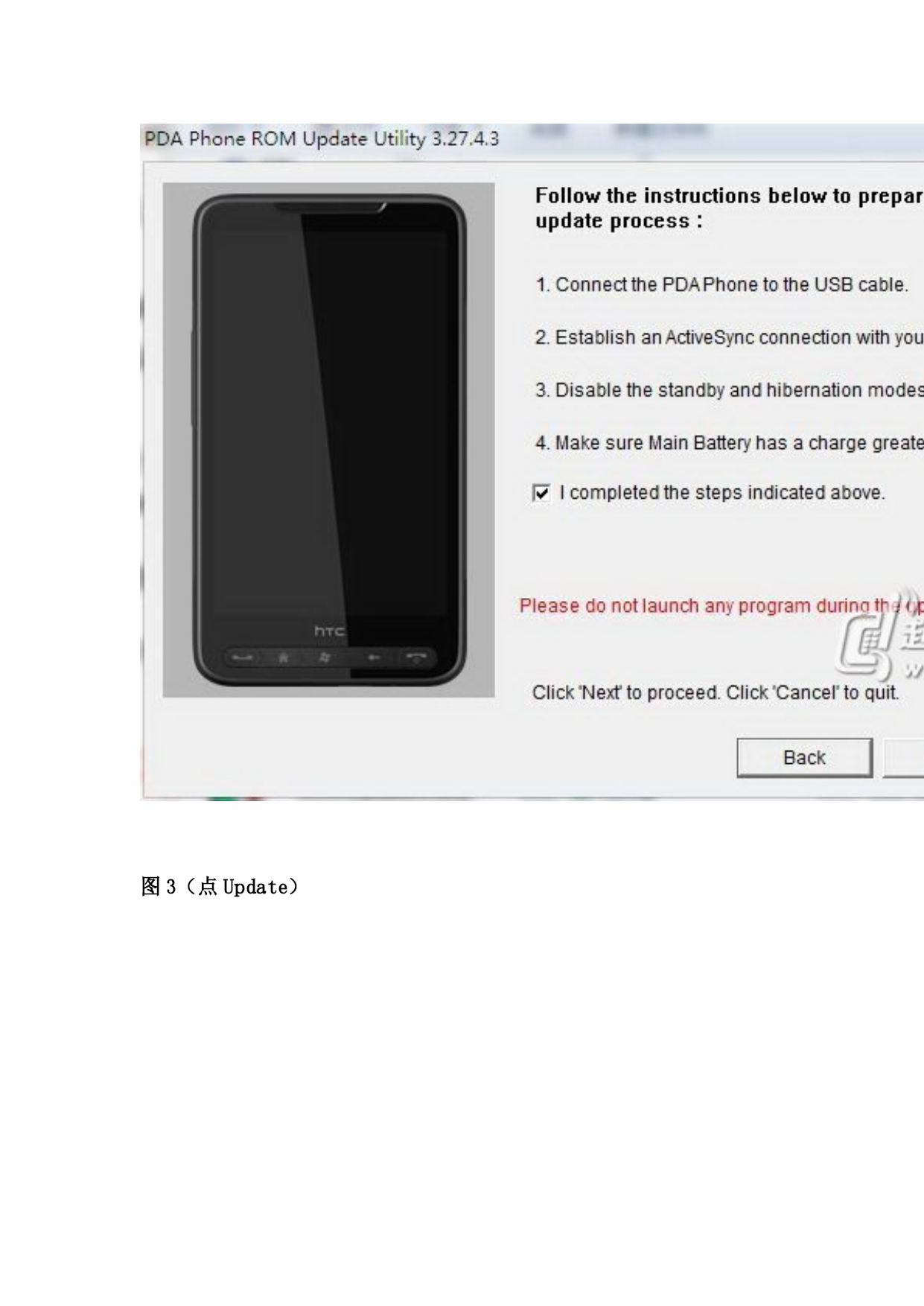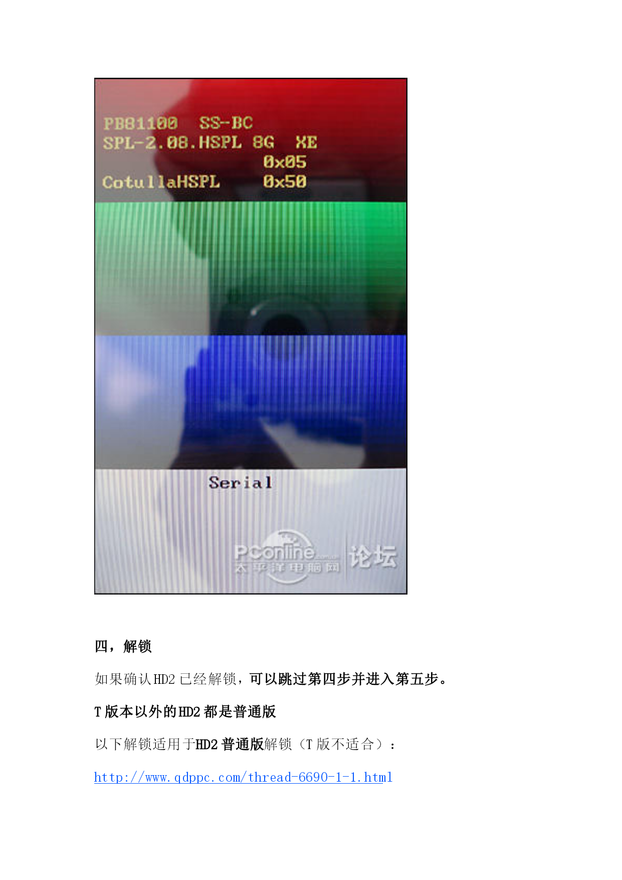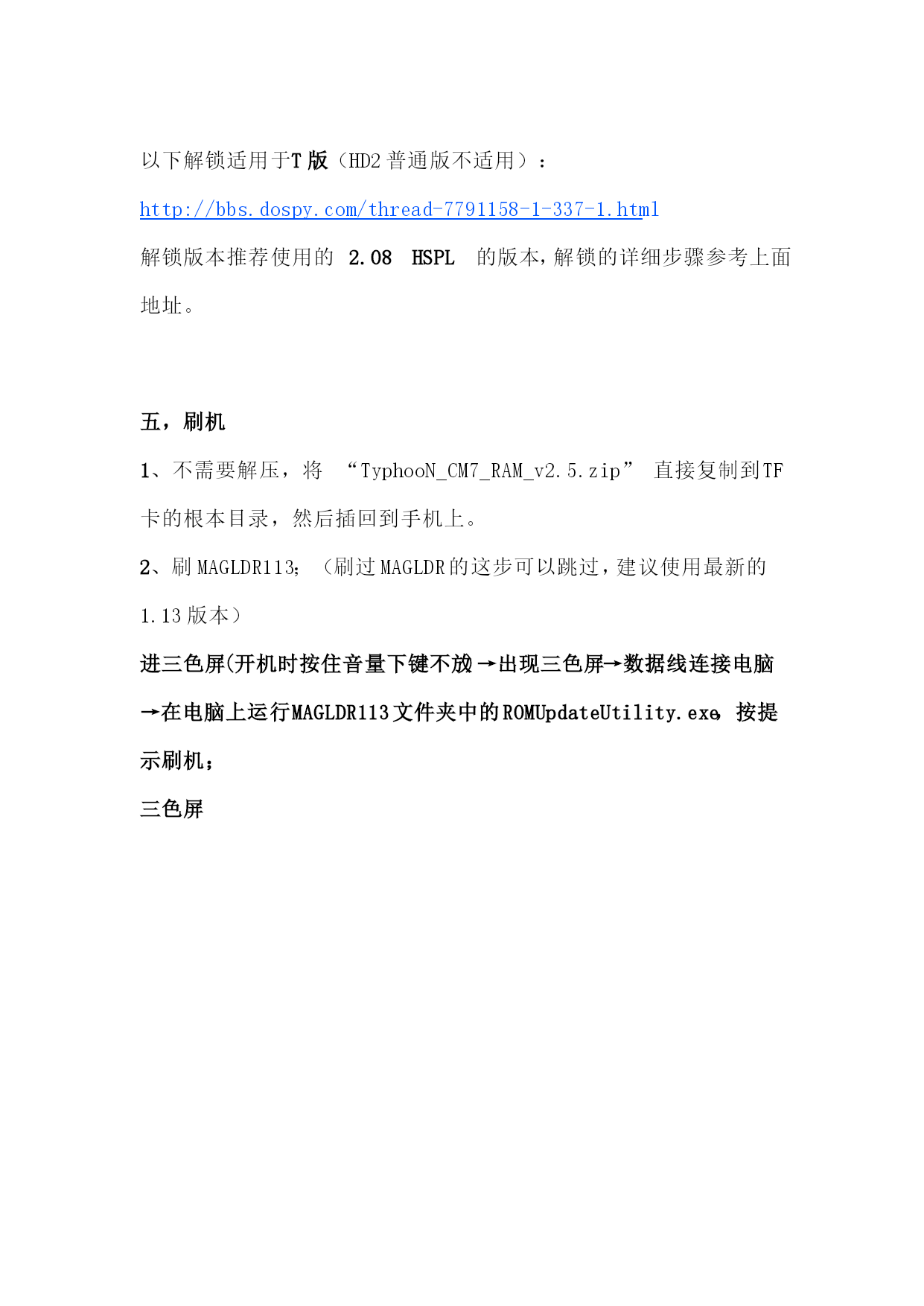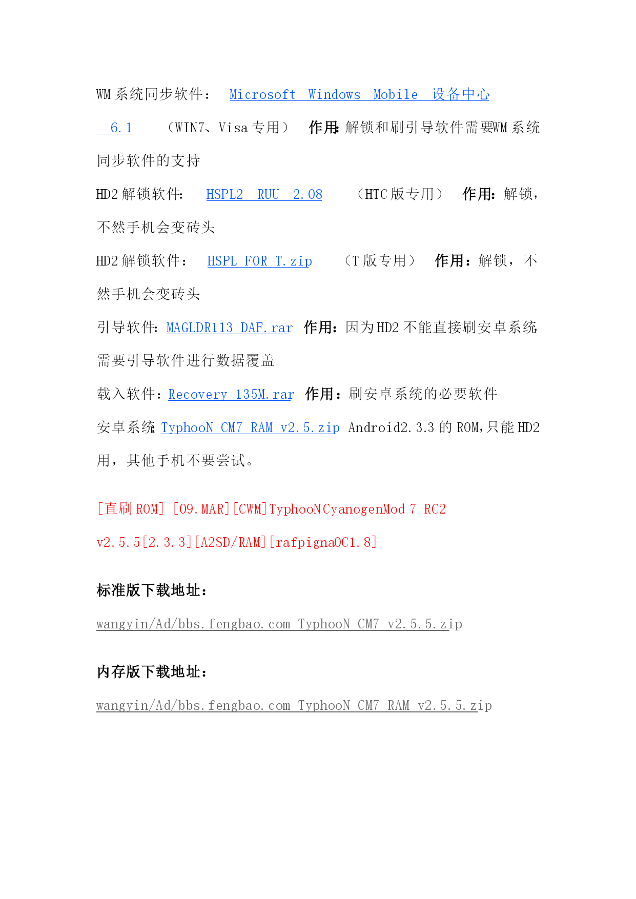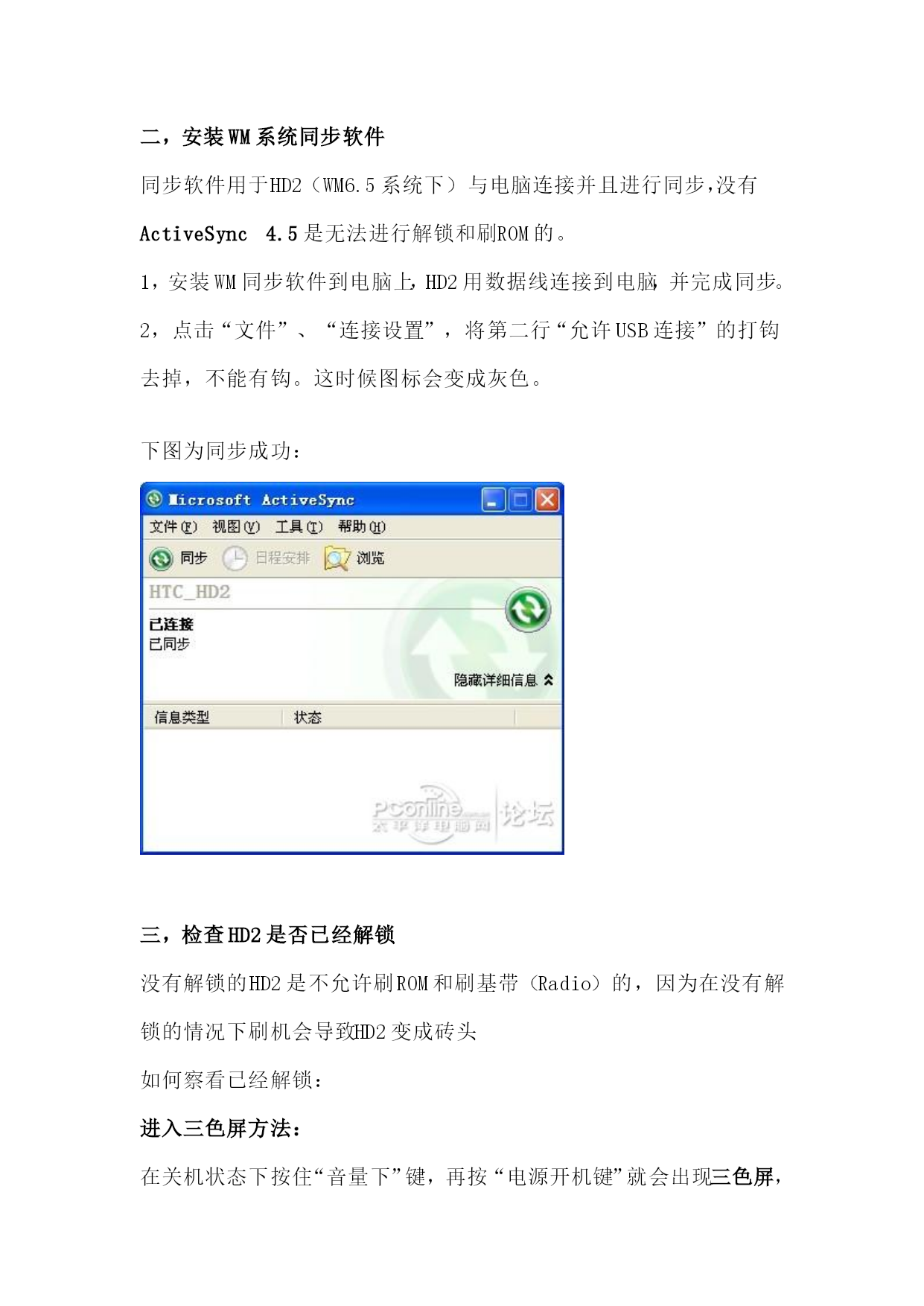 HTCHD2刷安卓2.3系统图文教程(T版可用暂无BUG)!说明:目前HD2运行Android系统非常稳定:通话、软件、短信、上网、蓝牙、WIFI、运行,完全正常和流畅,BUG基本没有你可以选择的Android的版本非常多,它们的区别在于UI界面、小插件、部分小功能、稳定性的不同。(这次推荐TyphooN_CM7这个版本,优点是流畅、精简、稳定、最新的Android2.3.3系统,同时没有发现明显的BUG。其他版本如miui可以自行探讨)耗电方面,Android和WM6.5没什么差别,频繁使用的话,还是一天两充TF卡建议购买SanDisk的,一般推荐选择4GB~8GB之间。一,准备工作备份你的资料:手机号码、短信、图片、音乐、视频、文档等等...硬件:能上网的电脑、HD2、数据线、TF卡、读卡器、电池电力(保持40%以上),还有耐性!软件:WM系统同步软件:HYPERLINK"http://www.xdowns.com/soft/softdown.asp?softid=36937"\t"_blank"ActiveSync4.5(XP专用)作用:解锁和刷引导软件需要WM系统同步软件的支持WM系统同步软件:HYPERLINK"http://www.xdowns.com/soft/softdown.asp?softid=36622"\t"_blank"MicrosoftWindowsMobile设备中心6.1(WIN7、Visa专用)作用:解锁和刷引导软件需要WM系统同步软件的支持HD2解锁软件:HYPERLINK"http://115.com/file/dn39rlfn"\t"_blank"HSPL2RUU2.08(HTC版专用)作用:解锁,不然手机会变砖头HD2解锁软件:HYPERLINK"http://115.com/file/aqvaof83"\t"_blank"HSPL_FOR_T.zip(T版专用)作用:解锁,不然手机会变砖头引导软件:HYPERLINK"http://115.com/file/aqvaog59"\t"_blank"MAGLDR113_DAF.rar作用:因为HD2不能直接刷安卓系统,需要引导软件进行数据覆盖载入软件:HYPERLINK"http://u.115.com/file/f9a254e94c"\t"_blank"Recovery_135M.rar作用:刷安卓系统的必要软件安卓系统:HYPERLINK"http://u.115.com/file/t4a96ea581"\t"_blank"TyphooN_CM7_RAM_v2.5.zipAndroid2.3.3的ROM,只能HD2用,其他手机不要尝试。[直刷ROM][09.MAR][CWM]TyphooNCyanogenMod7RC2v2.5.5[2.3.3][A2SD/RAM][rafpignaOC1.8]标准版下载地址:HYPERLINK"http://romer.fengbao.com/script/dl_fn.php?fn=wangyin/Ad/bbs.fengbao.com_TyphooN_CM7_v2.5.5.zip"wangyin/Ad/bbs.fengbao.com_TyphooN_CM7_v2.5.5.zip内存版下载地址:HYPERLINK"http://romer.fengbao.com/script/dl_fn.php?fn=wangyin/Ad/bbs.fengbao.com_TyphooN_CM7_RAM_v2.5.5.zip"wangyin/Ad/bbs.fengbao.com_TyphooN_CM7_RAM_v2.5.5.zip二,安装WM系统同步软件同步软件用于HD2(WM6.5系统下)与电脑连接并且进行同步,没有ActiveSync4.5是无法进行解锁和刷ROM的。1,安装WM同步软件到电脑上,HD2用数据线连接到电脑,并完成同步。2,点击“文件”、“连接设置”,将第二行“允许USB连接”的打钩去掉,不能有钩。这时候图标会变成灰色。下图为同步成功:三,检查HD2是否已经解锁没有解锁的HD2是不允许刷ROM和刷基带(Radio)的,因为在没有解锁的情况下刷机会导致HD2变成砖头如何察看已经解锁:进入三色屏方法:在关机状态下按住“音量下”键,再按“电源开机键”就会出现三色屏,再松开。如果后缀不是HSPL(而是0001之类的)那就是未刷HSPL(即没有解锁)没有解锁的HD2是千万不能刷机的,否则会变成“砖头”附各版本对应解锁:未解锁已经解锁SPL1.42.0000----1.42HSPLSPL1.62.0000----1.62HSPLSPL1.66.0