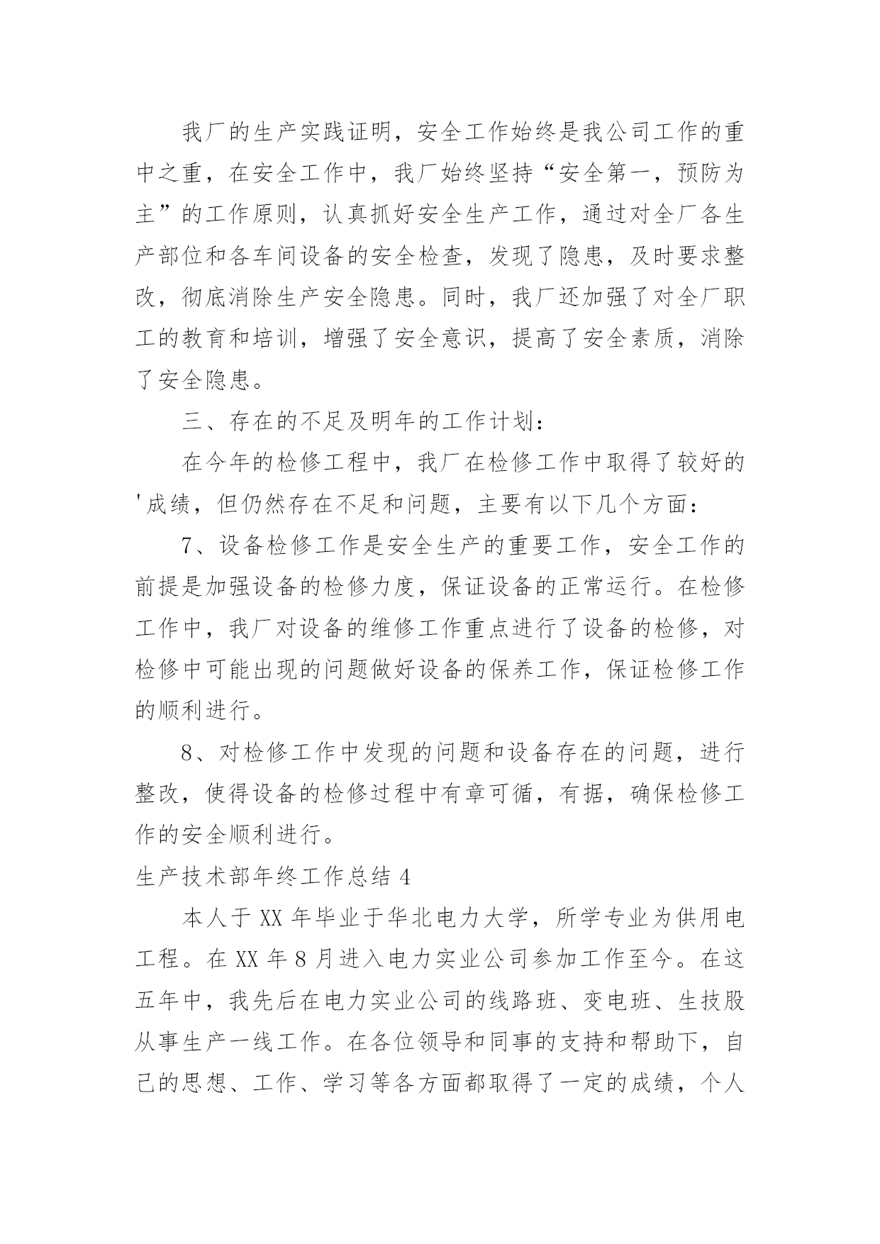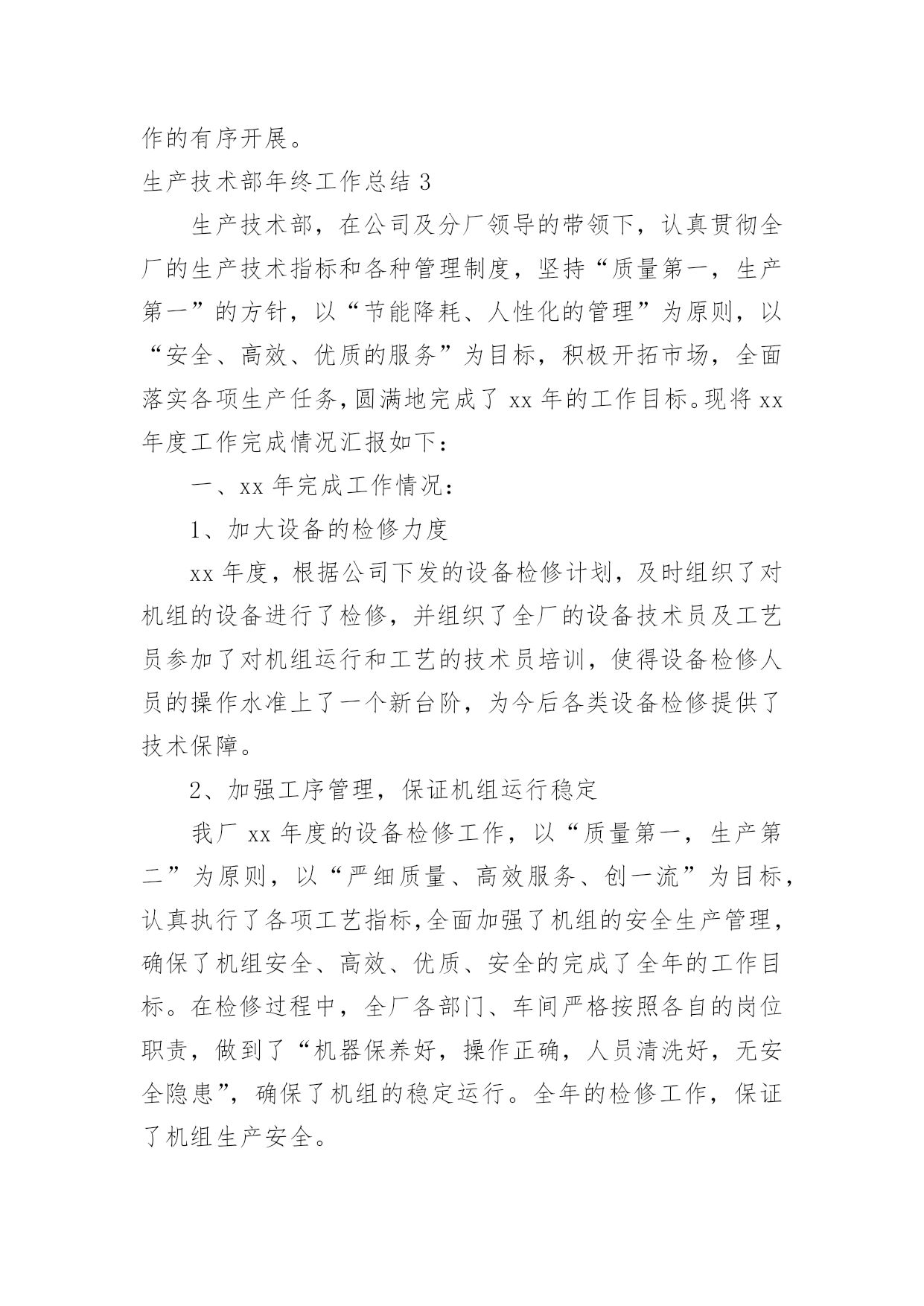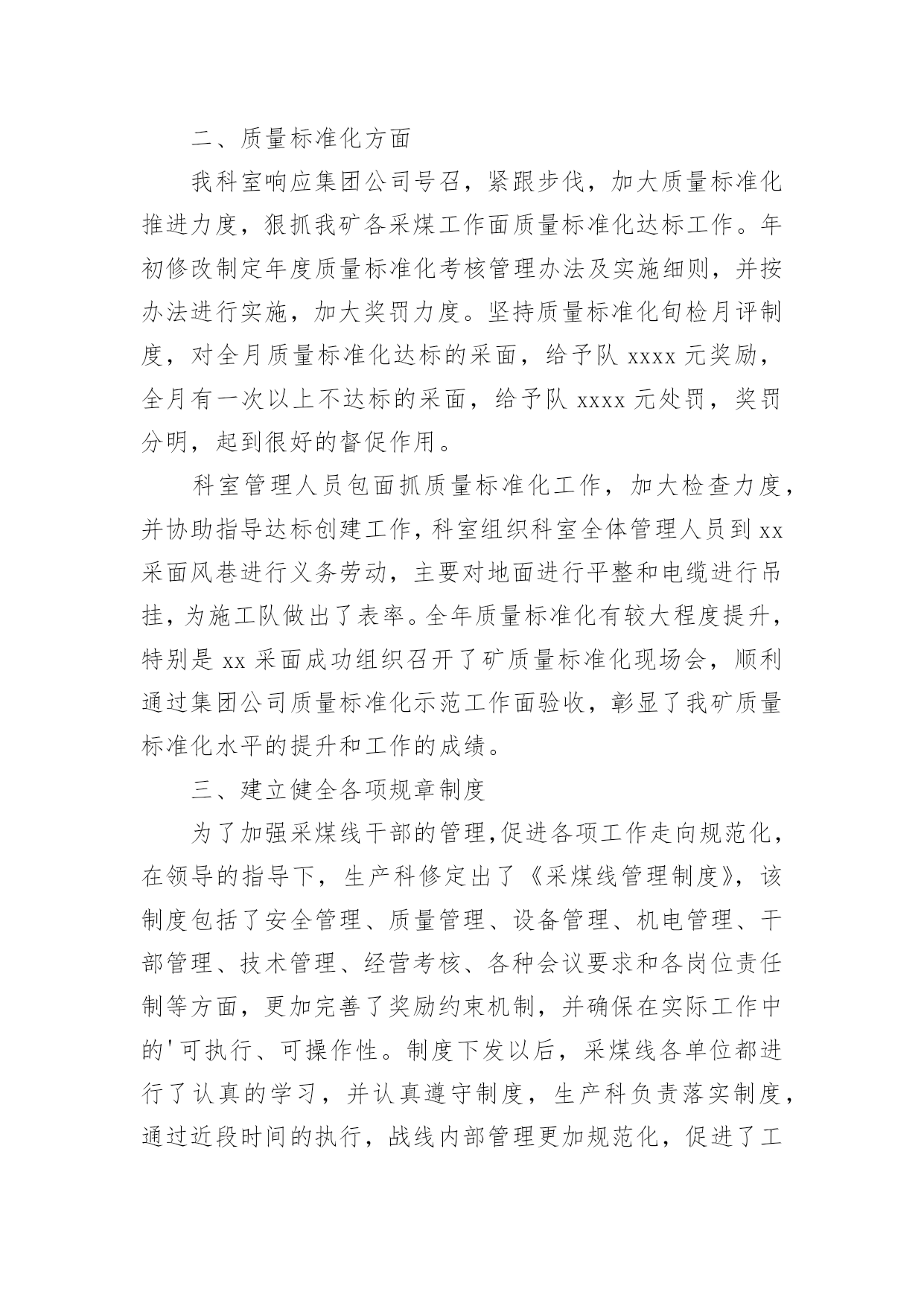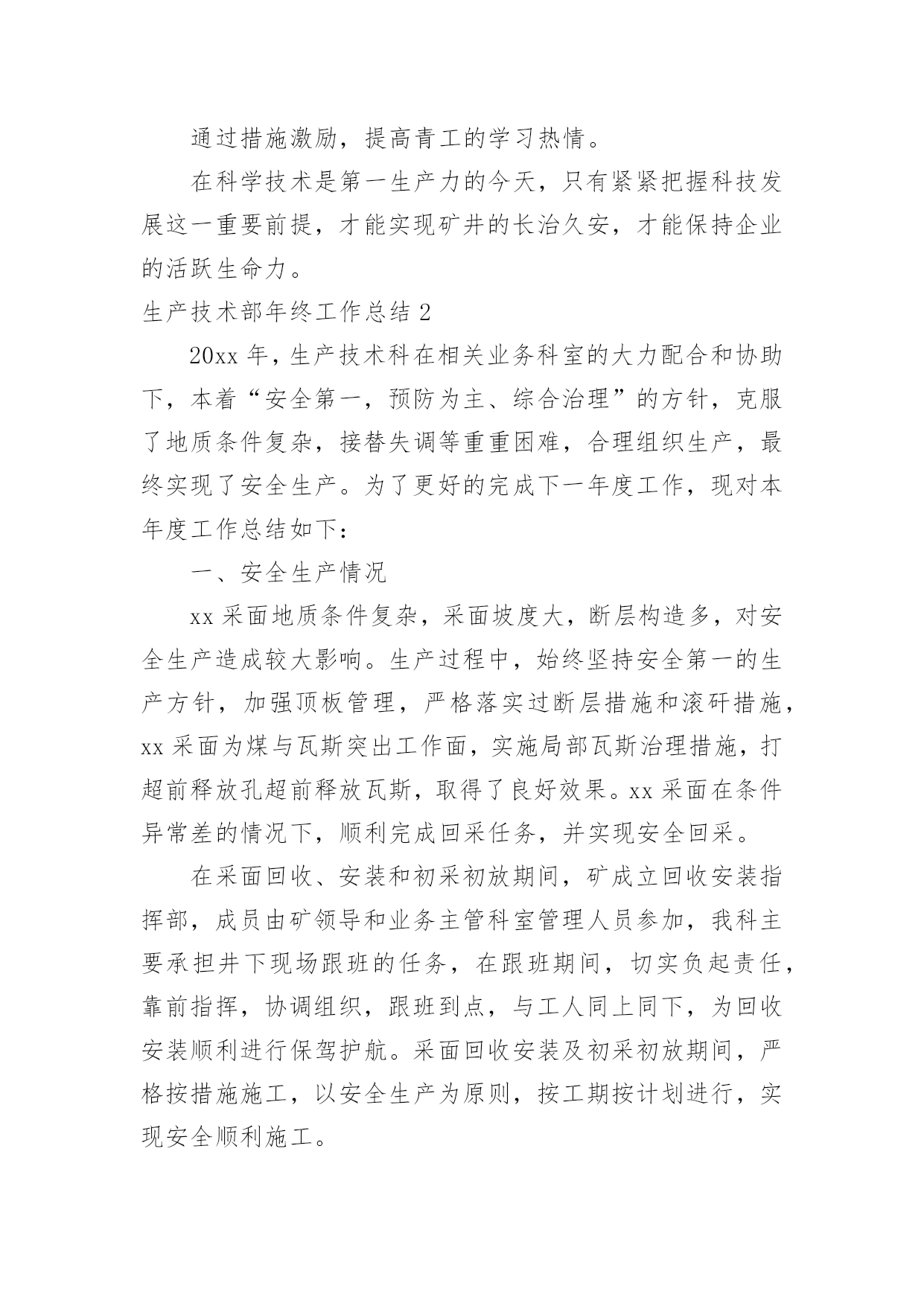 生产技术部年终工作总结生产技术部年终工作总结集合8篇总结是事后对某一阶段的学习、工作或其完成情况加以回顾和分析的一种书面材料,它可以给我们下一阶段的学习和工作生活做指导,因此我们需要回头归纳,写一份总结了。总结你想好怎么写了吗?下面是小编帮大家整理的生产技术部年终工作总结,欢迎阅读与收藏。生产技术部年终工作总结1本人担任xx煤矿生产技术科负责人以来,从矿井的发展着手,切实把加快自主创新、引进科技成果作为转变矿井发展方式,加大新设备、新工艺的引入和使用力度,牢牢跟进煤矿的科技发展步伐,通过一年的发展,已初步将我矿打造成了xx地方煤矿的领军企业,成为集团的人才、科技输出基地,为集团的后继发展提供了强劲的活力,为企业的发展提供了有力基础。现将本人一年以来的科技工作总结如下:一、购进悬移支架,实现移架自动化我矿工作面主要以炮采为主,使用金属单体支柱配合铰接顶梁进行支护,使用该方法需要消耗大量的笆片、背板、扎绳等材料,且工作面在顶板较差时,还需要大量的木方进行接顶,每班次均需要进行移溜打柱等工作量,工人的劳动强度较大。在引进悬移支架后,一方面减少了材料消耗,该支架采用整体悬移顶盖式支撑,除对局部漏顶外可以不进行支护外,还可以减少炮后过顶的工作,利用翻转梁即可以对暴露的煤顶进行支护;另一方面,工作面可以实现不间断生产,当悬移支架推到位后,整个回采工序完成了一个循环,除了设备检修的时间外,工作面可以实现不间断循环作业。二、工作面回采充填,倡导绿色开采我国工作面常用的是直接跨落法管理顶板,虽然对工作面的压力管理、瓦斯管理等方面有着一定的优势,但是地表塌陷情况也很严重,导致大面积的良田失去耕种价值,以下村庄下的煤炭资源不能够有效回采,造成资源的极大浪费。我矿与xx大学合作在xx地区率先引进了超高水充填这一项目,通过此途径可有效解决村庄下煤炭资源的回收问题,一方面减少了地表塌陷治理和土地征用,另一方面对工作面的顶板管理和瓦斯治理也得到较大的改善。三、推动小改小革,实现减人提效为进一步挖掘矿井的'潜力,实现矿井的节能减耗,实现长治久安,我带领和鼓励各专业技术人员发挥自己的聪明才智,将影响矿井安全生产的环节根据本矿的实际情况进行改造,并取得了良好的经济效益。我矿的混合井口原使用人工推车,效率低下且人员疲劳时容易出现意外,在我的带领下,将人工推车改为机械推车,并对罐笼的阻车器、安全门等进行升级改造,实现了机械化作业,作业人员由原来的六人/班现在只需四人就可以完成全部工作,并且不需要人工推车,极大的降低了劳动强度和生产成本。气动缸由于体积小、功率高、维护量小、使用方便灵活等特点,在我矿的多个场合有所应用,如气动联锁安全门、气动煤仓放煤嘴、气动道岔、气动分煤器等,很大程度上减轻了职工的劳动强度,在一定程度上避免了人工操作,消除了人工操作的隐患。由于矿井的斜巷较多,职工在上下班时需要消耗较大的体力,为此我组织技术人员进行攻坚克难,采用了无极绳绞车牵引钢丝绳循环运转,人手握卡绳棒卡住钢丝绳带动行人上坡,减轻职工上坡的体力消耗,并在落差超过50米的行人斜巷进行了推广安装,得到了职工的一致好评。四、发展人才战略,提供强劲保障我不仅在技术引进、改造与发展上进行改进,并且在人才培养上也下足功夫,近年以来,共送培xx大学多批有志青年进行深造学习,同时出台优惠政策鼓励在职的青年干工利用班外时间进行函授进修学习,本着以矿井的战略目标为指引,以人为本的发展理念,着力培养有理想、能吃苦、善奉献的有志青年加入到矿井的安全生产建设中来,有力的提升矿井整体形象,使我矿的质量标准化水平及安全生产秩序上了一个新台阶。通过人才培养,提升企业的核心竞争力;通过理念转换,增强矿井的本质安全度;通过措施激励,提高青工的学习热情。在科学技术是第一生产力的今天,只有紧紧把握科技发展这一重要前提,才能实现矿井的长治久安,才能保持企业的活跃生命力。生产技术部年终工作总结220xx年,生产技术科在相关业务科室的大力配合和协助下,本着“安全第一,预防为主、综合治理”的方针,克服了地质条件复杂,接替失调等重重困难,合理组织生产,最终实现了安全生产。为了更好的完成下一年度工作,现对本年度工作总结如下:一、安全生产情况xx采面地质条件复杂,采面坡度大,断层构造多,对安全生产造成较大影响。生产过程中,始终坚持安全第一的生产方针,加强顶板管理,严格落实过断层措施和滚矸措施,xx采面为煤与瓦斯突出工作面,实施局部瓦斯治理措施,打超前释放孔超前释放瓦斯,取得了良好效果。xx采面在条件异常差的情况下,顺利完成回采任务,并实现安全回采。在采面回收、安装和初采初放期间,矿成立回收安装指挥部,成员由矿领导和业务主管科室管理人员参加,我科主要承担井下现场跟班的任务,在跟班期间,切实负起责任,靠前指挥,协调组织,跟班到点,与工人