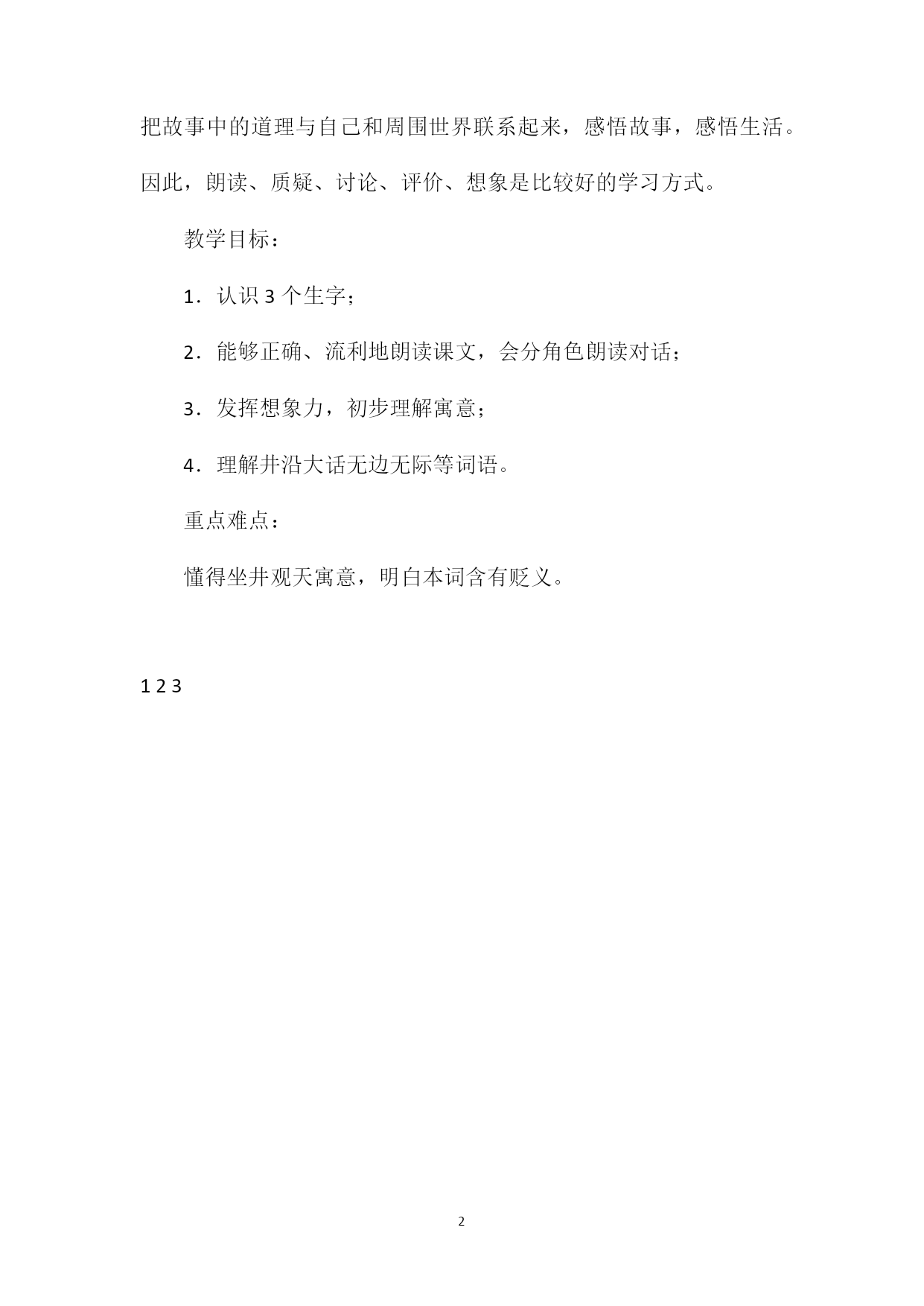 PAGEPAGE2《坐井观天》教学设计教材分析:《坐井观天》这则寓言,通过生动有趣的对话,给孩子们讲述了一个寓意深刻的故事。文章通过青蛙和小鸟对天的大小的争论,阐明了一个深刻的道理:看问题、认识事物,站得要高,看得要全面,不能像青蛙那样犯了错误还自以为是。这一寓意,对于低年级的小朋友来说具有现实的指导意义,因为他们对事物的认识往往是片面的。学生分析:二年级学生年龄小,他们经常把部分当整体,管中窥豹一叶障目,不见泰山的看问题的方法是错误的,但他们在生活中却常常犯这样的错误。比如学艺,常会有这样的感觉,刚接触时,自我感觉特别好,以为自己会了,待到用时,方才明白,山外有山,学无止境。这异于坐井观天啊。因此,进行本课的教学是非常必要的。设计理念:成语故事《坐井观天》,让学生懂得目光短浅,眼界狭小,见识就会有限的道理。我认为可针对学生喜爱故事的特点,利用插图,激发他们主动读故事,引导他们评价故事中的人与事,从中理解和懂得故事所包含的道理,还可以启发学生大胆想象,续编故事。要让学生把故事中的道理与自己和周围世界联系起来,感悟故事,感悟生活。因此,朗读、质疑、讨论、评价、想象是比较好的学习方式。教学目标:1.认识3个生字;2.能够正确、流利地朗读课文,会分角色朗读对话;3.发挥想象力,初步理解寓意;4.理解井沿大话无边无际等词语。重点难点:懂得坐井观天寓意,明白本词含有贬义。123
