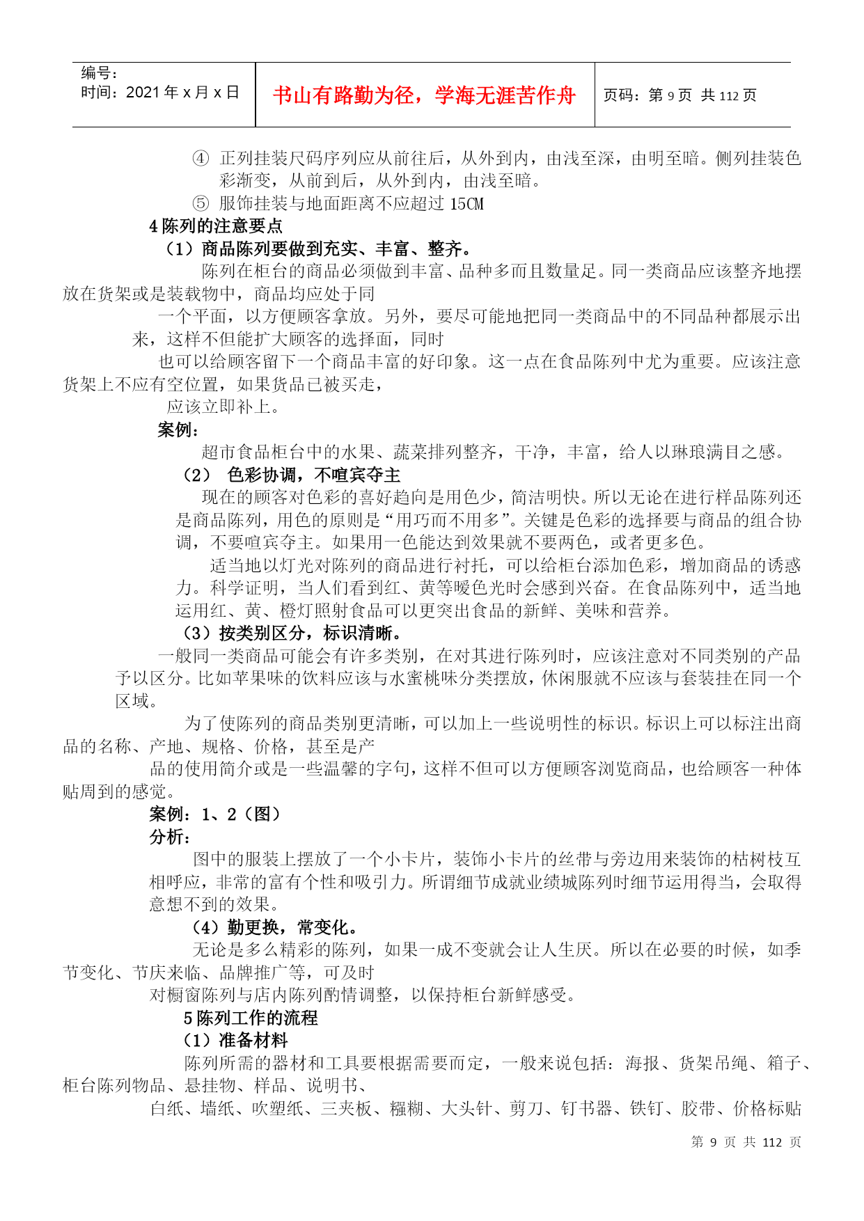 编号:时间:2021年x月x日书山有路勤为径,学海无涯苦作舟页码:第PAGE112页共NUMPAGES112页第PAGE\*MERGEFORMAT112页共NUMPAGES\*MERGEFORMAT112页培训销售总监--柜台营业员培训全案学习目标营业员是很平常却值得尊敬的一个职业,是不可或缺的。营业员是柜台的主角,是厂家和产品的形象代表,也是顾客和厂家的中介与纽带,更是促进厂家和店铺产品销售必不可少的动力来源。但目前,营业员整体素质不高,已不能满足企业和顾客需要,也无法适应激烈的市场竞争。本书从实践出发,结合现代商业销售和服务理论知识,通过深入浅出的方式,使从事营业员工作以及有志于从事该行业的读者,充分认识销售与服务工作的意义和作用,并通过学习本书,提高销售能力,全面提升服务质量。通过学习本书,营业员将能够:1、了解柜台销售的特点2、树立正确的柜台销售服务观念3、熟悉柜台销售的整个流程4、掌握专业的柜台销售技巧测试你是一个优秀的营业员吗?请在符合你自己情况的选项前打“√”你了解柜台陈列的基本知识,能承担陈列的工作。你懂得运用音乐、气味、小装饰品来吸引顾客。你对所销售的产品的特性、优点非常熟悉你能及时补货、理货,整理柜台环境。你懂得该如何观察顾客,揣摩顾客心理。你在接待顾客时,懂得运用面部表情、身体语言,尊重顾客。你非常有亲和力,能有效拉近与客户的距离。你懂得探寻不同顾客的需求。你非常善于与顾客沟通,能与顾客建立友好的关系。当顾客提出异议时,你能巧妙化解。你熟悉说服技巧,顾客常常能被你说服。你懂得妥善处理、包装顾客所购买的商品,让顾客满意地离开。你喜欢你的工作,并获得良好的业绩。你在工作中能承受压力,乐观向上,开朗活泼。你对自己的事业有一个长远的规划。评分标准:如果你选“√”在10个或以上,那么说明你的销售技能极佳,是一名优秀的营业员,请继续努力!如果你选“√”在7个以上10个以下,那么说明你的销售技能良好,是一名合格的营业员,请加强学习,进一步提高自己的能力!如果你选的“√”少于7个,那么你的销售技能还有待提高,请立即加强相关知识的学习!序你曾听过这样一个小故事吗?一位妇女走进一家鞋店,试穿了一打鞋子,汉有找到一双是合脚的。营业员甲对她说:“太太,我们没能有合您意的,是因为您的一只脚比另一只大。”这位妇女走出鞋店,没有买任何东西。在下一家鞋店里,试穿被证明是同样的困难。最后,笑眯眯的营业乙解释道:“太太,您知道您的一只脚比另一只小吗?”这位妇女高兴地离开了这家鞋店腋下携着两双新鞋子。不同的营业会给顾客以不同的感受。不同的销售方式能导致不同的销售结果。营业员甲之所以失败,是因为她不懂得顾客的心理,缺乏销售技巧。其实在现实中经常会发生与小故事相类似的情况。根据广州市消费者委员会调查显示,大多数的营业员都很少使用服务用语,只有一半的营业员是主动为顾客提供服务。有近20%的售货员介绍了错误的商品知识或者对商品知识一无所知……营业员的素质有待提高,是什么原因造成的呢?一部分可能是因为从事营业员工作的人员普遍学历不高,又缺乏系统的培训;另一方面是加为营业员自身的心态。出于传统的习惯,营业员的这个职位实在不怎么起眼,以致于很多从事营业员这一职位的人员自己都找不到工作的乐趣,他们在工作中缺乏热情、缺乏效率。诚然,现在有很多零售企业已经开始重视营业员的培训了,但是很多营业员培训的课程都有一个普遍的问题,就是过多的停留在理论的层面上,只告诉了营业员许多关于销售技巧的名词和理论,但是很少有人能告诉他们该怎么做。事实上,通过调查表明,柜台销售第一线员工文化底子较薄,对理论的理解力较弱。有90%的员工认为,如果有人能直接告诉他们该怎么做,比告诉他们有什么样的销售理论更能帮助他们有效提高业绩。因此,理论的培训并不能让他们有更多的收获。本着为企业打造针对一线人员的具有实战性的专业培训教材的理念,我们结合多年来的内训经验,整合了权威人士及行业专家的意见和建议,开发了本手册。在内容设计方面,我们更注重“实操”性,用通俗的语言讲授在营业过程中的实用技巧,不仅仅告诉你应当做什么,更多的是教授应当怎么去做。本书还结合大量的案例、图表和轻松的练习以帮助你理解和吸收,以便你能现学现用,迅速地提高销售能力。本手册分为三章:如何让顾客对柜台一见钟情WEISS柜台快速销售成交法成为一百分的营业员第一章是讲解如何才能吸引顾客走近柜台。内容包括营业员在销售前所必须做的一些基础理论作,比如陈列、仪态、派发宣传品等。与一般书籍讲解陈列不同的是,我们更多的是注重技巧而非理论。第二章涉及的是营业的核心工作——销售技巧。该章是本书实用性强的最佳体现,你会发