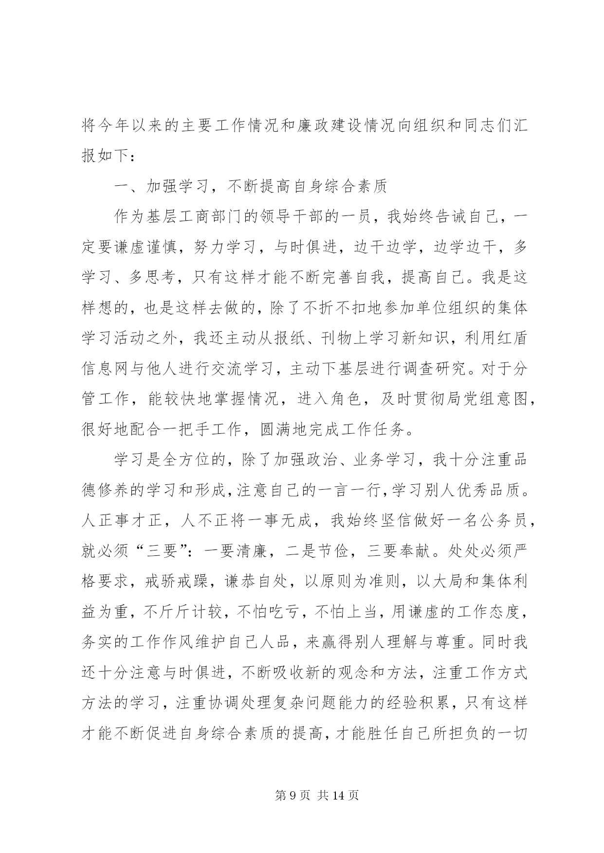 第PAGE\*Arabic\*MERGEFORMAT14页共NUMPAGES\*MERGEFORMAT14页工商局述职述廉报告范文各位代表、委员、同志们,我首先代表工商所全体干部,对你们在百忙之中参加述职述廉报告会,表示热烈欢迎和衷心感谢。按照市局和分局党组关于工商所向辖区人大代表,政协委员和经营者代表述职述廉的要求,就工商所履行职责和廉政情况,分三个方面向诸位作以汇报。一、工商所概况(一)内部概况:工商所共有9名干部,其中所长1人,监管干部8人;平均年龄48岁;文化程度。大学学历1人,本科学历2人,大专学历4人,高中2人;中共党员3人;辖区分设5个管理区域,分别由5名监管干部管理。(二)管辖区域概况。东至大丰路,西至蓟运河,北至芦汉路南,南至府北街。监管面积40平方公里,常住人员约4.5万人,流动人口约2万余人。截止目前,有各种类型企业578户,个体工商户1197户。(三)管辖区域特征。一是工业制造业,机械加工业集中,有五十余家制造业,机械加工行业企业也集中在所区域;二是大型企业集中,其中天津长芦盐厂有限责任公司职工四千余人,区最大零售商业企业金佰汇商厦,4个综合性市场(投资公司滨河农贸市场、红霞里菜市场、金谷里菜市场、蓝月湾菜市场),3个专业市场(美信服装城、贵琪琳装饰城、创新家园家具城);三是邮政通讯行业集中。区域的四家公司总部均设在我区域(中国邮政、中国电信、中国移动、中国联通);四是以新开中路、东风中路为中心已形成商业餐饮街。五是教育机构集中,学校有天津商学院分院,市级重点中学一中,区级重点中学八中,盐场小学。二、加强队伍建设(一)依法治所,搞好团结,增强队伍凝聚力。依法治所。提出创造一流工作业绩,树立良好工商形象。坚持“制度为本,从严管理”。加强法制教育,政治学习,形成浓厚的学习氛围,使全所同志能够熟悉掌握法律法规、业务技能。其次健全制度,以制度和规章约束全员,同时落实执行好这些制度,做好以职定岗,以岗定人,以人定责,任务数字分解到每个人。(二)增强创新意识。基层工商所需要处理的日常工作中,程序化、重复性的占很大一部分。经常是日复一日的巡查、受理、调解、查处。针对这一情况,所领导把主要创新精力放在“三个转变”上:即从单纯注重日常工作向善于从实际出发,超前工作转变;从应付上级检查向自觉动脑,创造性的开展工作转变;从单纯机械的工作,向上下联动,发挥群体合力转变。在转变中,增强创新意识,探索创新路子,总结创新经验。(三)抓班子建设,形成强有力的战斗堡垒。工商所的特点是监管服务对象多,工作压力大。仅靠所领导工作是远远不够的。在倡导民主集中制原则的基础和上级的指导帮助下,抓好班子建设,充分发挥每个人的创造性和能动性。所里的每个同志职责明确,各尽其职,最大限度提高所里每个人员的工作效能;其次,落实班子分工抓好工作。一方面所领导满腔热情地帮助所里其它成员提高工作能力,另一方面,放手让他们做工作,有效地调动全体同志的积极性。特别是对工作责任心强和工作能力强的同志重点培养,形成工作核心,有效带动和促进全所工作的全面开展。(四)加强责任意识。基层工商所处理申投诉案件,急事难事多,接受专项检查任务多,各职能科室下派任务多。因此工商所领导班子和全体干部在增强事业心和高度的责任感上进行了深入的学习,共同提高认识,形成合力。使大家善于处理问题,勇于承担责任,做到在其位,谋其政,尽其责。(五)廉政建设以深化基层工商所效能建设为抓手,促进干部思想作风、工作作风转变,培养造就一支“政治坚定,勤政廉洁,为民务实,业务精通,纪律严明”的工商所干部队伍。自年初至今,所里已多次组织全所干部对中纪委有关文件、市局、XX县区局有关会议精神和有关领导的重要讲话进行学习讨论。全体党员干部撰写了对参加“保持党员干部纯洁性教育活动”的学习心得。通过自己查、领导点、群众提,本着真心实意、坦诚相见、开诚布公、互相帮助的原则,相互“揭短”、“亮丑”,做到解剖自己不怕严,亮出问题不怕丑,触及思想不怕痛,切实找出“病因”,查出“病根”,达到剖析根源、沟通思想、协调一致的目的,查找每个人在思想作风、工作作风、领导作风、纪律作风和生活作风等方面的问题。实现了“四个明显”:干部作风转变明显、纪律明显增强、宗旨意识明显提高、精神风貌明显改观。通过学习,在工作中人人均能遵守各项制度,落实考勤、请销假、车辆管理等内部制度,职责明确,政令畅通,令行禁止,增强大局意识,没有推诿扯皮的问题。在窗口服务和巡查监管工作中,没有发现违纪行为。在年检验照、个体登记、服务企业、团体年检等工作中,受到广大群众和企业的好评。三、履职尽责1、市场监管(1)、开展元旦、春节市场检查,对辖区超市、市场、食杂店各类食品经营主体80余户进行检查。(2)、开展烟花爆竹检查,对固定场所及道路摆摊设