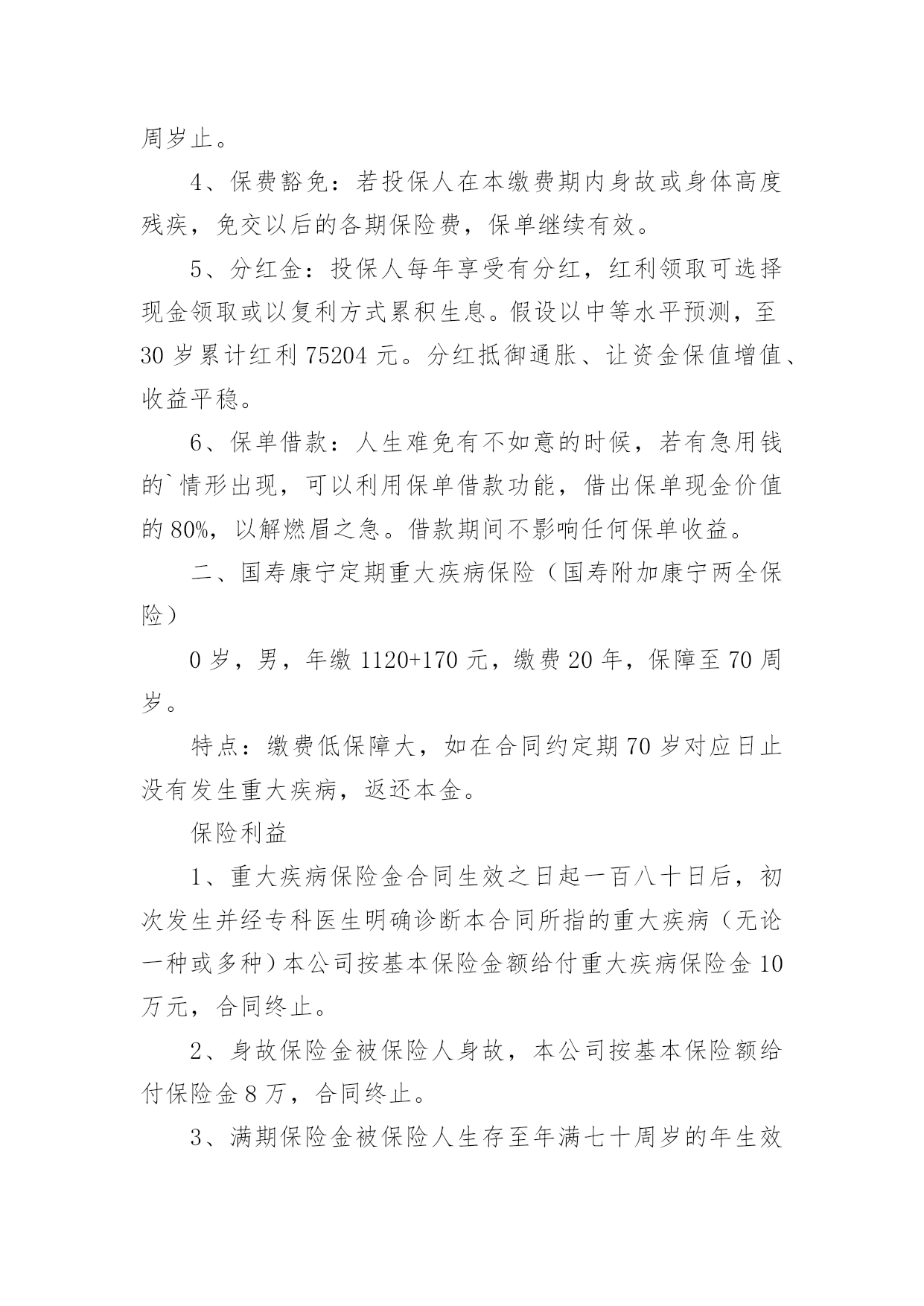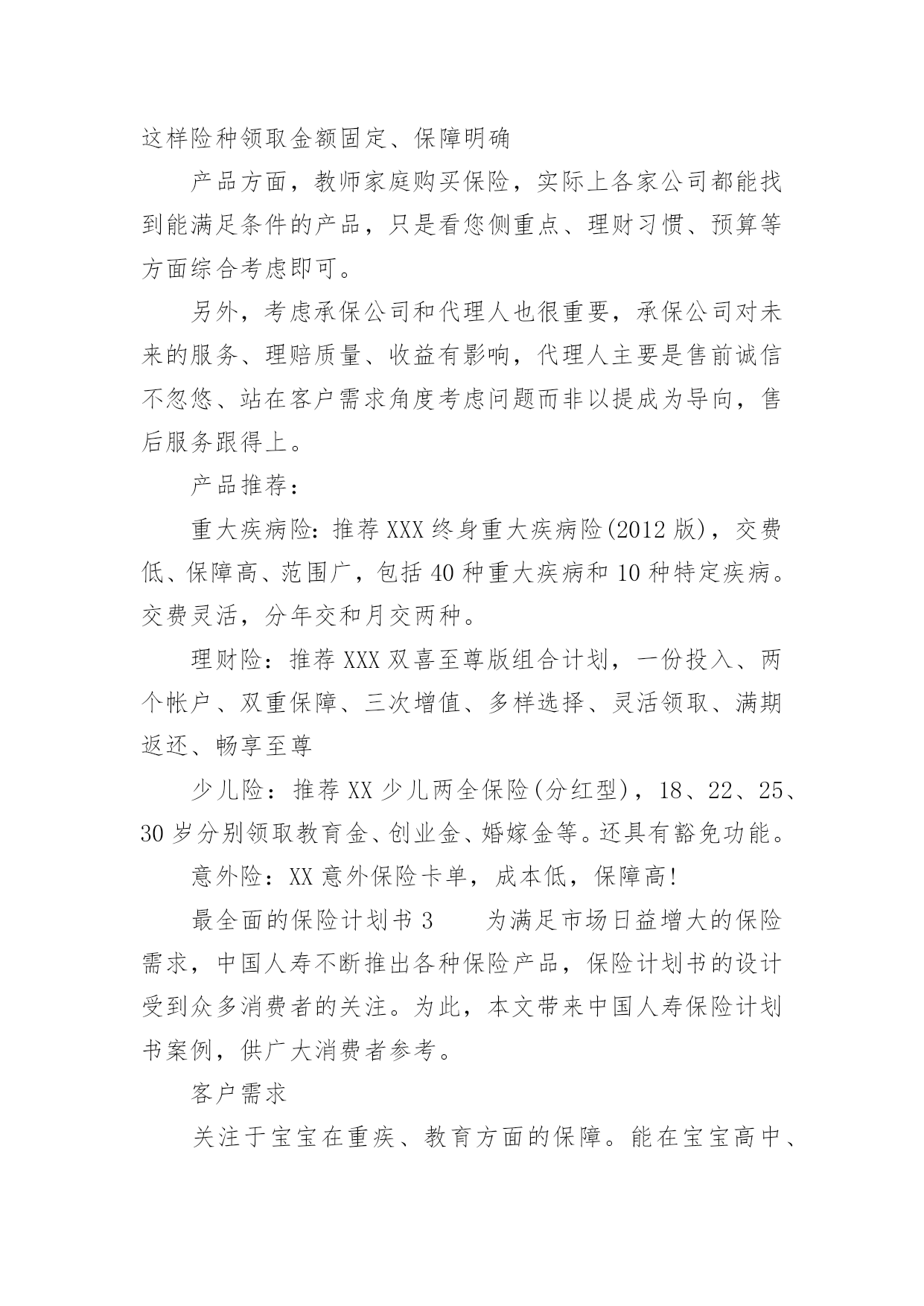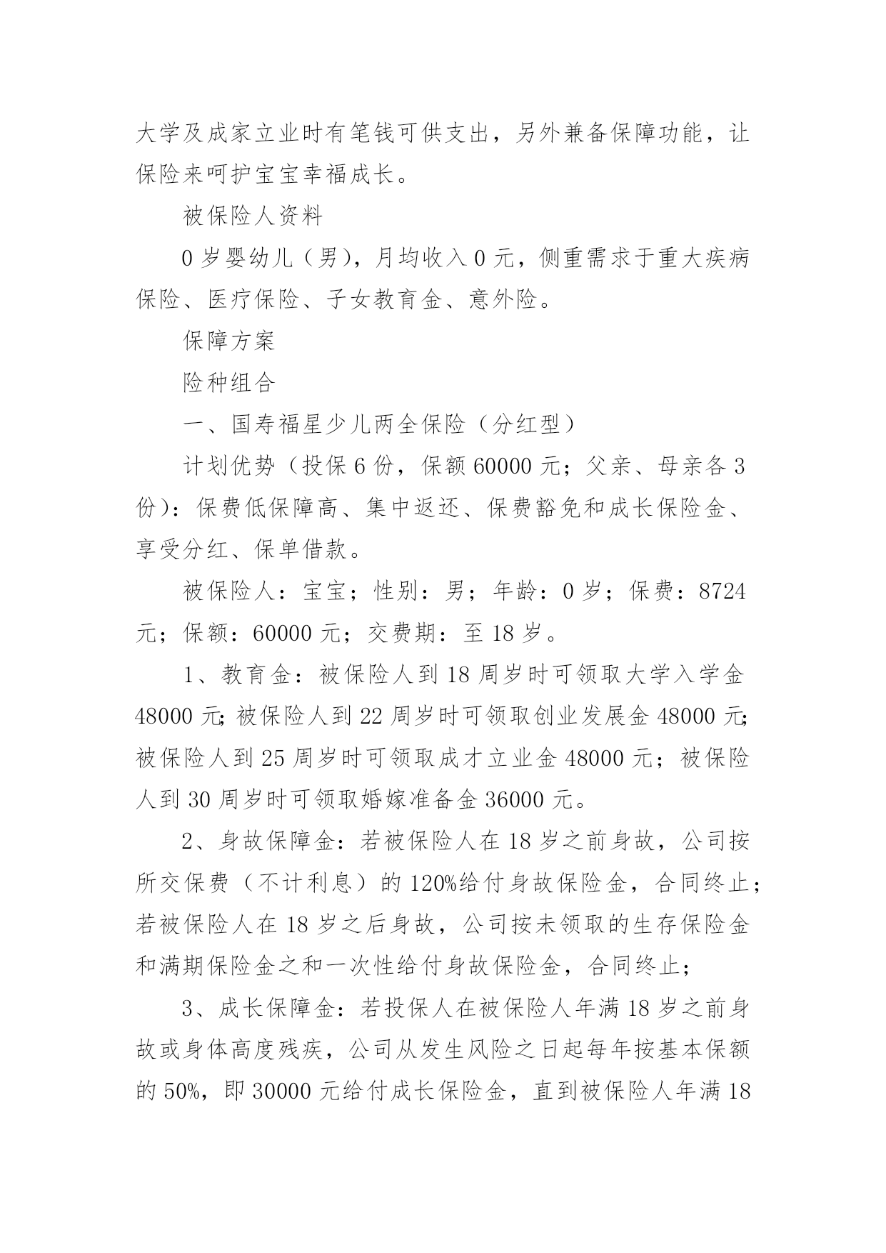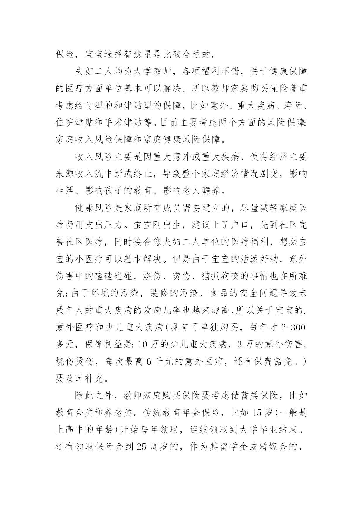最全面的保险计划书最全面的保险计划书(精选5篇)时间的脚步是无声的,它在不经意间流逝,又迎来了一个全新的起点,此时此刻我们需要开始制定一个计划。好的计划都具备一些什么特点呢?以下是小编收集整理的最全面的保险计划书(精选5篇),希望对大家有所帮助。最全面的保险计划书1一、家庭背景本人叫崔明明,23岁,在校大学生,父母务农身体健康,毕业以后有希望在证券公司工作,而且经常出差,月收入如3000元,有五险一金。二、第一阶段保险(25岁—30岁)本人工作稳定,而且收入有增长的可能,适合购买定期寿险,根据现在的收入3000元,购买保额在10—15万的保险(费用为每月400—600。不超过月收入的15%)应该可以承担。同时根据本人的工作性质,因为外出较多,所以很有必要购买一定量的'意外伤害险。建议10—20万,每年200左右。三、第二阶段保险(30岁—35岁)此时的我已经结婚,月收入增长到了6000元,有车有房,且房子地处繁华地段,妻子月收入5000,已经买了定期寿险。由于各方面的原因,目前家庭中存在的安全隐患颇多,所以,对我来说,买份家庭财产保险是十分必要的。购买保额在50万—80万的保险,费用每年1万—1。5万。因为我家在繁华地带,所以附近交通事故频繁发生,因为偶然事件导致汽车损坏的机率很大,所以买汽车保险很有必要。四、第三阶段保险(35—45岁)此时我的家庭加入了一个新成员——孩子,为孩子买保险成了最主要的投资。这个年龄段为孩子的保险投资较多。我主要想买教育基金,因为教育基金的投资为孩子未来受教育作资金积累。此时的孩子正处于好动的年龄,所以风险很大,又因为我家处于高风险地带,所以孩子的医疗意外伤害险很有必要。每年保费400元左右。最全面的保险计划书2案例情况:基本情况:夫妻双方均是大学老师,家庭年收入15万,有公费医疗,有房车,无贷,宝宝刚出生。保险需求:想侧重重疾和意外保险。请问一家三口如何投保?有什么好产品推荐?保险方案:夫妻选择平安的智胜人生终身寿险(万能型)附加重大疾病提前给付和平安附加意外伤害保险,宝宝选择智慧星是否合适?专家建议:首先,教师家庭购买保险,夫妻选择平安的智胜人生终身寿险(万能型)附加重大疾病提前给付和平安附加意外伤害保险,宝宝选择智慧星是比较合适的。夫妇二人均为大学教师,各项福利不错,关于健康保障的医疗方面单位基本可以解决。所以教师家庭购买保险着重考虑给付型的和津贴型的保障,比如意外、重大疾病、寿险、住院津贴和手术津贴等。目前主要考虑两个方面的风险保障:家庭收入风险保障和家庭健康风险保障。收入风险主要是因重大意外或重大疾病,使得经济主要来源收入流中断或终止,导致整个家庭经济情况剧变,影响生活、影响孩子的教育、影响老人赡养。健康风险是家庭所有成员需要建立的,尽量减轻家庭医疗费用支出压力。宝宝刚出生,建议上了户口,先到社区完善社区医疗,同时接合您夫妇二人单位的医疗福利,想必宝宝的小医疗可以基本解决。但是由于宝宝的活泼好动,意外伤害中的磕磕碰碰,烧伤、烫伤、猫抓狗咬的事情也在所难免;由于环境的污染,装修的污染、食品的安全问题导致未成年人的重大疾病的发病几率也越来越高,所以关于宝宝的.意外医疗和少儿重大疾病(现有可单独购买,每年才2-300多元,保障利益是:10万的少儿重大疾病,3万的意外伤害、烧伤烫伤,每次最高6千元的意外医疗,还有保费豁免。)要及时补充。除此之外,教师家庭购买保险要考虑储蓄类保险,比如教育金类和养老类。传统教育年金保险,比如15岁(一般是上高中的年龄)开始每年领取,连续领取到大学毕业结束。还有领取保险金到25周岁的,作为其留学金或婚嫁金的,这样险种领取金额固定、保障明确产品方面,教师家庭购买保险,实际上各家公司都能找到能满足条件的产品,只是看您侧重点、理财习惯、预算等方面综合考虑即可。另外,考虑承保公司和代理人也很重要,承保公司对未来的服务、理赔质量、收益有影响,代理人主要是售前诚信不忽悠、站在客户需求角度考虑问题而非以提成为导向,售后服务跟得上。产品推荐:重大疾病险:推荐XXX终身重大疾病险(2012版),交费低、保障高、范围广,包括40种重大疾病和10种特定疾病。交费灵活,分年交和月交两种。理财险:推荐XXX双喜至尊版组合计划,一份投入、两个帐户、双重保障、三次增值、多样选择、灵活领取、满期返还、畅享至尊少儿险:推荐XX少儿两全保险(分红型),18、22、25、30岁分别领取教育金、创业金、婚嫁金等。还具有豁免功能。意外险:XX意外保险卡单,成本低,保障高!最全面的保险计划书3为满足市场日益增大的保险需求,中国人寿不断推出各种保险产品,保险计划书的设计受到众多消费者的关注。为此,本文带来中国人寿保险计划书案例,供广大消费者参考。客户需求关注于宝宝在重疾、教育方面的保障。能在宝宝高中、大学及