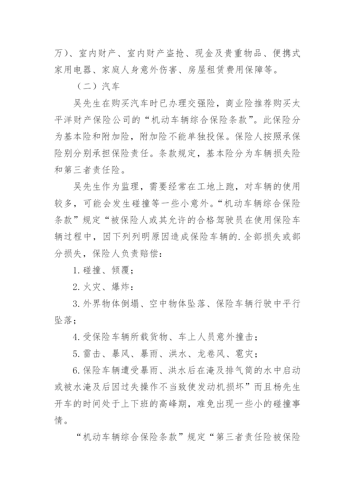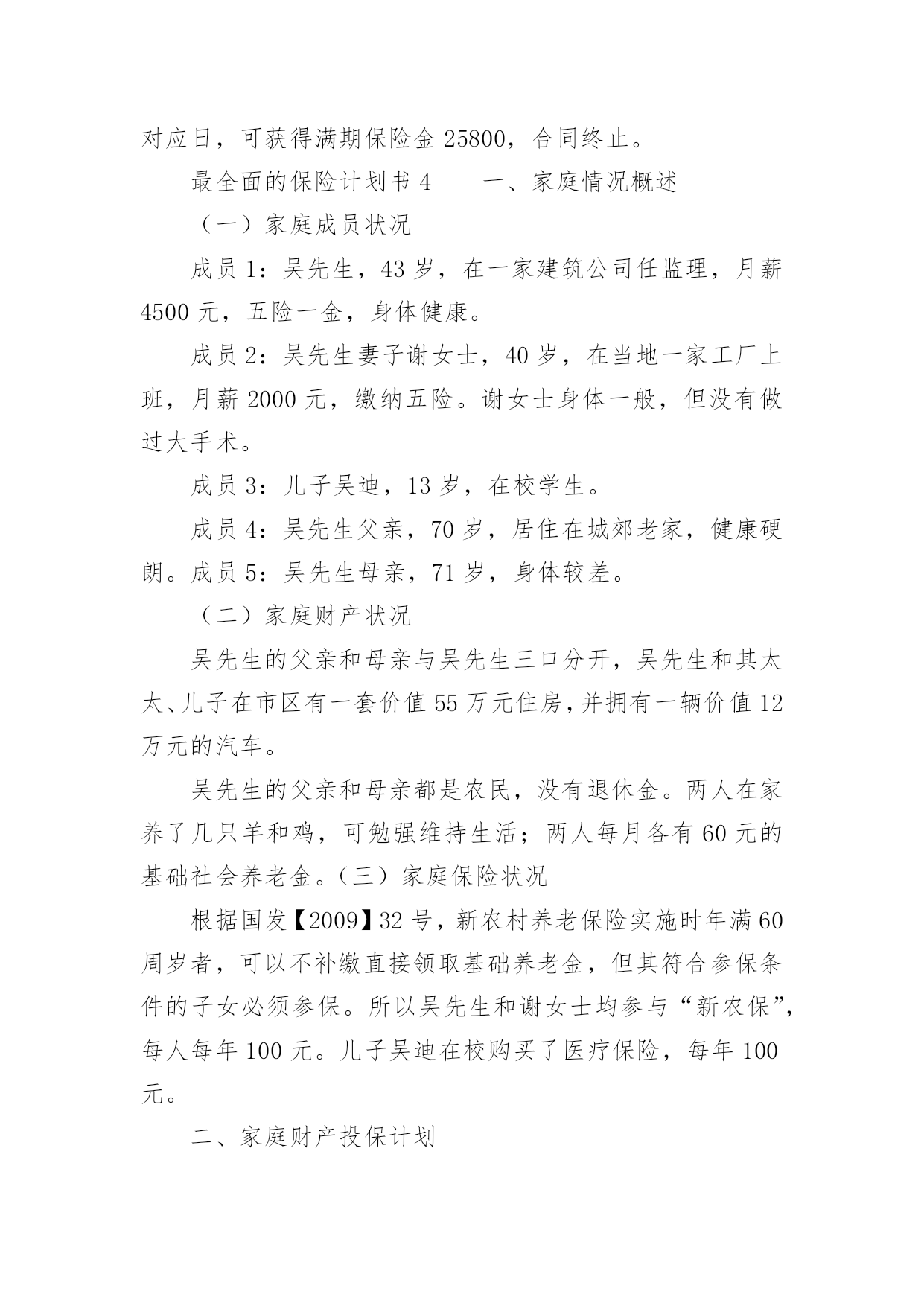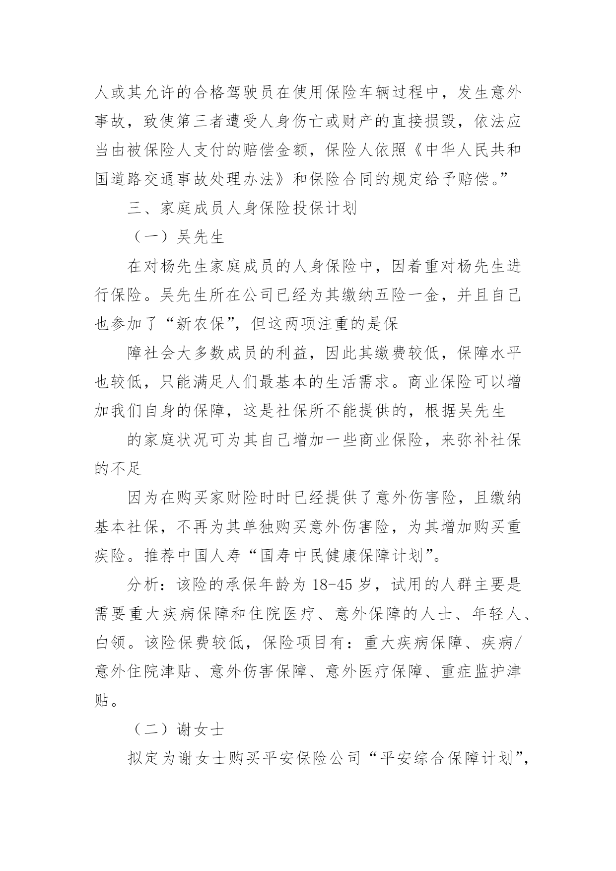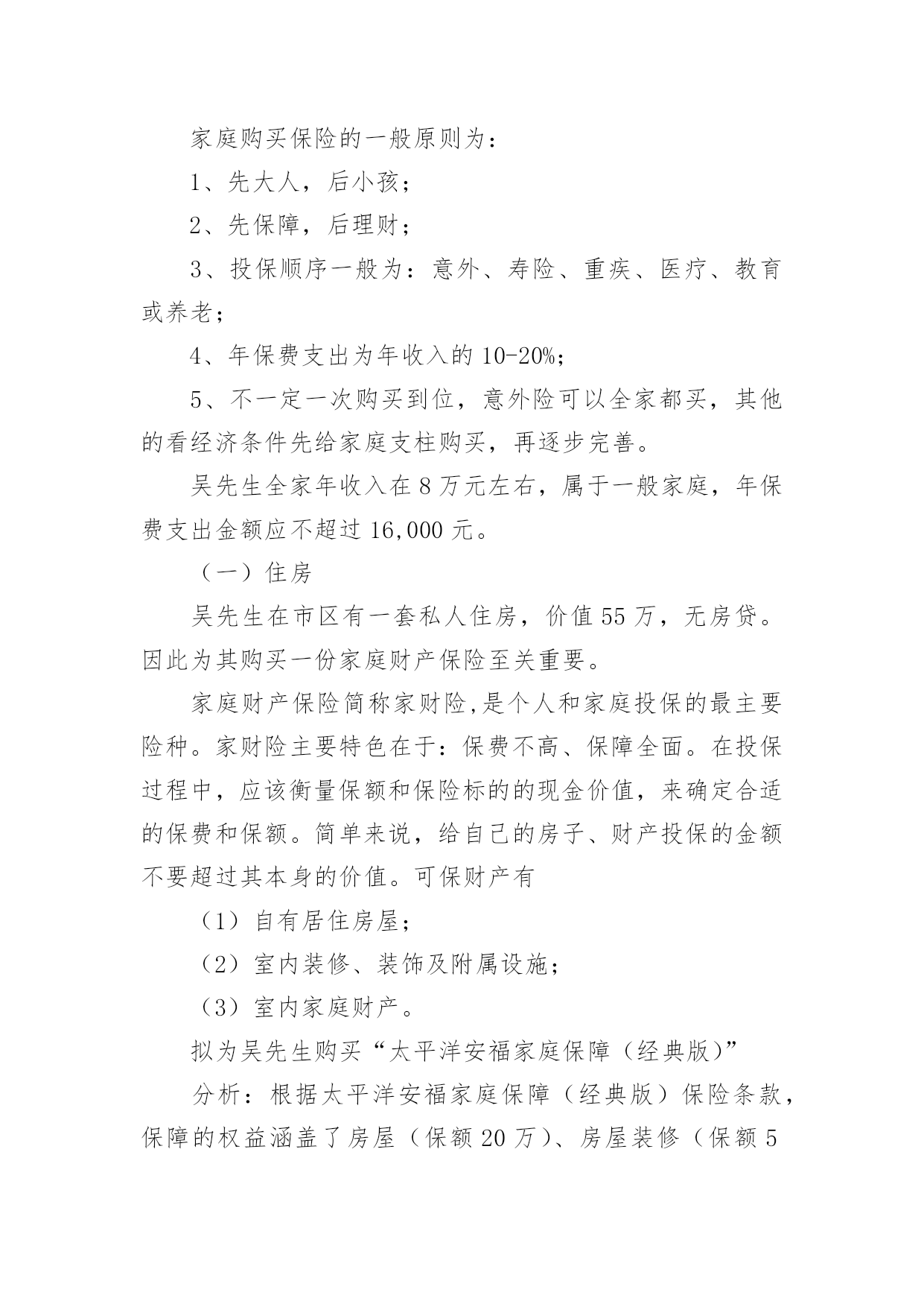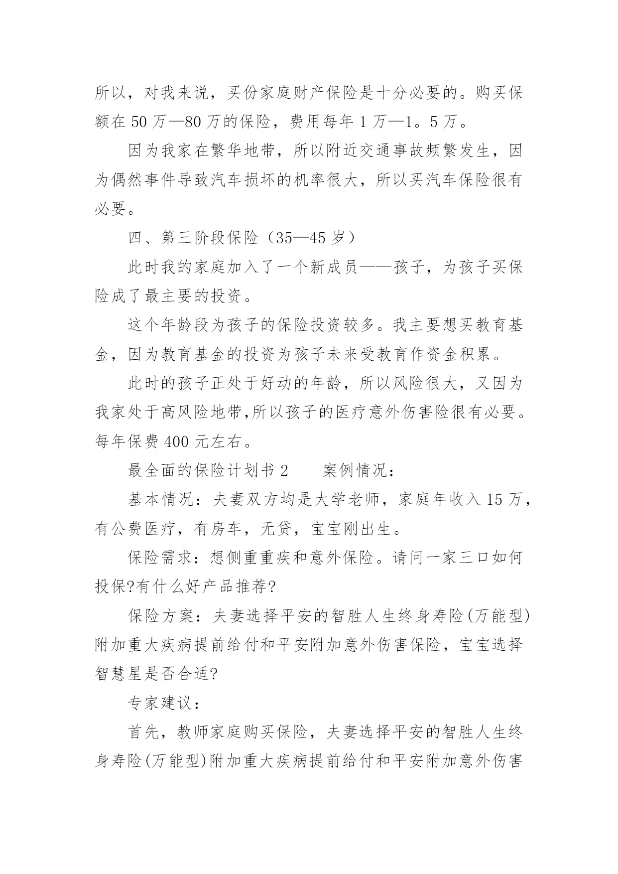 最全面的保险计划书最全面的保险计划书(精选5篇)时间的脚步是无声的,它在不经意间流逝,又迎来了一个全新的起点,此时此刻我们需要开始制定一个计划。好的计划都具备一些什么特点呢?以下是小编收集整理的最全面的保险计划书(精选5篇),希望对大家有所帮助。最全面的保险计划书1一、家庭背景本人叫崔明明,23岁,在校大学生,父母务农身体健康,毕业以后有希望在证券公司工作,而且经常出差,月收入如3000元,有五险一金。二、第一阶段保险(25岁—30岁)本人工作稳定,而且收入有增长的可能,适合购买定期寿险,根据现在的收入3000元,购买保额在10—15万的保险(费用为每月400—600。不超过月收入的15%)应该可以承担。同时根据本人的工作性质,因为外出较多,所以很有必要购买一定量的'意外伤害险。建议10—20万,每年200左右。三、第二阶段保险(30岁—35岁)此时的我已经结婚,月收入增长到了6000元,有车有房,且房子地处繁华地段,妻子月收入5000,已经买了定期寿险。由于各方面的原因,目前家庭中存在的安全隐患颇多,所以,对我来说,买份家庭财产保险是十分必要的。购买保额在50万—80万的保险,费用每年1万—1。5万。因为我家在繁华地带,所以附近交通事故频繁发生,因为偶然事件导致汽车损坏的机率很大,所以买汽车保险很有必要。四、第三阶段保险(35—45岁)此时我的家庭加入了一个新成员——孩子,为孩子买保险成了最主要的投资。这个年龄段为孩子的保险投资较多。我主要想买教育基金,因为教育基金的投资为孩子未来受教育作资金积累。此时的孩子正处于好动的年龄,所以风险很大,又因为我家处于高风险地带,所以孩子的医疗意外伤害险很有必要。每年保费400元左右。最全面的保险计划书2案例情况:基本情况:夫妻双方均是大学老师,家庭年收入15万,有公费医疗,有房车,无贷,宝宝刚出生。保险需求:想侧重重疾和意外保险。请问一家三口如何投保?有什么好产品推荐?保险方案:夫妻选择平安的智胜人生终身寿险(万能型)附加重大疾病提前给付和平安附加意外伤害保险,宝宝选择智慧星是否合适?专家建议:首先,教师家庭购买保险,夫妻选择平安的智胜人生终身寿险(万能型)附加重大疾病提前给付和平安附加意外伤害保险,宝宝选择智慧星是比较合适的。夫妇二人均为大学教师,各项福利不错,关于健康保障的医疗方面单位基本可以解决。所以教师家庭购买保险着重考虑给付型的和津贴型的保障,比如意外、重大疾病、寿险、住院津贴和手术津贴等。目前主要考虑两个方面的风险保障:家庭收入风险保障和家庭健康风险保障。收入风险主要是因重大意外或重大疾病,使得经济主要来源收入流中断或终止,导致整个家庭经济情况剧变,影响生活、影响孩子的教育、影响老人赡养。健康风险是家庭所有成员需要建立的,尽量减轻家庭医疗费用支出压力。宝宝刚出生,建议上了户口,先到社区完善社区医疗,同时接合您夫妇二人单位的医疗福利,想必宝宝的小医疗可以基本解决。但是由于宝宝的活泼好动,意外伤害中的磕磕碰碰,烧伤、烫伤、猫抓狗咬的事情也在所难免;由于环境的污染,装修的污染、食品的安全问题导致未成年人的重大疾病的发病几率也越来越高,所以关于宝宝的.意外医疗和少儿重大疾病(现有可单独购买,每年才2-300多元,保障利益是:10万的少儿重大疾病,3万的意外伤害、烧伤烫伤,每次最高6千元的意外医疗,还有保费豁免。)要及时补充。除此之外,教师家庭购买保险要考虑储蓄类保险,比如教育金类和养老类。传统教育年金保险,比如15岁(一般是上高中的年龄)开始每年领取,连续领取到大学毕业结束。还有领取保险金到25周岁的,作为其留学金或婚嫁金的,这样险种领取金额固定、保障明确产品方面,教师家庭购买保险,实际上各家公司都能找到能满足条件的产品,只是看您侧重点、理财习惯、预算等方面综合考虑即可。另外,考虑承保公司和代理人也很重要,承保公司对未来的服务、理赔质量、收益有影响,代理人主要是售前诚信不忽悠、站在客户需求角度考虑问题而非以提成为导向,售后服务跟得上。产品推荐:重大疾病险:推荐XXX终身重大疾病险(2012版),交费低、保障高、范围广,包括40种重大疾病和10种特定疾病。交费灵活,分年交和月交两种。理财险:推荐XXX双喜至尊版组合计划,一份投入、两个帐户、双重保障、三次增值、多样选择、灵活领取、满期返还、畅享至尊少儿险:推荐XX少儿两全保险(分红型),18、22、25、30岁分别领取教育金、创业金、婚嫁金等。还具有豁免功能。意外险:XX意外保险卡单,成本低,保障高!最全面的保险计划书3为满足市场日益增大的保险需求,中国人寿不断推出各种保险产品,保险计划书的设计受到众多消费者的关注。为此,本文带来中国人寿保险计划书案例,供广大消费者参考。客户需求关注于宝宝在重疾、教育方面的保障。能在宝宝高中、大学及