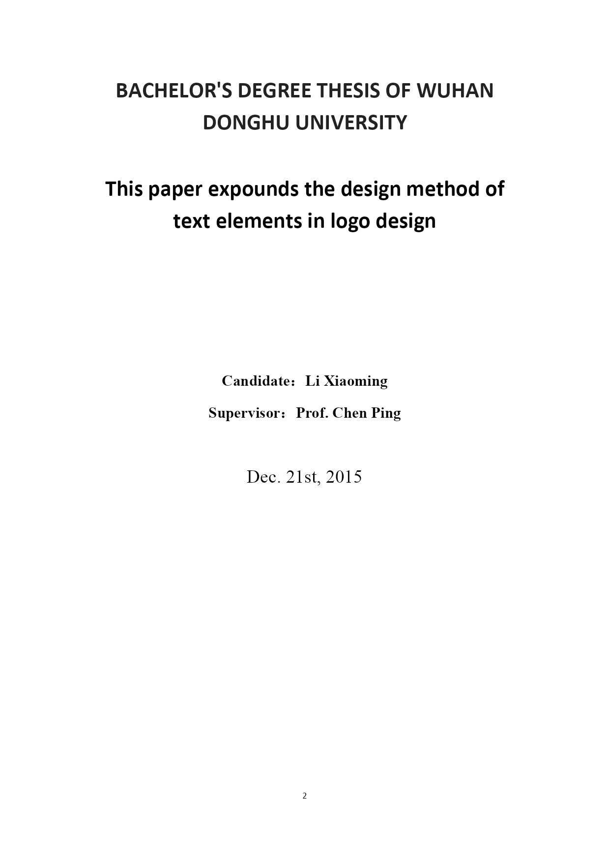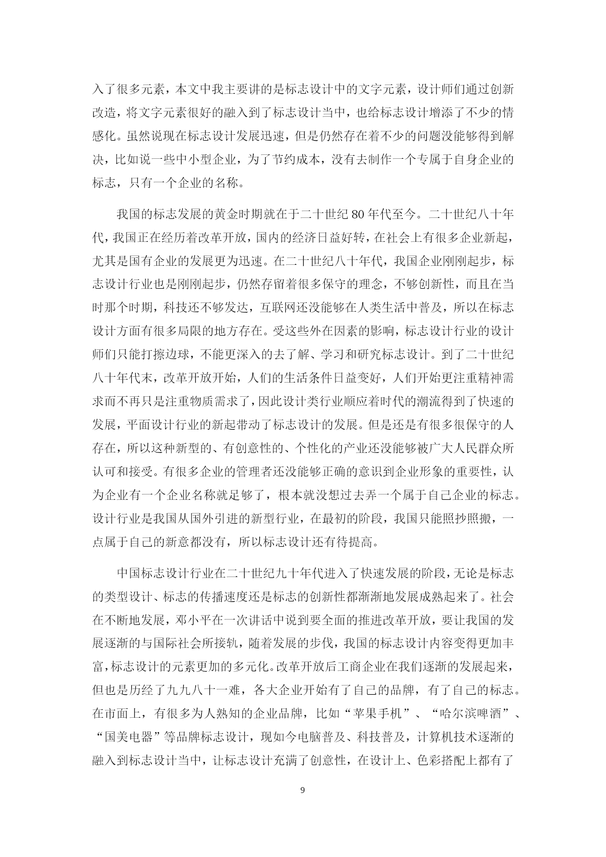 PAGE\*MERGEFORMAT22学号:2014040031005年级:2014级本科生毕业论文(设计)阐述标志设计中文字元素设计方法院系名称:文法学院专业名称:广告学学生姓名:周耀忠指导教师:白玉洁/讲师年月日BACHELOR'SDEGREETHESISOFWUHANDONGHUUNIVERSITYThispaperexpoundsthedesignmethodoftextelementsinlogodesignCandidate:LiXiaomingSupervisor:Prof.ChenPingDec.21st,2015郑重声明本人郑重声明:所呈交的论文是本人在导师的指导下独立进行研究所取得的研究成果。除了文中特别加以标注引用的内容外,本论文不包含任何其他个人或集体已经发表或撰写的成果作品。对本文的研究做出重要贡献的个人和集体,均已在文中以明确方式标明。本人完全意识到本声明的法律后果由本人承担。论文作者签名:日期:年月日阐述标志设计中文字元素设计方法摘要在远古时期,文字还没有出现在社会当中,当时的人类是愚昧一代的人类,他们的生活非常的原始化,非常的落后。随着时代的进步和人类的进化,文明逐渐出现在人类生活当中,文字的出现证实了这一切,文字的出现让人类从愚昧进化到了文明时代,因此文字是人类的进化史中的一个里程碑,在人类进化史中起着越来越重要的作用。世界上有几大文明古国,中国也是其中一个,汉字也是所有文明古国文字中唯一一种作用于当代社会的文字。中国的汉字经历了数千年的演变过程,从最开始的抽象文字逐渐的具体化,最终演变成了当代的汉字,现代汉字集表音、表形、表意于一体,汉字的书写经历过好几个阶段的发展,最开始人们是在陶器上刻字绘字,接着是在甲骨上书写汉字,随着青铜器的发展,人们开始在青铜器上刻字,到了朝代时期人们开始用竹简写字,等到纸发明问世后,人们开始在纸上写字,最终到活字印刷术的阶段。在这些阶段的发展过程当中,文字的使用带动了青铜器、印刷术、书法艺术等行业的繁荣发展。汉字不仅仅只是在中国盛行,还影响到了中国周边的一些国家和地区,比如日本、韩国和东南亚地区,想必大家现在看日本文字的时候都可以看到汉字的影子吧。本文我立足于对中国传统文化的传承弘扬,分析和研究文字和标志的发展历史,选取从中国传统文化的汉字方面作为切入点,分析汉字的特征,研究标志设计的发展趋势,并从网上查阅相关资料,收集与标志设计和文字元素相关的案例,分析他们的创意和设计方法,简单的阐述标志设计中的文字元素的作用。关键词:文字元素;标志设计;创意性ThispaperexpoundsthedesignmethodoftextelementsinlogodesignAbstractInancienttimes,thewritingwasnotinthesociety,whenthehumanbeingwasastupidgenerationofpeople,theirlifewasveryprimitive,verybackward.Alongwiththeprogressoftheeraandtheevolutionofthehumancivilizationgraduallyappearinhumanlife,theemergenceoftextconfirmedthat,theemergenceofthetexttoevolvefromignorancetocivilizationera,sothetextisamilestoneinthehistoryoftheevolutionofhuman,isplayingamoreandmoreimportantroleinhumanevolution.Thereareseveralancientcivilizationsintheworld,andChinaisoneofthem,andtheChinesecharacteristheonlyonethatplaysaroleinthecontemporarysociety.Chinesecharactershasexperiencedthousandsofyearsofevolution,fromthebeginningoftheembodimentofabstractwordsgradually,eventuallyevolvedintomodernChinese,modernChinesecharactersettablesound,tableform,meaningasawhole,thedevelop