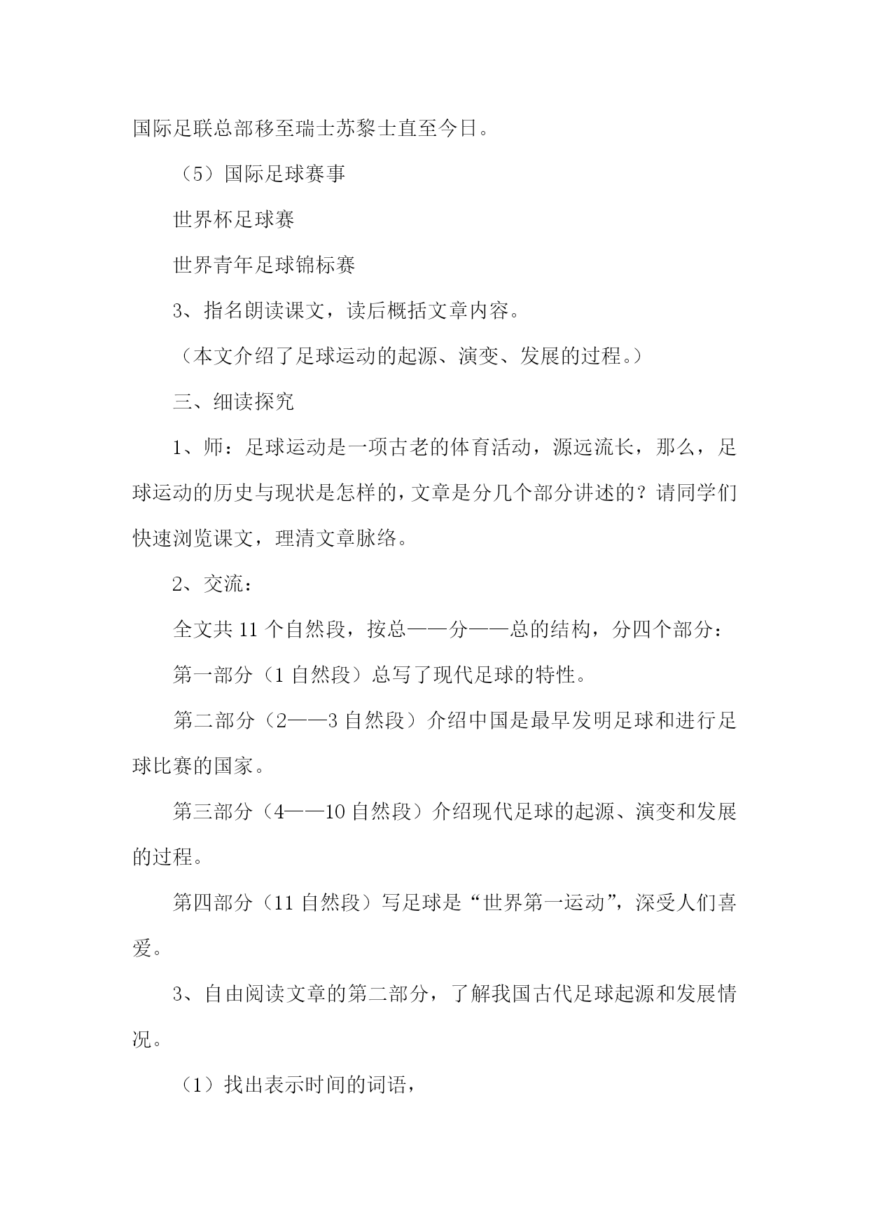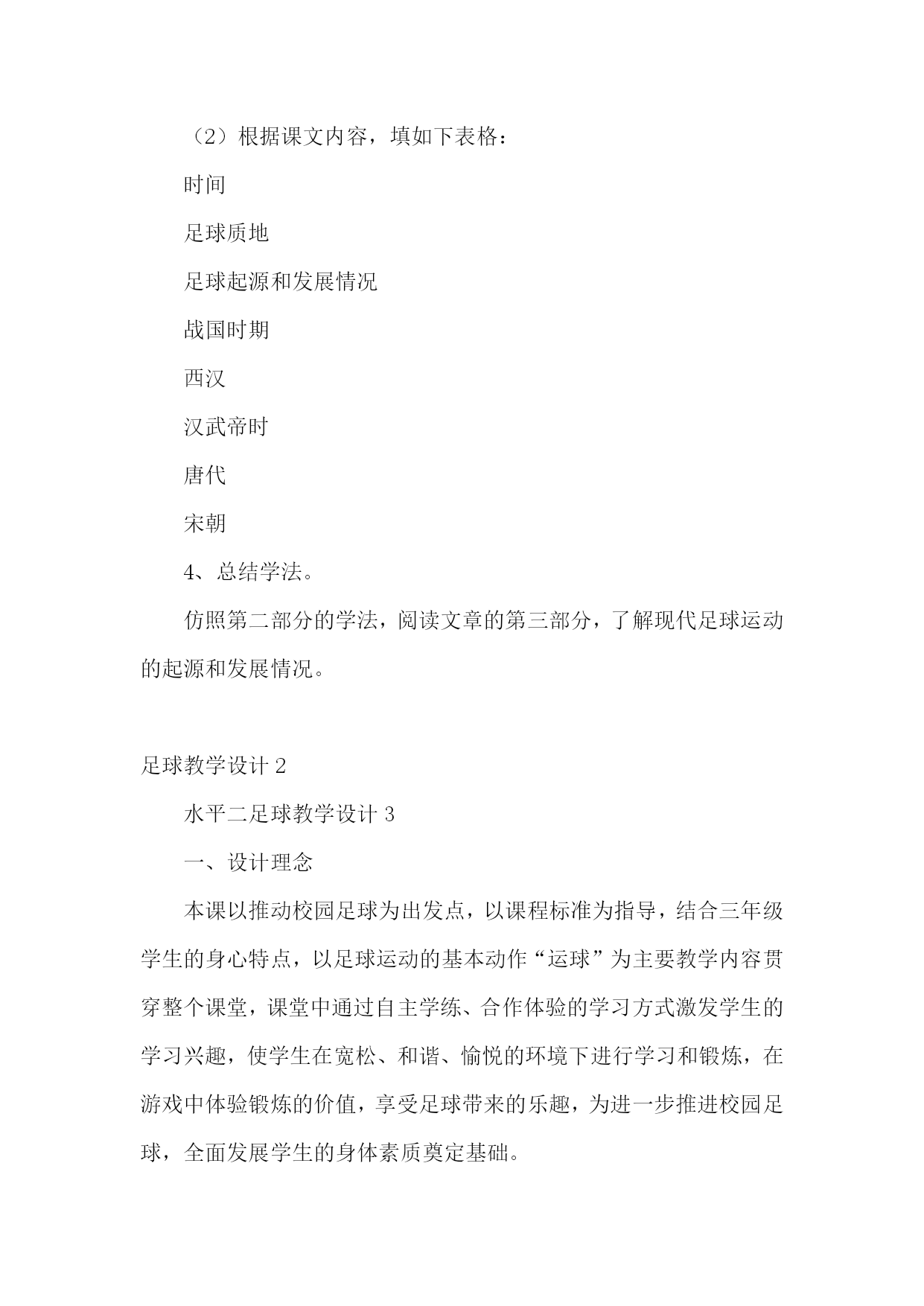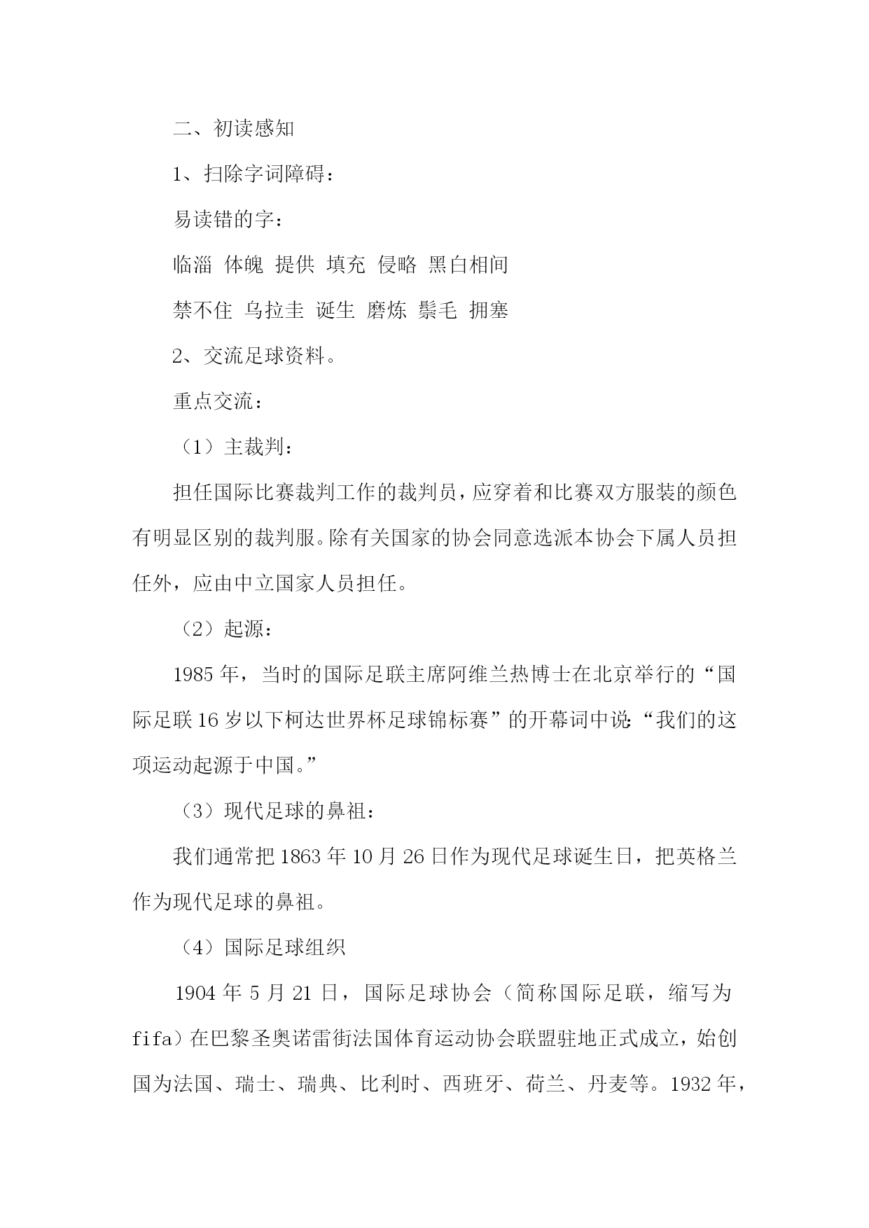 足球教学设计足球教学设计1教学目标1、丰富知识,开阔视野,增加文化底蕴,引领学生去思考足球精神的魅力。2、把握足球发展的脉络;培养学生独立阅读能力。3、理解与发扬“友谊、团结、参与、公平竞争”的奥运精神。教学重点抓住表示时间的词,把握足球发展的脉络。教学难点引领学生理解为什么中国最早发明足球而英国却是现代足球运动的起源国家。教学准备通过互联网或书刊、报纸、杂志等搜集与足球有关的资料。教学时间:一课时教学过程一、激情导入师:人类能够战胜大自然,靠的是一种不可缺少的精神,那就是——协作,持之以恒。而把这种精神体现得最淋漓尽致的运动,就是被称为“世界第一运动”的足球运动。这项运动,古往今来令无数人痴迷和兴奋,今天我们就来学习《足球史话》,领略足球精神的魅力。二、初读感知1、扫除字词障碍:易读错的字:临淄体魄提供填充侵略黑白相间禁不住乌拉圭诞生磨炼鬃毛拥塞2、交流足球资料。重点交流:(1)主裁判:担任国际比赛裁判工作的裁判员,应穿着和比赛双方服装的颜色有明显区别的裁判服。除有关国家的协会同意选派本协会下属人员担任外,应由中立国家人员担任。(2)起源:1985年,当时的国际足联主席阿维兰热博士在北京举行的“国际足联16岁以下柯达世界杯足球锦标赛”的开幕词中说:“我们的这项运动起源于中国。”(3)现代足球的鼻祖:我们通常把1863年10月26日作为现代足球诞生日,把英格兰作为现代足球的鼻祖。(4)国际足球组织1904年5月21日,国际足球协会(简称国际足联,缩写为fifa)在巴黎圣奥诺雷街法国体育运动协会联盟驻地正式成立,始创国为法国、瑞士、瑞典、比利时、西班牙、荷兰、丹麦等。1932年,国际足联总部移至瑞士苏黎士直至今日。(5)国际足球赛事世界杯足球赛世界青年足球锦标赛3、指名朗读课文,读后概括文章内容。(本文介绍了足球运动的起源、演变、发展的过程。)三、细读探究1、师:足球运动是一项古老的体育活动,源远流长,那么,足球运动的历史与现状是怎样的,文章是分几个部分讲述的?请同学们快速浏览课文,理清文章脉络。2、交流:全文共11个自然段,按总——分——总的结构,分四个部分:第一部分(1自然段)总写了现代足球的特性。第二部分(2——3自然段)介绍中国是最早发明足球和进行足球比赛的国家。第三部分(4——10自然段)介绍现代足球的起源、演变和发展的过程。第四部分(11自然段)写足球是“世界第一运动”,深受人们喜爱。3、自由阅读文章的第二部分,了解我国古代足球起源和发展情况。(1)找出表示时间的词语,(2)根据课文内容,填如下表格:时间足球质地足球起源和发展情况战国时期西汉汉武帝时唐代宋朝4、总结学法。仿照第二部分的学法,阅读文章的第三部分,了解现代足球运动的起源和发展情况。足球教学设计2水平二足球教学设计3一、设计理念本课以推动校园足球为出发点,以课程标准为指导,结合三年级学生的身心特点,以足球运动的基本动作“运球”为主要教学内容贯穿整个课堂,课堂中通过自主学练、合作体验的学习方式激发学生的学习兴趣,使学生在宽松、和谐、愉悦的环境下进行学习和锻炼,在游戏中体验锻炼的价值,享受足球带来的乐趣,为进一步推进校园足球,全面发展学生的身体素质奠定基础。二、教学内容小足球——运球三、教学重难点教学重点:提腿屈膝的运球方法。教学难点:运球中对球的控制力四、教材分析本课选自新版江苏省小学体育教师备课用书《科学的预设、艺术的生成》水平二小足球与游戏单元的第二课时:运球。小学阶段的足球教学,有技术的教学,但并不苛求技术的细节,主要强调突出“游戏”二字。本课运球活动,有一定的难度,课上通过设计不同难度的练习方法和游戏来激发学生参与活动的积极性和主动性,从而达到掌握相关的技术动作及控制球的能力,为下阶段的学习打下基础。五、学情分析我所授课的班级是三年级学生,有集体荣誉感,特别喜欢上体育课,更喜欢上足球课。由于刚刚接触足球,对足球没有基础,容易出现很多问题,需要教师不断的变化教学方法,来引导学生在该阶段实施足球的教学,让学生体验脚运球的基本动作。六、教学方法及手段本课主要采用的教法:讲解与示范、游戏与比赛、评价学习法。学生主要采用的学法:体验法和自主学练法。学生在教师设计的教学形式下,由简到难,在难度递进中反复体验,巩固提高。七、教学目标1.让学生知道脚运球的方法,体验运球的乐趣。2.能做出正确的用脚运球的动作,提高运球时对足球的控制能力。3.提高学生的协调平衡能力,培养学生的团队合作能力。八、教学过程与教学资源设计:上课地点足操场授课教师王晶金年级三年级课型第二课时班级人数40时间40教学内容小足球--运球运球大赛教学目标1.让学生知道脚运球的方法,体验运球的乐趣。2.能做出正确的用脚运球的动作,提高运球时对足球的控制能力。3.提高学生的协调平衡能力,培养学生的团队