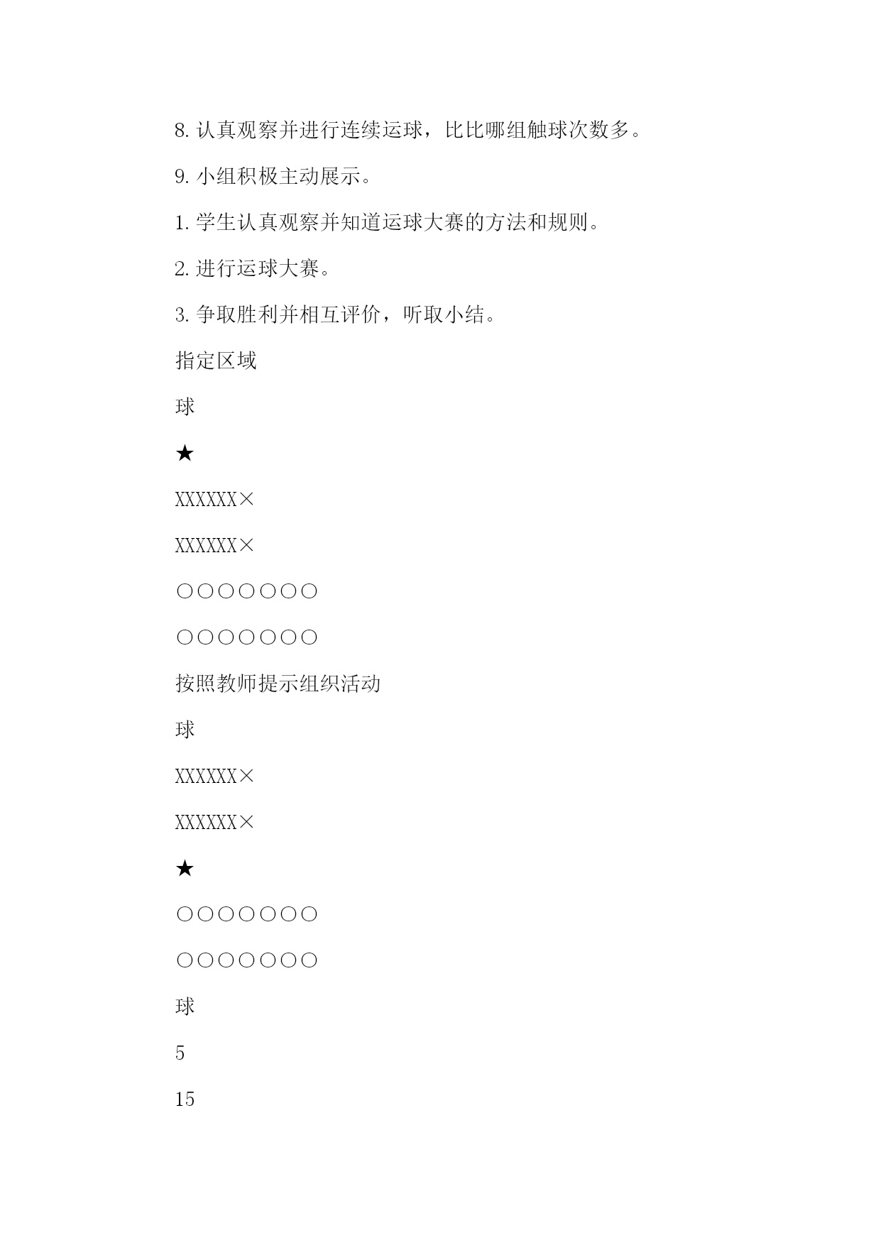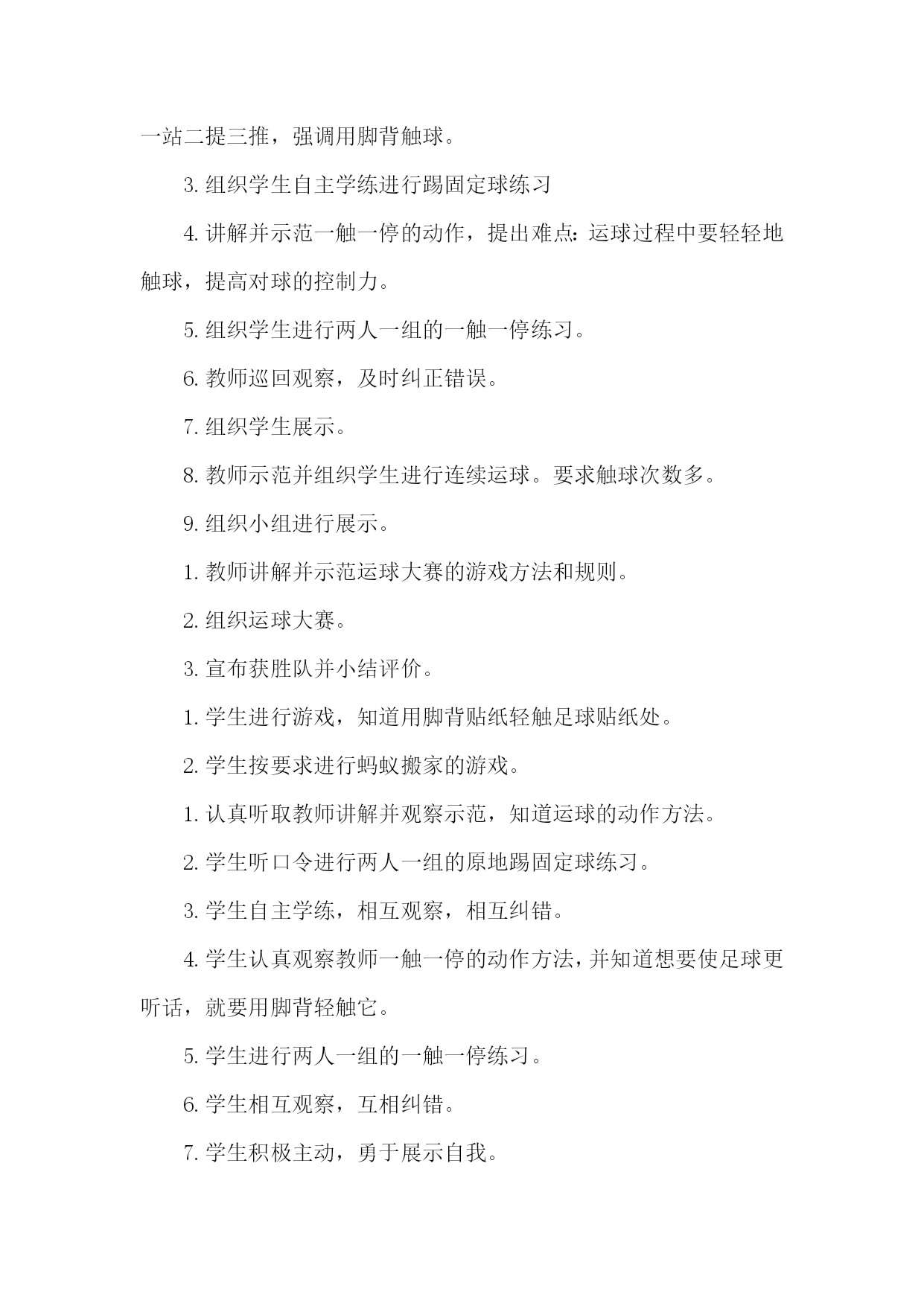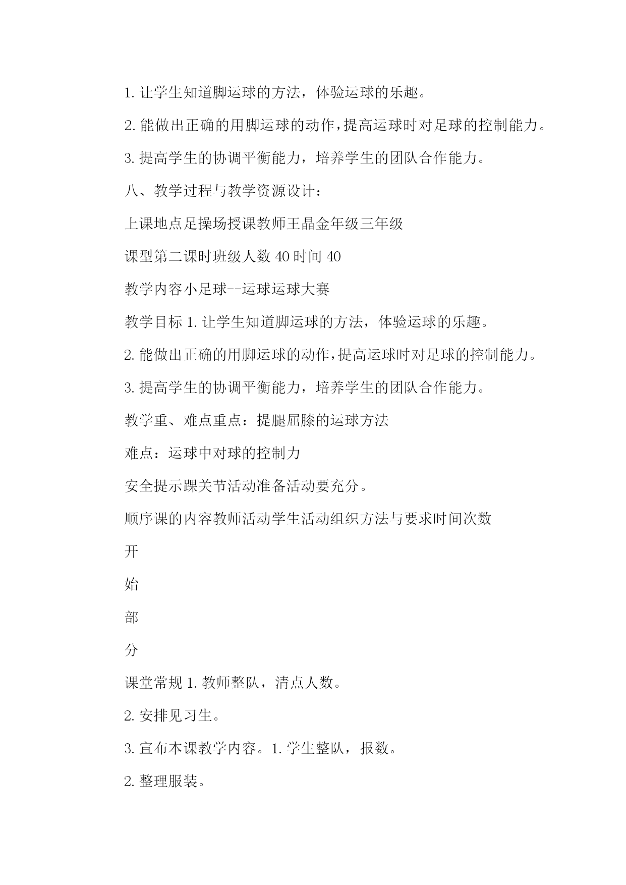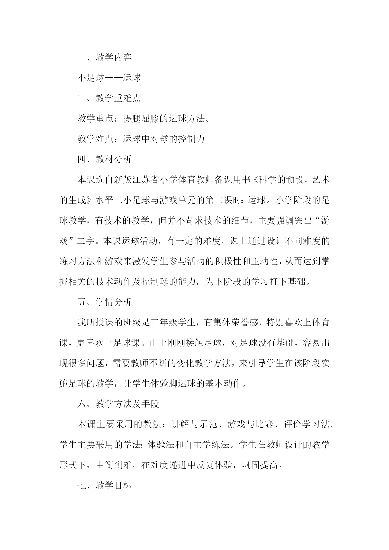 足球教学设计足球教学设计1教学目标1、丰富知识,开阔视野,增加文化底蕴,引领学生去思考足球精神的魅力。2、把握足球发展的脉络;培养学生独立阅读能力。3、理解与发扬“友谊、团结、参与、公平竞争”的奥运精神。教学重点抓住表示时间的词,把握足球发展的脉络。教学难点引领学生理解为什么中国最早发明足球而英国却是现代足球运动的起源国家。教学准备通过互联网或书刊、报纸、杂志等搜集与足球有关的资料。教学时间:一课时教学过程一、激情导入师:人类能够战胜大自然,靠的是一种不可缺少的精神,那就是——协作,持之以恒。而把这种精神体现得最淋漓尽致的运动,就是被称为“世界第一运动”的足球运动。这项运动,古往今来令无数人痴迷和兴奋,今天我们就来学习《足球史话》,领略足球精神的魅力。二、初读感知1、扫除字词障碍:易读错的字:临淄体魄提供填充侵略黑白相间禁不住乌拉圭诞生磨炼鬃毛拥塞2、交流足球资料。重点交流:(1)主裁判:担任国际比赛裁判工作的裁判员,应穿着和比赛双方服装的颜色有明显区别的裁判服。除有关国家的协会同意选派本协会下属人员担任外,应由中立国家人员担任。(2)起源:1985年,当时的国际足联主席阿维兰热博士在北京举行的“国际足联16岁以下柯达世界杯足球锦标赛”的开幕词中说:“我们的这项运动起源于中国。”(3)现代足球的鼻祖:我们通常把1863年10月26日作为现代足球诞生日,把英格兰作为现代足球的鼻祖。(4)国际足球组织1904年5月21日,国际足球协会(简称国际足联,缩写为fifa)在巴黎圣奥诺雷街法国体育运动协会联盟驻地正式成立,始创国为法国、瑞士、瑞典、比利时、西班牙、荷兰、丹麦等。1932年,国际足联总部移至瑞士苏黎士直至今日。(5)国际足球赛事世界杯足球赛世界青年足球锦标赛3、指名朗读课文,读后概括文章内容。(本文介绍了足球运动的起源、演变、发展的过程。)三、细读探究1、师:足球运动是一项古老的体育活动,源远流长,那么,足球运动的历史与现状是怎样的,文章是分几个部分讲述的?请同学们快速浏览课文,理清文章脉络。2、交流:全文共11个自然段,按总——分——总的结构,分四个部分:第一部分(1自然段)总写了现代足球的特性。第二部分(2——3自然段)介绍中国是最早发明足球和进行足球比赛的国家。第三部分(4——10自然段)介绍现代足球的起源、演变和发展的过程。第四部分(11自然段)写足球是“世界第一运动”,深受人们喜爱。3、自由阅读文章的第二部分,了解我国古代足球起源和发展情况。(1)找出表示时间的词语,(2)根据课文内容,填如下表格:时间足球质地足球起源和发展情况战国时期西汉汉武帝时唐代宋朝4、总结学法。仿照第二部分的学法,阅读文章的第三部分,了解现代足球运动的起源和发展情况。足球教学设计2水平二足球教学设计3一、设计理念本课以推动校园足球为出发点,以课程标准为指导,结合三年级学生的身心特点,以足球运动的基本动作“运球”为主要教学内容贯穿整个课堂,课堂中通过自主学练、合作体验的学习方式激发学生的学习兴趣,使学生在宽松、和谐、愉悦的环境下进行学习和锻炼,在游戏中体验锻炼的价值,享受足球带来的乐趣,为进一步推进校园足球,全面发展学生的身体素质奠定基础。二、教学内容小足球——运球三、教学重难点教学重点:提腿屈膝的运球方法。教学难点:运球中对球的控制力四、教材分析本课选自新版江苏省小学体育教师备课用书《科学的预设、艺术的生成》水平二小足球与游戏单元的第二课时:运球。小学阶段的足球教学,有技术的教学,但并不苛求技术的细节,主要强调突出“游戏”二字。本课运球活动,有一定的难度,课上通过设计不同难度的练习方法和游戏来激发学生参与活动的积极性和主动性,从而达到掌握相关的技术动作及控制球的能力,为下阶段的学习打下基础。五、学情分析我所授课的班级是三年级学生,有集体荣誉感,特别喜欢上体育课,更喜欢上足球课。由于刚刚接触足球,对足球没有基础,容易出现很多问题,需要教师不断的变化教学方法,来引导学生在该阶段实施足球的教学,让学生体验脚运球的基本动作。六、教学方法及手段本课主要采用的教法:讲解与示范、游戏与比赛、评价学习法。学生主要采用的学法:体验法和自主学练法。学生在教师设计的教学形式下,由简到难,在难度递进中反复体验,巩固提高。七、教学目标1.让学生知道脚运球的方法,体验运球的乐趣。2.能做出正确的用脚运球的动作,提高运球时对足球的控制能力。3.提高学生的协调平衡能力,培养学生的团队合作能力。八、教学过程与教学资源设计:上课地点足操场授课教师王晶金年级三年级课型第二课时班级人数40时间40教学内容小足球--运球运球大赛教学目标1.让学生知道脚运球的方法,体验运球的乐趣。2.能做出正确的用脚运球的动作,提高运球时对足球的控制能力。3.提高学生的协调平衡能力,培养学生的团队