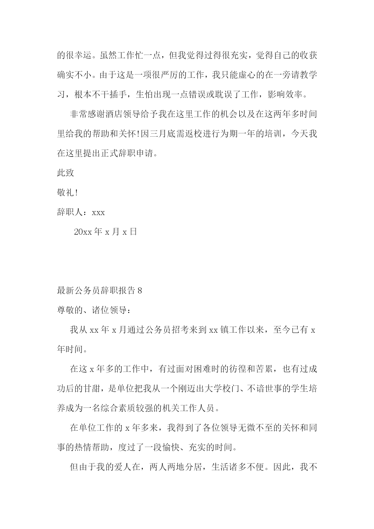最新公务员辞职报告(15篇)最新公务员辞职报告2尊敬的领导:首先,我向各位领导提出辞职的请求表示深深的歉意。从20xx年10月份来到xx乡工作以来,至今有七个月的时间,在这七个月的工作当中,有过面对困难时的彷徨和苦累,也有过成功后的甘甜,是单位把我从一个刚从部队退伍还未迈入过社会的退伍军人培养成为一名综合素质较强的机关工作人员。在xx乡文秘办工作的七个月来,我得到了各位领导无微不至的关怀和同事的热情帮助,度过了一段愉快、充实的时间。七个月来,由于自己知识的局限性,我在工作中深深感到自己相关知识的缺乏,虽然工作得到领导的认可和同事的好评,但仍然感觉自己在工作上一直处于一个比较被动的局面,而作为我本身来讲,作为一名刚退伍的军人,想到社会上继续磨练。经过再三的思考之后,我决定调整一下自己目前的状态,准备辞去这份工作,出去继续经历挫折,在不断的打击中继续成长,为以后实现理想奠定一个良好的基础。在此,我感谢县和乡两级领导曾经提供给我七个月的学习和成长时期,感谢领导和其他同事带给我快乐的工作和学习的时间。在各位领导的关心和同事们的指导帮助下,我学会了很多做人、做事的道理,同时我在综合协调和文章写作等方面也有了很大的提高,这将是我一生受用不尽的宝贵财富,在此我表示衷心的感谢。最后,我为我的辞职给单位带来的诸多不便深感抱歉,并请各位领导谅解我的处境,再一次致谢。此致敬礼!辞职人:20xx年x月x日最新公务员辞职报告3尊敬的领导:我很遗憾自己在这个时候向单位正式提出辞职。来到单位大约半年了,单位里的人对我都很好。我衷心感谢徐总以及各位同事对我的照顾与错爱,在这半年里,我学到了很多以前从未接触过的知识,开阔了视野,锻炼了能力。而今,我决定离开,也许这样会好一些。因为诸多原因,我决定参加研究生考试,以为工作两年再去读研是一个好的决定。如果我现在不辞职,我就是在单位里素餐两年,因为在两年时间里,我不可能为单位做多少贡献。我也许能大致经历、学习这个工程建设的某些方面,可这只是对我有好处,只会使我欠单位更多的情。考虑到单位在人员安排上的合理性,本着对单位负责的态度,为了不让单位因我而造成决策的失误,我郑重向单位提出辞职。因为有想考xx大学的研究生,前几天一位老乡告诉我xx招一名热工的本科生做实验助理。这对我而言是一个很好的机会,学校的氛围肯定更加适合准备考研,我在xx已经把我的相关资料寄过去了。我希望尽快解除与单位的劳动关系,可以安心地轻轻离开。也许我该提前一个月给您递呈辞职报告,好在我手头的工作不多,一个星期足以交接干净。我原本打算x月x日开始我的二十余天的探亲假,现在我希望所有该处理的事情都在x月x日前处理妥当。马上就要离开单位了,在这最后的一段时间里,我会做好所有的交接工作,正常上班,静心等待您的答复、处理。离开这个单位,我满含着愧疚、遗憾。我愧对单位上下对我的期望,愧对各位对我的关心和爱护。遗憾我不能经历工业园的发展与以后的辉煌,不能分享你们的甘苦,不能聆听各位的教诲,也遗憾我什么都没能留下来。我将就这样悄悄地离开,结束我的这第一份工作。最后,衷心祝愿单位健康成长,事业蒸蒸日上!祝愿各位领导与同事:健康快乐,平安幸福!此致敬礼!辞职人:xxx20xx年x月x日最新公务员辞职报告4尊敬的局领导:光阴荏苒,岁月如梭,一转眼我参加税务工作已经两年了。两年时间,我从一个刚毕业的学生成长成一名略懂税收业务的税务干部。衷心感谢领导们对我的关心、教育和栽培,同志们对我的指导、帮助和爱护。两年税务职业生涯使我深刻领悟到税收工作的艰辛和光荣。此刻我递交辞呈心底是五味杂陈、百感交集。毕竟这份职业可以给与我稳定的工作、较佳的待遇、安逸的生活。离开令人羡慕的税务岗位、舍弃受人尊敬的公务员身份是一个令我难以抉择,痛苦不堪的决定,我曾为此辗转反侧、寝食难安。少年时代我就喜欢法律,敬佩那些维护公平、匡扶正义的律师,梦想自己也有机会身披律师袍站在法庭上为沉冤者昭雪、为受害者伸张、为当事人辩护。但是高考填报志愿时屈从了父母意见,报考了更为热门的金融学。这是我第一次与法律梦想擦肩而过。然而内心的法律梦却没有停止,于是经过一番努力进入政法大学拾起了久违的法律书籍。可是,毕业时基于对现今法律行业前途的悲观,对自己法律职业能力的怀疑,再次与法律梦想失之交臂。兴趣是最好的老师,只有热爱一份职业才会全心全意的扑在工作上,殚精竭虑的谋求提高工作技能,同时达到在快乐中投入工作,在工作中体会快乐的境界。我认定法律职业就是这样一份令我魂牵梦绕、奋不顾身的工作。基于以上原因我申请辞去公务员职务,去探索下一个未知的人生旅程。恳请领导予以批准。签名:日期:xx年xx月xx日最新公务员辞职报告5尊敬的局领导:光阴荏苒,岁月