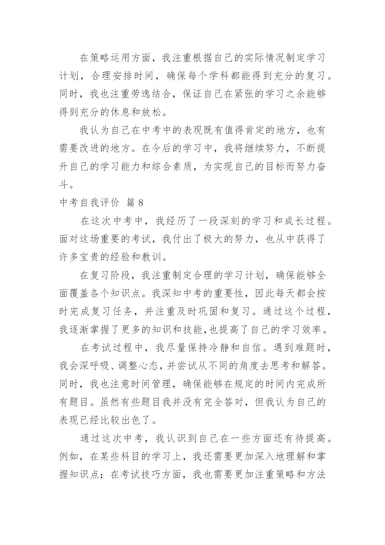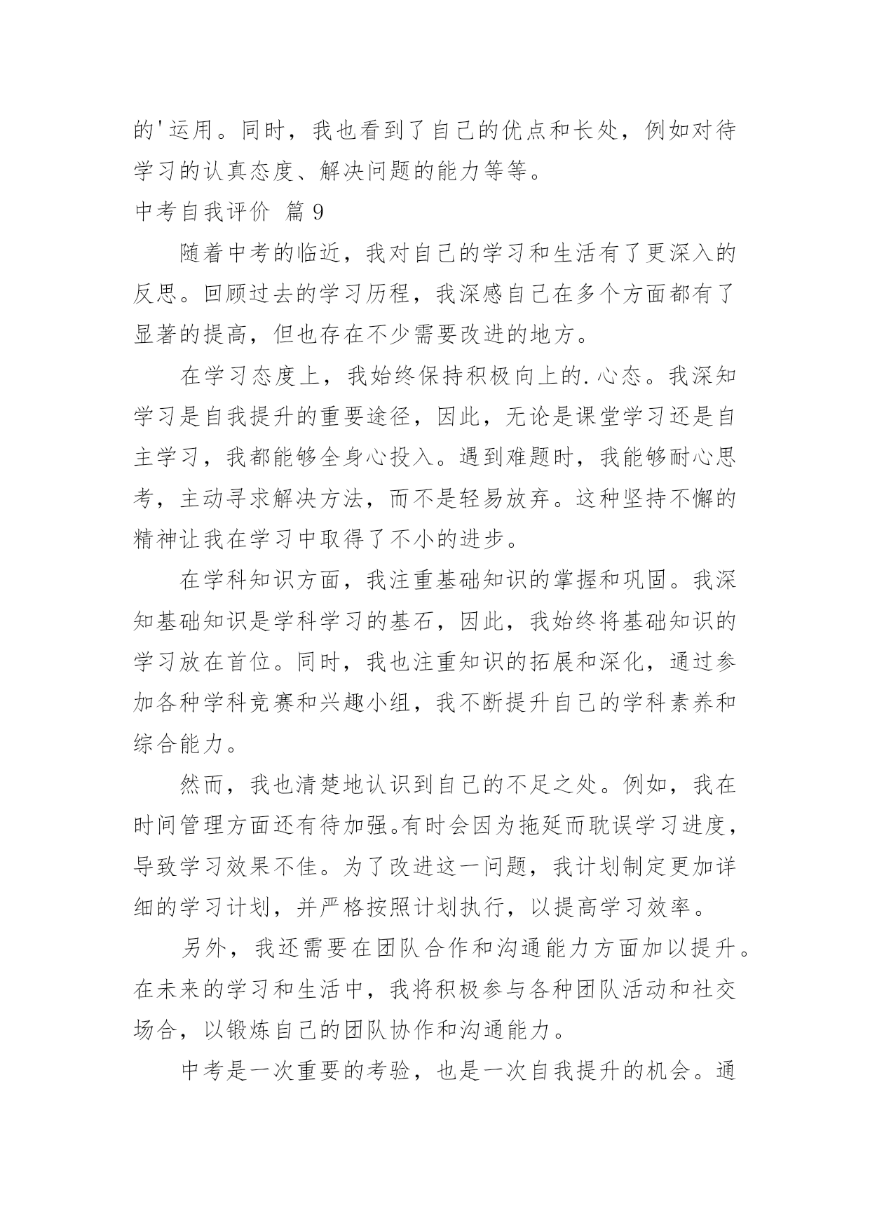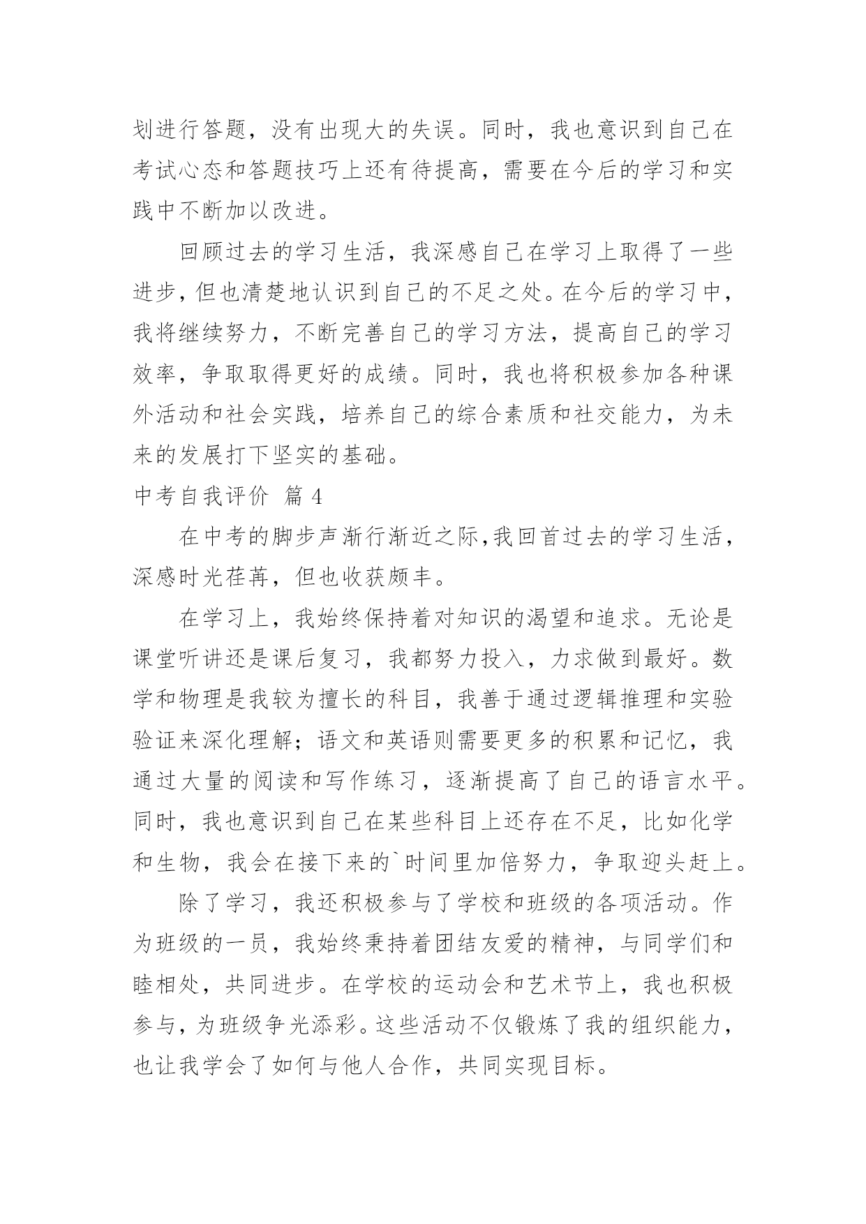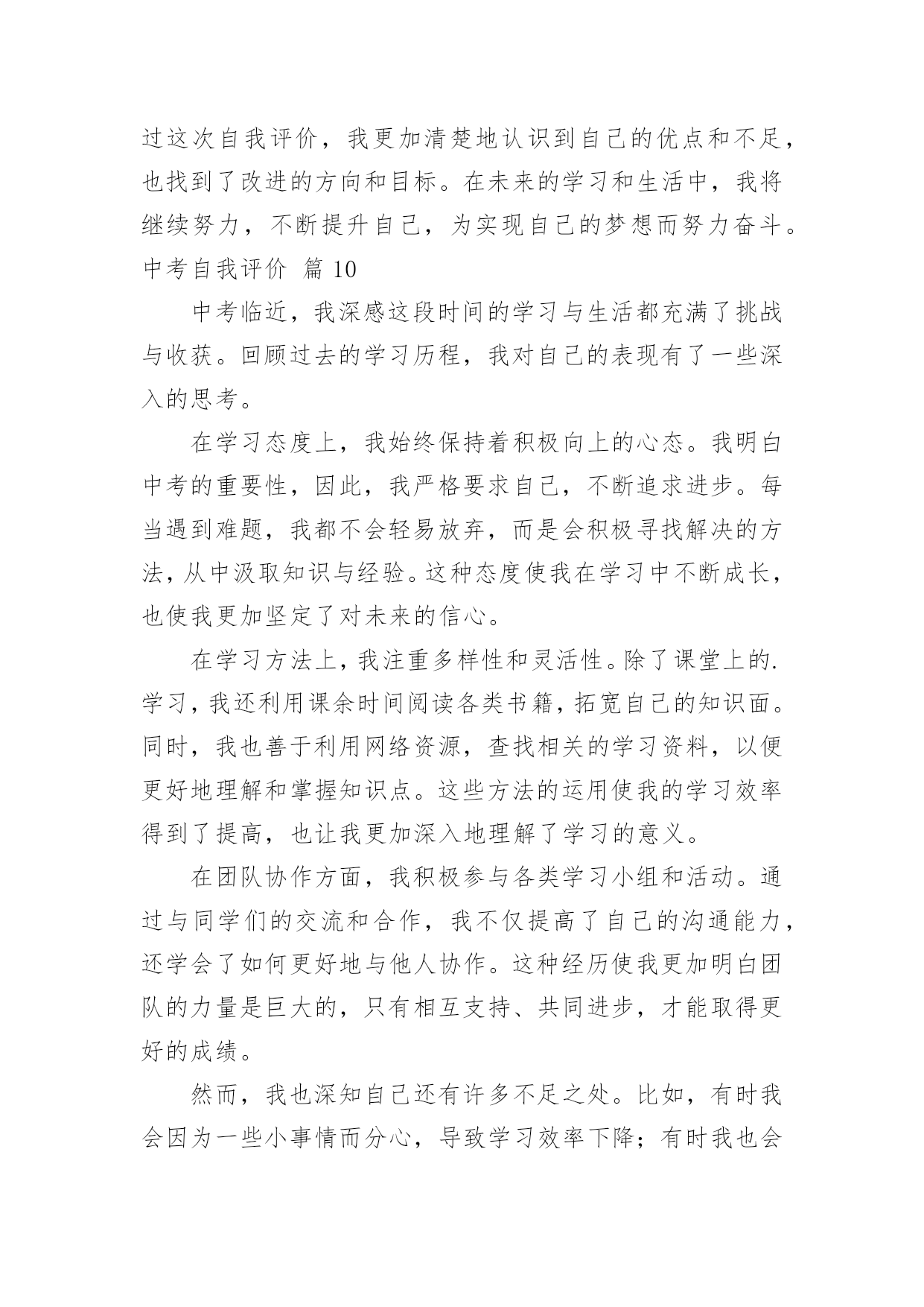 中考自我评价(实用)中考自我评价12篇无论是在学校还是在社会中,我们经常会被要求写一份自我评价,自我评价是自我诊断、自我调节、自我完善的过程。大家知道怎么写自我评价才是正确的吗?下面是小编为大家收集的中考自我评价,欢迎阅读,希望大家能够喜欢。中考自我评价篇1中考,作为我学习生涯中的一个重要节点,对我而言,既是一次挑战,也是一次成长的机会。在这次考试中,我深入反思了自己的表现,现将自我评价如下:在学习态度上,我始终保持积极向上的心态。我深知中考的重要性,因此,在日常学习中,我严格要求自己,认真听讲,积极思考,不断拓宽知识面,提高自己的综合素质。我努力做到主动学习,不满足于表面的理解,而是深入挖掘知识的.内涵,力求掌握每一个知识点。在知识掌握方面,我力求全面而深入。通过中考的检验,我发现自己在某些学科上还存在一些薄弱环节。对此,我积极查漏补缺,通过自主学习和请教老师,努力弥补这些不足。同时,我也意识到自己在一些学科上表现较好,这是我在日常学习中不断努力和积累的结果。在应试技巧上,我也有所收获。中考不仅考察知识掌握情况,还考察学生的应试能力。在考试中,我注重时间管理,合理安排答题顺序,力求在有限的时间内发挥出最佳水平。同时,我也学会了调整心态,保持冷静和自信,面对难题时能够沉着应对。然而,我也认识到自己在中考中还存在一些不足。比如,在某些题目上,我没有充分发挥出自己的实力,可能是由于对知识点掌握不够牢固,或者是应试技巧运用不够熟练。这些不足让我深刻反思,也为我今后的学习指明了方向。回顾这次中考,我深感自己在学习和应试方面都有所进步,但也清楚地看到了自己的不足之处。我将以这次中考为契机,继续努力,不断提高自己的学习能力和应试技巧,为未来的学习和生活打下坚实的基础。中考自我评价篇2中考临近,我深感时间之紧迫,学业之繁重。回顾过去的学习历程,我对自己的表现进行了一次深入的自我评价。在学习态度上,我始终保持着积极进取的心态。课堂上,我专心听讲,认真记录,力求把每一个知识点都掌握得扎实。课后,我会及时复习,巩固所学内容,遇到不懂的问题,我会主动向老师请教,与同学讨论,直至弄清楚为止。这种持之以恒的学习态度,使我在各科目上都取得了不错的成绩。在学科能力上,我注重培养自己的思维能力和实践能力。我善于分析问题,能够独立思考,提出自己的见解。同时,我也注重实践,通过实验、调查等方式,将所学知识应用到实际生活中。这种学科能力的培养,不仅提高了我的学习成绩,也锻炼了我的综合素质。在团队合作方面,我积极参与班级和学校的各项活动。在团队中,我能够发挥自己的优势,为团队做出贡献。同时,我也尊重他人,善于倾听他人的意见,与团队成员保持良好的沟通。这种团队合作精神,使我在团队中得到了大家的.认可。我认为自己在中考前的表现还是比较满意的。但我也明白,学无止境,只有不断努力,才能取得更好的成绩。因此,我会继续保持积极的学习态度,努力提高自己的学科能力,争取在中考中取得优异的成绩。中考自我评价篇3随着中考的结束,我深感自己在过去的学习生活中,既有所收获,也存在一些不足。在此,我对自己进行一个简要的自我评价。在学习态度上,我始终保持着对知识的热爱和渴望。无论是课堂听讲还是课后复习,我都能够认真投入,积极思考问题,努力提高自己的学习效率。同时,我也注重培养自己的自主学习能力,通过阅读各种书籍和资料,不断拓宽自己的'知识面。在学科知识掌握上,我认为自己已经掌握了一定的基础知识,并能够在一定程度上运用所学知识解决问题。特别是在数学和物理方面,我通过大量的练习和思考,逐渐形成了自己的解题思路和方法。然而,我也认识到自己在语文和英语等科目上还存在一些短板,需要进一步加强学习和提高。在考试表现上,我认为自己在中考中发挥得相对稳定。虽然在一些科目上出现了失误,但总体上能够按照自己的计划进行答题,没有出现大的失误。同时,我也意识到自己在考试心态和答题技巧上还有待提高,需要在今后的学习和实践中不断加以改进。回顾过去的学习生活,我深感自己在学习上取得了一些进步,但也清楚地认识到自己的不足之处。在今后的学习中,我将继续努力,不断完善自己的学习方法,提高自己的学习效率,争取取得更好的成绩。同时,我也将积极参加各种课外活动和社会实践,培养自己的综合素质和社交能力,为未来的发展打下坚实的基础。中考自我评价篇4在中考的脚步声渐行渐近之际,我回首过去的学习生活,深感时光荏苒,但也收获颇丰。在学习上,我始终保持着对知识的渴望和追求。无论是课堂听讲还是课后复习,我都努力投入,力求做到最好。数学和物理是我较为擅长的科目,我善于通过逻辑推理和实验验证来深化理解;语文和英语则需要更多的积累和记忆,我通过大量的阅读和写作练习,逐渐提高了自己的语言水平。同时,我也意识到自己在某些科目上还存在不足,比如化学和生物,