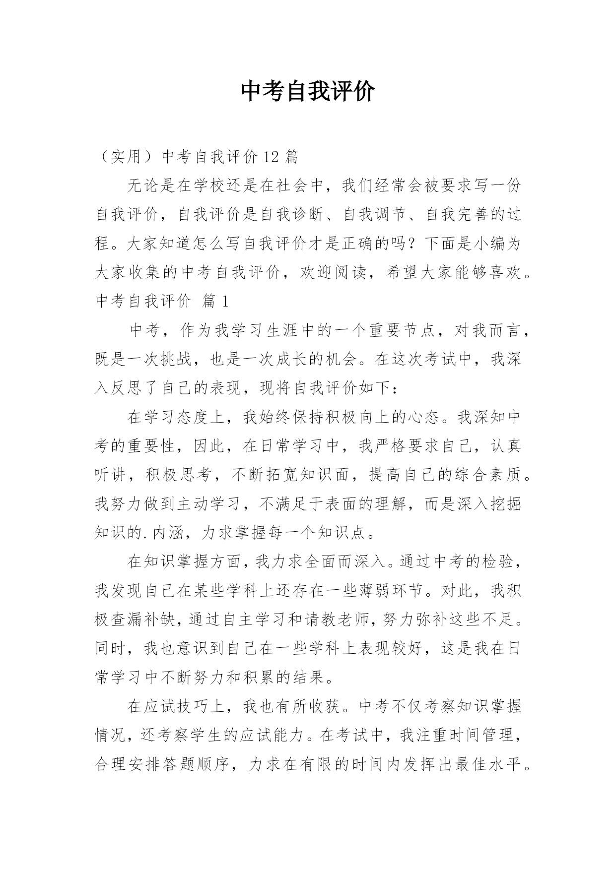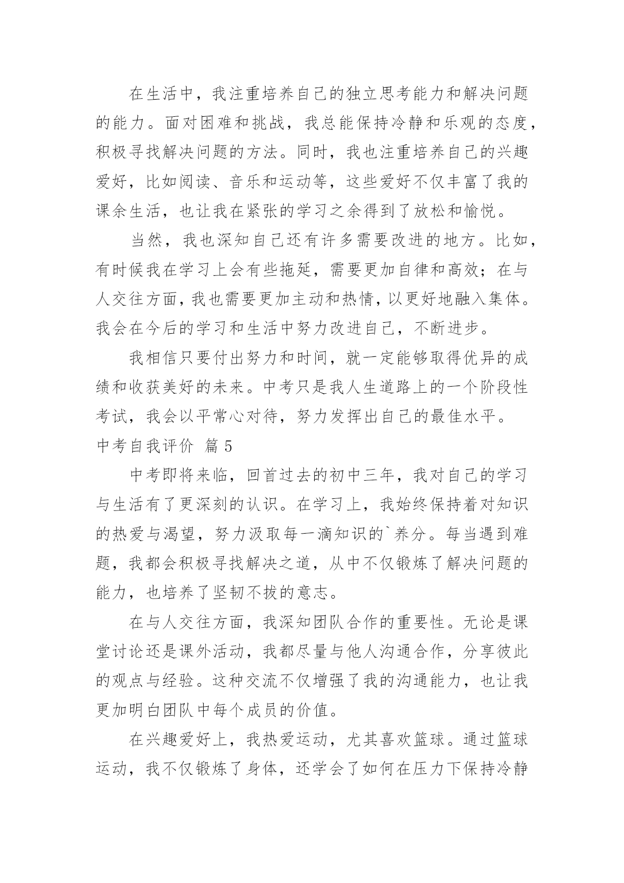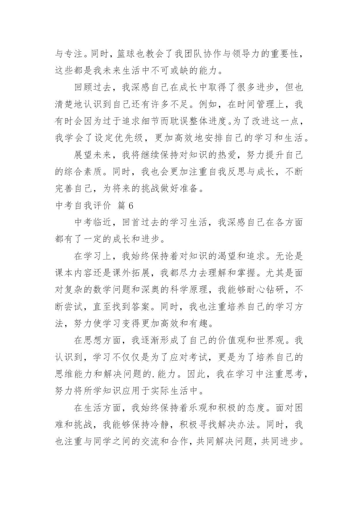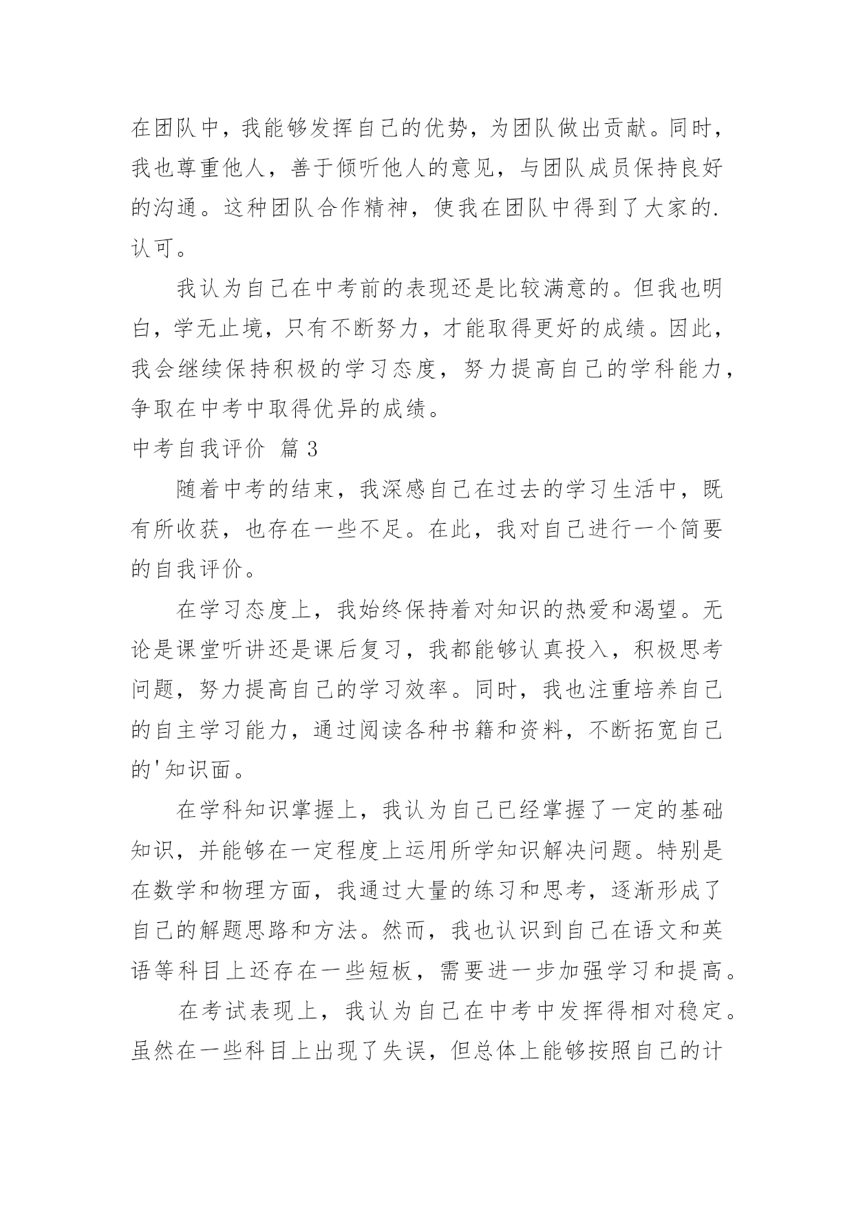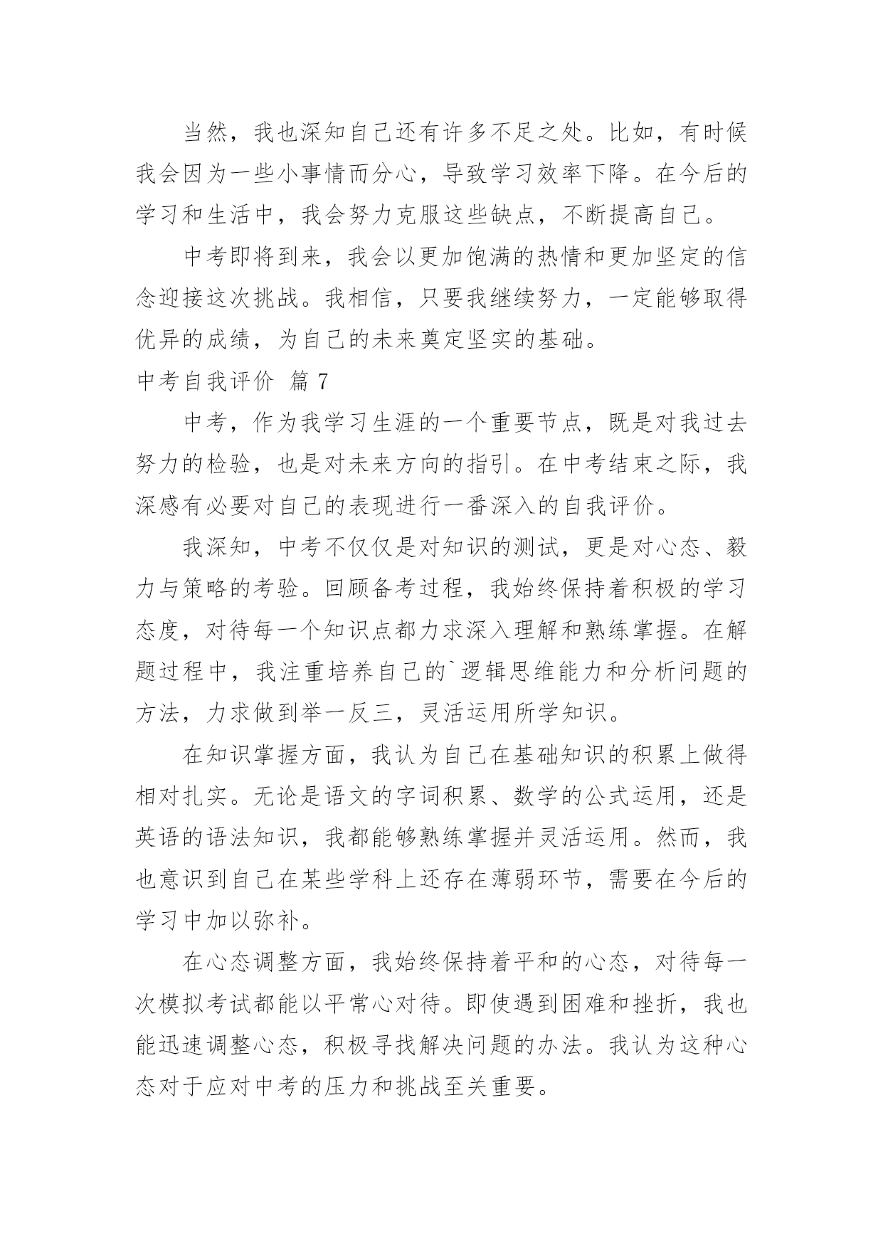 中考自我评价(实用)中考自我评价12篇无论是在学校还是在社会中,我们经常会被要求写一份自我评价,自我评价是自我诊断、自我调节、自我完善的过程。大家知道怎么写自我评价才是正确的吗?下面是小编为大家收集的中考自我评价,欢迎阅读,希望大家能够喜欢。中考自我评价篇1中考,作为我学习生涯中的一个重要节点,对我而言,既是一次挑战,也是一次成长的机会。在这次考试中,我深入反思了自己的表现,现将自我评价如下:在学习态度上,我始终保持积极向上的心态。我深知中考的重要性,因此,在日常学习中,我严格要求自己,认真听讲,积极思考,不断拓宽知识面,提高自己的综合素质。我努力做到主动学习,不满足于表面的理解,而是深入挖掘知识的.内涵,力求掌握每一个知识点。在知识掌握方面,我力求全面而深入。通过中考的检验,我发现自己在某些学科上还存在一些薄弱环节。对此,我积极查漏补缺,通过自主学习和请教老师,努力弥补这些不足。同时,我也意识到自己在一些学科上表现较好,这是我在日常学习中不断努力和积累的结果。在应试技巧上,我也有所收获。中考不仅考察知识掌握情况,还考察学生的应试能力。在考试中,我注重时间管理,合理安排答题顺序,力求在有限的时间内发挥出最佳水平。同时,我也学会了调整心态,保持冷静和自信,面对难题时能够沉着应对。然而,我也认识到自己在中考中还存在一些不足。比如,在某些题目上,我没有充分发挥出自己的实力,可能是由于对知识点掌握不够牢固,或者是应试技巧运用不够熟练。这些不足让我深刻反思,也为我今后的学习指明了方向。回顾这次中考,我深感自己在学习和应试方面都有所进步,但也清楚地看到了自己的不足之处。我将以这次中考为契机,继续努力,不断提高自己的学习能力和应试技巧,为未来的学习和生活打下坚实的基础。中考自我评价篇2中考临近,我深感时间之紧迫,学业之繁重。回顾过去的学习历程,我对自己的表现进行了一次深入的自我评价。在学习态度上,我始终保持着积极进取的心态。课堂上,我专心听讲,认真记录,力求把每一个知识点都掌握得扎实。课后,我会及时复习,巩固所学内容,遇到不懂的问题,我会主动向老师请教,与同学讨论,直至弄清楚为止。这种持之以恒的学习态度,使我在各科目上都取得了不错的成绩。在学科能力上,我注重培养自己的思维能力和实践能力。我善于分析问题,能够独立思考,提出自己的见解。同时,我也注重实践,通过实验、调查等方式,将所学知识应用到实际生活中。这种学科能力的培养,不仅提高了我的学习成绩,也锻炼了我的综合素质。在团队合作方面,我积极参与班级和学校的各项活动。在团队中,我能够发挥自己的优势,为团队做出贡献。同时,我也尊重他人,善于倾听他人的意见,与团队成员保持良好的沟通。这种团队合作精神,使我在团队中得到了大家的.认可。我认为自己在中考前的表现还是比较满意的。但我也明白,学无止境,只有不断努力,才能取得更好的成绩。因此,我会继续保持积极的学习态度,努力提高自己的学科能力,争取在中考中取得优异的成绩。中考自我评价篇3随着中考的结束,我深感自己在过去的学习生活中,既有所收获,也存在一些不足。在此,我对自己进行一个简要的自我评价。在学习态度上,我始终保持着对知识的热爱和渴望。无论是课堂听讲还是课后复习,我都能够认真投入,积极思考问题,努力提高自己的学习效率。同时,我也注重培养自己的自主学习能力,通过阅读各种书籍和资料,不断拓宽自己的'知识面。在学科知识掌握上,我认为自己已经掌握了一定的基础知识,并能够在一定程度上运用所学知识解决问题。特别是在数学和物理方面,我通过大量的练习和思考,逐渐形成了自己的解题思路和方法。然而,我也认识到自己在语文和英语等科目上还存在一些短板,需要进一步加强学习和提高。在考试表现上,我认为自己在中考中发挥得相对稳定。虽然在一些科目上出现了失误,但总体上能够按照自己的计划进行答题,没有出现大的失误。同时,我也意识到自己在考试心态和答题技巧上还有待提高,需要在今后的学习和实践中不断加以改进。回顾过去的学习生活,我深感自己在学习上取得了一些进步,但也清楚地认识到自己的不足之处。在今后的学习中,我将继续努力,不断完善自己的学习方法,提高自己的学习效率,争取取得更好的成绩。同时,我也将积极参加各种课外活动和社会实践,培养自己的综合素质和社交能力,为未来的发展打下坚实的基础。中考自我评价篇4在中考的脚步声渐行渐近之际,我回首过去的学习生活,深感时光荏苒,但也收获颇丰。在学习上,我始终保持着对知识的渴望和追求。无论是课堂听讲还是课后复习,我都努力投入,力求做到最好。数学和物理是我较为擅长的科目,我善于通过逻辑推理和实验验证来深化理解;语文和英语则需要更多的积累和记忆,我通过大量的阅读和写作练习,逐渐提高了自己的语言水平。同时,我也意识到自己在某些科目上还存在不足,比如化学和生物,