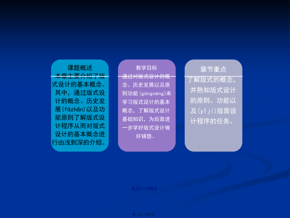 会计学Chapter1版式(bǎnshì)设计的基本理论1.2版式(bǎnshì)设计的基本理论版式(bǎnshì)设计的应用领域?//////////////为什么要学习(xuéxí)版式设计?版式设计(shèjì)有什么功能?版式设计的学习(xuéxí)方法中国的书籍形态(xíngtài)和版式设计的历史1、甲骨文2、金文(jīnwén)4、简册(jiǎncè)卷轴装经折装旋风装——龙鳞装蝴蝶装包背装线装书自明代起,中国的文人喜好在书籍(shūjí)的天头地脚间书写心得,加注批语。故而线装书的形式大多具有版心小,天头、地脚大的特点,尤其是天头之大更是如此。直接在书上进行批注圈点已是明代文人的时尚,似乎不在书上注解、批释,一本书的版面就不够完整。当这种批注形式出现之后,版面形态便发生了变化,成为中国古籍版面编排的一大特色。明《程氏墨苑》插图(chātú)版面《红楼梦》文明早期的版面设计中世纪的版面设计文艺复兴设计维多利亚时期设计风格(fēnggé)现代主义的编排设计国际主义风格(fēnggé)1、古埃及2、古希腊和罗马(luómǎ)字体二、中世纪的版面(bǎnmiàn)编排中世纪古典(gǔdiǎn)的版面设计随着资本主义关系在欧洲飞溅制度内已逐渐形成,文化上开始(kāishǐ)要求反映新兴资产阶级利益的呼声此起彼伏。它是一次文化思想大解放、大发展。维多利亚时期(shíqī)在设计风格上一个最显著的特点是对干中世纪哥德风格的推崇和流行。在这个时期,英国字体设计大繁荣,开发(kāifā)的新字体,对欧洲版面设计起到了巨大的推动作用。六、新艺术运动(yùndòng)时期的版面编排威廉·莫里斯——现代设计理论(lǐlùn)开创者英国人莫里斯,是古典主义版面的创始人,更被后人称为“设计之父”。其设计风格严谨、朴素大方,十分简洁、淡雅。在版面中采用对称式构图。美观的字体、新颖的版面编排和精美的装饰纹样,具有经久耐看的效果。他倡导的工艺美术运动在欧美造成了惊人的效果和广泛的影响。阿尔丰斯·穆卡设计的海报具有典雅(diǎnyǎ)、统一、装饰性强的特点朱利斯·谢列特包豪斯包豪斯成员(chéngyuán)的优秀作品包豪斯设计学院的版面构成(gòuchéng)教学实例瑞士人厄斯特.凯勒创作的功能性字体广告,为版面构成开创了崭新的表现形式和手段。他认为设计的问题就是形式与内容的高度(gāodù)统一,而字体图形就是最客观、明确、有效的图形传达信息。版式(bǎnshì)设计的发展趋势1、简约(jiǎnyuē)化在版式设计中,追求新颖独特的个性表现,有意(yǒuyì)制造某种神秘、无规则的空间,或者以追求幽默、风趣的表现形式来吸引渎职,引起共鸣。这种风格,摆脱了陈旧与平庸,给设计注入新的活力。在平面设计的作品里除了图形之外,第二位就是文字。文字这种设计元素已经转换成为一种符号,呈现出抽象风格的哲学意味。通过文字图形化的排版所制造的幽默、神秘等独特形式,已发展成为当前的内涵与情趣(qíngqù),文字作为生动的设计元素每时每刻都活跃于版面构成中,使版面进入一个更新更高的境界,从而产生新的生命力。文字不再是孤立的视觉语言,已成为图形的一部分。电脑已广泛进入设计领域,成为必要的设计工具,给排版设计带来了实现创意的无限潜能和高效率。数码媒体和多范畴组合的崭新手法,不仅使人与人之间相互联系的方法发生变革,而且也直接参与规范我们现实生活的框架,开创出一条新颖的丰富多彩的设计领域。运用电脑表现的影响合成、透叠、方向旋转、图像的滤镜特殊技巧等种种处理方式,形成一个多维空间的版面。这种构成(gòuchéng)方式,使版面不再是一个简单、单一的构成(gòuchéng)关系,而是构成(gòuchéng)了多视点、矛盾性空间层次的立体化,以此来刺激观者,产生出前所未有的艺术形式。这也应成为当今排版设计的又一发展趋势。1.4版式(bǎnshì)设计的原则/2、形式(xíngshì)与内容的统一/3、优化整体(zhěngtǐ)布局/4、技术(jìshù)与艺术的统一1.6版式设计(shèjì)的流程版式(bǎnshì)设计的流程感谢您的观看(guānkàn)。