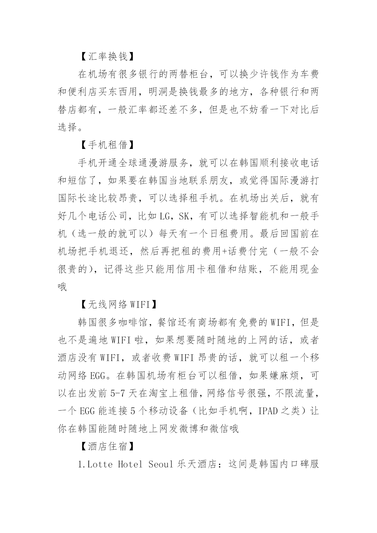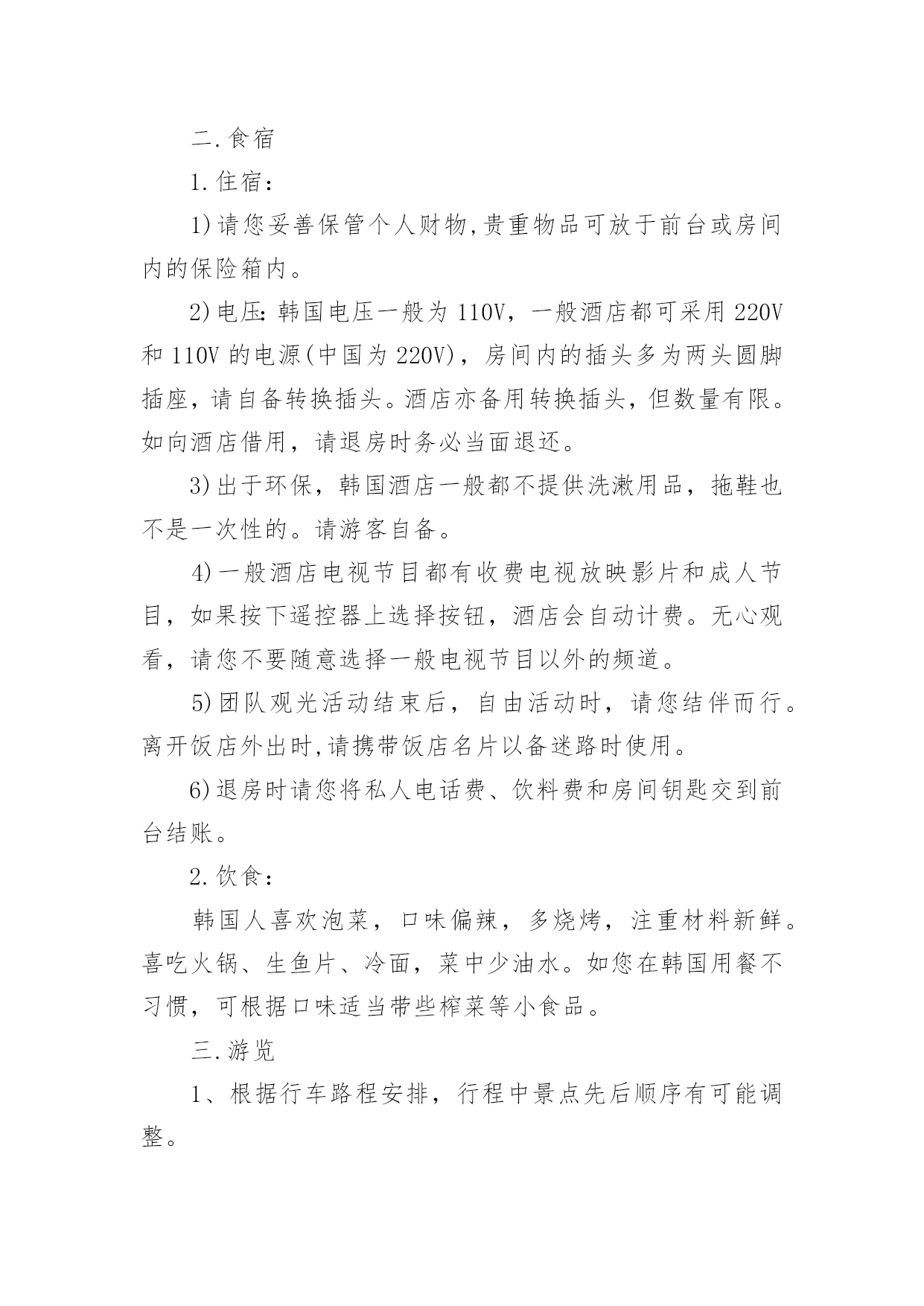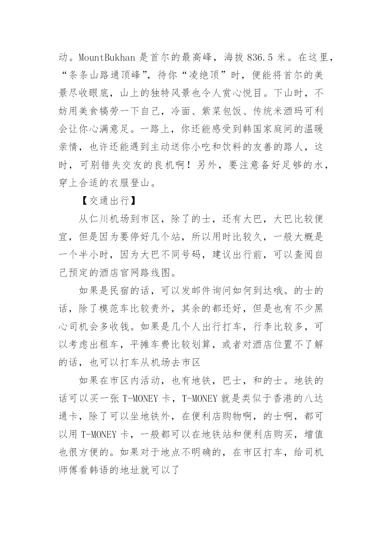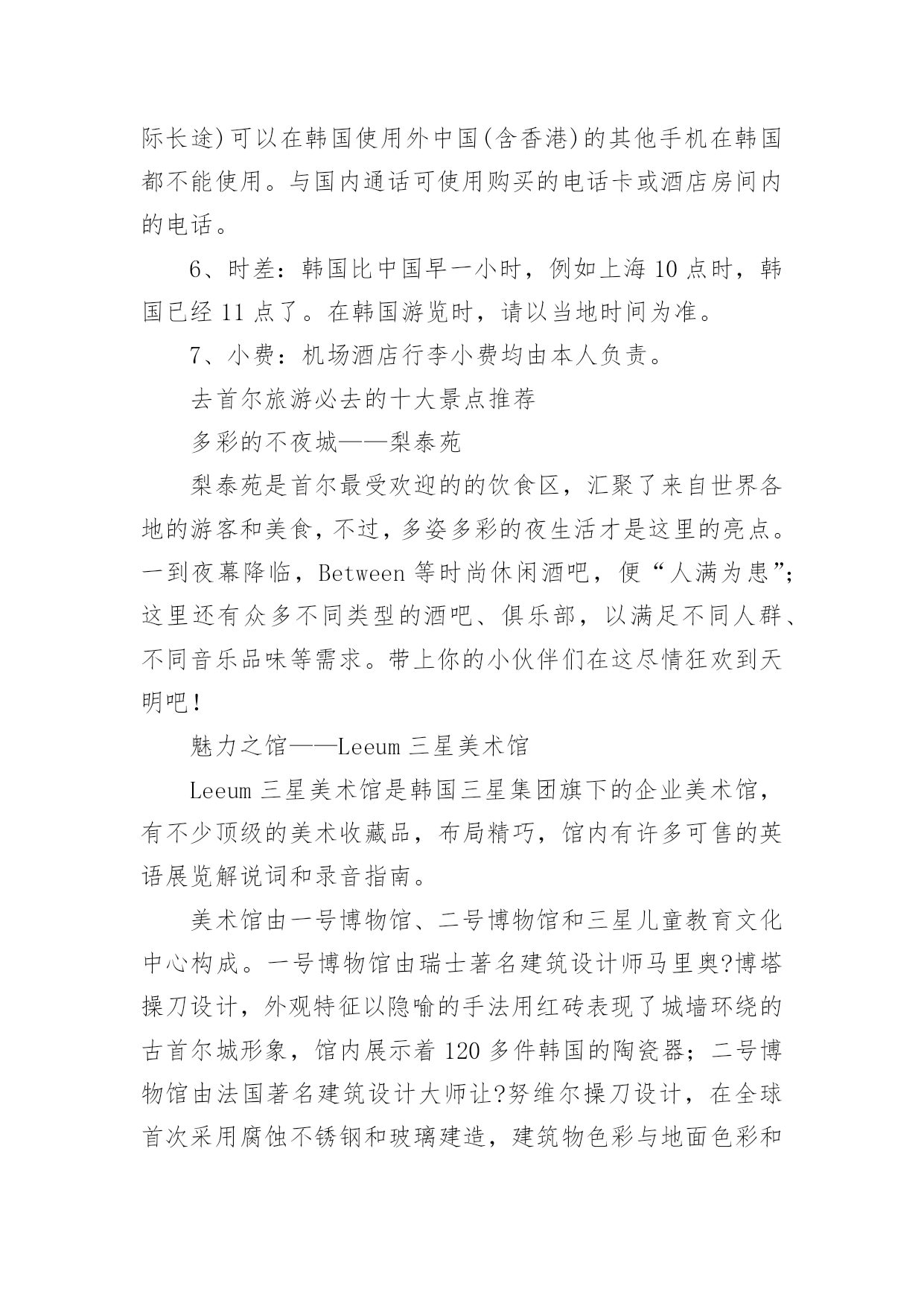 首尔旅游注意事项首尔旅游注意事项准备到韩国首尔旅游的小伙伴必须关注一些相关的注意事项,以便给出行旅游的自己造成不便!以下是小编整理的首尔旅游注意事项,欢迎阅览!行前准备1.一般情况下,酒店自来水可安全饮用;酒店不提供牙膏、牙刷、拖鞋等个人用品,敬请自备。2.酒店入住时间一般为下午14:00,退房时间为中午12:00以前,超时需要加收费用。3.一般酒店都可采用220v电压及110v电压,建议自备两相圆脚插头。4.时差:韩国首尔时间与中国北京时间的时差为+1小时。5.中国移动和中国联通的国际漫游在韩国都不能使用,与国内通话可使用购买的电话卡或酒店房间内的电话。6.韩国料理多以泡菜、烤肉、鱼类为主,辛辣且少油,注重材料新鲜,与中国菜有很大不同。如您在韩国用餐不习惯,可根据口味适当带些榨菜等小食品。团体旅游注意事项一.出入境1.报到:请您按“出团通知”的要求,准时到达集合地点。机场内人多拥挤,请注意保管财物。2.行李:(1)、手提行李每人限携带一件,托运行李重量以不超过20公斤为准。(2)、贵重物品不能放在托运行李里;酒类物品、水果刀、小剪子及指甲刀不能随身携带,必须托运。(3)、请于行李牌上清楚填写中英文姓名、电话。托运行李交运航空公司后,请您务必保管好自己的行李托运小票,并请核对小票上的航班及目的地是否与您当日所乘坐的航班及所前往城市一致。3.中国出境:(1)、中国海关:如您携带摄像机、可拆装镜头的照相机、笔记本电脑等物品,请向海关申报。(2)、携带外币:根据国家规定,每人可携带2000美元出境,请您不要超过此限度。(3)、如您随团旅游,请服从领队安排,依照《出境名单表》上的顺序,统一办理出境手续;如果是签证自理的客人,请自行办理出境手续。4.韩国入境:(1)、每位旅客可免税携带烈酒一瓶,香烟200支.下列物品禁止带入韩国:象牙、裘皮制品及植物、热带水果、干果等。(2)、入境韩国时请听从领队安排随团统一办理入出境手续,不要单独行动,否则将会被拒绝入境;如果您是签证自理的客人,请自行办理入境韩国移民局的手续,无需和团体签证的客人一起过移民局,以免引起不必要的麻烦。二.食宿1.住宿:1)请您妥善保管个人财物,贵重物品可放于前台或房间内的保险箱内。2)电压:韩国电压一般为110V,一般酒店都可采用220V和110V的电源(中国为220V),房间内的插头多为两头圆脚插座,请自备转换插头。酒店亦备用转换插头,但数量有限。如向酒店借用,请退房时务必当面退还。3)出于环保,韩国酒店一般都不提供洗漱用品,拖鞋也不是一次性的。请游客自备。4)一般酒店电视节目都有收费电视放映影片和成人节目,如果按下遥控器上选择按钮,酒店会自动计费。无心观看,请您不要随意选择一般电视节目以外的频道。5)团队观光活动结束后,自由活动时,请您结伴而行。离开饭店外出时,请携带饭店名片以备迷路时使用。6)退房时请您将私人电话费、饮料费和房间钥匙交到前台结账。2.饮食:韩国人喜欢泡菜,口味偏辣,多烧烤,注重材料新鲜。喜吃火锅、生鱼片、冷面,菜中少油水。如您在韩国用餐不习惯,可根据口味适当带些榨菜等小食品。三.游览1、根据行车路程安排,行程中景点先后顺序有可能调整。2、请您牢记旅行中集合时间及地点,如果在当地走失,请拨打当地导游手机求助。3、在安排的行程中请不要离团;您的护照及机票将由领队代为保管。4、行程中的自费项目,请根据您的意愿,自愿参加。5、请紧记旅程中集合时间及地点,团体游览务请准时。四.购物购物:以观光为主,若看到喜欢或合适的物品,请速决定是否购买,以免耽误团队行程。韩国比较著名的特产是高丽人参和紫水晶,以及韩式化妆品。韩国商品几乎不还价。五.其它1、天气:韩国属温带气候,海洋性特征显著,四季分明,春季(4—6月)春光明媚,夏季(7—9月)炎热潮湿,秋季(10—12月)凉爽迷人,冬季(1—3月)寒冷干燥。2、语言:韩语为行政用语,华侨亦通国语。英文程度普遍比较差。3、货币:1)、韩国货币单位为“元”,硬币面值有10韩元、50韩元、100韩元、500韩元;纸币则只有1000韩元、5000韩元、10000韩元。货币兑换一般在机场或者宾馆前台进行。2)、VISA、MASTER卡在韩国使用很方便。韩国人消费多数刷卡。4、药物:请根据自己身体状况自备少量常用药品。5、通讯:因为系统不同,除联通CDMA手机(须开通国际长途)可以在韩国使用外中国(含香港)的其他手机在韩国都不能使用。与国内通话可使用购买的电话卡或酒店房间内的电话。6、时差:韩国比中国早一小时,例如上海10点时,韩国已经11点了。在韩国游览时,请以当地时间为准。7、小费:机场酒店行李小费均由本人负责。去首尔旅游必去的十大景点推荐多彩的不夜城——梨泰苑梨泰苑是首尔最受欢迎的的饮食区,汇聚了来自世界各地的游客和美食,