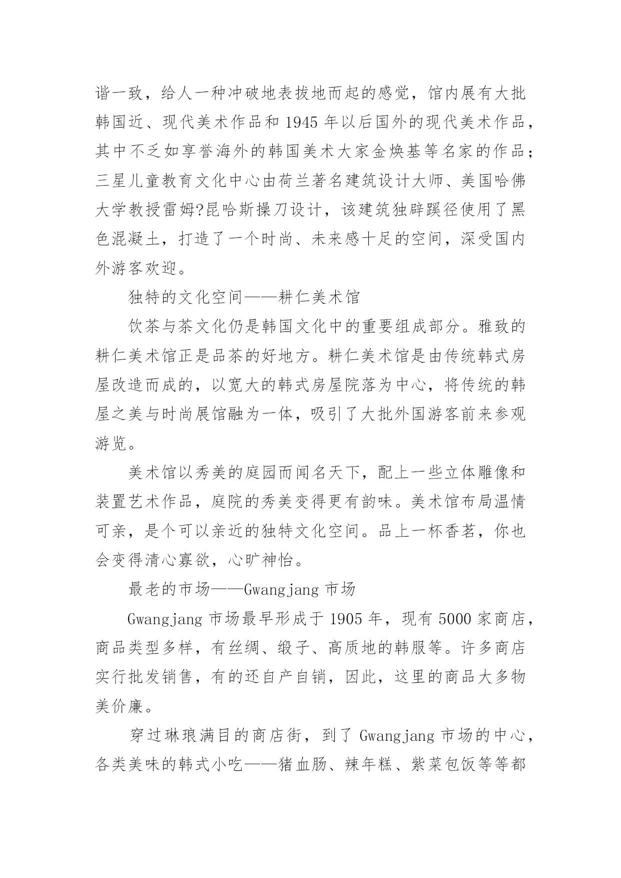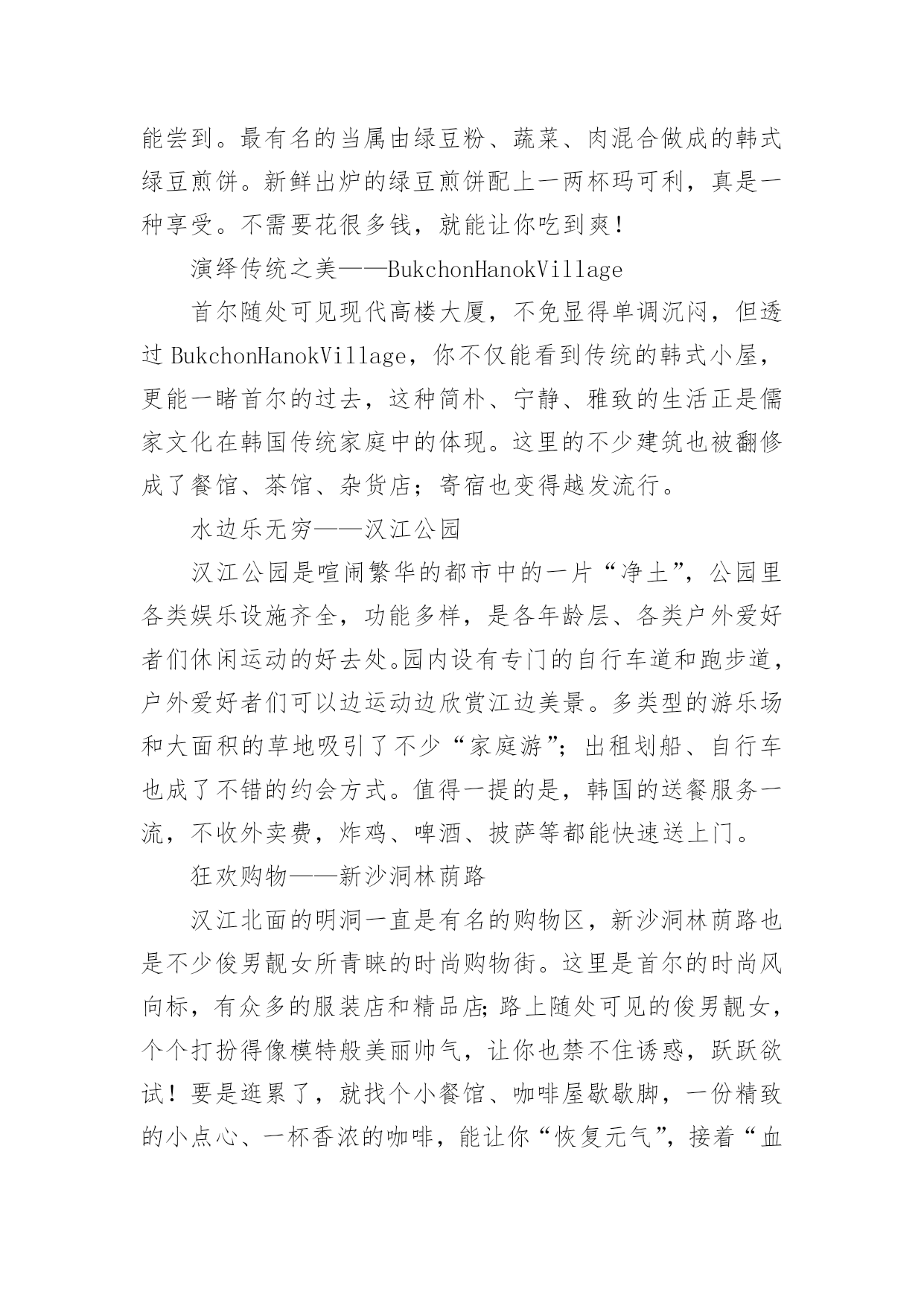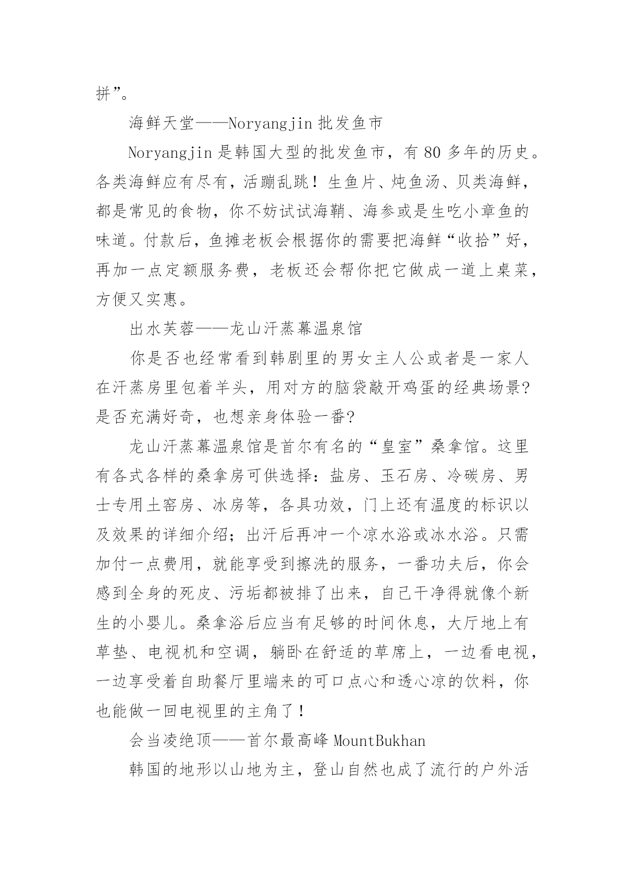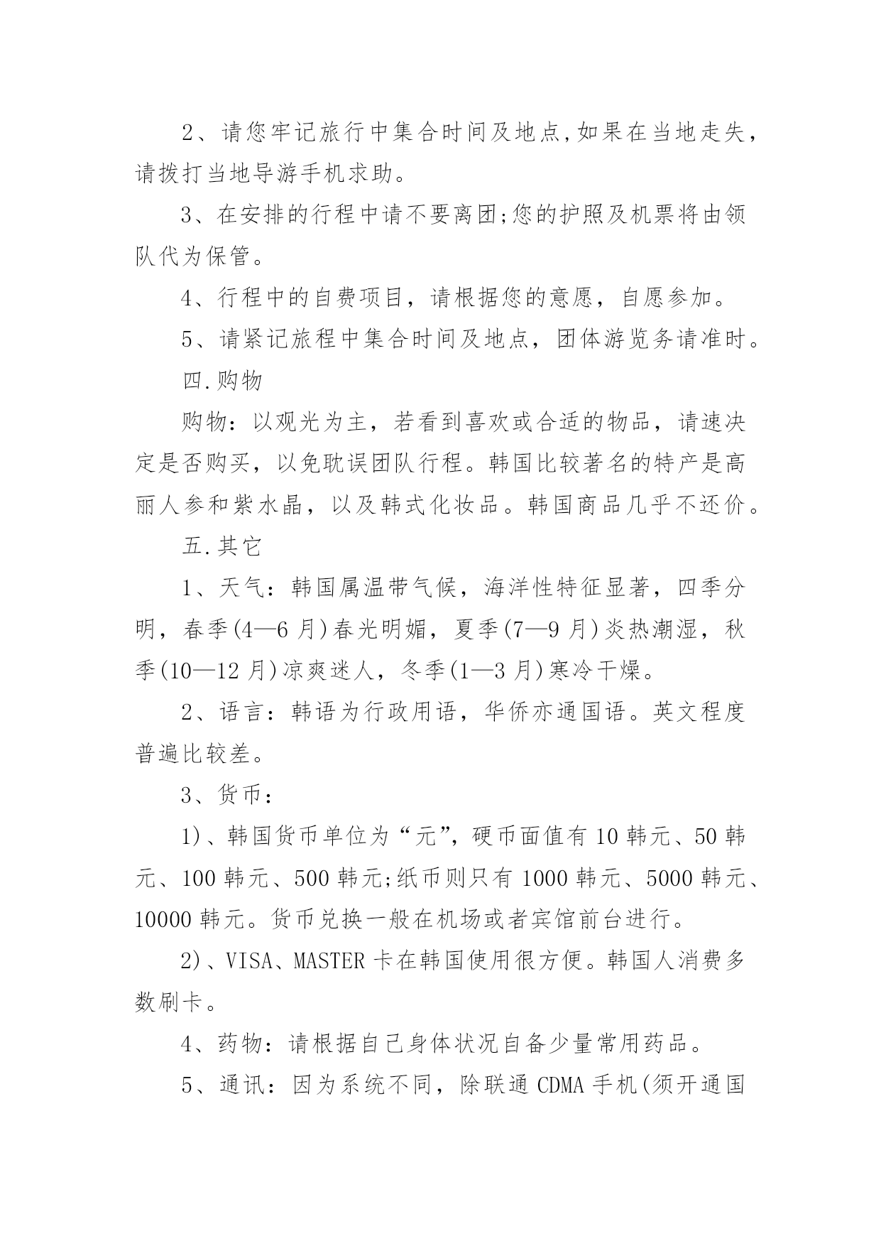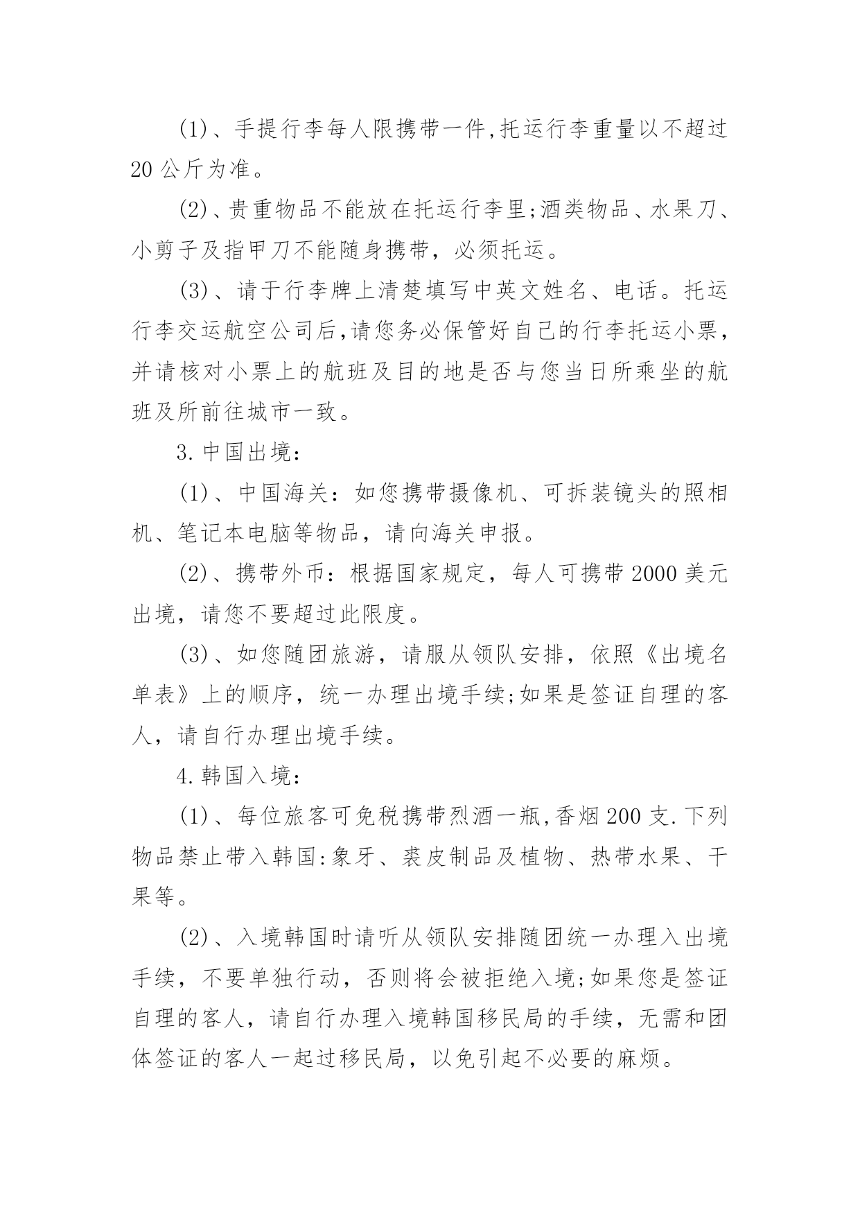 首尔旅游注意事项首尔旅游注意事项准备到韩国首尔旅游的小伙伴必须关注一些相关的注意事项,以便给出行旅游的自己造成不便!以下是小编整理的首尔旅游注意事项,欢迎阅览!行前准备1.一般情况下,酒店自来水可安全饮用;酒店不提供牙膏、牙刷、拖鞋等个人用品,敬请自备。2.酒店入住时间一般为下午14:00,退房时间为中午12:00以前,超时需要加收费用。3.一般酒店都可采用220v电压及110v电压,建议自备两相圆脚插头。4.时差:韩国首尔时间与中国北京时间的时差为+1小时。5.中国移动和中国联通的国际漫游在韩国都不能使用,与国内通话可使用购买的电话卡或酒店房间内的电话。6.韩国料理多以泡菜、烤肉、鱼类为主,辛辣且少油,注重材料新鲜,与中国菜有很大不同。如您在韩国用餐不习惯,可根据口味适当带些榨菜等小食品。团体旅游注意事项一.出入境1.报到:请您按“出团通知”的要求,准时到达集合地点。机场内人多拥挤,请注意保管财物。2.行李:(1)、手提行李每人限携带一件,托运行李重量以不超过20公斤为准。(2)、贵重物品不能放在托运行李里;酒类物品、水果刀、小剪子及指甲刀不能随身携带,必须托运。(3)、请于行李牌上清楚填写中英文姓名、电话。托运行李交运航空公司后,请您务必保管好自己的行李托运小票,并请核对小票上的航班及目的地是否与您当日所乘坐的航班及所前往城市一致。3.中国出境:(1)、中国海关:如您携带摄像机、可拆装镜头的照相机、笔记本电脑等物品,请向海关申报。(2)、携带外币:根据国家规定,每人可携带2000美元出境,请您不要超过此限度。(3)、如您随团旅游,请服从领队安排,依照《出境名单表》上的顺序,统一办理出境手续;如果是签证自理的客人,请自行办理出境手续。4.韩国入境:(1)、每位旅客可免税携带烈酒一瓶,香烟200支.下列物品禁止带入韩国:象牙、裘皮制品及植物、热带水果、干果等。(2)、入境韩国时请听从领队安排随团统一办理入出境手续,不要单独行动,否则将会被拒绝入境;如果您是签证自理的客人,请自行办理入境韩国移民局的手续,无需和团体签证的客人一起过移民局,以免引起不必要的麻烦。二.食宿1.住宿:1)请您妥善保管个人财物,贵重物品可放于前台或房间内的保险箱内。2)电压:韩国电压一般为110V,一般酒店都可采用220V和110V的电源(中国为220V),房间内的插头多为两头圆脚插座,请自备转换插头。酒店亦备用转换插头,但数量有限。如向酒店借用,请退房时务必当面退还。3)出于环保,韩国酒店一般都不提供洗漱用品,拖鞋也不是一次性的。请游客自备。4)一般酒店电视节目都有收费电视放映影片和成人节目,如果按下遥控器上选择按钮,酒店会自动计费。无心观看,请您不要随意选择一般电视节目以外的频道。5)团队观光活动结束后,自由活动时,请您结伴而行。离开饭店外出时,请携带饭店名片以备迷路时使用。6)退房时请您将私人电话费、饮料费和房间钥匙交到前台结账。2.饮食:韩国人喜欢泡菜,口味偏辣,多烧烤,注重材料新鲜。喜吃火锅、生鱼片、冷面,菜中少油水。如您在韩国用餐不习惯,可根据口味适当带些榨菜等小食品。三.游览1、根据行车路程安排,行程中景点先后顺序有可能调整。2、请您牢记旅行中集合时间及地点,如果在当地走失,请拨打当地导游手机求助。3、在安排的行程中请不要离团;您的护照及机票将由领队代为保管。4、行程中的自费项目,请根据您的意愿,自愿参加。5、请紧记旅程中集合时间及地点,团体游览务请准时。四.购物购物:以观光为主,若看到喜欢或合适的物品,请速决定是否购买,以免耽误团队行程。韩国比较著名的特产是高丽人参和紫水晶,以及韩式化妆品。韩国商品几乎不还价。五.其它1、天气:韩国属温带气候,海洋性特征显著,四季分明,春季(4—6月)春光明媚,夏季(7—9月)炎热潮湿,秋季(10—12月)凉爽迷人,冬季(1—3月)寒冷干燥。2、语言:韩语为行政用语,华侨亦通国语。英文程度普遍比较差。3、货币:1)、韩国货币单位为“元”,硬币面值有10韩元、50韩元、100韩元、500韩元;纸币则只有1000韩元、5000韩元、10000韩元。货币兑换一般在机场或者宾馆前台进行。2)、VISA、MASTER卡在韩国使用很方便。韩国人消费多数刷卡。4、药物:请根据自己身体状况自备少量常用药品。5、通讯:因为系统不同,除联通CDMA手机(须开通国际长途)可以在韩国使用外中国(含香港)的其他手机在韩国都不能使用。与国内通话可使用购买的电话卡或酒店房间内的电话。6、时差:韩国比中国早一小时,例如上海10点时,韩国已经11点了。在韩国游览时,请以当地时间为准。7、小费:机场酒店行李小费均由本人负责。去首尔旅游必去的十大景点推荐多彩的不夜城——梨泰苑梨泰苑是首尔最受欢迎的的饮食区,汇聚了来自世界各地的游客和美食,