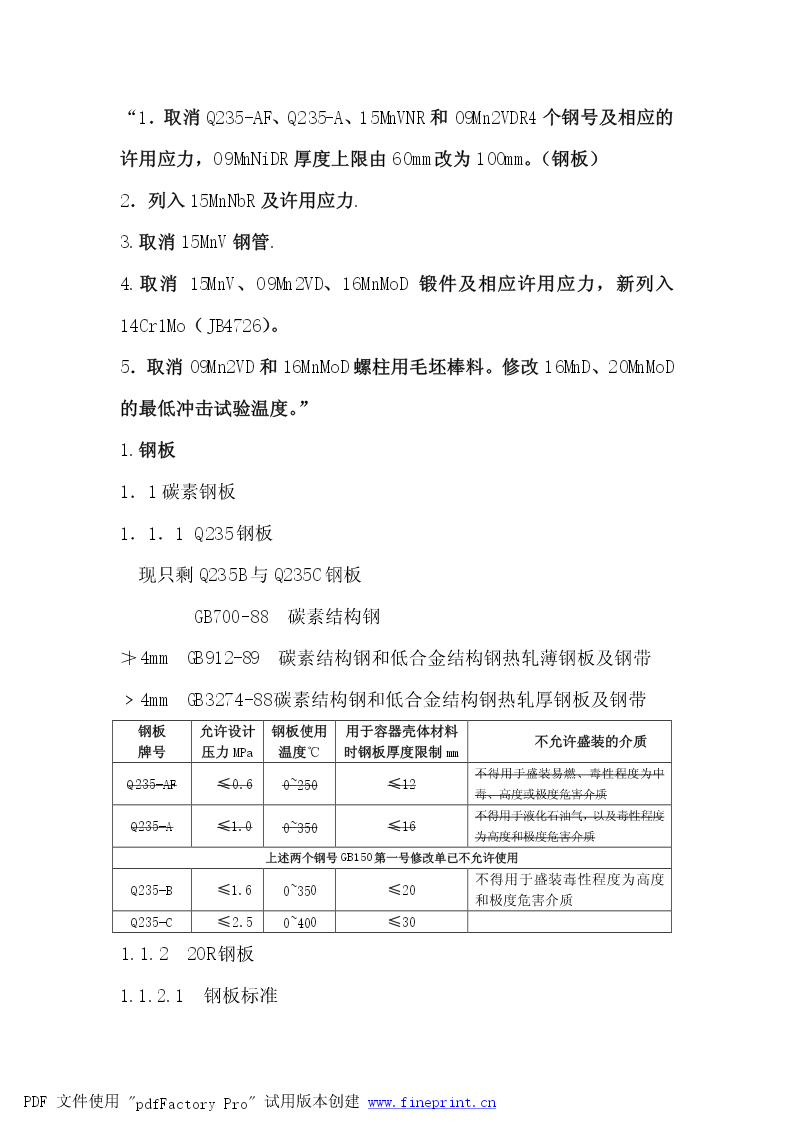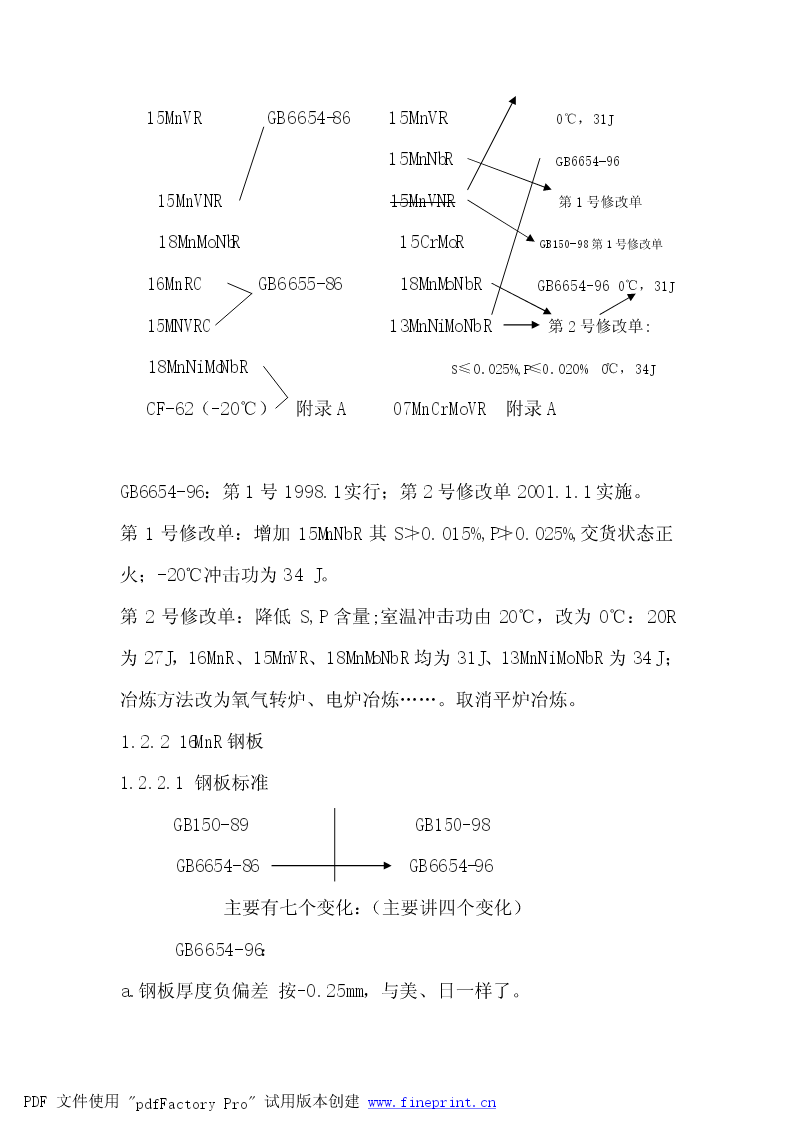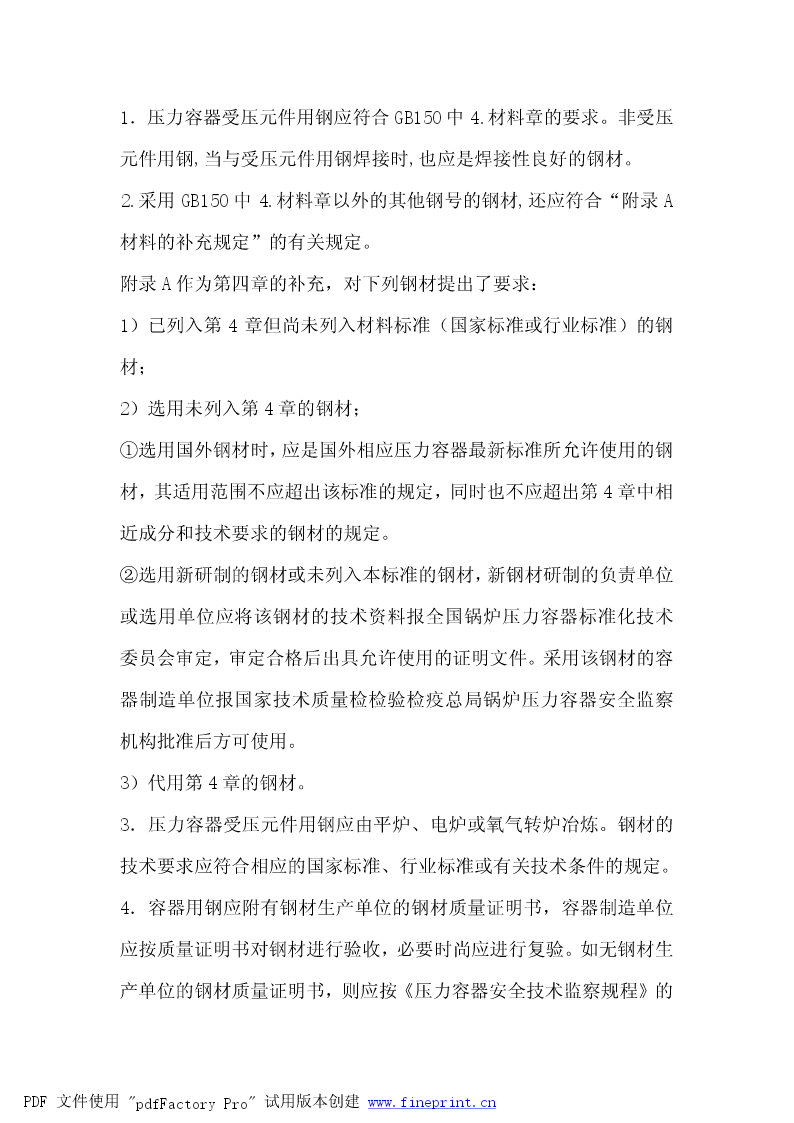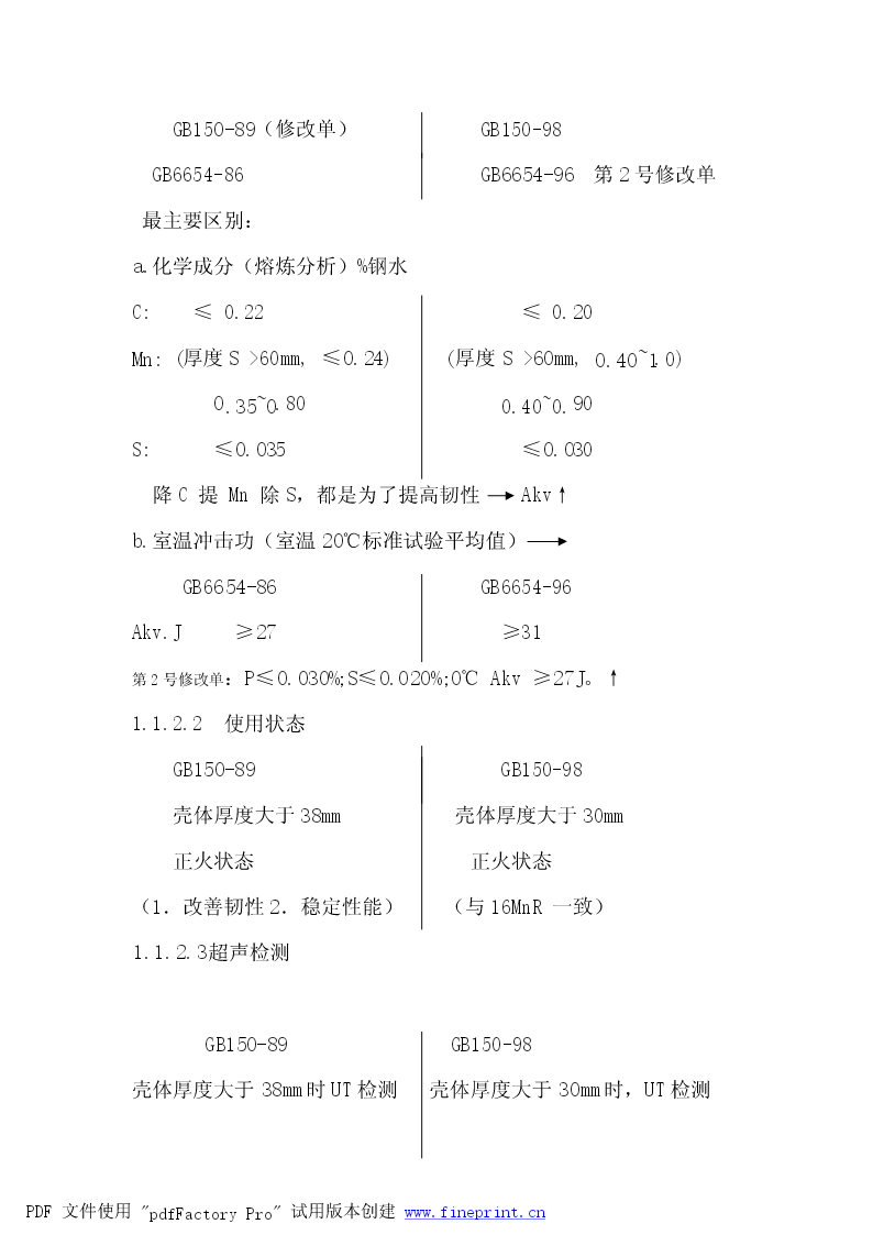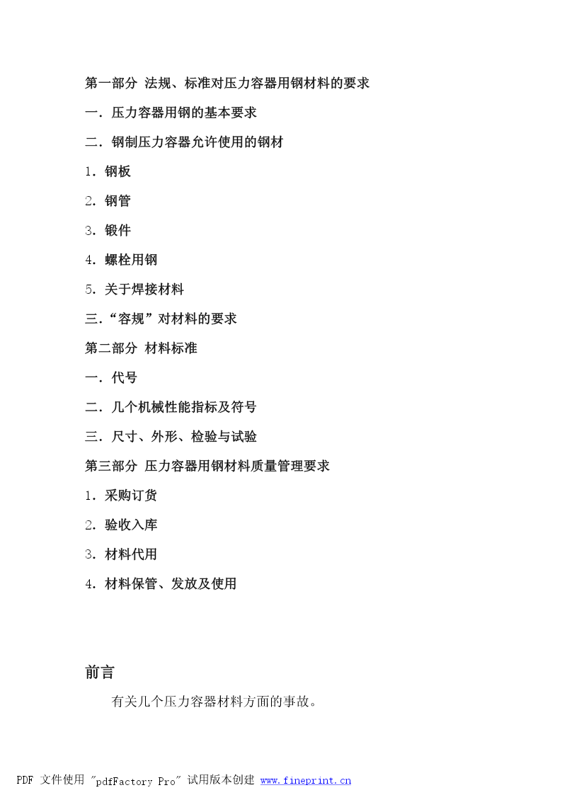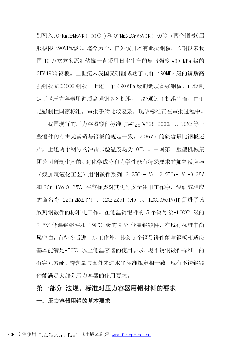 钢制压力容器材料讲义(压力容器制造厂产品检验员学习班用)2000.6.2002.6.2003.11.5修改2005.6.5修改大连市锅炉压力容器检验研究所刘溢恩手稿目录前言PDF文件使用"pdfFactoryPro"试用版本创建www.fineprint.cn第一部分法规、标准对压力容器用钢材料的要求一.压力容器用钢的基本要求二.钢制压力容器允许使用的钢材1.钢板2.钢管3.锻件4.螺栓用钢5.关于焊接材料三.“容规”对材料的要求第二部分材料标准一.代号二.几个机械性能指标及符号三.尺寸、外形、检验与试验第三部分压力容器用钢材料质量管理要求1.采购订货2.验收入库3.材料代用4.材料保管、发放及使用前言有关几个压力容器材料方面的事故。PDF文件使用"pdfFactoryPro"试用版本创建www.fineprint.cn2003年11月国家宣布撤销原锅炉标准化技术委员会、压力容器标准化技术委员会,其工作纳入相关的锅炉压力容器标准化技术委员会。近二十多年来,从1984年成立原压力容器标准化技术委员会到后来的锅炉压力容器标准化技术委员会。对压力容器用钢的标准工作一直十分重视,主动提出并积极协助冶金行业制修订压力容器用钢板标准,认真规划并及时组织制修订压力容器用锻件标准。近二十多年来,我国压力容器用钢标准的技术水平有了很大提高。如:我国的GB6654-1996《压力容器用钢板》标准及第1号、第2号修改单,将钢号中的硫、磷含量(熔炼分析)予以加严,对大部分的钢板冲击试验温度由20℃改为0℃,从标准的重要技术指标来看,现行的GB6654标准的技术水平已处于国际先进水平。GB3531-1996《低温压力容器用低合金钢钢板》及第1号修改单,从冲击功指标(Akv)与国外相近的钢号相比我国的16MnDR钢板仍存在一定的差距。而我国的09MnNiDR钢板的主要技术指标优于国外先进水平的相近钢号。在压力容器用低温钢板中,国外还有-100℃级的3.5Ni钢板和-196℃级的9Ni钢板,在国内尚属空白,有待今后开展研究工作。为实现高参数球形储罐用钢板的国产化,上世纪80年代中期国内有关单位联合开发屈服强度490MPa级的低焊接裂纹敏感性钢,该钢不仅有较高的强度,同时还具有优良的焊接性能和低温韧性,首先在氢气球形储罐上得到应用,在GB150-98根据其使用的低温温度分PDF文件使用"pdfFactoryPro"试用版本创建www.fineprint.cn别列入:07MnCrMoVR(-20℃)和07MnNiCrMoVDR(-40℃)两个钢号(屈服极限490MPa级)。迄今为止,国外仅日本有此类钢板。长期以来我国10万立方米原油储罐一直采用日本生产的屈服强度490MPa级的SPV490Q钢板。上世纪末我国又研制成功了同样490MPa级的调质高强钢板WH610D2钢板。上述三个490MPa级的调质高强钢板,已经制定了《压力容器用调质高强钢版》标准,已经通过了标准审查,由于是强制性国家标准,审批手续比较复杂,现该标准正在审批过程中。我国现行的压力容器锻件标准JB4726~4728-2000,其16Mn等一些锻件的有害元素磷与钢板的规定一致,20MnMo的硫含量比钢板还严,上述两个钢号的冲击试验温度均为0℃。中国第一重型机械集团公司研制生产的、对化学成分和力学性能有特殊要求的加氢反应器(煤加氢液化工艺)用钢锻件系列2.25Cr-1Mo、2.25Cr-1Mo-0.25V和3Cr-1Mo-0.25V,在容标委对其进行安全注册工作中,经研究相应的命名为12Cr2Mo1(H)、12Cr2Mo1(H)t、12Cr3Mo1V(H)促进了该系列钢锻件的标准化工作。在低温钢锻件的5个钢号除-100℃级的3.5Ni低温钢锻件和-196℃级的9Ni低温钢锻件,在现行标准中尚属空白,有待今后进一步工作外,其余5个钢号锻件能与钢板相适应基本能满足-70℃以上低温容器的使用要求。现不锈钢锻件标准中的有害元素硫、磷含量与国外先进水平标准规定相一致,现有不锈钢锻件能满足大部分压力容器的使用要求。第一部分法规、标准对压力容器用钢材料的要求一.压力容器用钢的基本要求PDF文件使用"pdfFactoryPro"试用版本创建www.fineprint.cn1.压力容器受压元件用钢应符合GB150中