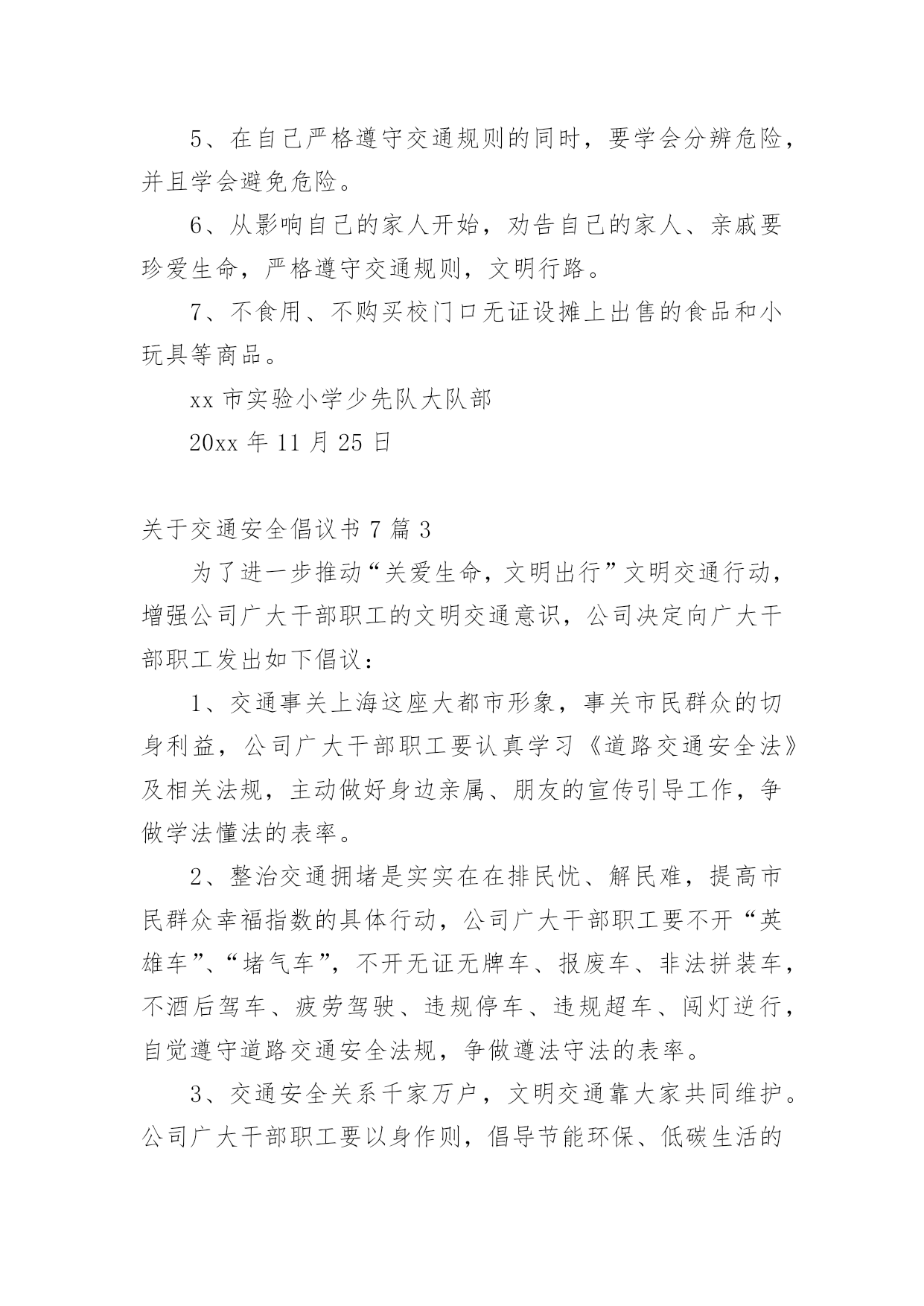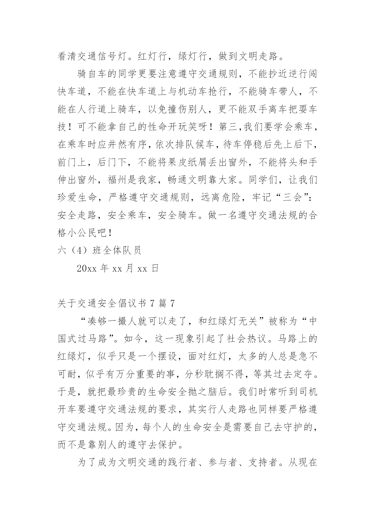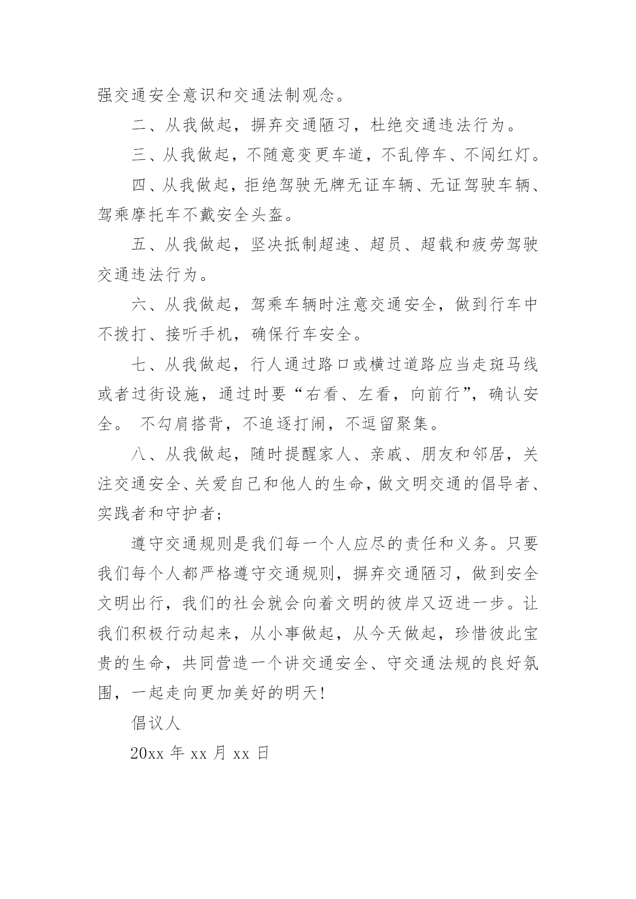 交通安全倡议书关于交通安全倡议书7篇在不断进步的时代,倡议书的使用频率越来越高,倡议书有利于倡议者交代清楚倡议活动的原因,以及当时的各种背景事实。相信许多人会觉得倡议书很难写吧,以下是小编整理的关于交通安全倡议书7篇,仅供参考,希望能够帮助到大家。关于交通安全倡议书7篇1广大交通参与者和驾驶员朋友们:20xx年春节即将来临,一年一度的春运道路交通安全保卫工作也已经拉开帷幕。今年的春运从1月24日至3月3日,历时40天。为切实加强春运道路交通安全管理,提高广大驾驶人自觉遵守道路交通安全法规的意识,努力预防和减少道路交通事故,确保春运期间不发生客运车辆重特大道路交通事故,为我县创造安全、有序、畅通的道路交通环境。垫江县公安局交警大队向广大交通参与者和驾驶人朋友特提出如下倡议:一、以高度的责任感和对人民群众生命财产负责的精神,积极参加春运交通安全工作,自觉参加春运交通安全教育培训,自觉学习和遵守《道路交通安全法》,服从企业和交通管理部门的安全管理。二、做到驾驶的车辆与驾驶证准驾车型相符。三、不酒后驾驶、不疲劳驾驶、不驾驶超员车辆、不驾驶超载车辆、不驾驶带病车上路行驶,低速载货汽车、三轮汽车不违法载客,杜绝各类交通违法行为,保证运送旅客安全。倡议人20xx年xx月xx日关于交通安全倡议书7篇2亲爱的同学们:随着社会的进步,人们的交通条件也日趋完善。可我们在享受这种便利的同时,也看到一些破坏交通秩序的行为:擅自闯红灯、乱穿马路、逆向行驶、双手脱把、互相飙车。由此,我们联想到每天上、下学时看到的危险状况:一些学校附近人行道被占用,一些车辆驾驶员和骑车人不让行人,一些骑自行车和助动车穿越红灯甚至逆向行驶,一些家长不顾川流的车辆带孩子闯红灯,不少学校每天上下学时,无证摊贩、接送孩子的车辆拥堵在校门口,使广大同学难以安全行走。为了你我的生命安全,xx市实验小学全体同学向xx的中小学生倡议:1、认真学习交通安全课程,牢牢树立安全行路的意识。2、严格遵守交通规则,做到文明行路:3、必须在人行道上行走,没有人行道的靠路边行走;4、不在马路上追逐打闹,急拐猛跑或游戏。5、在自己严格遵守交通规则的同时,要学会分辨危险,并且学会避免危险。6、从影响自己的家人开始,劝告自己的家人、亲戚要珍爱生命,严格遵守交通规则,文明行路。7、不食用、不购买校门口无证设摊上出售的食品和小玩具等商品。xx市实验小学少先队大队部20xx年11月25日关于交通安全倡议书7篇3为了进一步推动“关爱生命,文明出行”文明交通行动,增强公司广大干部职工的文明交通意识,公司决定向广大干部职工发出如下倡议:1、交通事关上海这座大都市形象,事关市民群众的切身利益,公司广大干部职工要认真学习《道路交通安全法》及相关法规,主动做好身边亲属、朋友的宣传引导工作,争做学法懂法的表率。2、整治交通拥堵是实实在在排民忧、解民难,提高市民群众幸福指数的具体行动,公司广大干部职工要不开“英雄车”、“堵气车”,不开无证无牌车、报废车、非法拼装车,不酒后驾车、疲劳驾驶、违规停车、违规超车、闯灯逆行,自觉遵守道路交通安全法规,争做遵法守法的表率。3、交通安全关系千家万户,文明交通靠大家共同维护。公司广大干部职工要以身作则,倡导节能环保、低碳生活的绿色健康生活理念,少开车、多走路、不添堵。积极加入文明交通志愿者队伍,参与文明交通公益活动;热情劝阻不文明交通行为,主动纠正交通违法者,叫响“跟我排”,争当志愿者服务的表率。治堵缓堵是考量一个城市管理水平和文明程度的重要标志,而保持良好的交通秩序则是上海这座国际化大都市的重要内容。相信拥有安全、畅通、和谐、有序的交通环境是大家的共同心愿。文明礼让,从我先行。让我们携起手来,从我做起,从现在做起,关爱生命,文明出行,对自己负责,对他人负责,对社会负责,发挥公司广大干部职工的示范带动作用,共同打造文明安全、畅通有序的交通环境,为徐汇区早日迈入全国文明城区行列争做贡献。倡议人:xxx20xx年xx月xx日关于交通安全倡议书7篇4各位市民:大家好今年12月2日是第三个“全国交通安全日”,今年的.主题是“摒弃交通陋习,安全文明出行”。在第三个“122”全国交通安全日到来之际,为积极营造全社会共同关注交通安全、倡导文明出行的浓厚氛围,市公安交警支队特发出如下倡议:一、从我做起,认真学习和遵守交通安全法律法规,增强交通安全意识和交通法制观念。二、从我做起,摒弃交通陋习,杜绝交通违法行为。三、从我做起,不随意变更车道,不乱停车、不闯红灯。四、从我做起,拒绝驾驶无牌无证车辆、无证驾驶车辆、驾乘摩托车不戴安全头盔。五、从我做起,坚决抵制超速、超员、超载和疲劳驾驶交通违法行为。六、从我做起,驾乘车辆时注意交通安全,做到行车中不拨打、接听手机,确保行车安全。七、从我做起,行人通过路口或横过道路