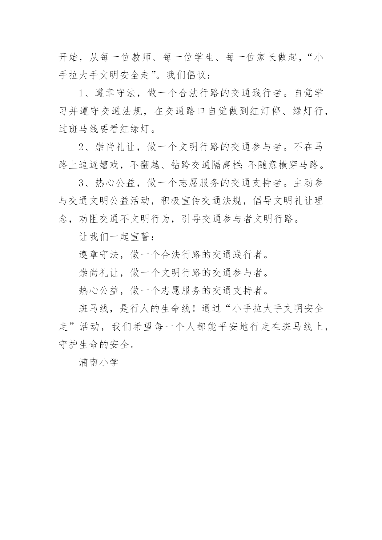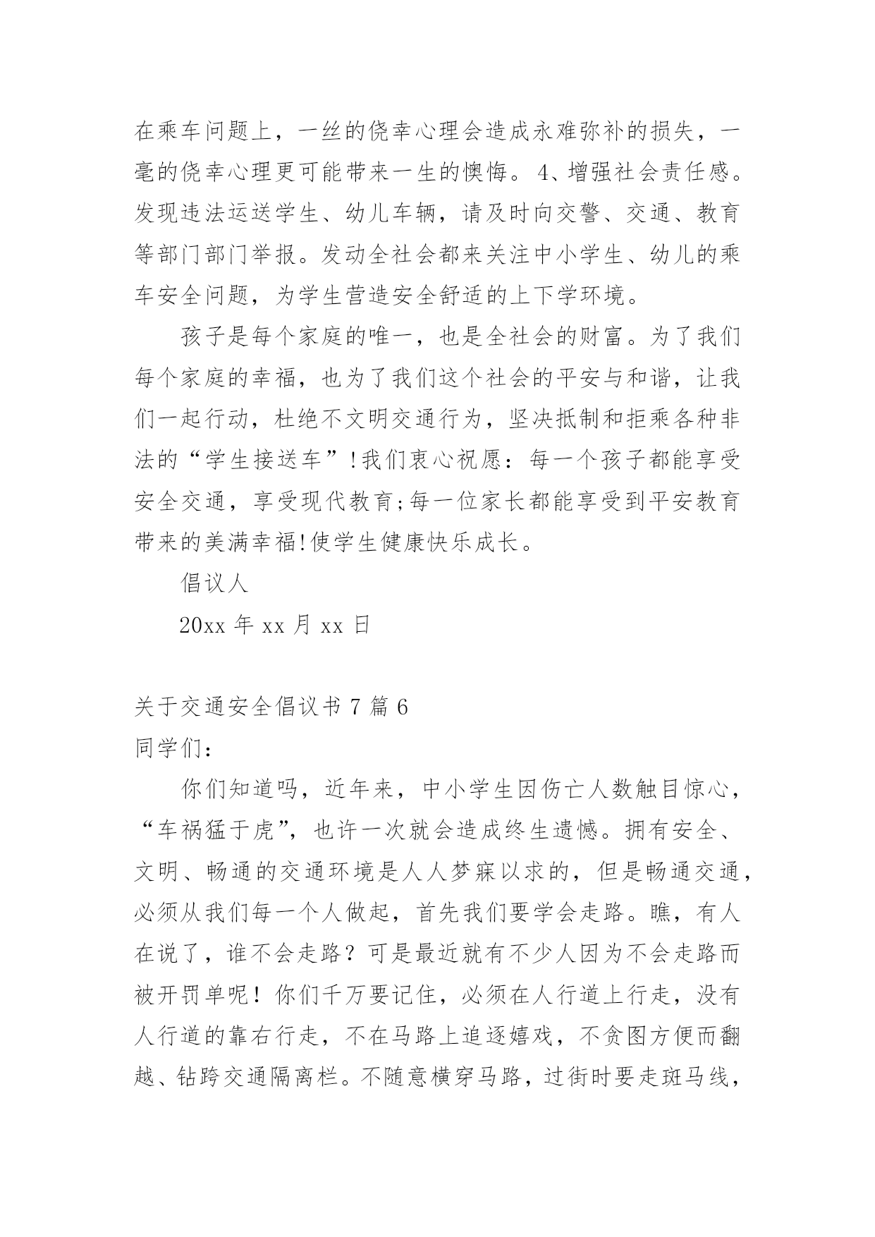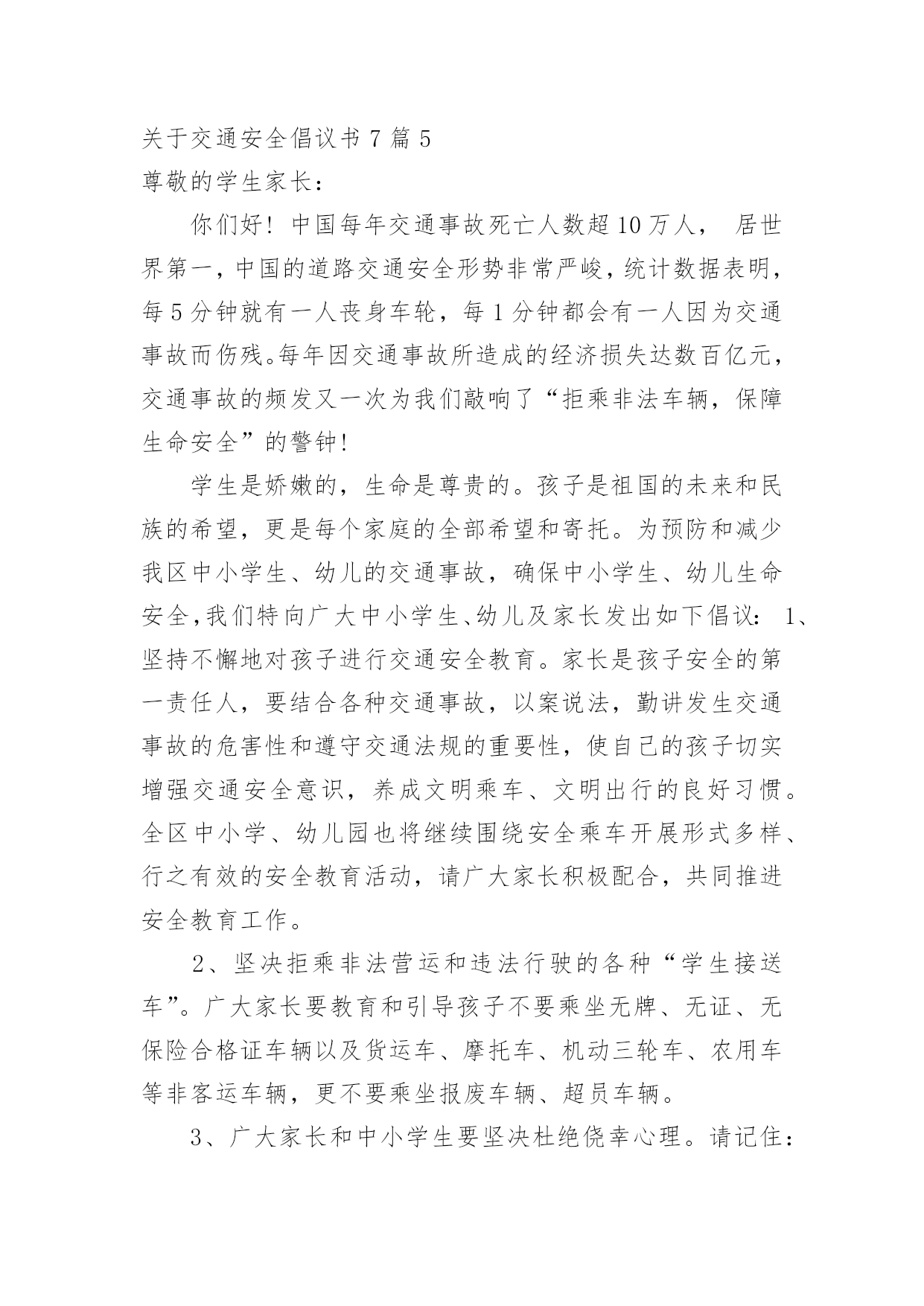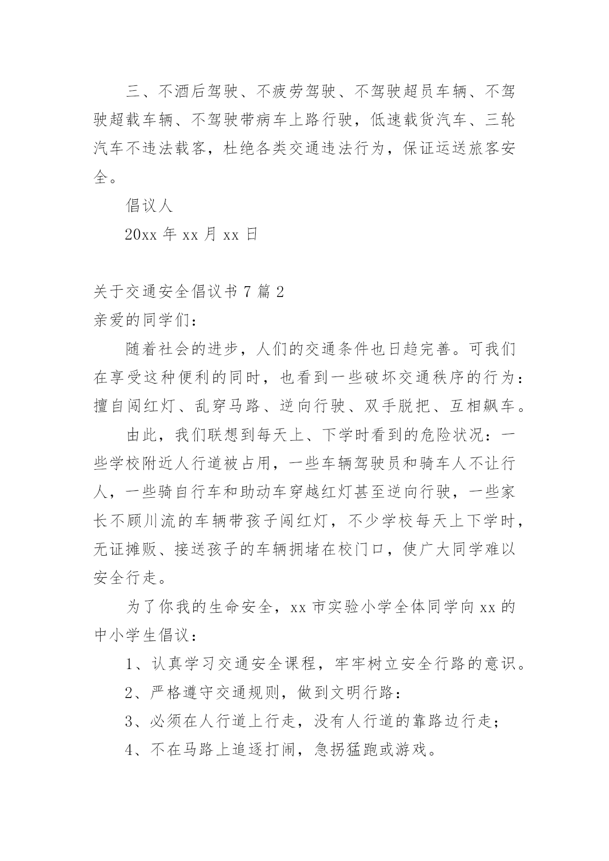 交通安全倡议书关于交通安全倡议书7篇在不断进步的时代,倡议书的使用频率越来越高,倡议书有利于倡议者交代清楚倡议活动的原因,以及当时的各种背景事实。相信许多人会觉得倡议书很难写吧,以下是小编整理的关于交通安全倡议书7篇,仅供参考,希望能够帮助到大家。关于交通安全倡议书7篇1广大交通参与者和驾驶员朋友们:20xx年春节即将来临,一年一度的春运道路交通安全保卫工作也已经拉开帷幕。今年的春运从1月24日至3月3日,历时40天。为切实加强春运道路交通安全管理,提高广大驾驶人自觉遵守道路交通安全法规的意识,努力预防和减少道路交通事故,确保春运期间不发生客运车辆重特大道路交通事故,为我县创造安全、有序、畅通的道路交通环境。垫江县公安局交警大队向广大交通参与者和驾驶人朋友特提出如下倡议:一、以高度的责任感和对人民群众生命财产负责的精神,积极参加春运交通安全工作,自觉参加春运交通安全教育培训,自觉学习和遵守《道路交通安全法》,服从企业和交通管理部门的安全管理。二、做到驾驶的车辆与驾驶证准驾车型相符。三、不酒后驾驶、不疲劳驾驶、不驾驶超员车辆、不驾驶超载车辆、不驾驶带病车上路行驶,低速载货汽车、三轮汽车不违法载客,杜绝各类交通违法行为,保证运送旅客安全。倡议人20xx年xx月xx日关于交通安全倡议书7篇2亲爱的同学们:随着社会的进步,人们的交通条件也日趋完善。可我们在享受这种便利的同时,也看到一些破坏交通秩序的行为:擅自闯红灯、乱穿马路、逆向行驶、双手脱把、互相飙车。由此,我们联想到每天上、下学时看到的危险状况:一些学校附近人行道被占用,一些车辆驾驶员和骑车人不让行人,一些骑自行车和助动车穿越红灯甚至逆向行驶,一些家长不顾川流的车辆带孩子闯红灯,不少学校每天上下学时,无证摊贩、接送孩子的车辆拥堵在校门口,使广大同学难以安全行走。为了你我的生命安全,xx市实验小学全体同学向xx的中小学生倡议:1、认真学习交通安全课程,牢牢树立安全行路的意识。2、严格遵守交通规则,做到文明行路:3、必须在人行道上行走,没有人行道的靠路边行走;4、不在马路上追逐打闹,急拐猛跑或游戏。5、在自己严格遵守交通规则的同时,要学会分辨危险,并且学会避免危险。6、从影响自己的家人开始,劝告自己的家人、亲戚要珍爱生命,严格遵守交通规则,文明行路。7、不食用、不购买校门口无证设摊上出售的食品和小玩具等商品。xx市实验小学少先队大队部20xx年11月25日关于交通安全倡议书7篇3为了进一步推动“关爱生命,文明出行”文明交通行动,增强公司广大干部职工的文明交通意识,公司决定向广大干部职工发出如下倡议:1、交通事关上海这座大都市形象,事关市民群众的切身利益,公司广大干部职工要认真学习《道路交通安全法》及相关法规,主动做好身边亲属、朋友的宣传引导工作,争做学法懂法的表率。2、整治交通拥堵是实实在在排民忧、解民难,提高市民群众幸福指数的具体行动,公司广大干部职工要不开“英雄车”、“堵气车”,不开无证无牌车、报废车、非法拼装车,不酒后驾车、疲劳驾驶、违规停车、违规超车、闯灯逆行,自觉遵守道路交通安全法规,争做遵法守法的表率。3、交通安全关系千家万户,文明交通靠大家共同维护。公司广大干部职工要以身作则,倡导节能环保、低碳生活的绿色健康生活理念,少开车、多走路、不添堵。积极加入文明交通志愿者队伍,参与文明交通公益活动;热情劝阻不文明交通行为,主动纠正交通违法者,叫响“跟我排”,争当志愿者服务的表率。治堵缓堵是考量一个城市管理水平和文明程度的重要标志,而保持良好的交通秩序则是上海这座国际化大都市的重要内容。相信拥有安全、畅通、和谐、有序的交通环境是大家的共同心愿。文明礼让,从我先行。让我们携起手来,从我做起,从现在做起,关爱生命,文明出行,对自己负责,对他人负责,对社会负责,发挥公司广大干部职工的示范带动作用,共同打造文明安全、畅通有序的交通环境,为徐汇区早日迈入全国文明城区行列争做贡献。倡议人:xxx20xx年xx月xx日关于交通安全倡议书7篇4各位市民:大家好今年12月2日是第三个“全国交通安全日”,今年的.主题是“摒弃交通陋习,安全文明出行”。在第三个“122”全国交通安全日到来之际,为积极营造全社会共同关注交通安全、倡导文明出行的浓厚氛围,市公安交警支队特发出如下倡议:一、从我做起,认真学习和遵守交通安全法律法规,增强交通安全意识和交通法制观念。二、从我做起,摒弃交通陋习,杜绝交通违法行为。三、从我做起,不随意变更车道,不乱停车、不闯红灯。四、从我做起,拒绝驾驶无牌无证车辆、无证驾驶车辆、驾乘摩托车不戴安全头盔。五、从我做起,坚决抵制超速、超员、超载和疲劳驾驶交通违法行为。六、从我做起,驾乘车辆时注意交通安全,做到行车中不拨打、接听手机,确保行车安全。七、从我做起,行人通过路口或横过道路