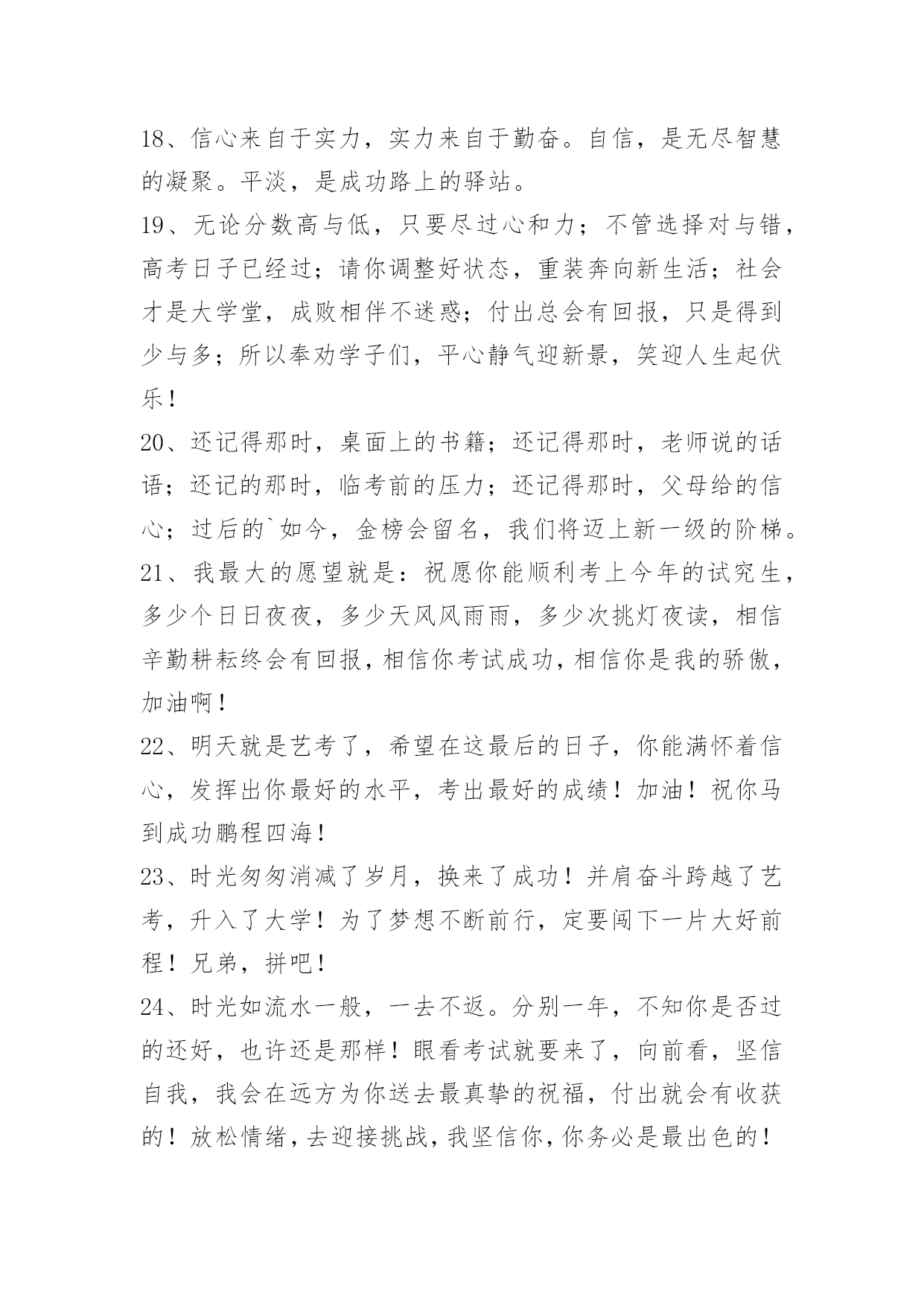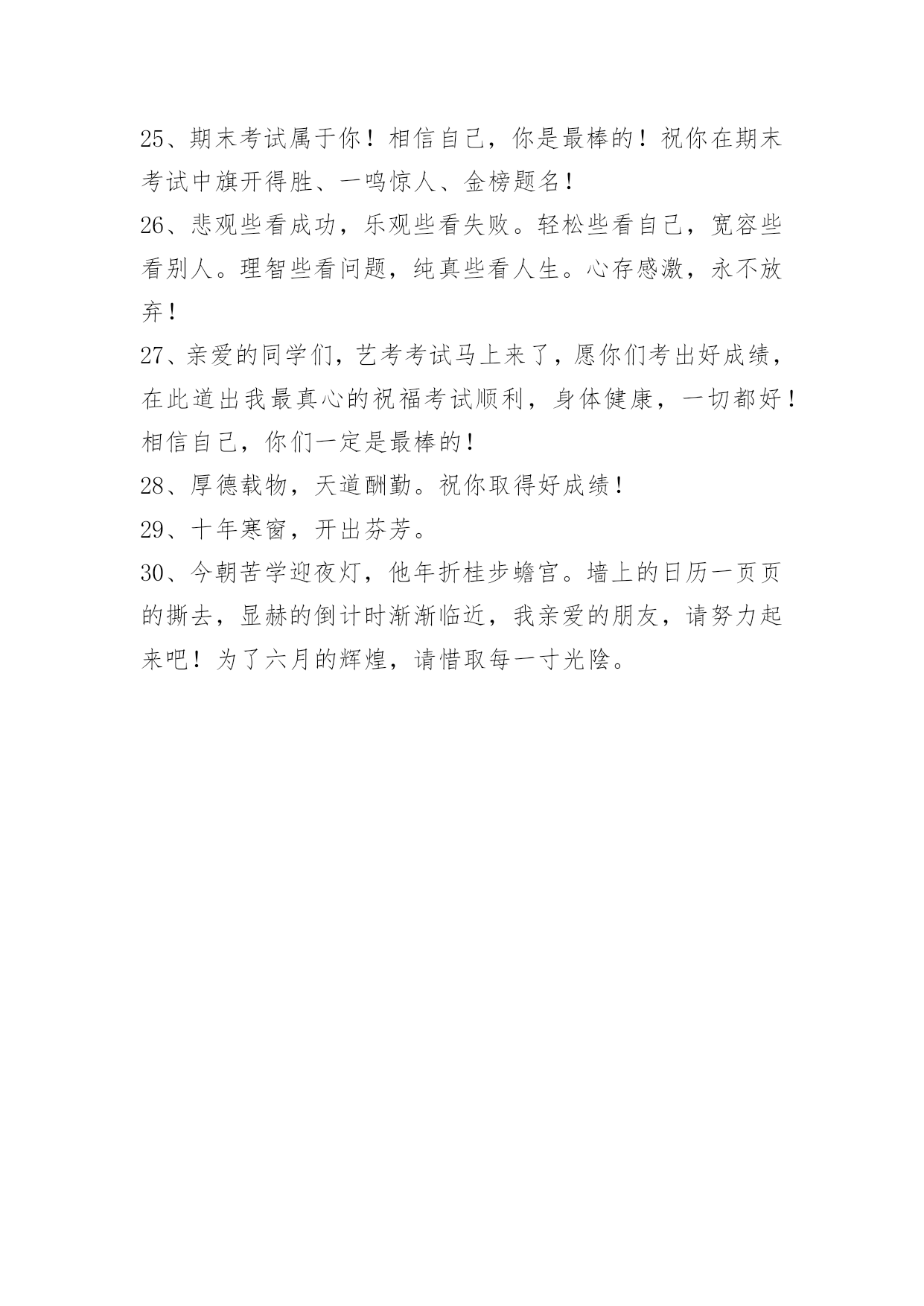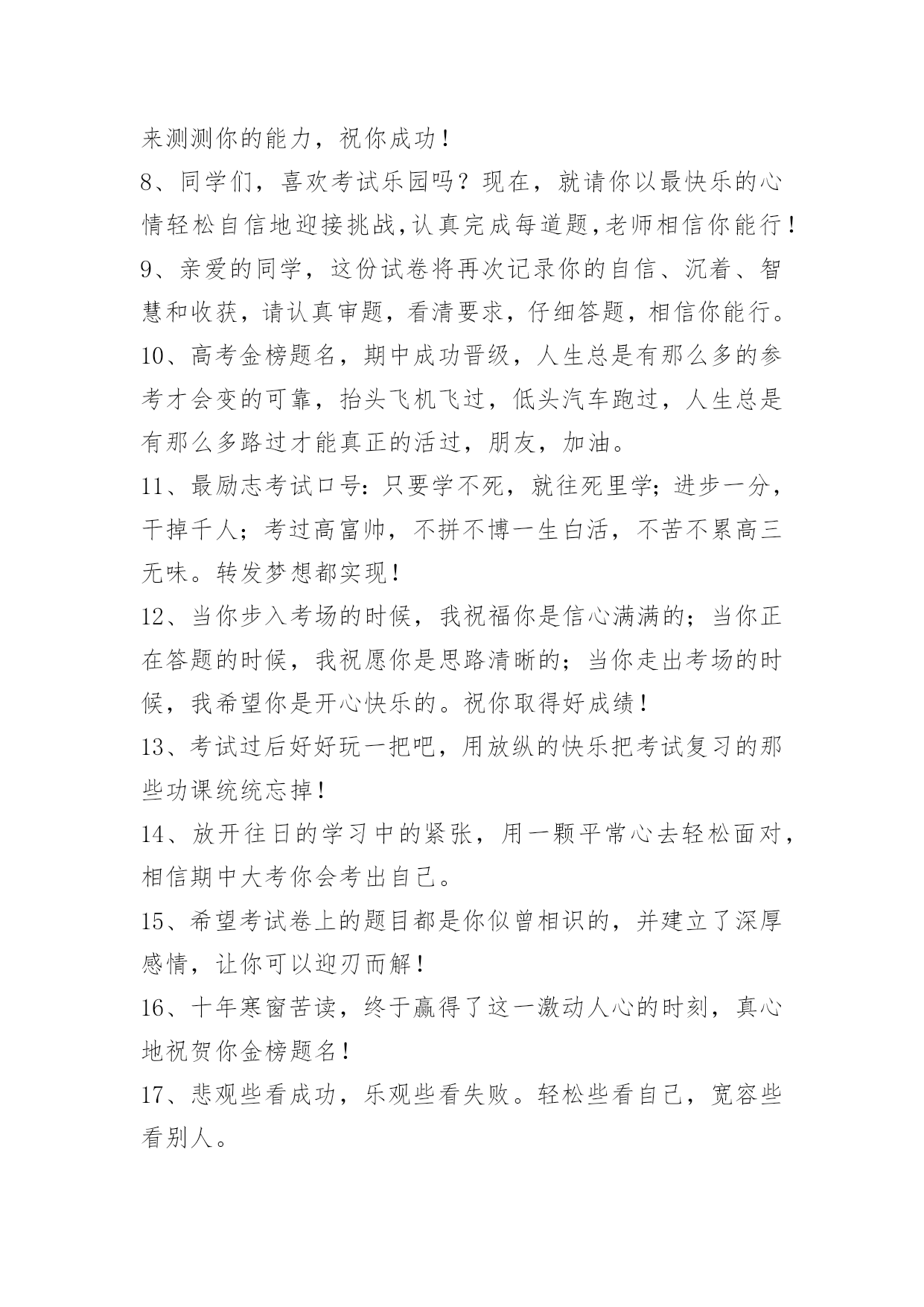 经典考试顺利祝福文案经典考试顺利祝福文案(精选30句)放下包袱开动脑筋,勤于思考好好复习,预祝你考试取得好成绩!以下是小编帮大家整理的考试顺利祝福文案,希望能够帮助到大家。1、量变到质变,努力奠定基础;开花到结果,坚持终能收获;过程到成功,态度决定一切。高考到,饭吃好,觉睡好,才能考的更好2、加油呀!兄弟姐妹们,别忘了还有我们在远方为你们祝福、加油!考试榜上有名!3、燃起他人希望之火,重塑他人自信之心。同学们,相信自己,你是最棒的!4、祝所有的高考考生们可以考到自己理想的大学!加油哦!5、阅读了它,精神爽,下笔如神写华章;保存了它,智慧长,所有难题被扫光;转发了它,运气旺,金榜题名响当当!预祝:考试时能超水平发挥,考出让所有人都瞠目结舌的优异成绩!6、挥一挥手,送你先走,我的潇洒微笑,但愿你永远记住。期中考试如期而至,希望你我高中,相约在理想的学校里再见!7、很高兴认识你——我们班的学习小能手。通过这一段的复习,你一定又有不少收获吧!今天就请你走进这次考试,来测测你的能力,祝你成功!8、同学们,喜欢考试乐园吗?现在,就请你以最快乐的心情轻松自信地迎接挑战,认真完成每道题,老师相信你能行!9、亲爱的同学,这份试卷将再次记录你的自信、沉着、智慧和收获,请认真审题,看清要求,仔细答题,相信你能行。10、高考金榜题名,期中成功晋级,人生总是有那么多的参考才会变的可靠,抬头飞机飞过,低头汽车跑过,人生总是有那么多路过才能真正的活过,朋友,加油。11、最励志考试口号:只要学不死,就往死里学;进步一分,干掉千人;考过高富帅,不拼不博一生白活,不苦不累高三无味。转发梦想都实现!12、当你步入考场的时候,我祝福你是信心满满的;当你正在答题的时候,我祝愿你是思路清晰的;当你走出考场的时候,我希望你是开心快乐的。祝你取得好成绩!13、考试过后好好玩一把吧,用放纵的快乐把考试复习的那些功课统统忘掉!14、放开往日的学习中的紧张,用一颗平常心去轻松面对,相信期中大考你会考出自己。15、希望考试卷上的题目都是你似曾相识的,并建立了深厚感情,让你可以迎刃而解!16、十年寒窗苦读,终于赢得了这一激动人心的时刻,真心地祝贺你金榜题名!17、悲观些看成功,乐观些看失败。轻松些看自己,宽容些看别人。18、信心来自于实力,实力来自于勤奋。自信,是无尽智慧的凝聚。平淡,是成功路上的驿站。19、无论分数高与低,只要尽过心和力;不管选择对与错,高考日子已经过;请你调整好状态,重装奔向新生活;社会才是大学堂,成败相伴不迷惑;付出总会有回报,只是得到少与多;所以奉劝学子们,平心静气迎新景,笑迎人生起伏乐!20、还记得那时,桌面上的书籍;还记得那时,老师说的话语;还记的那时,临考前的压力;还记得那时,父母给的信心;过后的`如今,金榜会留名,我们将迈上新一级的阶梯。21、我最大的愿望就是:祝愿你能顺利考上今年的试究生,多少个日日夜夜,多少天风风雨雨,多少次挑灯夜读,相信辛勤耕耘终会有回报,相信你考试成功,相信你是我的骄傲,加油啊!22、明天就是艺考了,希望在这最后的日子,你能满怀着信心,发挥出你最好的水平,考出最好的成绩!加油!祝你马到成功鹏程四海!23、时光匆匆消减了岁月,换来了成功!并肩奋斗跨越了艺考,升入了大学!为了梦想不断前行,定要闯下一片大好前程!兄弟,拼吧!24、时光如流水一般,一去不返。分别一年,不知你是否过的还好,也许还是那样!眼看考试就要来了,向前看,坚信自我,我会在远方为你送去最真挚的祝福,付出就会有收获的!放松情绪,去迎接挑战,我坚信你,你务必是最出色的!25、期末考试属于你!相信自己,你是最棒的!祝你在期末考试中旗开得胜、一鸣惊人、金榜题名!26、悲观些看成功,乐观些看失败。轻松些看自己,宽容些看别人。理智些看问题,纯真些看人生。心存感激,永不放弃!27、亲爱的同学们,艺考考试马上来了,愿你们考出好成绩,在此道出我最真心的祝福考试顺利,身体健康,一切都好!相信自己,你们一定是最棒的!28、厚德载物,天道酬勤。祝你取得好成绩!29、十年寒窗,开出芬芳。30、今朝苦学迎夜灯,他年折桂步蟾宫。墙上的日历一页页的撕去,显赫的倒计时渐渐临近,我亲爱的朋友,请努力起来吧!为了六月的辉煌,请惜取每一寸光陰。