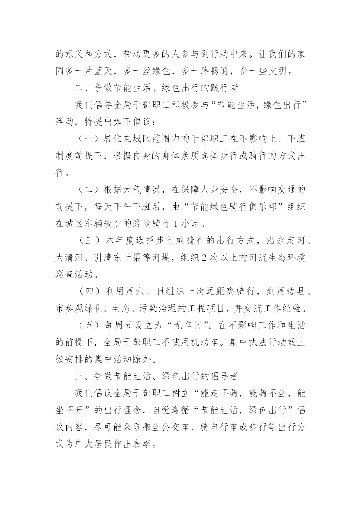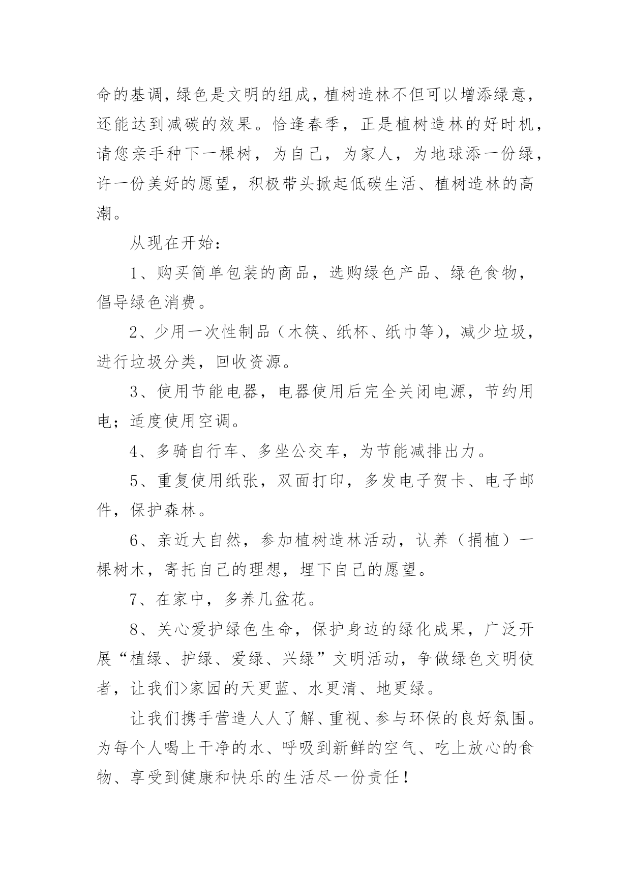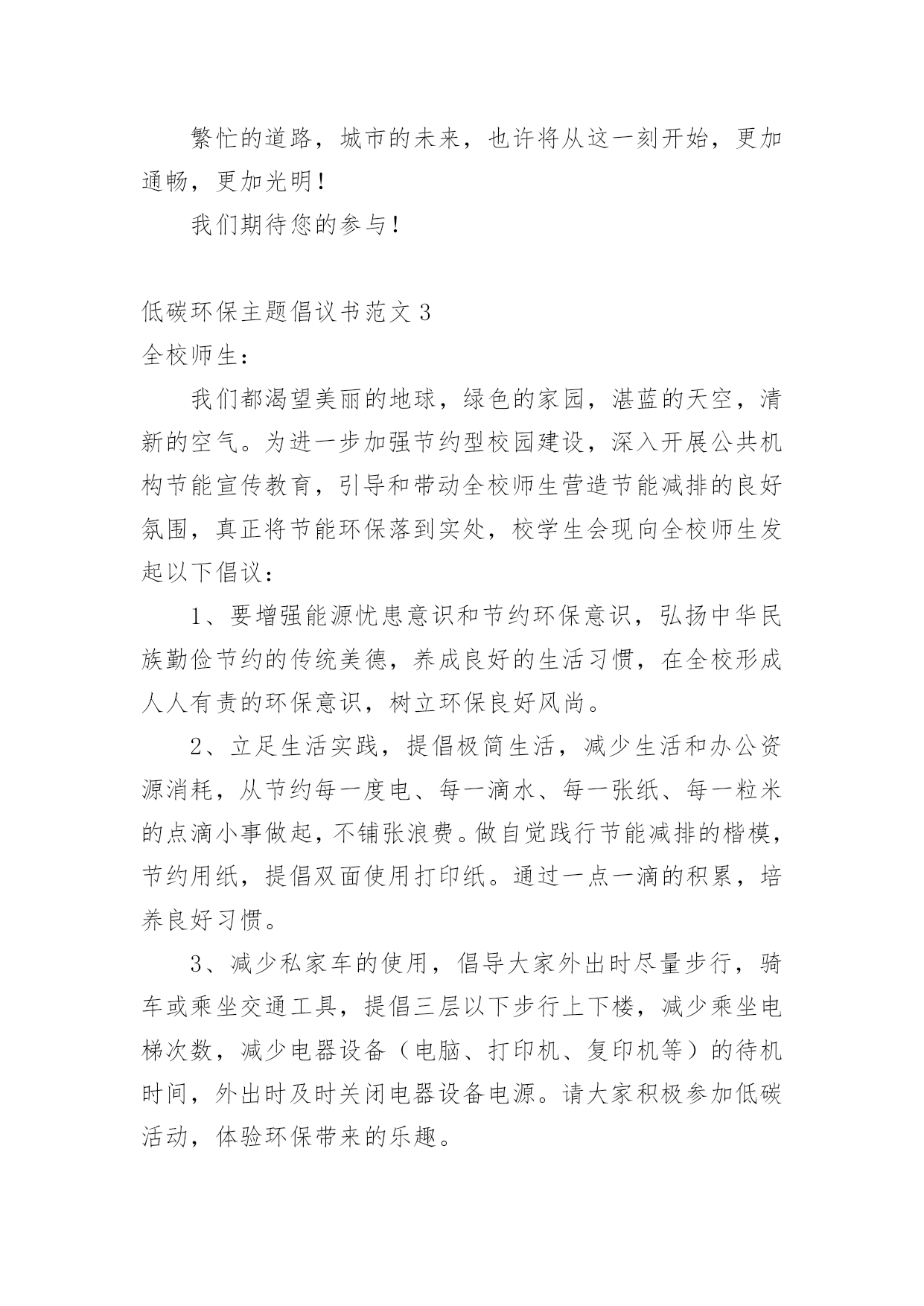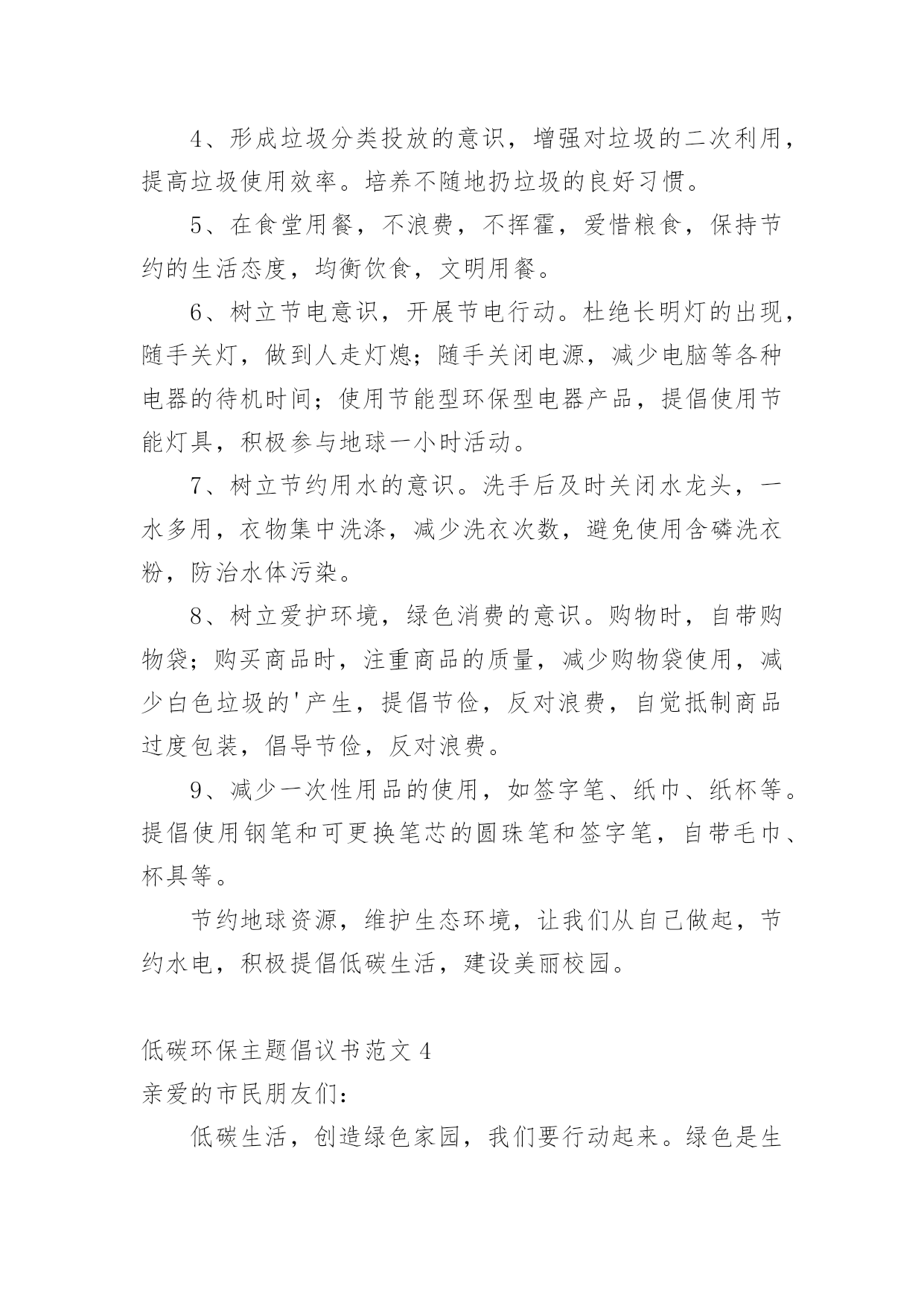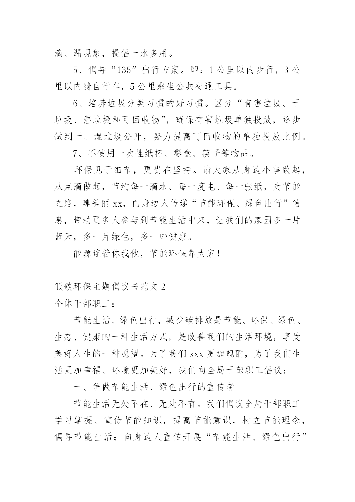 低碳环保主题倡议书低碳环保主题倡议书范文在日常生活和工作中,需要使用倡议书的事情愈发增多,倡议书本身不具有很强的约束力,有关人员可以表示响应,也可以不表示响应。怎么写倡议书才能避免踩雷呢?以下是小编收集整理的低碳环保主题倡议书范文,仅供参考,希望能够帮助到大家。低碳环保主题倡议书范文1亲爱同学们:大家好!为全面加强生态环境保护,大力倡导勤俭节约社会风尚,培养绿色办公、绿色生活的良好习惯,发挥公共机构的表率作用,现向全体同学发出倡议如下:1、充分利用自然通风和采光,严格执行空调节能管理有关规定。夏季温度设置不得低于26摄氏度,冬季温度设置不得高于20摄氏度,运行期间禁止开窗。2、倡导绿色办公。采购办公用品严格执行绿色采购标准,鼓励使用再生纸、笔、鼓粉盒等办公用品,纸张双面打印。3、长时间离开教室,请关闭照明灯具、空调、办公设备电源。4、节约用水。使用水龙头后请及时关闭,杜绝跑、冒、滴、漏现象,提倡一水多用。5、倡导“135”出行方案。即:1公里以内步行,3公里以内骑自行车,5公里乘坐公共交通工具。6、培养垃圾分类习惯的好习惯。区分“有害垃圾、干垃圾、湿垃圾和可回收物”,确保有害垃圾单独投放,逐步做到干、湿垃圾分开,努力提高可回收物的单独投放比例。7、不使用一次性纸杯、餐盒、筷子等物品。环保见于细节,更贵在坚持。请大家从身边小事做起,从点滴做起,节约每一滴水、每一度电、每一张纸,走节能之路,建美丽xx,向身边人传递“节能环保、绿色出行”信息,带动更多人参与到节能生活中来,让我们的家园多一片蓝天,多一片绿色,多一些健康。能源连着你我他,节能环保靠大家!低碳环保主题倡议书范文2全体干部职工:节能生活、绿色出行,减少碳排放是节能、环保、绿色、生态、健康的一种生活方式,是改善我们的生活环境,享受美好人生的一种愿望。为了我们xxx更加靓丽,为了我们生活更加幸福、环境更加美好,我们向全局干部职工倡议:一、争做节能生活、绿色出行的宣传者节能生活无处不在、无处不有。我们倡议全局干部职工学习掌握、宣传节能知识,提高节能意识,树立节能理念,倡导节能生活;向身边人宣传开展“节能生活、绿色出行”的意义和方式,带动更多的人参与到行动中来。让我们的家园多一片蓝天,多一丝绿色,多一路畅通,多一些文明。二、争做节能生活、绿色出行的践行者我们倡导全局干部职工积极参与“节能生活,绿色出行”活动,特提出如下倡议:(一)居住在城区范围内的干部职工在不影响上、下班制度前提下,根据自身的身体素质选择步行或骑行的方式出行。(二)根据天气情况,在保障人身安全,不影响交通的前提下,每天下午下班后,由“节能绿色骑行俱乐部”组织在城区车辆较少的路段骑行1小时。(三)本年度选择步行或骑行的出行方式,沿永定河、大清河、引清东干渠等河堤,组织2次以上的河流生态环境巡查活动。(四)利用周六、日组织一次远距离骑行,到周边县、市参观绿化、生态、污染治理的工程项目,并交流工作经验。(五)每周五设立为“无车日”。在不影响工作和生活的前提下,全局干部职工不使用机动车。集中执法行动或上级安排的集中活动除外。三、争做节能生活、绿色出行的倡导者我们倡议全局干部职工树立“能走不骑,能骑不坐,能坐不开”的出行理念,自觉遵循“节能生活,绿色出行”倡议内容,尽可能采取乘坐公交车、骑自行车或步行等出行方式为广大居民作出表率。繁忙的道路,城市的未来,也许将从这一刻开始,更加通畅,更加光明!我们期待您的参与!低碳环保主题倡议书范文3全校师生:我们都渴望美丽的地球,绿色的家园,湛蓝的天空,清新的空气。为进一步加强节约型校园建设,深入开展公共机构节能宣传教育,引导和带动全校师生营造节能减排的良好氛围,真正将节能环保落到实处,校学生会现向全校师生发起以下倡议:1、要增强能源忧患意识和节约环保意识,弘扬中华民族勤俭节约的传统美德,养成良好的生活习惯,在全校形成人人有责的环保意识,树立环保良好风尚。2、立足生活实践,提倡极简生活,减少生活和办公资源消耗,从节约每一度电、每一滴水、每一张纸、每一粒米的点滴小事做起,不铺张浪费。做自觉践行节能减排的楷模,节约用纸,提倡双面使用打印纸。通过一点一滴的积累,培养良好习惯。3、减少私家车的使用,倡导大家外出时尽量步行,骑车或乘坐交通工具,提倡三层以下步行上下楼,减少乘坐电梯次数,减少电器设备(电脑、打印机、复印机等)的待机时间,外出时及时关闭电器设备电源。请大家积极参加低碳活动,体验环保带来的乐趣。4、形成垃圾分类投放的意识,增强对垃圾的二次利用,提高垃圾使用效率。培养不随地扔垃圾的良好习惯。5、在食堂用餐,不浪费,不挥霍,爱惜粮食,保持节约的生活态度,均衡饮食,文明用餐。6、树立节电意识,开展节电行动。杜绝长明灯的出现,随手关灯,做到人走灯熄;随手关闭电源,减少电脑等各种电器的待机时间