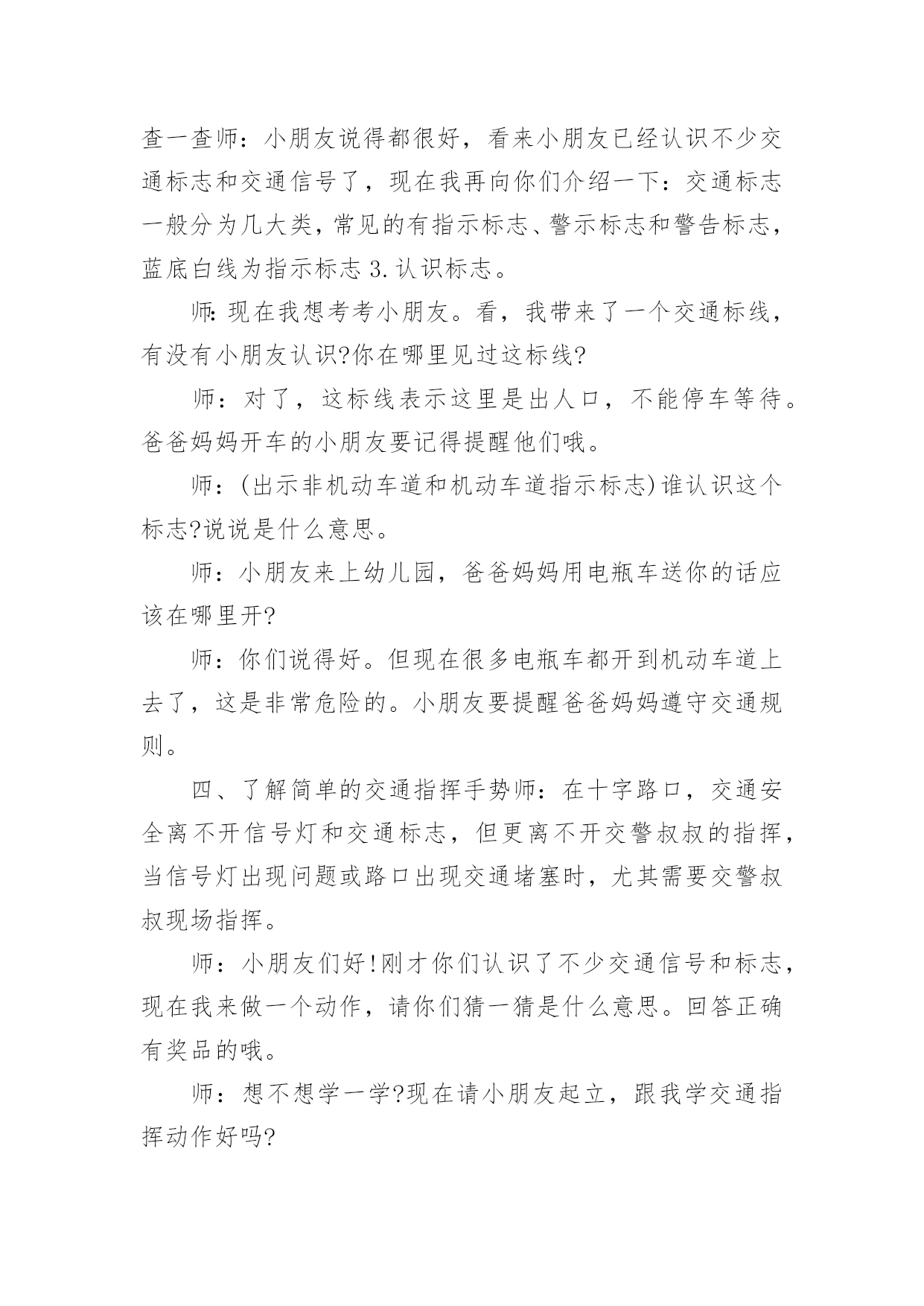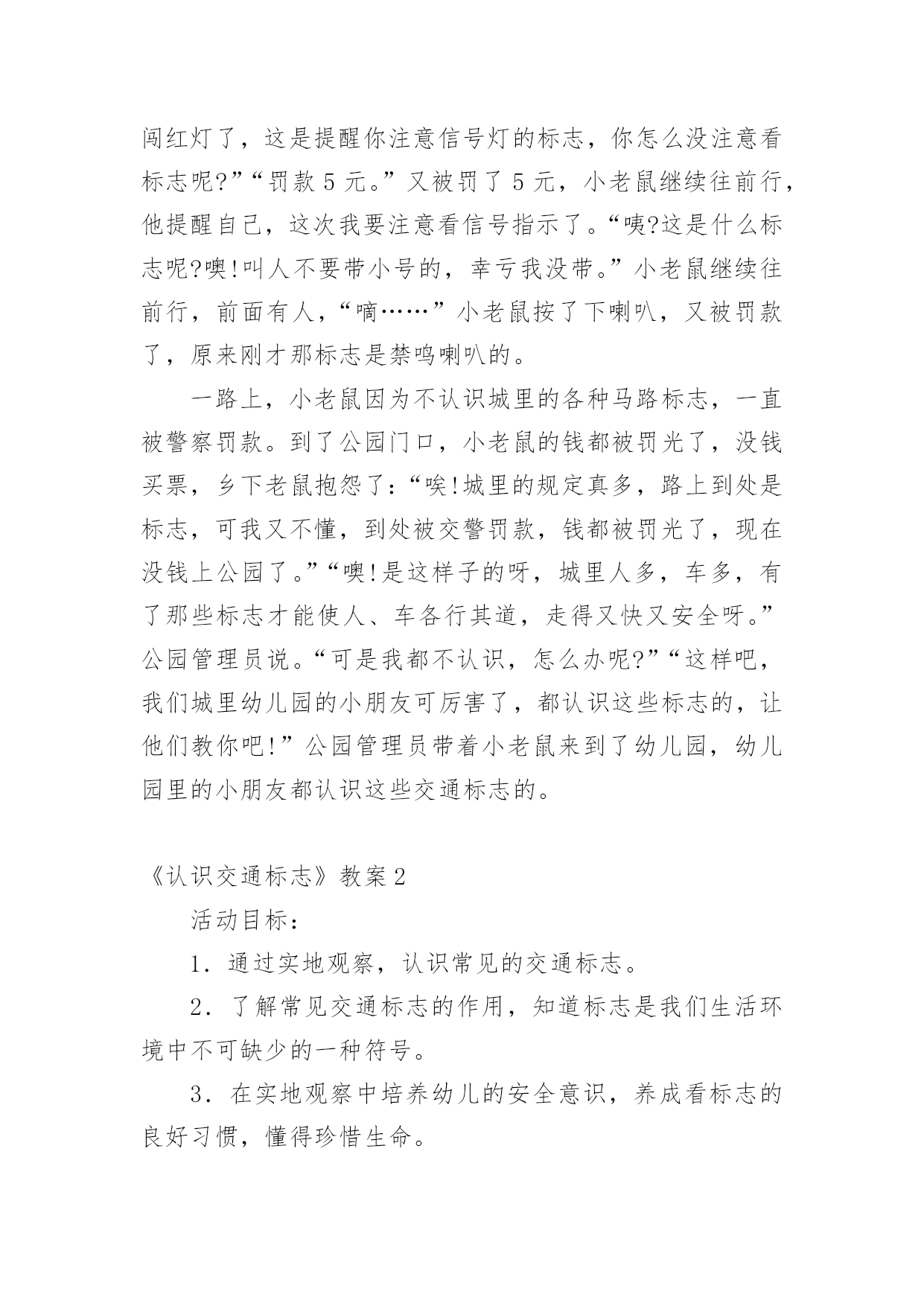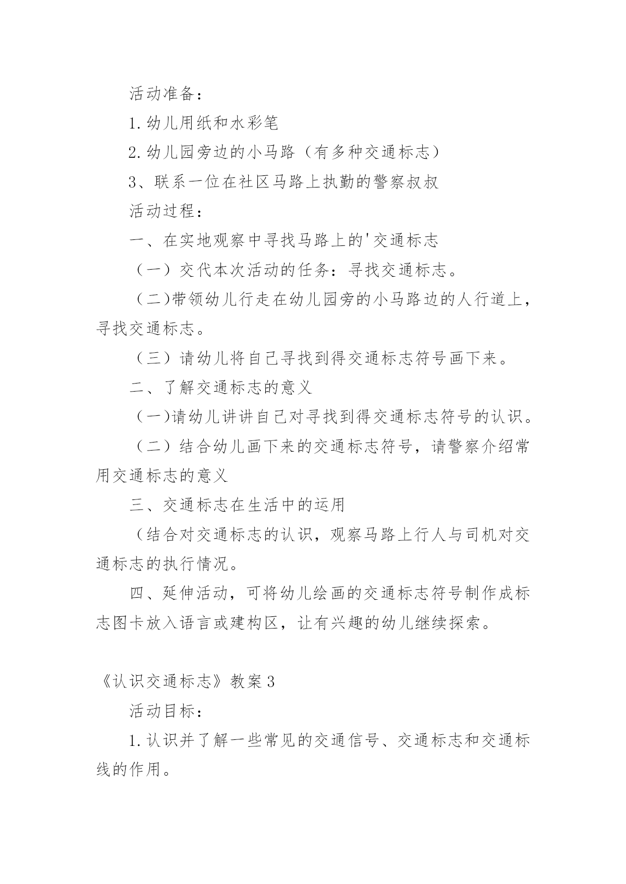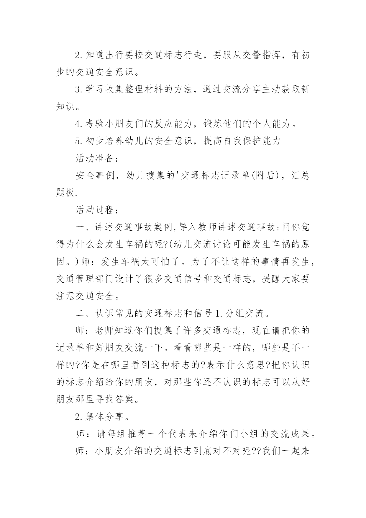 《认识交通标志》教案作为一名老师,时常需要编写教案,借助教案可以提高教学质量,收到预期的教学效果。那么应当如何写教案呢?以下是小编帮大家整理的《认识交通标志》教案,欢迎阅读,希望大家能够喜欢。《认识交通标志》教案1〔活动目标〕1、让幼儿知道汽车及其他交通工具行驶时都有特定的范围和特定的规则。2、使幼儿懂得人们必须自觉遵守交通规则,注意交通安全。3、引导幼儿认识各种交通标志。〔活动准备〕1、环境布置:①小环境布置一幅“热闹的马路”的主题墙饰。②室外创设一条“模拟马路”。2、知识准备:①幼儿对马路上的交通标志有了初步的感性认识。②幼儿已有一定的安全意识。3、物质准备:马路范图一张,小老鼠开车卡片一张,常见的交通标志一套,“人、汽车、自行车”等标志人手一个。〔活动过程〕1、故事引入。以故事《乡下老鼠逛公园》引入话题,教育幼儿认识各种标志。2、认识标志。以帮小老鼠的忙,逐一出示交通标志,提问:这是什么标志?标志上画有什么?表示什么意思?3、游戏:我指你说。老师指出某一交通标志,让幼儿说出该标志所代表的意思。4、游戏:过马路。让幼儿挂上各种交通标志,(人、或车)扮演各种交通工具,在模拟的`马路上亲身体验各种交通标志的作用。附故事:《乡下老鼠逛公园》有一只乡下老鼠新买了一辆小轿车,他整天开着它东逛逛、西玩玩。他听见松鼠们议论城里的公园可漂亮了:有成排的大树,五颜六色的鲜花,穿梭的人群,迷人的音乐会,还有香甜的蛋糕和诱人的饮料……他就想到城里的公园去看看。于是,乡下老鼠开着小轿车进城了。城里的一切让乡下老鼠看得眼花缭乱:马路上各种车子开得飞快,人们在马路中间穿来穿去,喇叭不停地响,车子不停地动,城里的路上还挂着各种各样不同的标志。乡下老鼠想:我到底应该走哪条路才能到公园呢?算了,我就随便走一条吧!想到这,乡下老鼠开着车向公园的方向走去了。他刚驶入一条路口,就被一名交警给拦下了,“什么事?”乡下老鼠问,“小老鼠,你违反了交通规则,这条路禁止汽车驶入。”“你看。”交警指着告示牌说:“你应该罚款5元。”小老鼠交了钱,又从原路退回,继续往前开,可一会儿又被交警拦下了,“又怎么了?”小老鼠又呐闷了,“小老鼠,你闯红灯了,这是提醒你注意信号灯的标志,你怎么没注意看标志呢?”“罚款5元。”又被罚了5元,小老鼠继续往前行,他提醒自己,这次我要注意看信号指示了。“咦?这是什么标志呢?噢!叫人不要带小号的,幸亏我没带。”小老鼠继续往前行,前面有人,“嘀……”小老鼠按了下喇叭,又被罚款了,原来刚才那标志是禁鸣喇叭的。一路上,小老鼠因为不认识城里的各种马路标志,一直被警察罚款。到了公园门口,小老鼠的钱都被罚光了,没钱买票,乡下老鼠抱怨了:“唉!城里的规定真多,路上到处是标志,可我又不懂,到处被交警罚款,钱都被罚光了,现在没钱上公园了。”“噢!是这样子的呀,城里人多,车多,有了那些标志才能使人、车各行其道,走得又快又安全呀。”公园管理员说。“可是我都不认识,怎么办呢?”“这样吧,我们城里幼儿园的小朋友可厉害了,都认识这些标志的,让他们教你吧!”公园管理员带着小老鼠来到了幼儿园,幼儿园里的小朋友都认识这些交通标志的。《认识交通标志》教案2活动目标:1.通过实地观察,认识常见的交通标志。2.了解常见交通标志的作用,知道标志是我们生活环境中不可缺少的一种符号。3.在实地观察中培养幼儿的安全意识,养成看标志的良好习惯,懂得珍惜生命。活动准备:1.幼儿用纸和水彩笔2.幼儿园旁边的小马路(有多种交通标志)3、联系一位在社区马路上执勤的警察叔叔活动过程:一、在实地观察中寻找马路上的'交通标志(一)交代本次活动的任务:寻找交通标志。(二)带领幼儿行走在幼儿园旁的小马路边的人行道上,寻找交通标志。(三)请幼儿将自己寻找到得交通标志符号画下来。二、了解交通标志的意义(一)请幼儿讲讲自己对寻找到得交通标志符号的认识。(二)结合幼儿画下来的交通标志符号,请警察介绍常用交通标志的意义三、交通标志在生活中的运用(结合对交通标志的认识,观察马路上行人与司机对交通标志的执行情况。四、延伸活动,可将幼儿绘画的交通标志符号制作成标志图卡放入语言或建构区,让有兴趣的幼儿继续探索。《认识交通标志》教案3活动目标:1.认识并了解一些常见的交通信号、交通标志和交通标线的作用。2.知道出行要按交通标志行走,要服从交警指挥,有初步的交通安全意识。3.学习收集整理材料的方法,通过交流分享主动获取新知识。4.考验小朋友们的反应能力,锻炼他们的个人能力。5.初步培养幼儿的安全意识,提高自我保护能力活动准备:安全事例,幼儿搜集的'交通标志记录单(附后),汇总题板.活动过程:一、讲述交通事故案例,导入教师讲述交通事故:问你觉得为什么会发生车祸的呢?(幼儿交流讨论可能发生车祸的原因。)师:发生车祸太可怕了。为了不让这样的