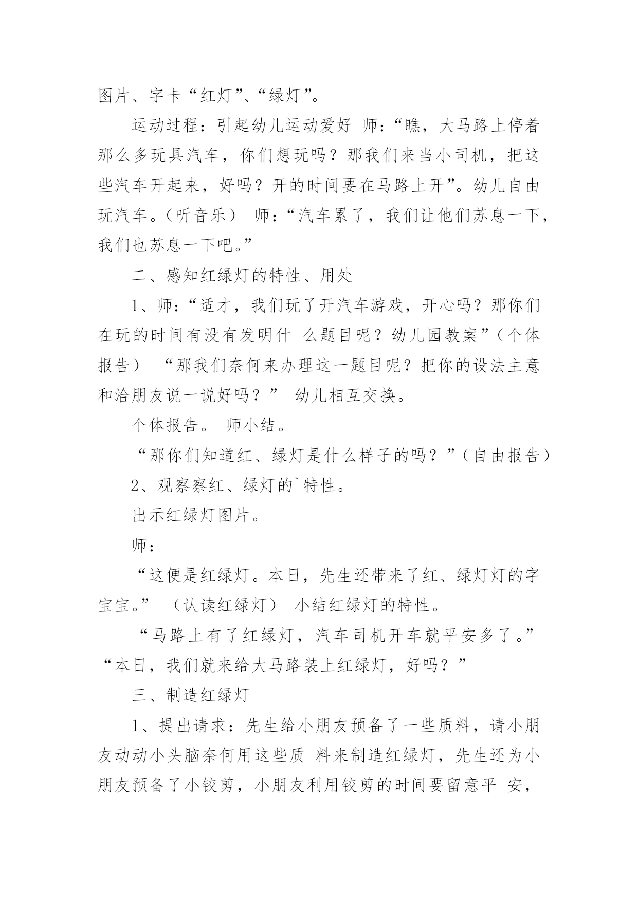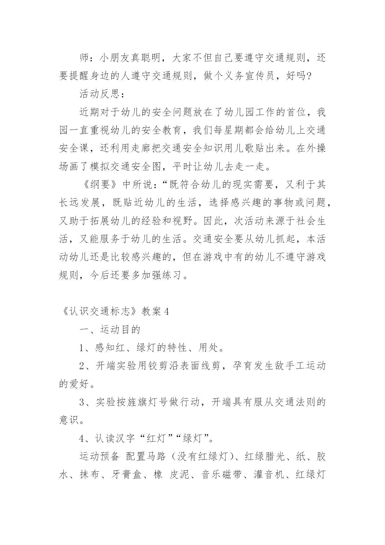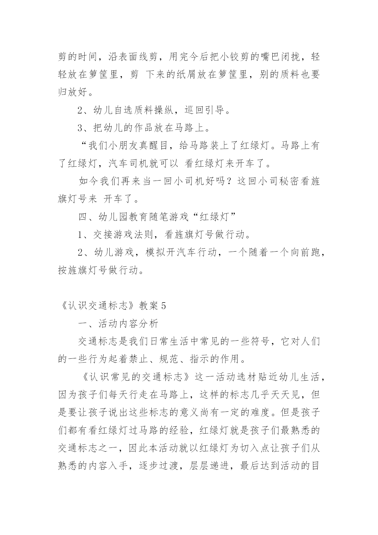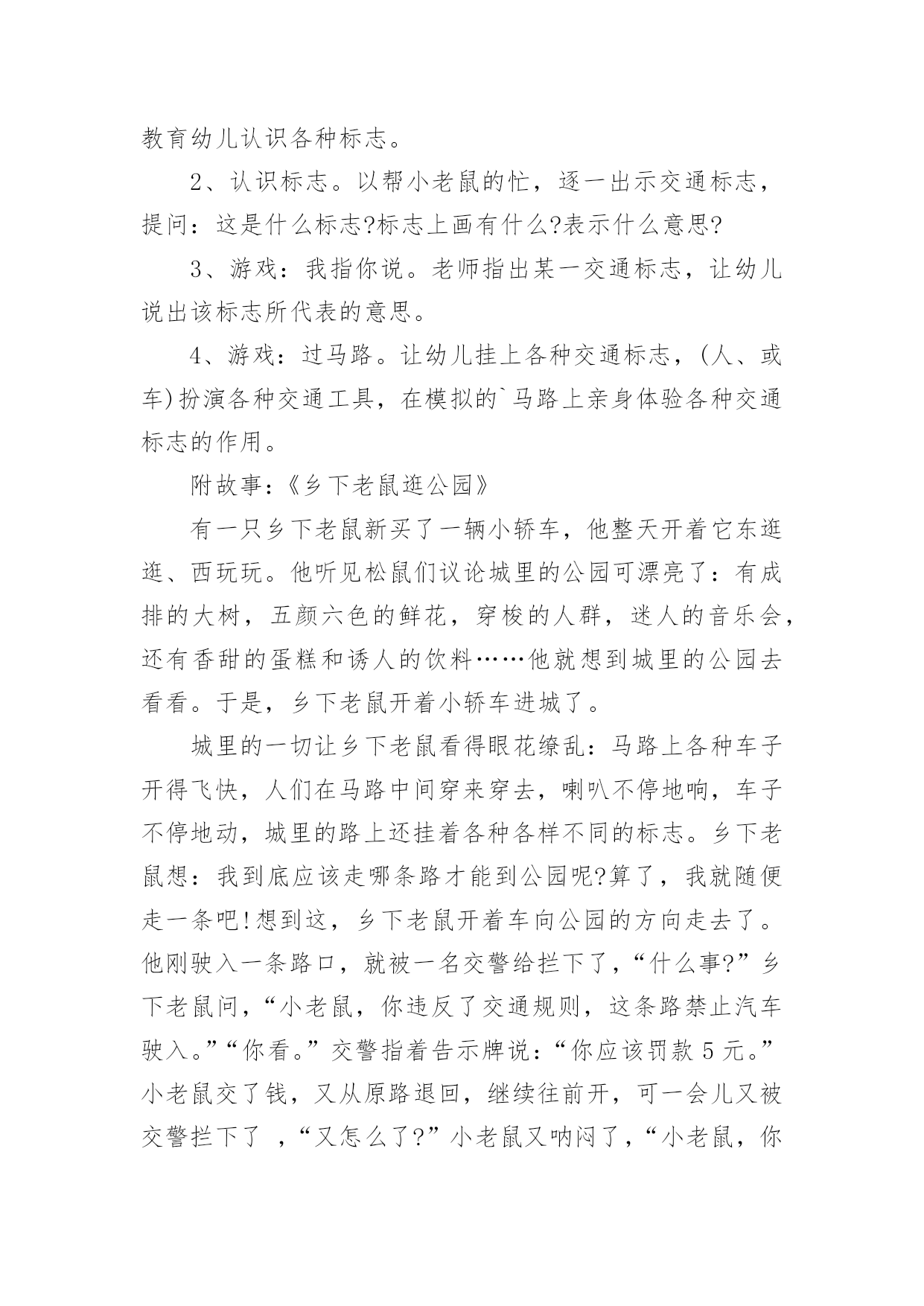 《认识交通标志》教案作为一名老师,时常需要编写教案,借助教案可以提高教学质量,收到预期的教学效果。那么应当如何写教案呢?以下是小编帮大家整理的《认识交通标志》教案,欢迎阅读,希望大家能够喜欢。《认识交通标志》教案1〔活动目标〕1、让幼儿知道汽车及其他交通工具行驶时都有特定的范围和特定的规则。2、使幼儿懂得人们必须自觉遵守交通规则,注意交通安全。3、引导幼儿认识各种交通标志。〔活动准备〕1、环境布置:①小环境布置一幅“热闹的马路”的主题墙饰。②室外创设一条“模拟马路”。2、知识准备:①幼儿对马路上的交通标志有了初步的感性认识。②幼儿已有一定的安全意识。3、物质准备:马路范图一张,小老鼠开车卡片一张,常见的交通标志一套,“人、汽车、自行车”等标志人手一个。〔活动过程〕1、故事引入。以故事《乡下老鼠逛公园》引入话题,教育幼儿认识各种标志。2、认识标志。以帮小老鼠的忙,逐一出示交通标志,提问:这是什么标志?标志上画有什么?表示什么意思?3、游戏:我指你说。老师指出某一交通标志,让幼儿说出该标志所代表的意思。4、游戏:过马路。让幼儿挂上各种交通标志,(人、或车)扮演各种交通工具,在模拟的`马路上亲身体验各种交通标志的作用。附故事:《乡下老鼠逛公园》有一只乡下老鼠新买了一辆小轿车,他整天开着它东逛逛、西玩玩。他听见松鼠们议论城里的公园可漂亮了:有成排的大树,五颜六色的鲜花,穿梭的人群,迷人的音乐会,还有香甜的蛋糕和诱人的饮料……他就想到城里的公园去看看。于是,乡下老鼠开着小轿车进城了。城里的一切让乡下老鼠看得眼花缭乱:马路上各种车子开得飞快,人们在马路中间穿来穿去,喇叭不停地响,车子不停地动,城里的路上还挂着各种各样不同的标志。乡下老鼠想:我到底应该走哪条路才能到公园呢?算了,我就随便走一条吧!想到这,乡下老鼠开着车向公园的方向走去了。他刚驶入一条路口,就被一名交警给拦下了,“什么事?”乡下老鼠问,“小老鼠,你违反了交通规则,这条路禁止汽车驶入。”“你看。”交警指着告示牌说:“你应该罚款5元。”小老鼠交了钱,又从原路退回,继续往前开,可一会儿又被交警拦下了,“又怎么了?”小老鼠又呐闷了,“小老鼠,你闯红灯了,这是提醒你注意信号灯的标志,你怎么没注意看标志呢?”“罚款5元。”又被罚了5元,小老鼠继续往前行,他提醒自己,这次我要注意看信号指示了。“咦?这是什么标志呢?噢!叫人不要带小号的,幸亏我没带。”小老鼠继续往前行,前面有人,“嘀……”小老鼠按了下喇叭,又被罚款了,原来刚才那标志是禁鸣喇叭的。一路上,小老鼠因为不认识城里的各种马路标志,一直被警察罚款。到了公园门口,小老鼠的钱都被罚光了,没钱买票,乡下老鼠抱怨了:“唉!城里的规定真多,路上到处是标志,可我又不懂,到处被交警罚款,钱都被罚光了,现在没钱上公园了。”“噢!是这样子的呀,城里人多,车多,有了那些标志才能使人、车各行其道,走得又快又安全呀。”公园管理员说。“可是我都不认识,怎么办呢?”“这样吧,我们城里幼儿园的小朋友可厉害了,都认识这些标志的,让他们教你吧!”公园管理员带着小老鼠来到了幼儿园,幼儿园里的小朋友都认识这些交通标志的。《认识交通标志》教案2活动目标:1.通过实地观察,认识常见的交通标志。2.了解常见交通标志的作用,知道标志是我们生活环境中不可缺少的一种符号。3.在实地观察中培养幼儿的安全意识,养成看标志的良好习惯,懂得珍惜生命。活动准备:1.幼儿用纸和水彩笔2.幼儿园旁边的小马路(有多种交通标志)3、联系一位在社区马路上执勤的警察叔叔活动过程:一、在实地观察中寻找马路上的'交通标志(一)交代本次活动的任务:寻找交通标志。(二)带领幼儿行走在幼儿园旁的小马路边的人行道上,寻找交通标志。(三)请幼儿将自己寻找到得交通标志符号画下来。二、了解交通标志的意义(一)请幼儿讲讲自己对寻找到得交通标志符号的认识。(二)结合幼儿画下来的交通标志符号,请警察介绍常用交通标志的意义三、交通标志在生活中的运用(结合对交通标志的认识,观察马路上行人与司机对交通标志的执行情况。四、延伸活动,可将幼儿绘画的交通标志符号制作成标志图卡放入语言或建构区,让有兴趣的幼儿继续探索。《认识交通标志》教案3活动目标:1.认识并了解一些常见的交通信号、交通标志和交通标线的作用。2.知道出行要按交通标志行走,要服从交警指挥,有初步的交通安全意识。3.学习收集整理材料的方法,通过交流分享主动获取新知识。4.考验小朋友们的反应能力,锻炼他们的个人能力。5.初步培养幼儿的安全意识,提高自我保护能力活动准备:安全事例,幼儿搜集的'交通标志记录单(附后),汇总题板.活动过程:一、讲述交通事故案例,导入教师讲述交通事故:问你觉得为什么会发生车祸的呢?(幼儿交流讨论可能发生车祸的原因。)师:发生车祸太可怕了。为了不让这样的