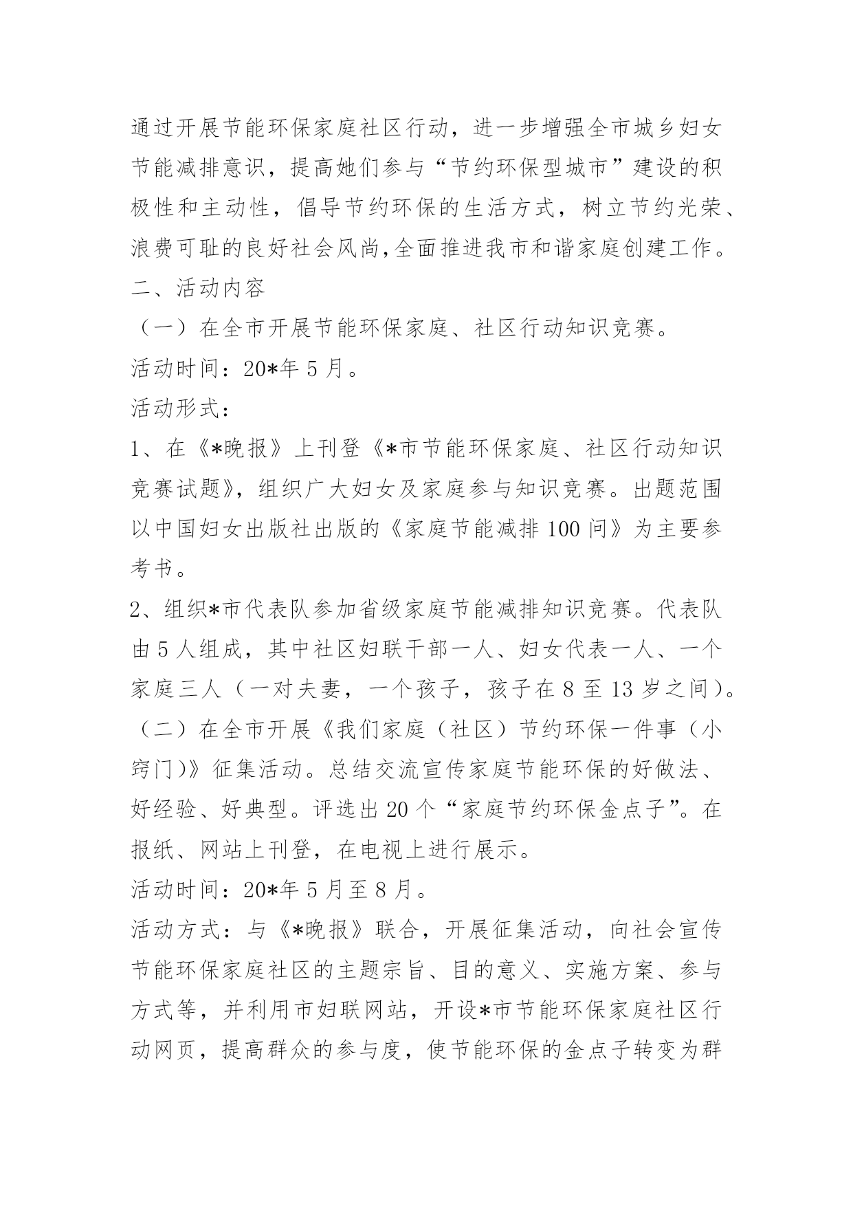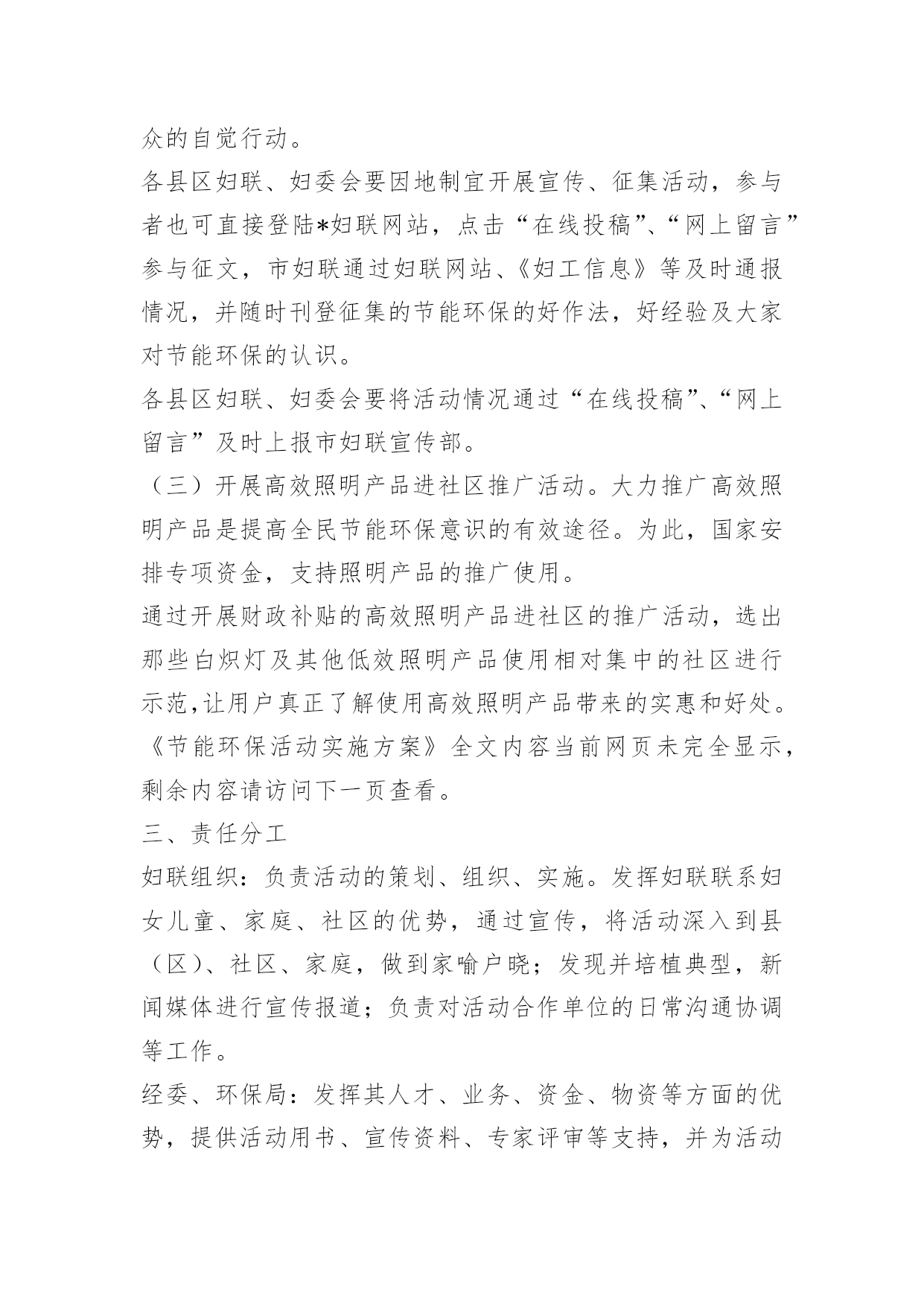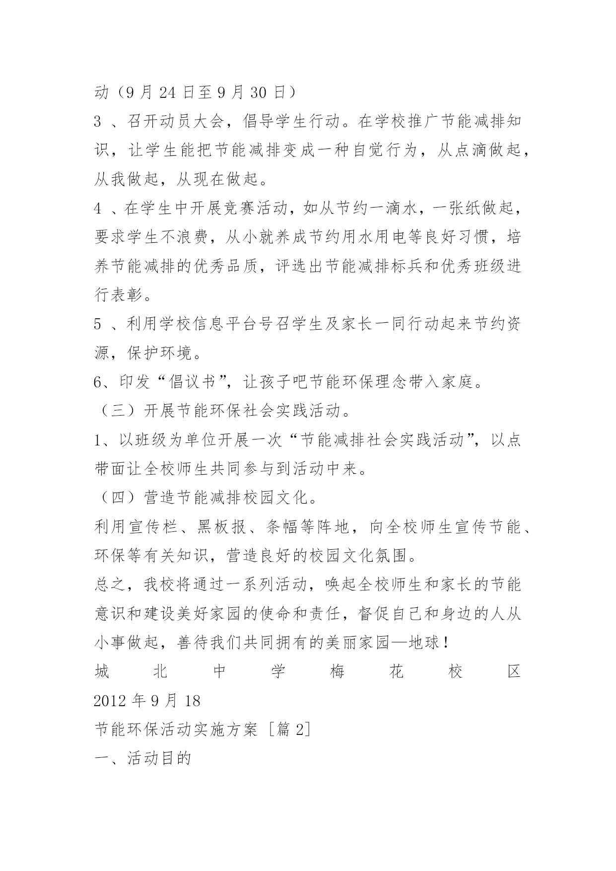 节能环保活动实施方案节能环保活动实施方案一、指导思想:地球只有一个,保护自然资源,人人有责。为加强学生节能环保教育,帮助学生建立环保与自我、节能与健康的和谐关系,学会珍惜资源、节能减排,学会正式和面对生命中的挑战,形成保护环境、珍爱生命的人生态度。因此我校积极开展了"节约能源,从我家开始"的活动,一方面是为了使学生从小树立环保意识,另一方面是想通过学生调动家长节约能源的积极性,从而使环保活动从学校走向家庭,从家庭走向社区,走向社会,形成人人关心地球,爱护地球的良好局面。二、主要活动:(一)加强节能环保基础教育。结合我校实际情况,在义务教育课程标准中,适当增加节约能源、保护环境等教育内容,将节能、节水、节地、节粮、节材等教育内容纳入学校校本教材中,通过课堂教学,真正落实节能环保进学校、进课堂。(二)积极开展以节能减排为内容的学校主题教育活动。开展“节能伴我在校园,我把节能带回家”等一系列主题活动。1、利用班会、升旗仪式等时间宣传“节能减排”的知识和方法,增强节能减排的理念和意识。2、组织所有学生参加“资源节约、环境友好”知识竞赛活动(9月24日至9月30日)3、召开动员大会,倡导学生行动。在学校推广节能减排知识,让学生能把节能减排变成一种自觉行为,从点滴做起,从我做起,从现在做起。4、在学生中开展竞赛活动,如从节约一滴水,一张纸做起,要求学生不浪费,从小就养成节约用水用电等良好习惯,培养节能减排的优秀品质,评选出节能减排标兵和优秀班级进行表彰。5、利用学校信息平台号召学生及家长一同行动起来节约资源,保护环境。6、印发“倡议书”,让孩子吧节能环保理念带入家庭。(三)开展节能环保社会实践活动。1、以班级为单位开展一次“节能减排社会实践活动”,以点带面让全校师生共同参与到活动中来。(四)营造节能减排校园文化。利用宣传栏、黑板报、条幅等阵地,向全校师生宣传节能、环保等有关知识,营造良好的校园文化氛围。总之,我校将通过一系列活动,唤起全校师生和家长的节能意识和建设美好家园的使命和责任,督促自己和身边的人从小事做起,善待我们共同拥有的美丽家园—地球!城北中学梅花校区2012年9月18节能环保活动实施方案[篇2]一、活动目的通过开展节能环保家庭社区行动,进一步增强全市城乡妇女节能减排意识,提高她们参与“节约环保型城市”建设的积极性和主动性,倡导节约环保的生活方式,树立节约光荣、浪费可耻的良好社会风尚,全面推进我市和谐家庭创建工作。二、活动内容(一)在全市开展节能环保家庭、社区行动知识竞赛。活动时间:20*年5月。活动形式:1、在《*晚报》上刊登《*市节能环保家庭、社区行动知识竞赛试题》,组织广大妇女及家庭参与知识竞赛。出题范围以中国妇女出版社出版的《家庭节能减排100问》为主要参考书。2、组织*市代表队参加省级家庭节能减排知识竞赛。代表队由5人组成,其中社区妇联干部一人、妇女代表一人、一个家庭三人(一对夫妻,一个孩子,孩子在8至13岁之间)。(二)在全市开展《我们家庭(社区)节约环保一件事(小窍门)》征集活动。总结交流宣传家庭节能环保的好做法、好经验、好典型。评选出20个“家庭节约环保金点子”。在报纸、网站上刊登,在电视上进行展示。活动时间:20*年5月至8月。活动方式:与《*晚报》联合,开展征集活动,向社会宣传节能环保家庭社区的主题宗旨、目的意义、实施方案、参与方式等,并利用市妇联网站,开设*市节能环保家庭社区行动网页,提高群众的参与度,使节能环保的金点子转变为群众的自觉行动。各县区妇联、妇委会要因地制宜开展宣传、征集活动,参与者也可直接登陆*妇联网站,点击“在线投稿”、“网上留言”参与征文,市妇联通过妇联网站、《妇工信息》等及时通报情况,并随时刊登征集的节能环保的好作法,好经验及大家对节能环保的认识。各县区妇联、妇委会要将活动情况通过“在线投稿”、“网上留言”及时上报市妇联宣传部。(三)开展高效照明产品进社区推广活动。大力推广高效照明产品是提高全民节能环保意识的有效途径。为此,国家安排专项资金,支持照明产品的推广使用。通过开展财政补贴的高效照明产品进社区的推广活动,选出那些白炽灯及其他低效照明产品使用相对集中的社区进行示范,让用户真正了解使用高效照明产品带来的实惠和好处。《节能环保活动实施方案》全文内容当前网页未完全显示,剩余内容请访问下一页查看。三、责任分工妇联组织:负责活动的策划、组织、实施。发挥妇联联系妇女儿童、家庭、社区的优势,通过宣传,将活动深入到县(区)、社区、家庭,做到家喻户晓;发现并培植典型,新闻媒体进行宣传报道;负责对活动合作单位的日常沟通协调等工作。经委、环保局:发挥其人才、业务、资金、物资等方面的优势,提供活动用书、宣传资料、专家评审等支持,并为活动提供政策和理论指导。四、活动要求1、精心组织,确保实效。要将这项