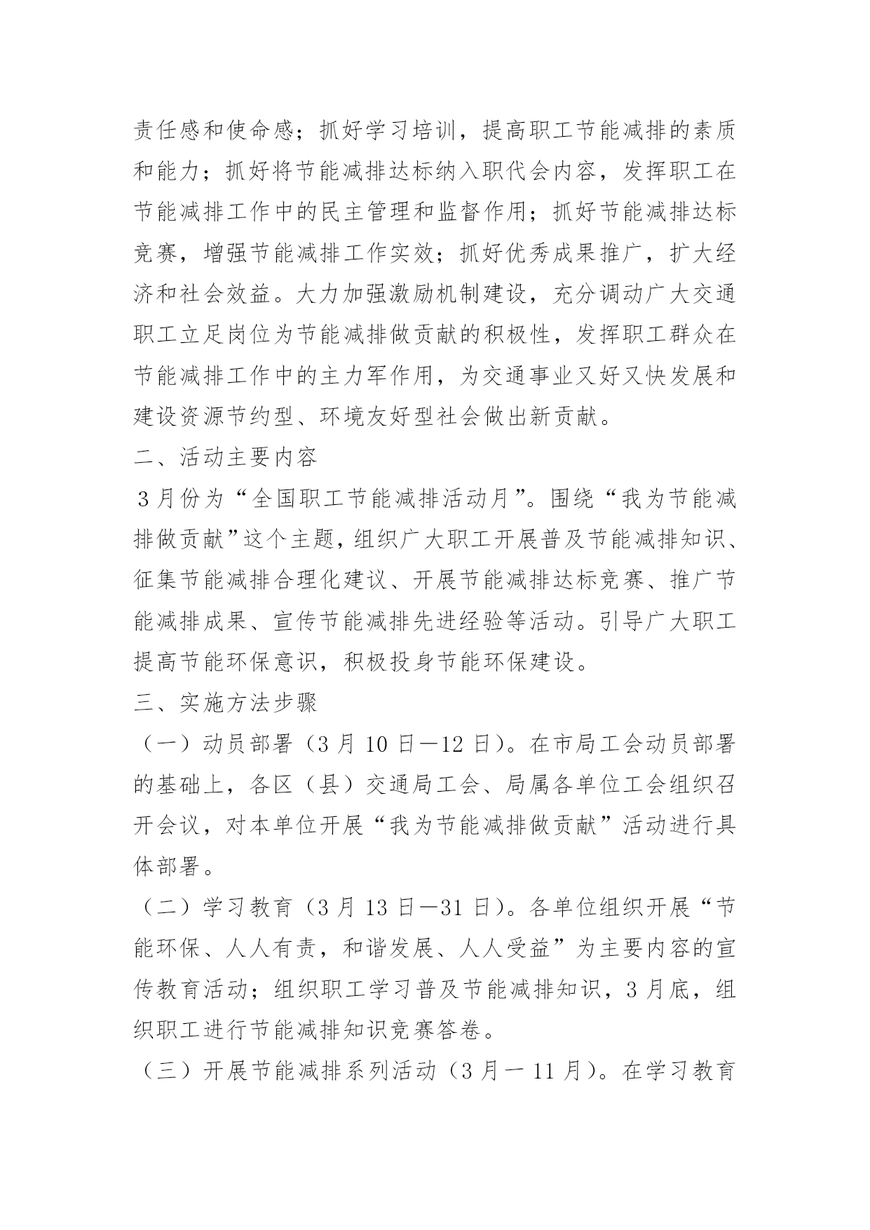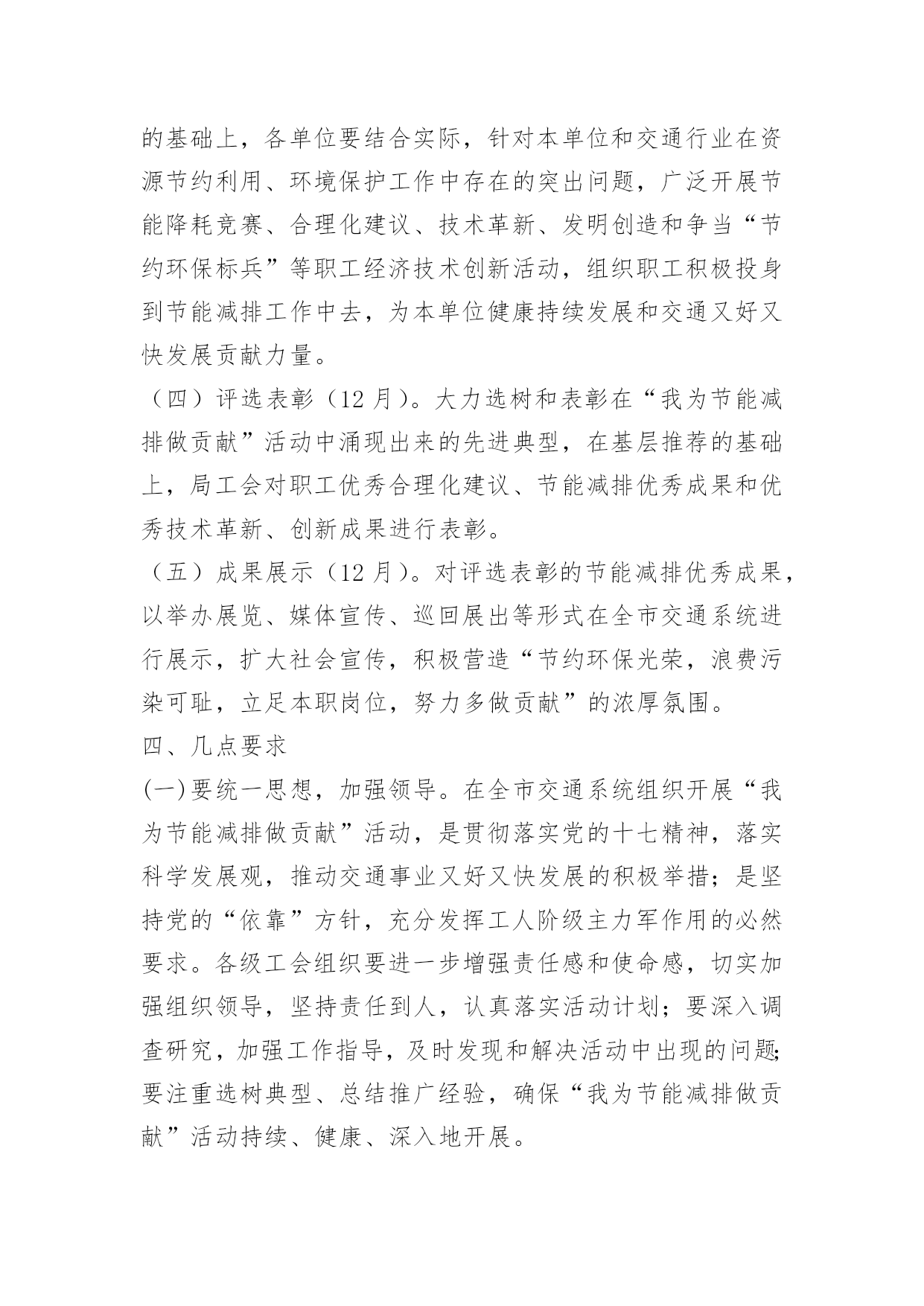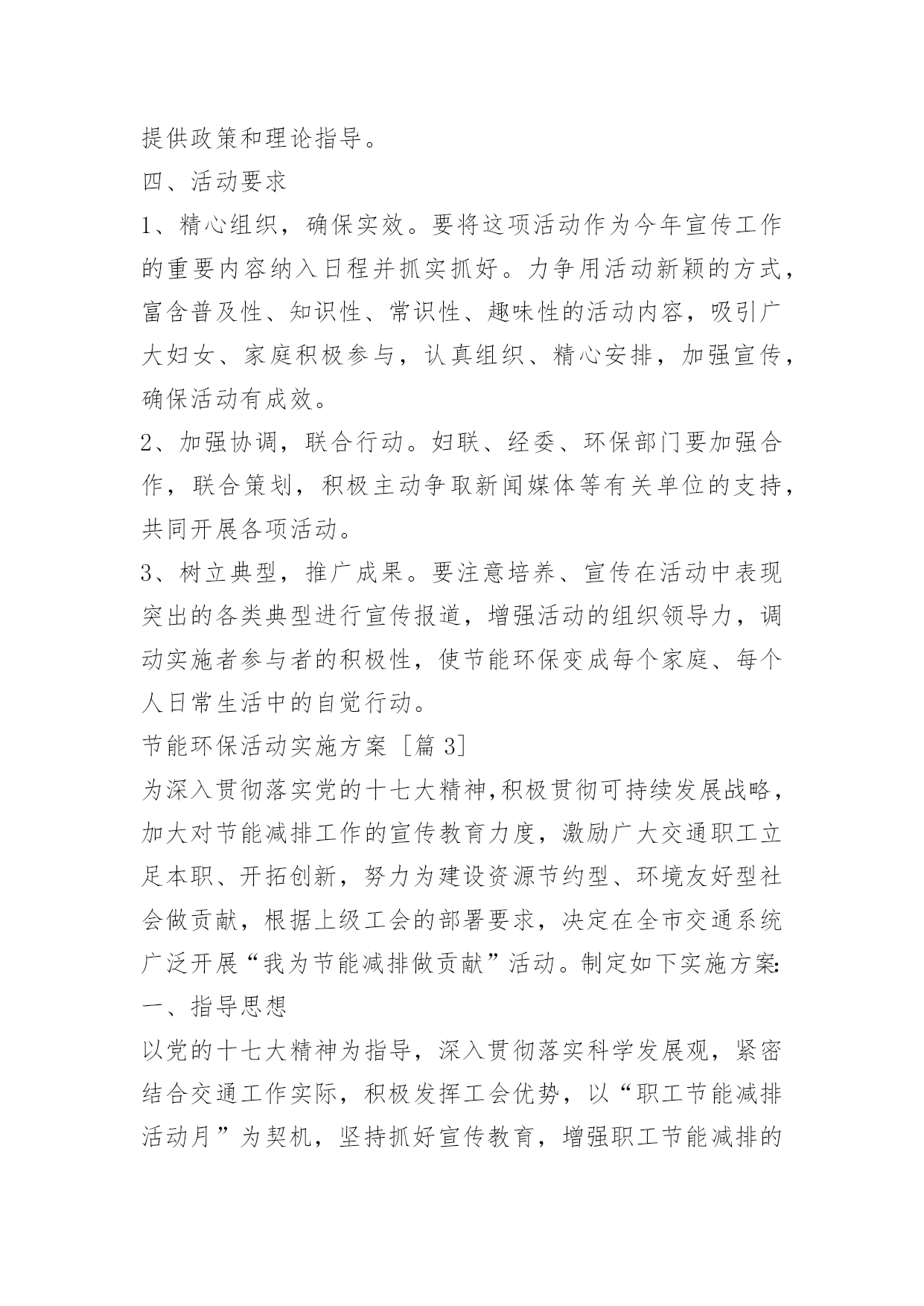 节能环保活动实施方案节能环保活动实施方案一、指导思想:地球只有一个,保护自然资源,人人有责。为加强学生节能环保教育,帮助学生建立环保与自我、节能与健康的和谐关系,学会珍惜资源、节能减排,学会正式和面对生命中的挑战,形成保护环境、珍爱生命的人生态度。因此我校积极开展了"节约能源,从我家开始"的活动,一方面是为了使学生从小树立环保意识,另一方面是想通过学生调动家长节约能源的积极性,从而使环保活动从学校走向家庭,从家庭走向社区,走向社会,形成人人关心地球,爱护地球的良好局面。二、主要活动:(一)加强节能环保基础教育。结合我校实际情况,在义务教育课程标准中,适当增加节约能源、保护环境等教育内容,将节能、节水、节地、节粮、节材等教育内容纳入学校校本教材中,通过课堂教学,真正落实节能环保进学校、进课堂。(二)积极开展以节能减排为内容的学校主题教育活动。开展“节能伴我在校园,我把节能带回家”等一系列主题活动。1、利用班会、升旗仪式等时间宣传“节能减排”的知识和方法,增强节能减排的理念和意识。2、组织所有学生参加“资源节约、环境友好”知识竞赛活动(9月24日至9月30日)3、召开动员大会,倡导学生行动。在学校推广节能减排知识,让学生能把节能减排变成一种自觉行为,从点滴做起,从我做起,从现在做起。4、在学生中开展竞赛活动,如从节约一滴水,一张纸做起,要求学生不浪费,从小就养成节约用水用电等良好习惯,培养节能减排的优秀品质,评选出节能减排标兵和优秀班级进行表彰。5、利用学校信息平台号召学生及家长一同行动起来节约资源,保护环境。6、印发“倡议书”,让孩子吧节能环保理念带入家庭。(三)开展节能环保社会实践活动。1、以班级为单位开展一次“节能减排社会实践活动”,以点带面让全校师生共同参与到活动中来。(四)营造节能减排校园文化。利用宣传栏、黑板报、条幅等阵地,向全校师生宣传节能、环保等有关知识,营造良好的校园文化氛围。总之,我校将通过一系列活动,唤起全校师生和家长的节能意识和建设美好家园的使命和责任,督促自己和身边的人从小事做起,善待我们共同拥有的美丽家园—地球!城北中学梅花校区2012年9月18节能环保活动实施方案[篇2]一、活动目的通过开展节能环保家庭社区行动,进一步增强全市城乡妇女节能减排意识,提高她们参与“节约环保型城市”建设的积极性和主动性,倡导节约环保的生活方式,树立节约光荣、浪费可耻的良好社会风尚,全面推进我市和谐家庭创建工作。二、活动内容(一)在全市开展节能环保家庭、社区行动知识竞赛。活动时间:20*年5月。活动形式:1、在《*晚报》上刊登《*市节能环保家庭、社区行动知识竞赛试题》,组织广大妇女及家庭参与知识竞赛。出题范围以中国妇女出版社出版的《家庭节能减排100问》为主要参考书。2、组织*市代表队参加省级家庭节能减排知识竞赛。代表队由5人组成,其中社区妇联干部一人、妇女代表一人、一个家庭三人(一对夫妻,一个孩子,孩子在8至13岁之间)。(二)在全市开展《我们家庭(社区)节约环保一件事(小窍门)》征集活动。总结交流宣传家庭节能环保的好做法、好经验、好典型。评选出20个“家庭节约环保金点子”。在报纸、网站上刊登,在电视上进行展示。活动时间:20*年5月至8月。活动方式:与《*晚报》联合,开展征集活动,向社会宣传节能环保家庭社区的主题宗旨、目的意义、实施方案、参与方式等,并利用市妇联网站,开设*市节能环保家庭社区行动网页,提高群众的参与度,使节能环保的金点子转变为群众的自觉行动。各县区妇联、妇委会要因地制宜开展宣传、征集活动,参与者也可直接登陆*妇联网站,点击“在线投稿”、“网上留言”参与征文,市妇联通过妇联网站、《妇工信息》等及时通报情况,并随时刊登征集的节能环保的好作法,好经验及大家对节能环保的认识。各县区妇联、妇委会要将活动情况通过“在线投稿”、“网上留言”及时上报市妇联宣传部。(三)开展高效照明产品进社区推广活动。大力推广高效照明产品是提高全民节能环保意识的有效途径。为此,国家安排专项资金,支持照明产品的推广使用。通过开展财政补贴的高效照明产品进社区的推广活动,选出那些白炽灯及其他低效照明产品使用相对集中的社区进行示范,让用户真正了解使用高效照明产品带来的实惠和好处。《节能环保活动实施方案》全文内容当前网页未完全显示,剩余内容请访问下一页查看。三、责任分工妇联组织:负责活动的策划、组织、实施。发挥妇联联系妇女儿童、家庭、社区的优势,通过宣传,将活动深入到县(区)、社区、家庭,做到家喻户晓;发现并培植典型,新闻媒体进行宣传报道;负责对活动合作单位的日常沟通协调等工作。经委、环保局:发挥其人才、业务、资金、物资等方面的优势,提供活动用书、宣传资料、专家评审等支持,并为活动提供政策和理论指导。四、活动要求1、精心组织,确保实效。要将这项