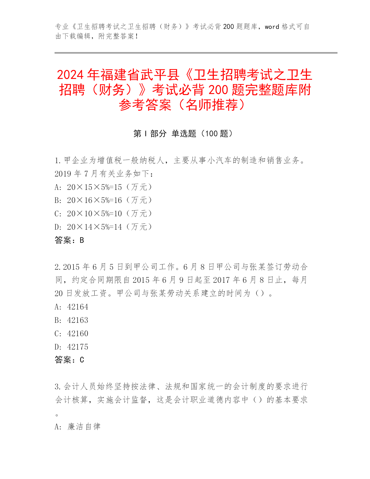 2024年福建省武平县《卫生招聘考试之卫生招聘(财务)》考试必背200题完整题库附参考答案(名师推荐)