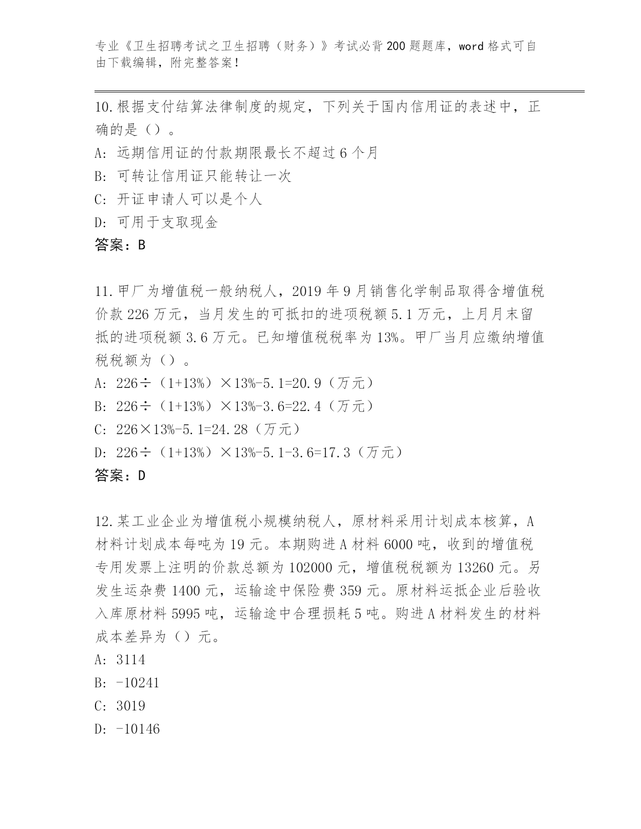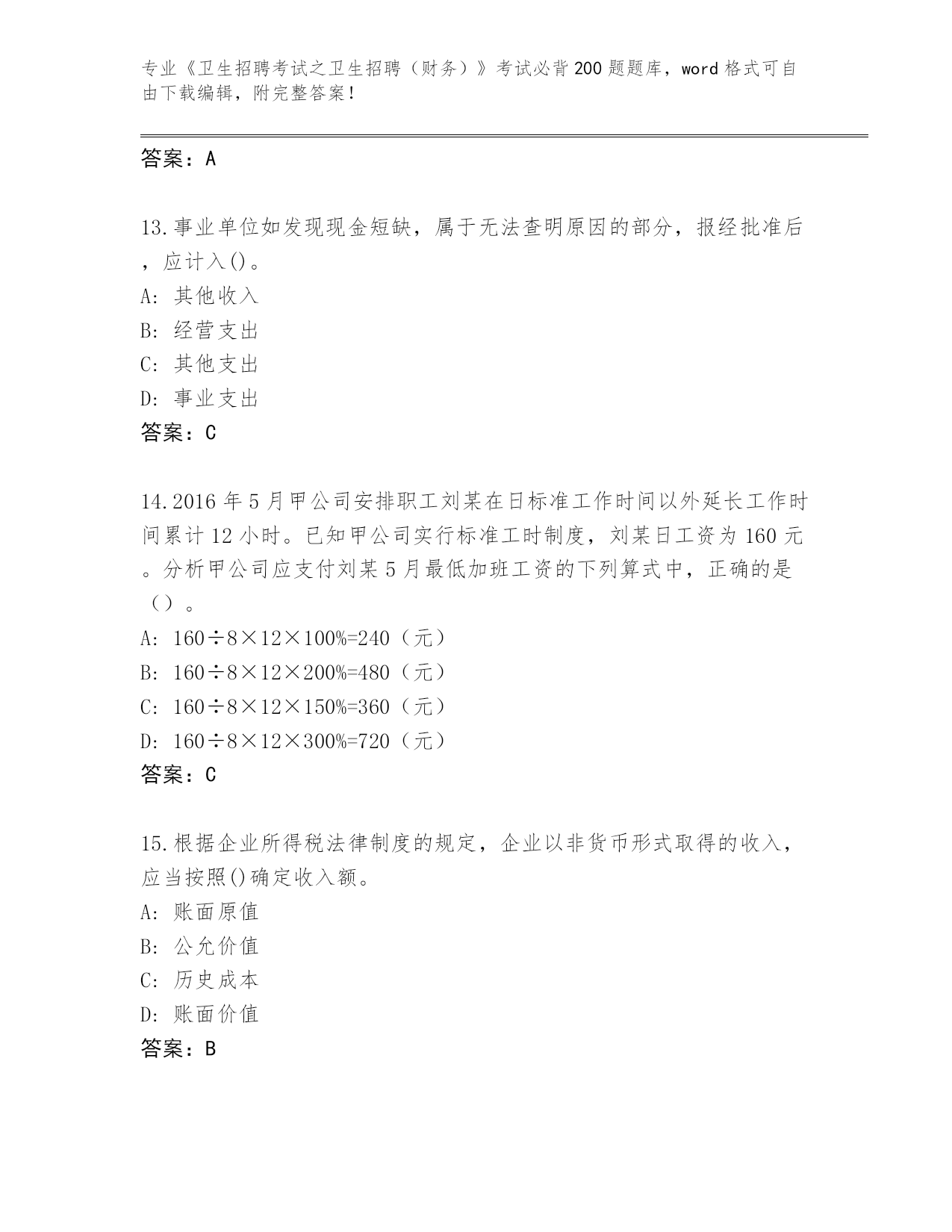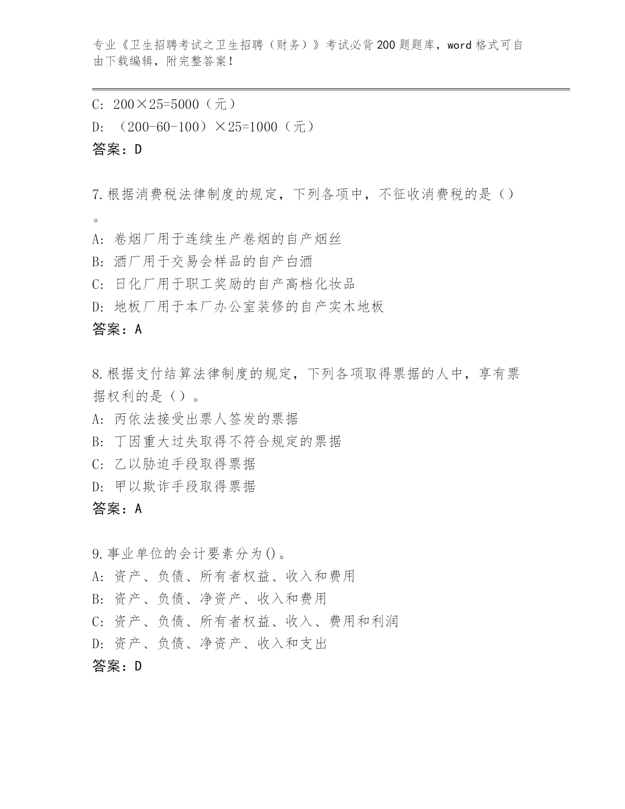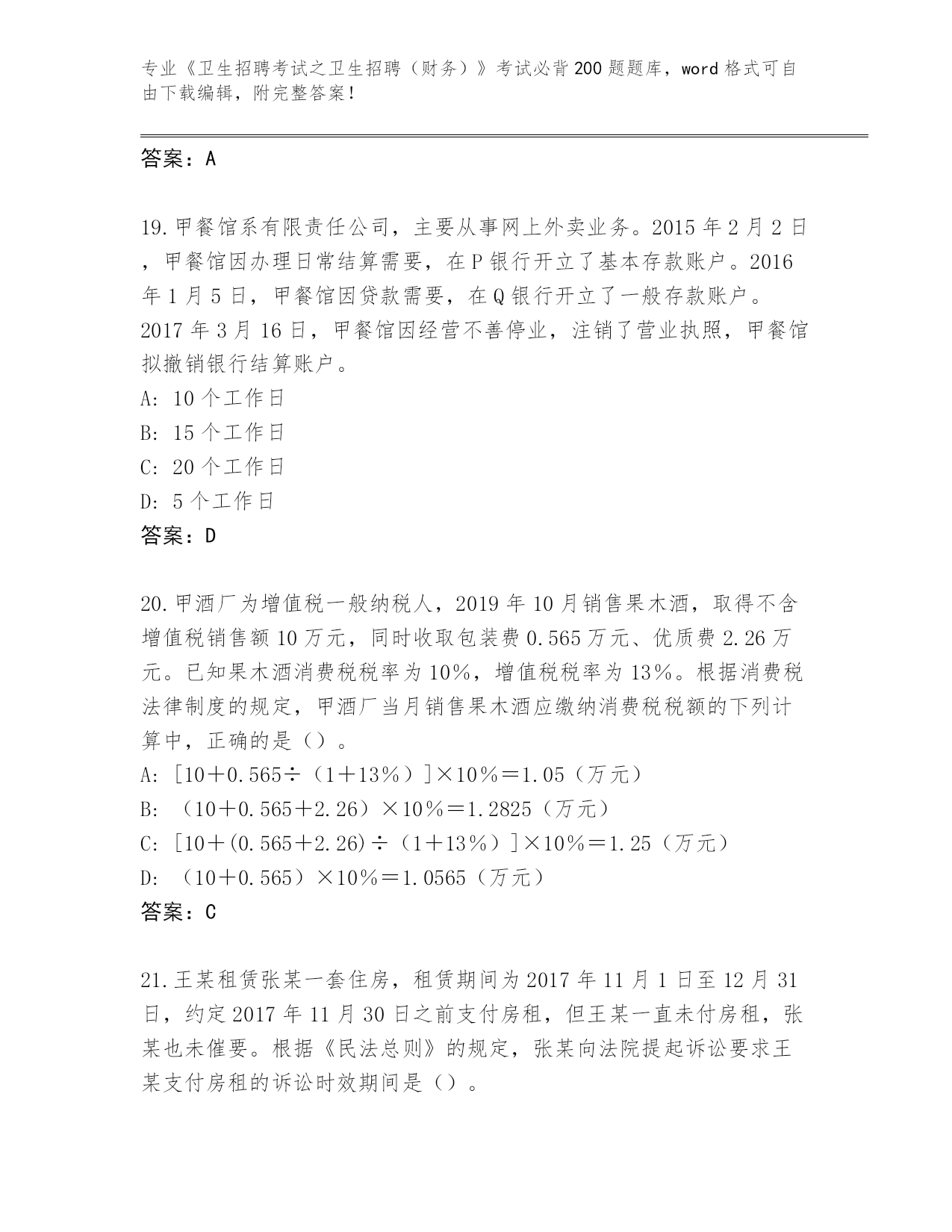 福建省永泰县完整版《卫生招聘考试之卫生招聘(财务)》考试必背200题题库附参考答案(名师推荐)