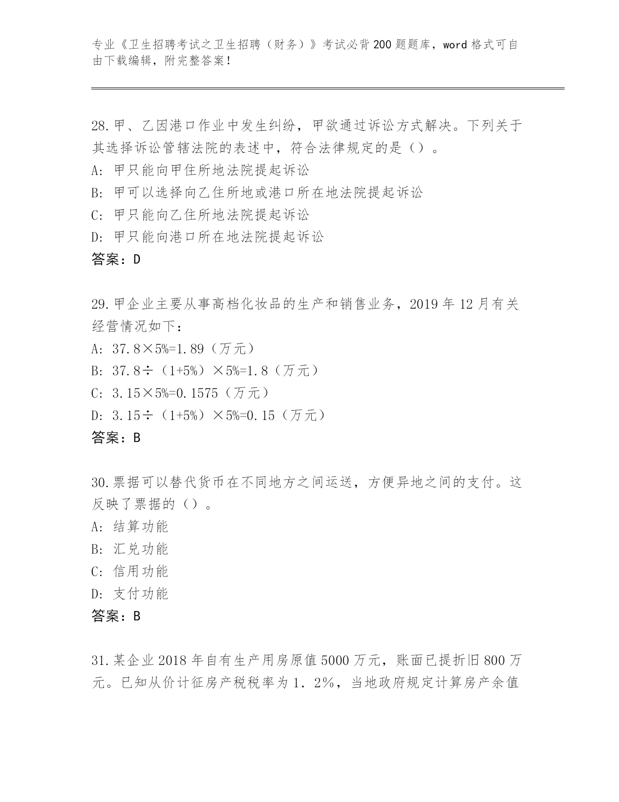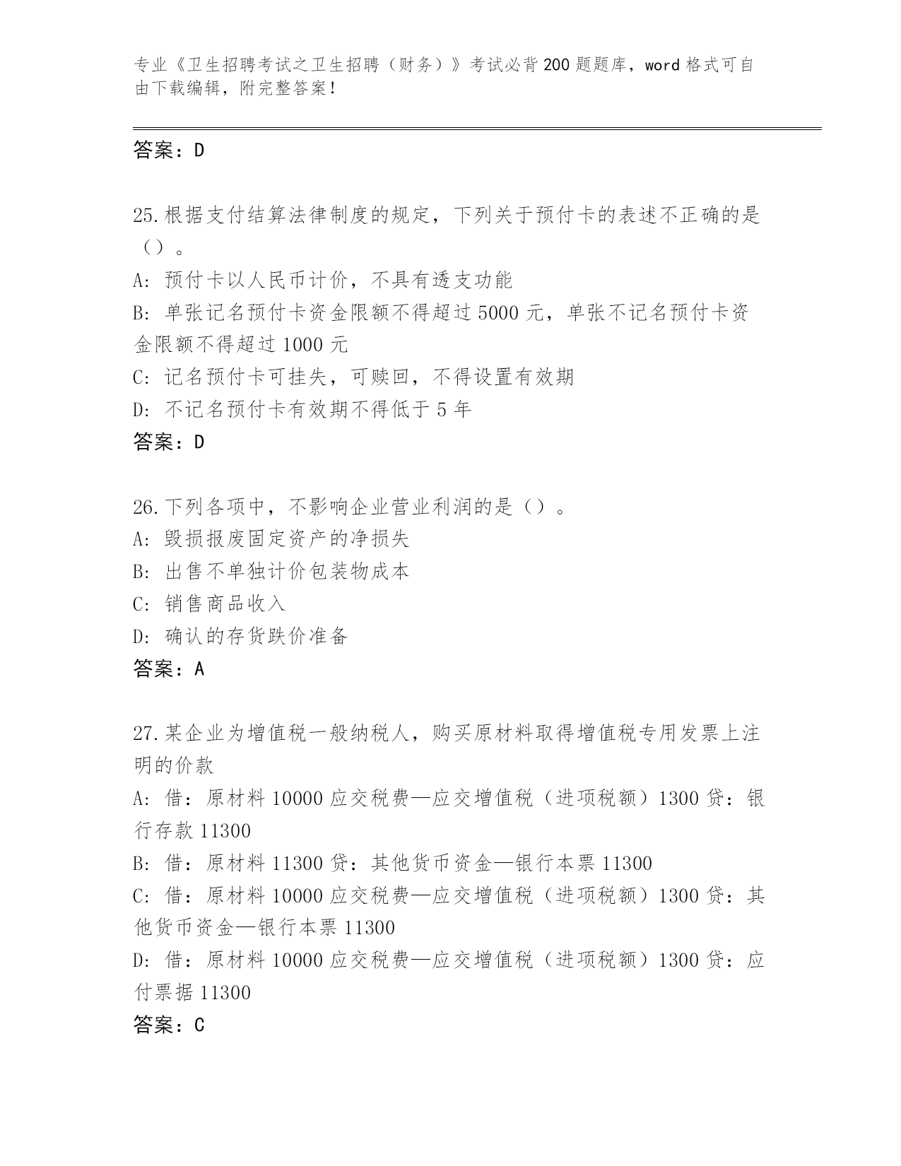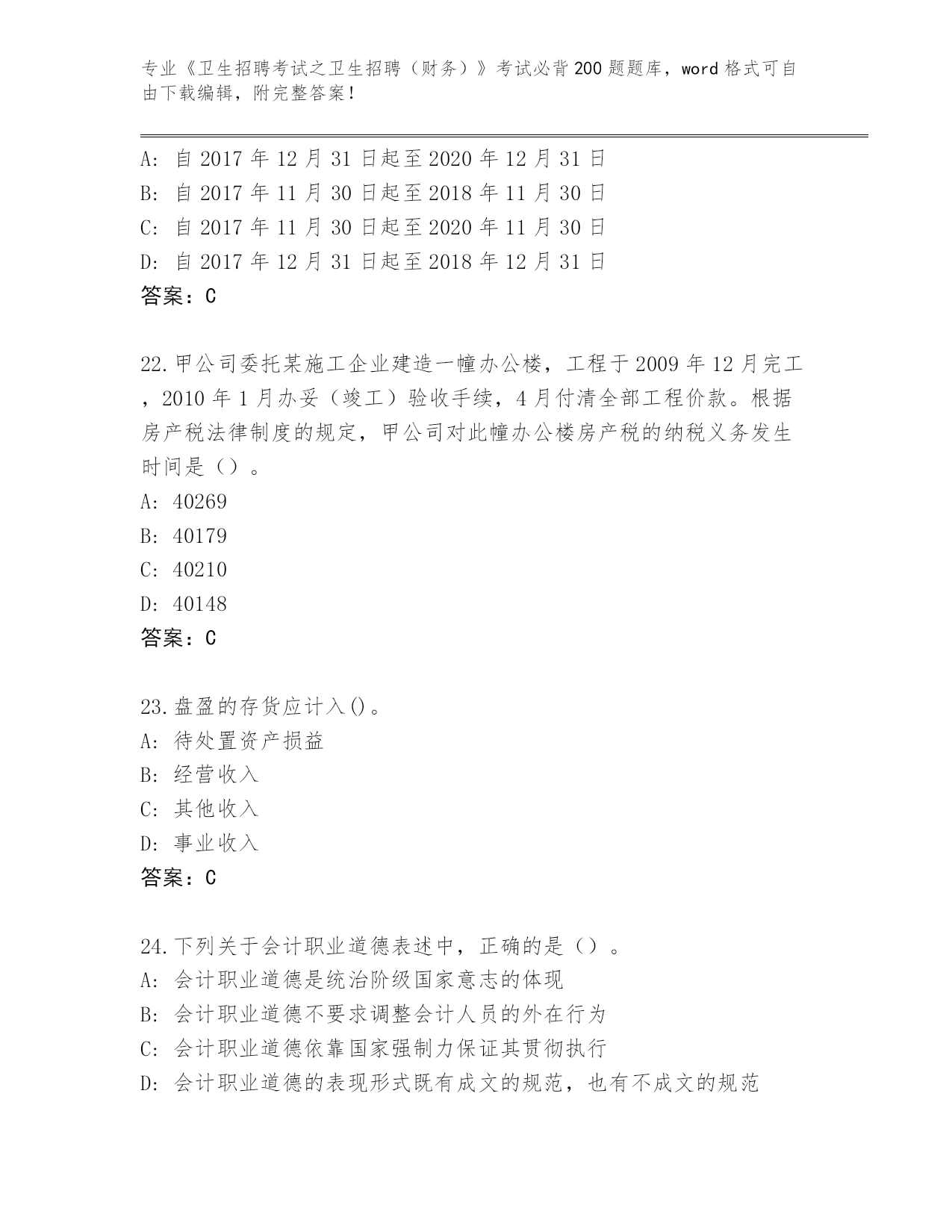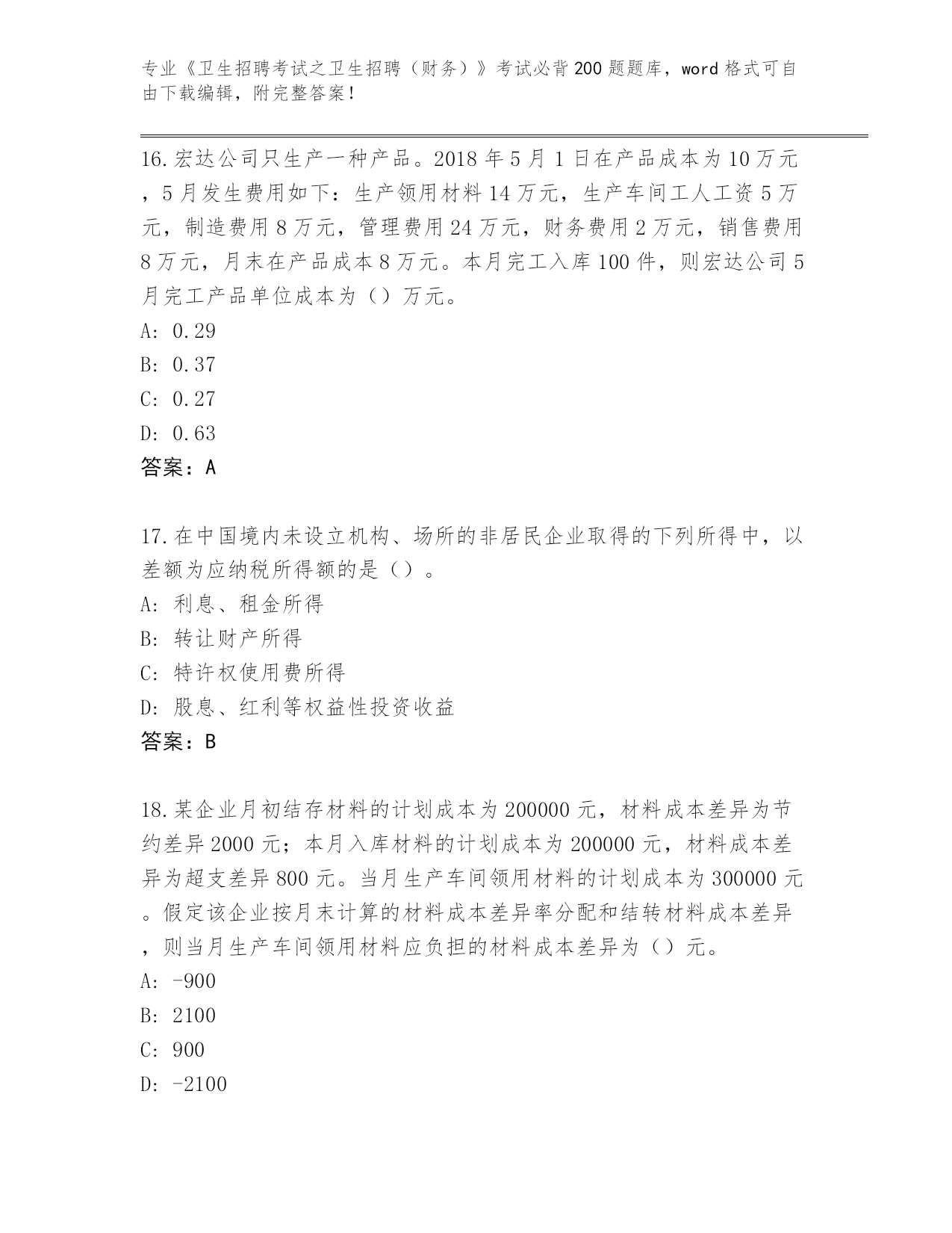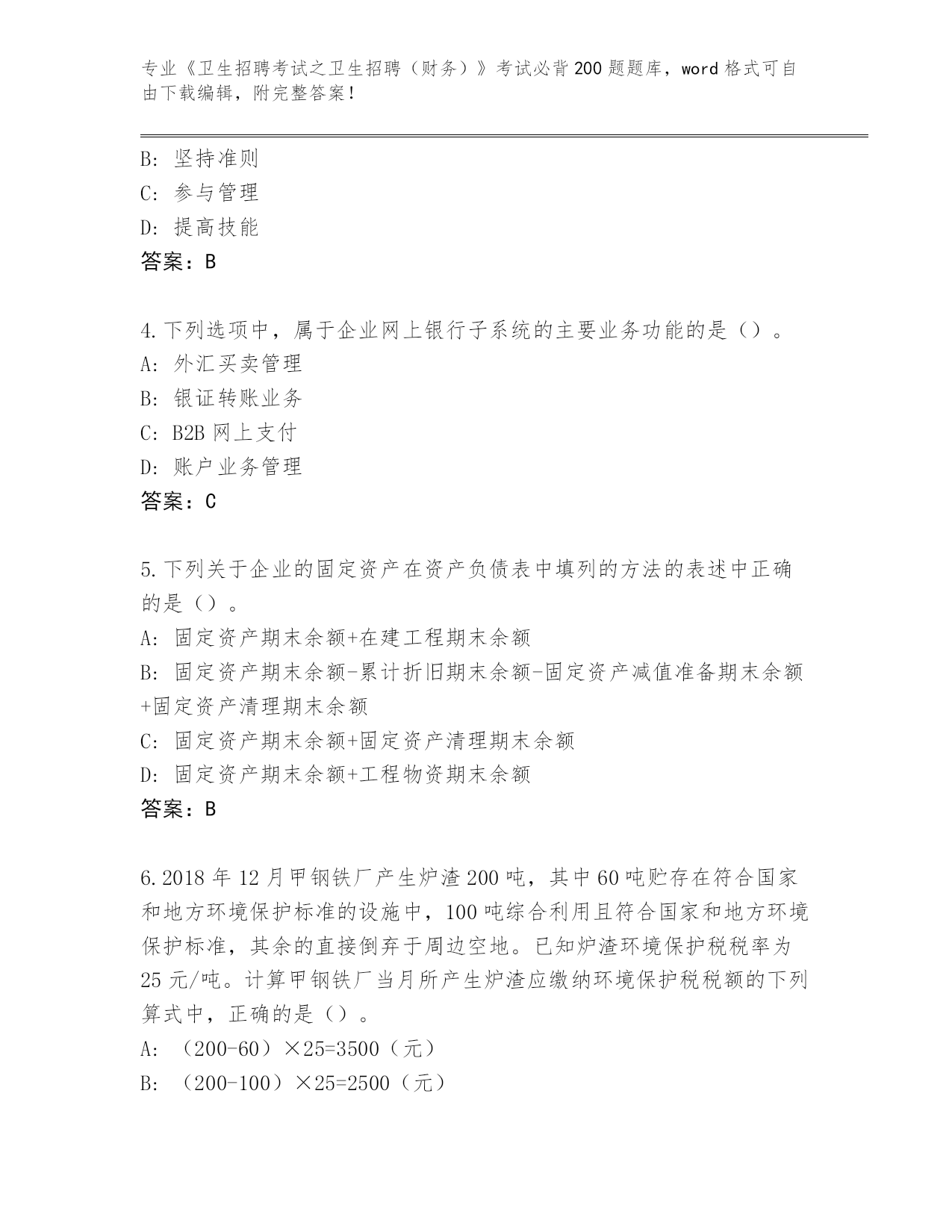 福建省永泰县完整版《卫生招聘考试之卫生招聘(财务)》考试必背200题题库附参考答案(名师推荐)