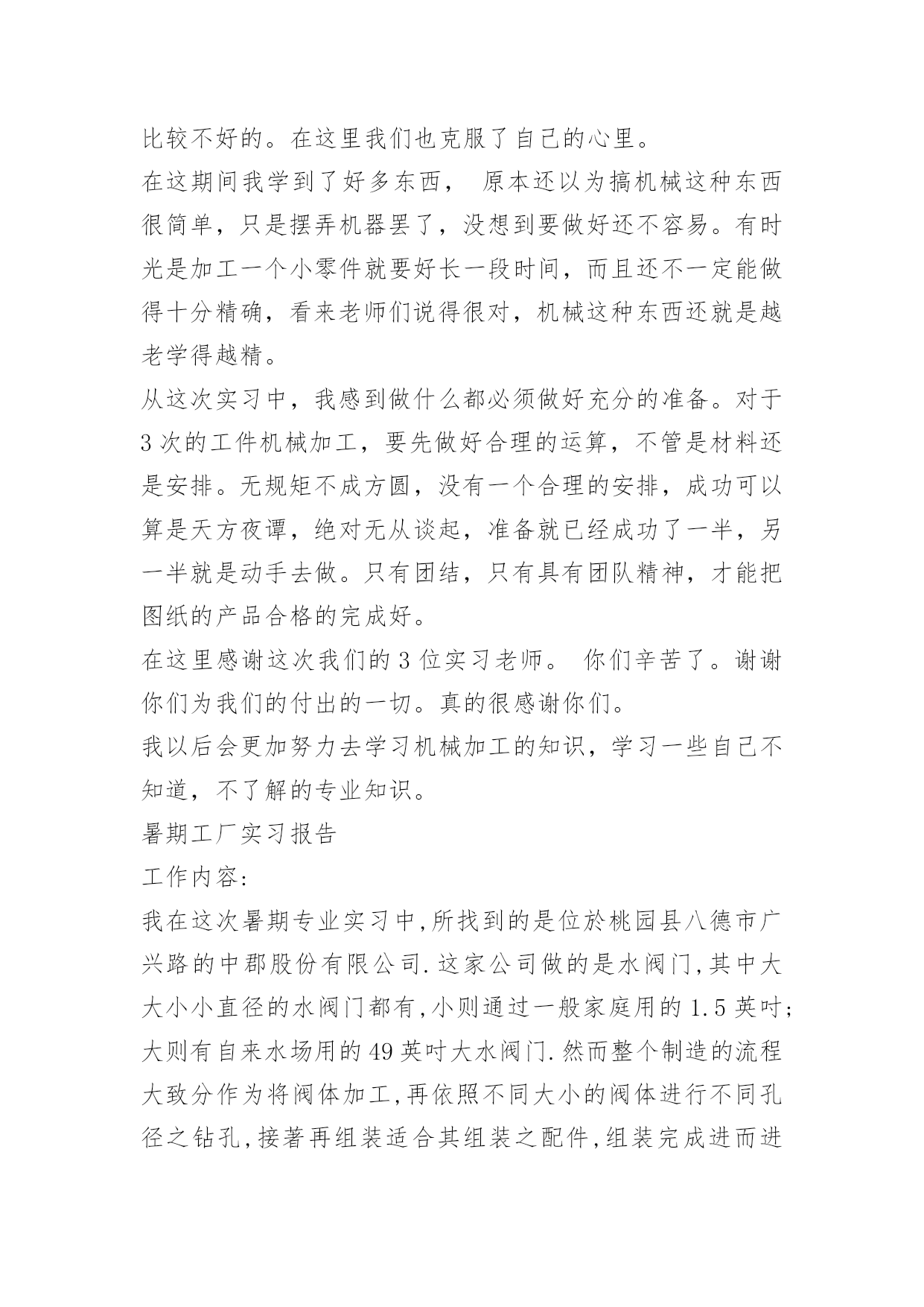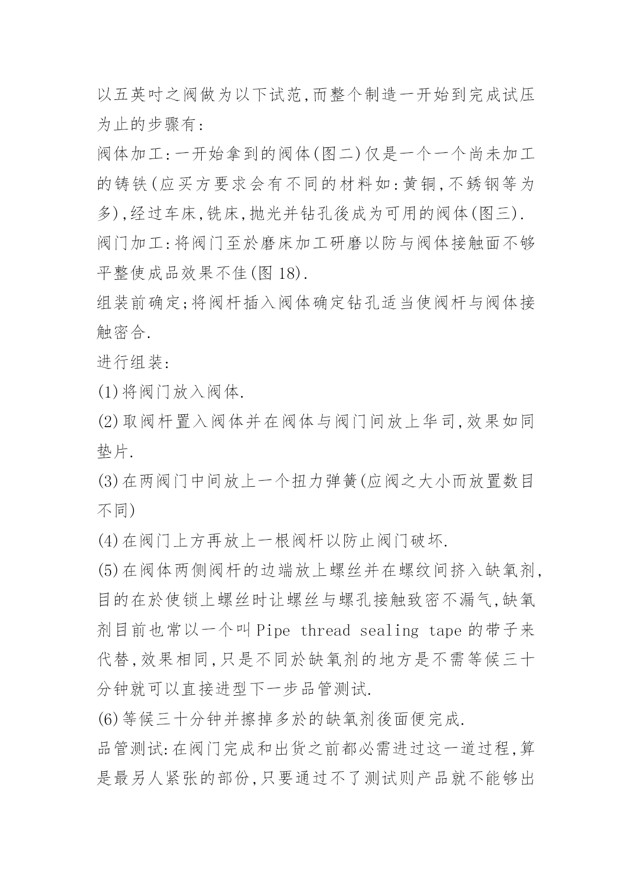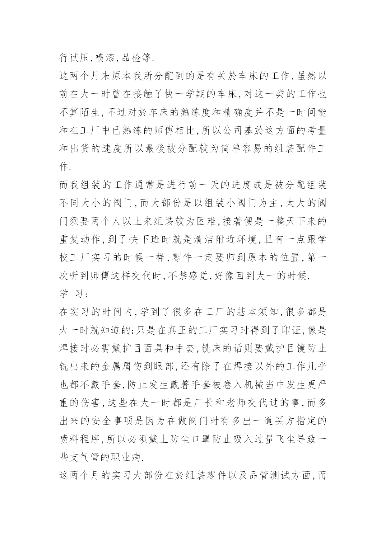 机械岗位实结机械岗位实结机械岗位的实结范文经过这次6周的工厂的实习,让我深深的认识到自己的不足,认识到自己的动手能力相对较差,对机械过于陌生,过于恐惧,好像怕出啥事,不敢过多的接触它们。从这次实习中,让我越发感到要有所成功,就要自己亲自去做,亲自去总结做的过程中所发生的种种困难,既要去分析,又要有坚强的毅力。使得无时无刻都要认为自己一定能够克服那些所谓的困难,要对机械的各种功能自己亲身去体验,亲身去操作,对机械的各种结构要有一个可知的了解,不要让自己经过一次实习之后却跟实习前没有什么两样。虽不要说是对它们运用自如,但至少对它们的功能以及结构要有一个大概的了解,大概的掌握。从我们这一组做的机械作品来讲,说实话,做得相对来讲比较不如人意,没有达到要求,跟我们所看到的图纸可以说是大相径庭。然而唯一值得我们那一组庆幸的是:我们“浪费”的材料可以说是让人“受不了”,没有哪一组可以与我们那一组相匹配,然而老师却并不知道。这其中所用的材料却是这其中的小部分,大概这样的结局应该是在加工之前没有对图纸做充分的分析,没有标明尺寸就“开工”了。从我们那一组2次制作的过程中我发现,我们那一组的人都有一种害怕把事情做坏的心里,有时候甚至有点依赖性。所以这个是比较不好的。在这里我们也克服了自己的心里。在这期间我学到了好多东西,原本还以为搞机械这种东西很简单,只是摆弄机器罢了,没想到要做好还不容易。有时光是加工一个小零件就要好长一段时间,而且还不一定能做得十分精确,看来老师们说得很对,机械这种东西还就是越老学得越精。从这次实习中,我感到做什么都必须做好充分的准备。对于3次的工件机械加工,要先做好合理的运算,不管是材料还是安排。无规矩不成方圆,没有一个合理的安排,成功可以算是天方夜谭,绝对无从谈起,准备就已经成功了一半,另一半就是动手去做。只有团结,只有具有团队精神,才能把图纸的产品合格的完成好。在这里感谢这次我们的3位实习老师。你们辛苦了。谢谢你们为我们的付出的一切。真的很感谢你们。我以后会更加努力去学习机械加工的知识,学习一些自己不知道,不了解的专业知识。暑期工厂实习报告工作内容:我在这次暑期专业实习中,所找到的是位於桃园县八德市广兴路的中郡股份有限公司.这家公司做的是水阀门,其中大大小小直径的水阀门都有,小则通过一般家庭用的1.5英吋;大则有自来水场用的49英吋大水阀门.然而整个制造的流程大致分作为将阀体加工,再依照不同大小的阀体进行不同孔径之钻孔,接著再组装适合其组装之配件,组装完成进而进行试压,喷漆,品检等.这两个月来原本我所分配到的是有关於车床的工作,虽然以前在大一时曾在接触了快一学期的车床,对这一类的工作也不算陌生,不过对於车床的熟练度和精确度并不是一时间能和在工厂中已熟练的师傅相比,所以公司基於这方面的考量和出货的速度所以最後被分配较为简单容易的组装配件工作.而我组装的工作通常是进行前一天的进度或是被分配组装不同大小的阀门,而大部份是以组装小阀门为主,太大的阀门须要两个人以上来组装较为困难,接著便是一整天下来的重复动作,到了快下班时就是清洁附近环境,且有一点跟学校工厂实习的时候一样,零件一定要归到原本的位置,第一次听到师傅这样交代时,不禁感觉,好像回到大一的时候.学习:在实习的时间内,学到了很多在工厂的基本须知,很多都是大一时就知道的;只是在真正的工厂实习时得到了印证,像是焊接时必需戴护目面具和手套,铣床的话则要戴护目镜防止铣出来的金属屑伤到眼部,还有除了在焊接以外的工作几乎也都不戴手套,防止发生戴著手套被卷入机械当中发生更严重的伤害,这些在大一时都是厂长和老师交代过的事,而多出来的安全事项是因为在做阀门时有多出一道买方指定的喷料程序,所以必须戴上防尘口罩防止吸入过量飞尘导致一些支气管的职业病.这两个月的实习大部份在於组装零件以及品管测试方面,而以五英吋之阀做为以下试范,而整个制造一开始到完成试压为止的步骤有:阀体加工:一开始拿到的阀体(图二)仅是一个一个尚未加工的铸铁(应买方要求会有不同的材料如:黄铜,不銹钢等为多),经过车床,铣床,抛光并钻孔後成为可用的阀体(图三).阀门加工:将阀门至於磨床加工研磨以防与阀体接触面不够平整使成品效果不佳(图18).组装前确定;将阀杆插入阀体确定钻孔适当使阀杆与阀体接触密合.进行组装:(1)将阀门放入阀体.(2)取阀杆置入阀体并在阀体与阀门间放上华司,效果如同垫片.(3)在两阀门中间放上一个扭力弹簧(应阀之大小而放置数目不同)(4)在阀门上方再放上一根阀杆以防止阀门破坏.(5)在阀体两侧阀杆的边端放上螺丝并在螺纹间挤入缺氧剂,目的在於使锁上螺丝时让螺丝与螺孔接触致密不漏气,缺氧剂目前也常以一个叫Pipethreadsealingtape的带子来代替,效果相同,只是不同於缺氧剂的地方是不需等候三十分钟就可